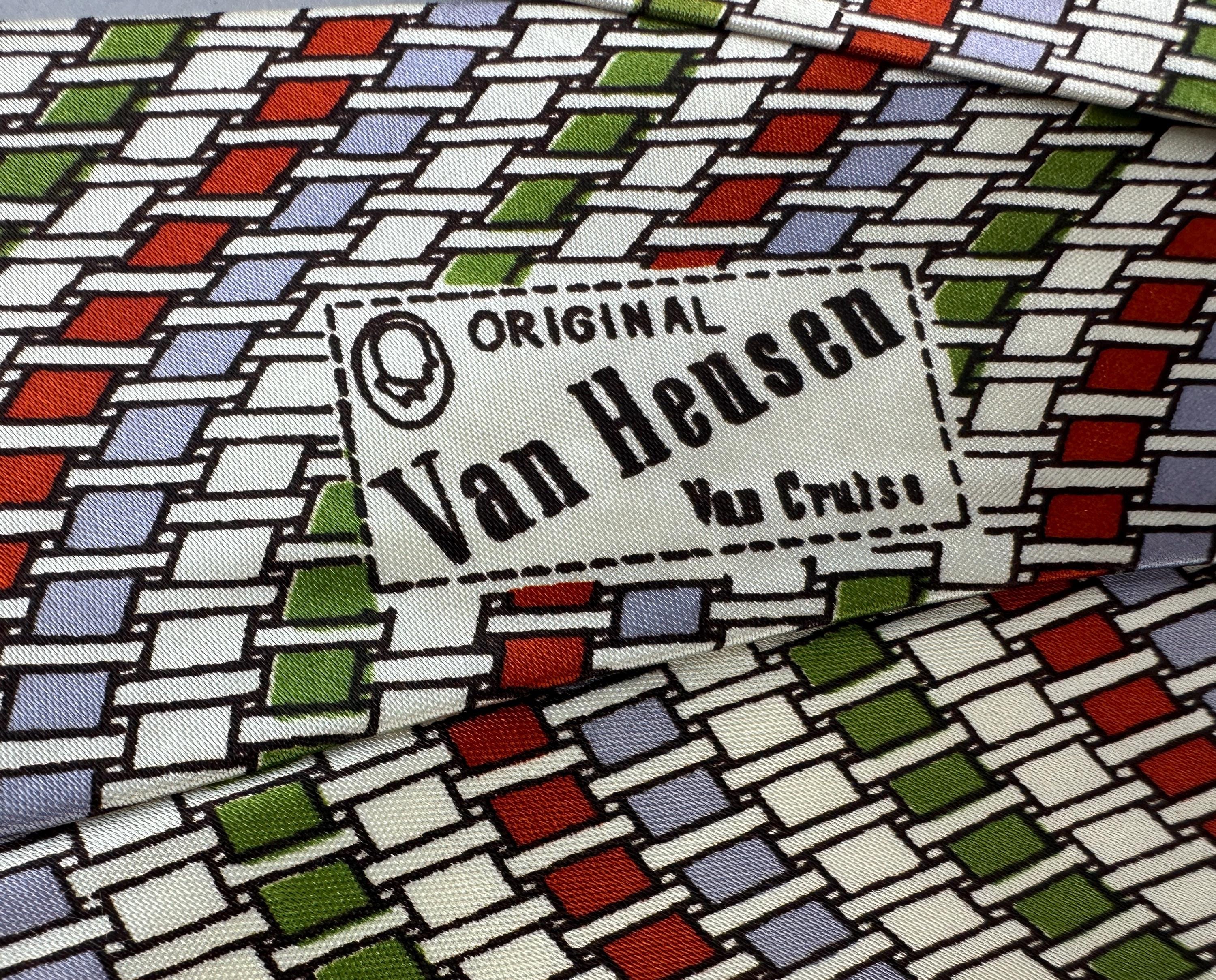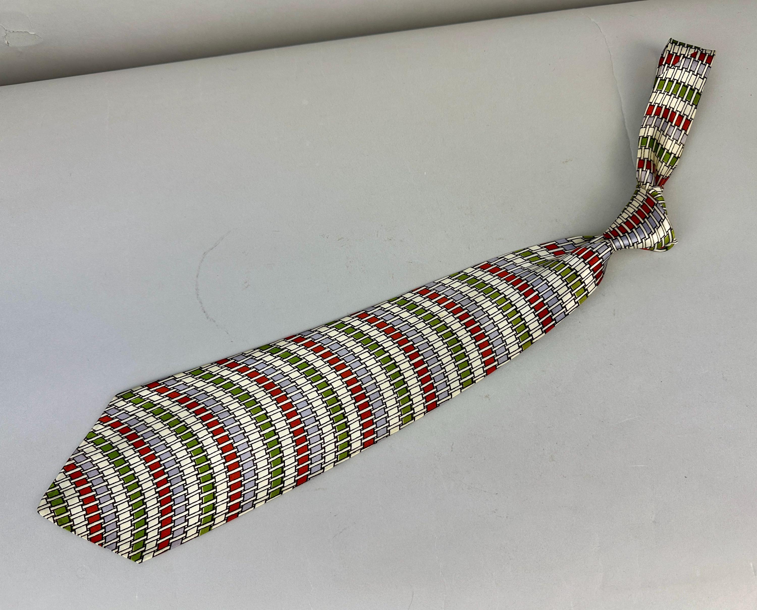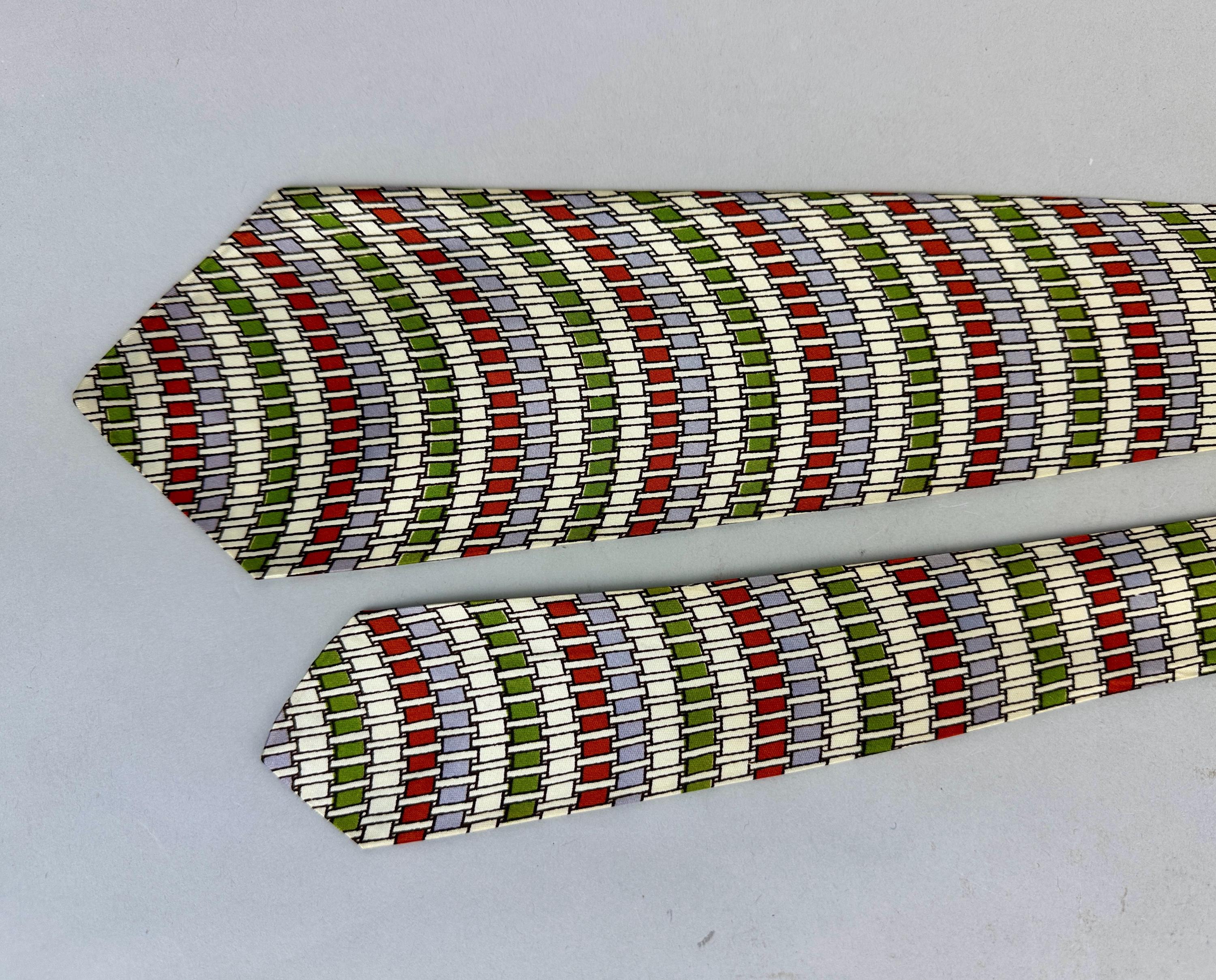 This 1940's tie will deliver baskets full of compliments! A shiny rayon satin is printed with a basket weave pattern of striping moss green, icy lavender, and spiced orange with a white base. Fully lined and by "Van Heusen". Pairs well with a wide variety of Art Deco and Mid-Century suit colors and fabric types. This tie is in excellent vintage condition with no flaws found!