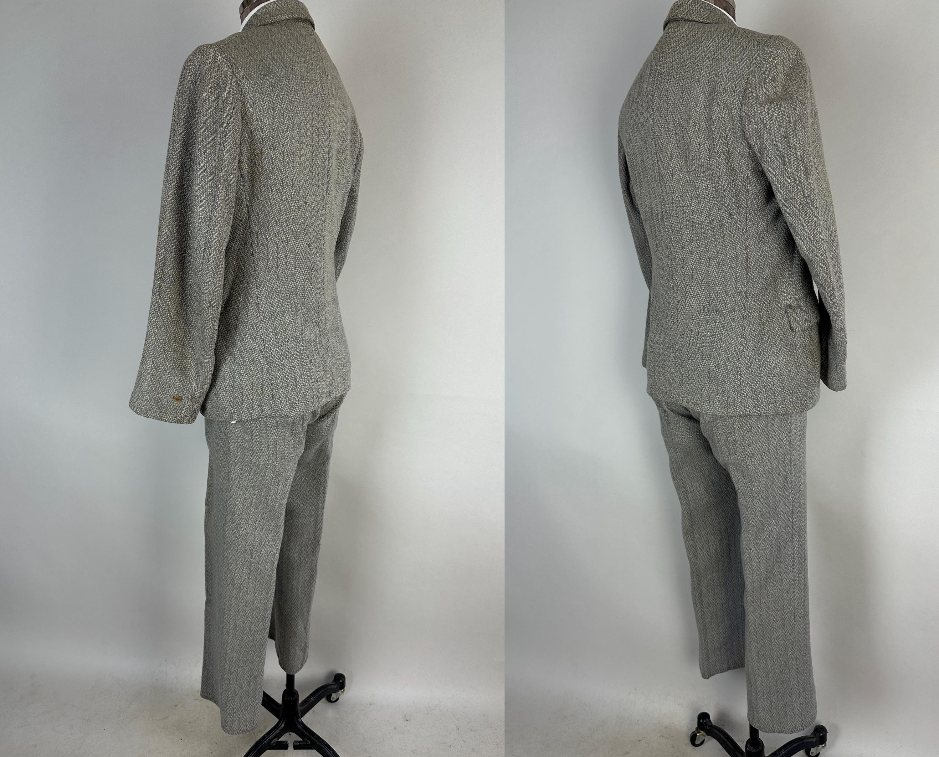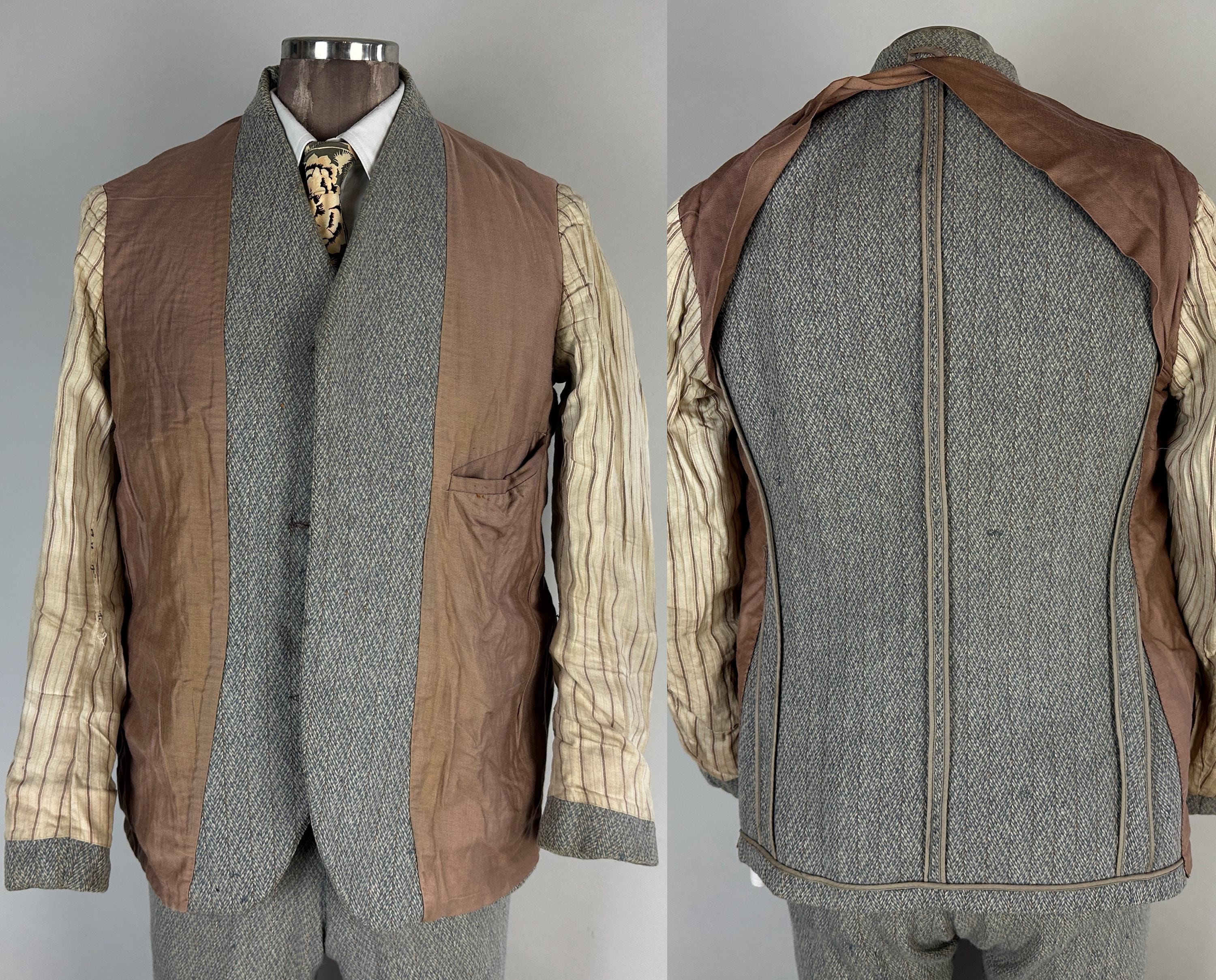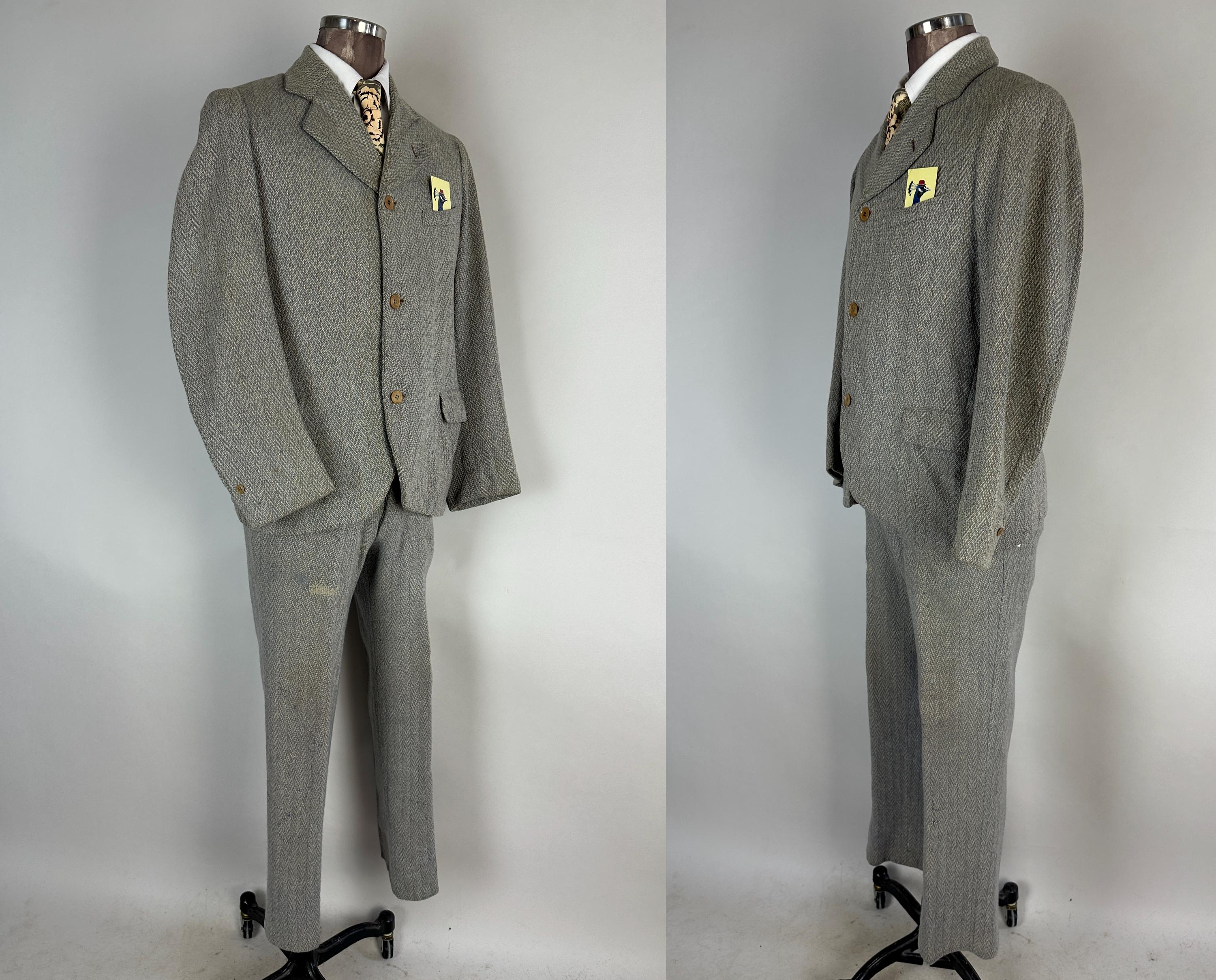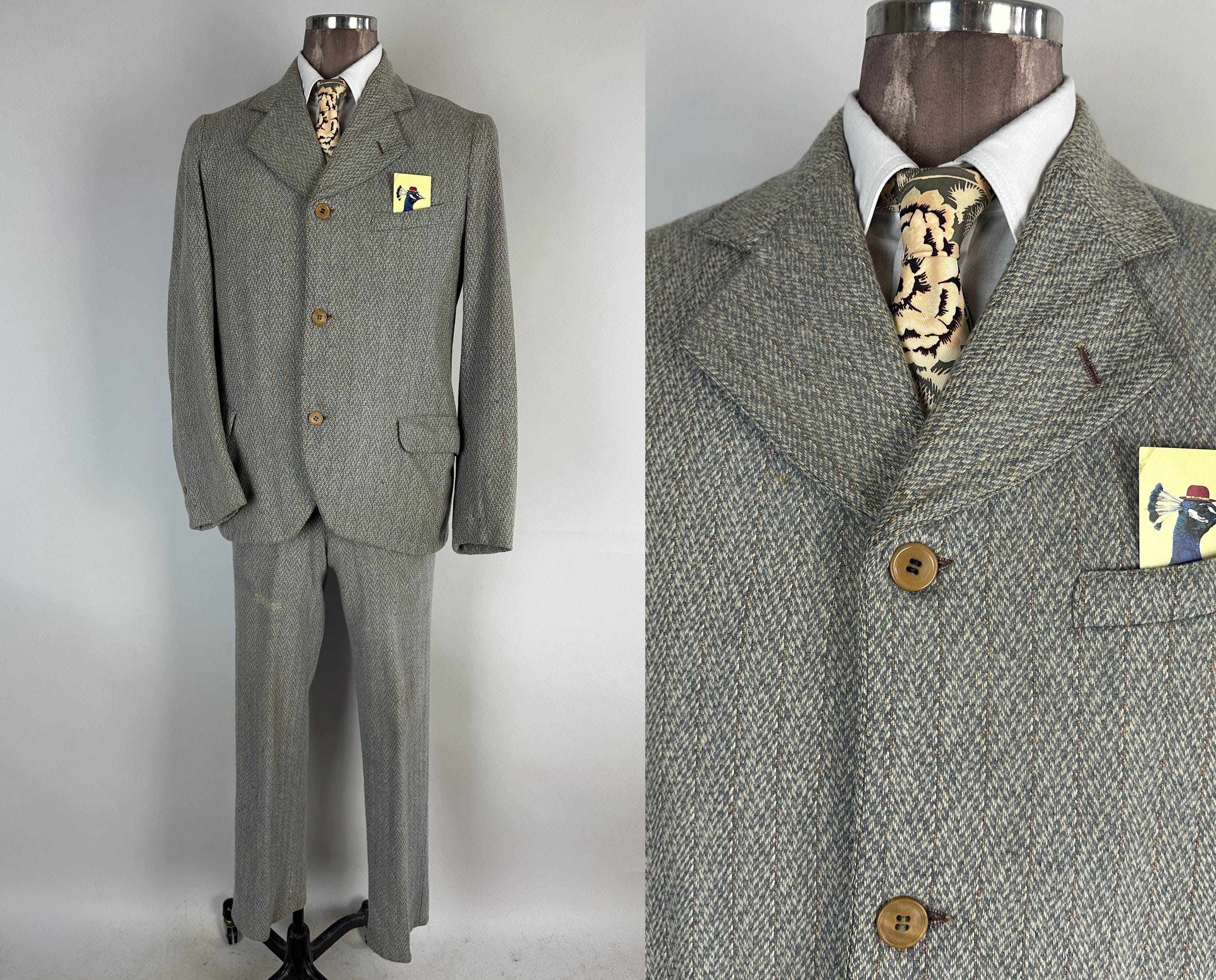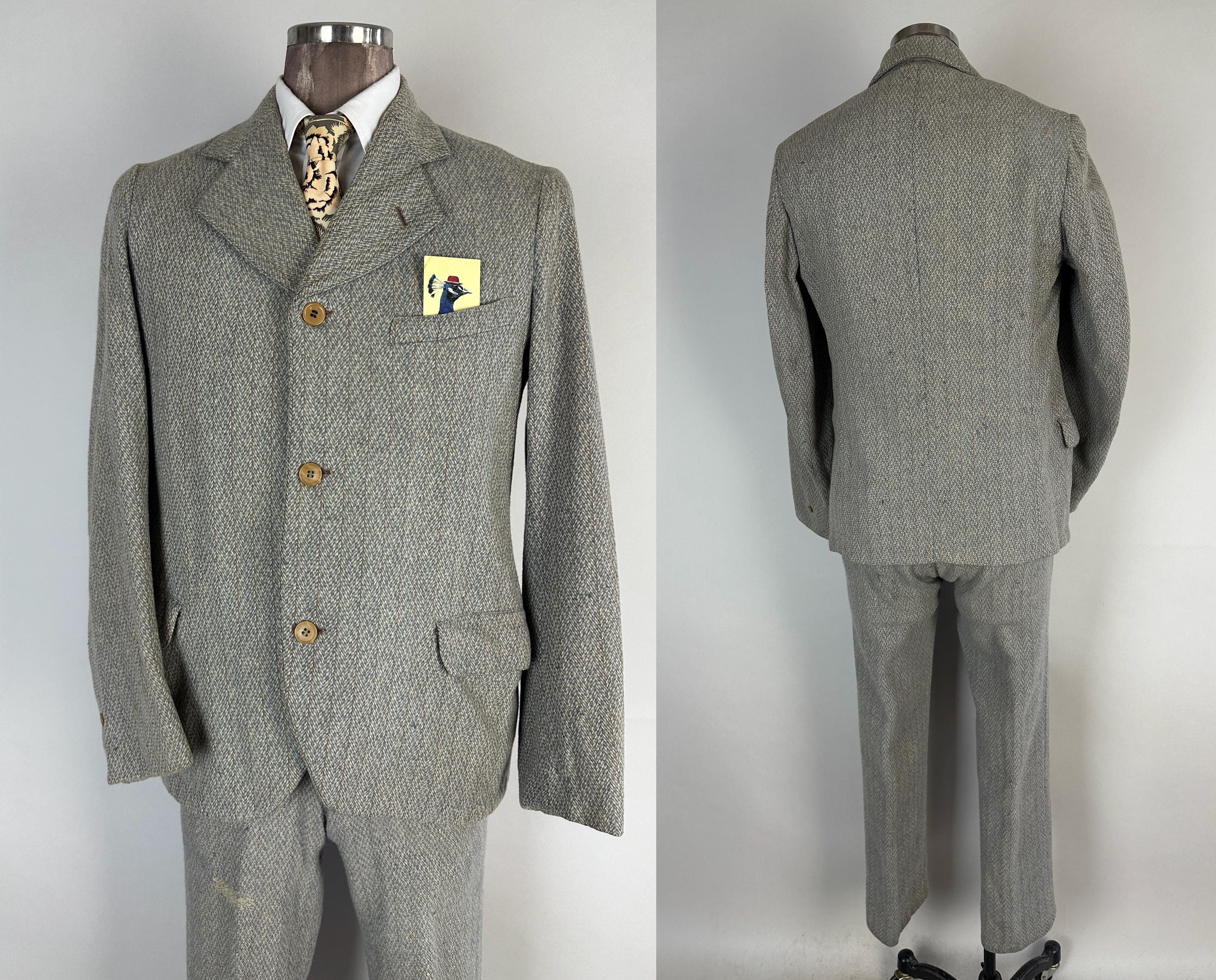 No doubt a gent in a suit is handsome indeed but you'll be upping that ante to a new level in this unique 1920s set! The wonderful wool of this suit is a stunning twist on the herringbone weave using slate blue and dove grey in a mottled tweed topped off with peach pinstripes. The single breasted jacket is butterfly lined and features notched lapels, flap hip pockets, jetted chest pocket, one inner pocket, and buff buttons. The flat front trousers have tunnel belt loops, interior suspender buttons, four welted pockets and one buttoning flap pocket on the back. Making this suit even more fabulous, an inner tag pinpoints it's date to 11-28-27! This suit is in good vintage condition, with a period mend and scattered spots of surface mothing but no holes, stains, or odors to note.