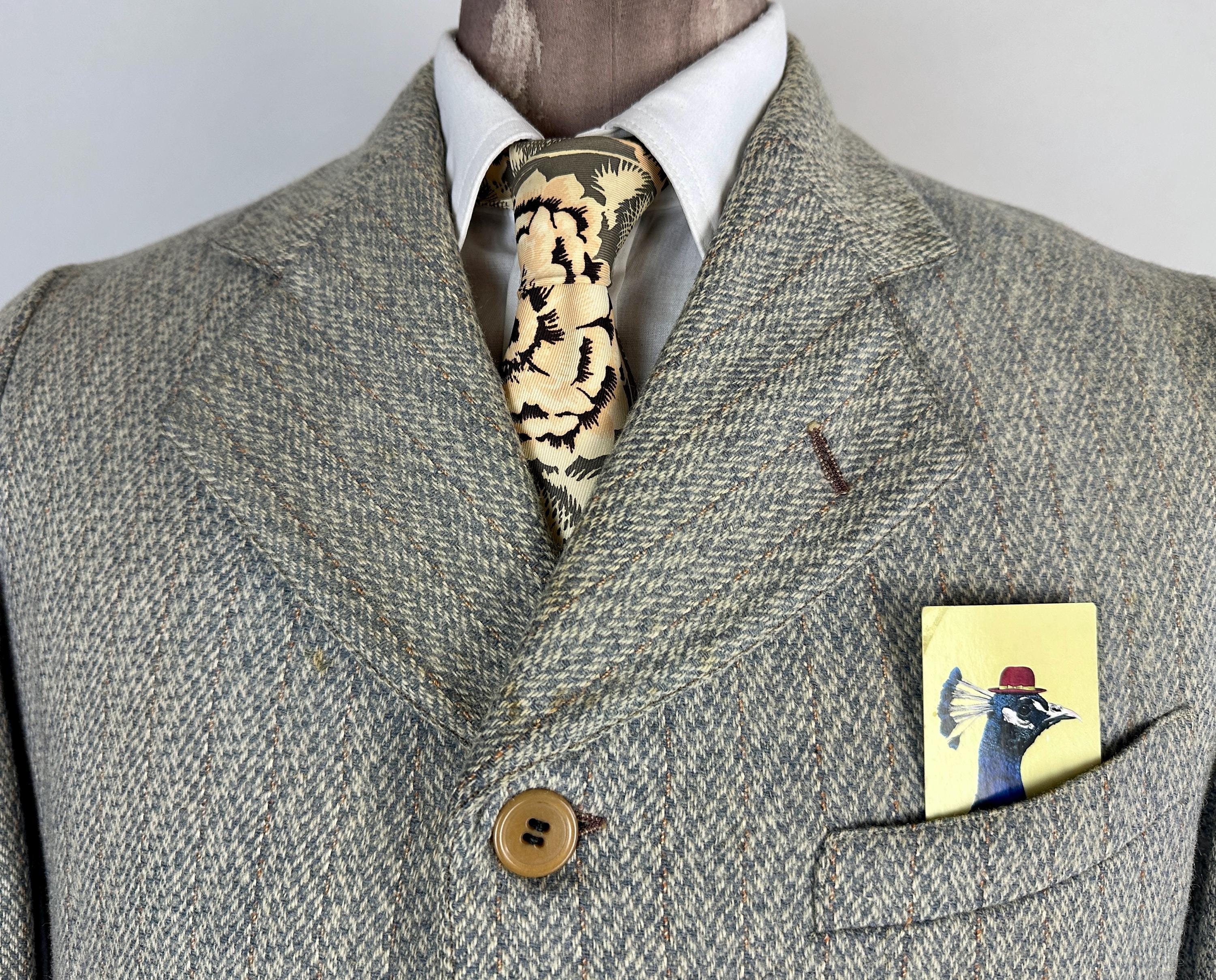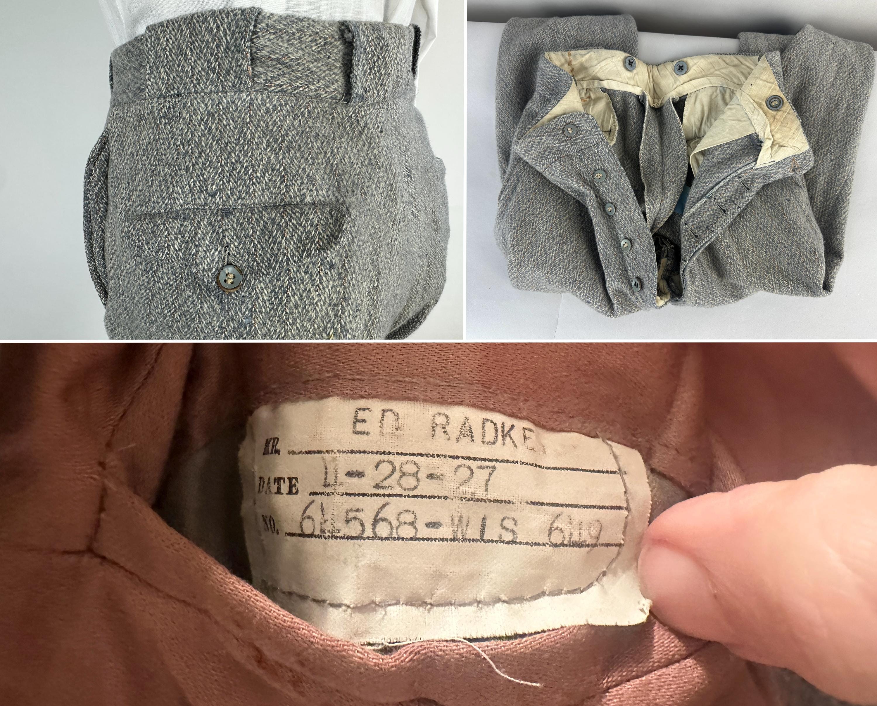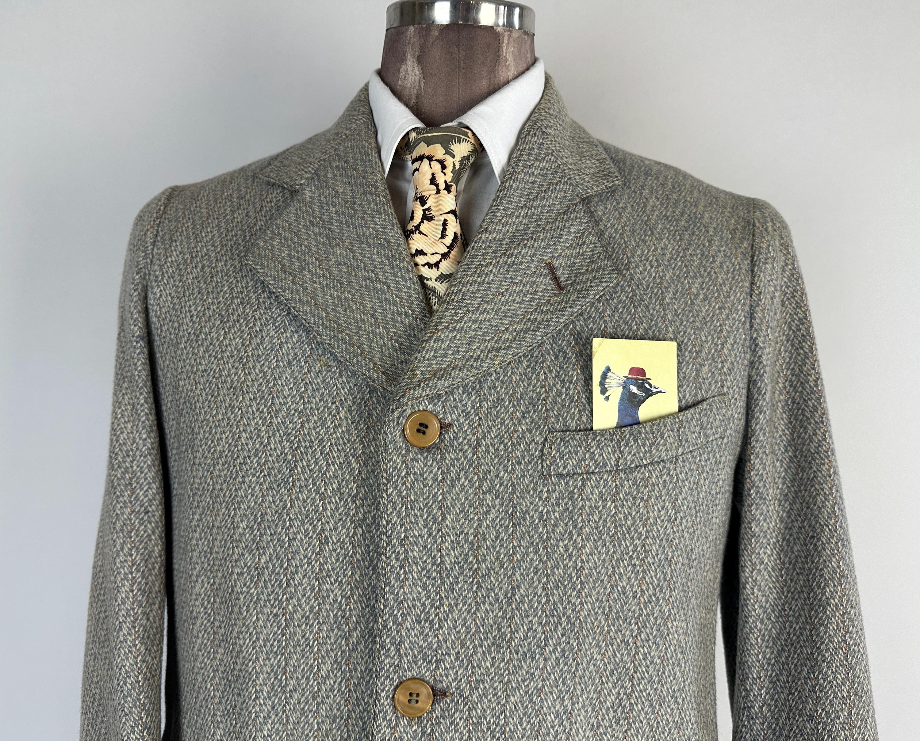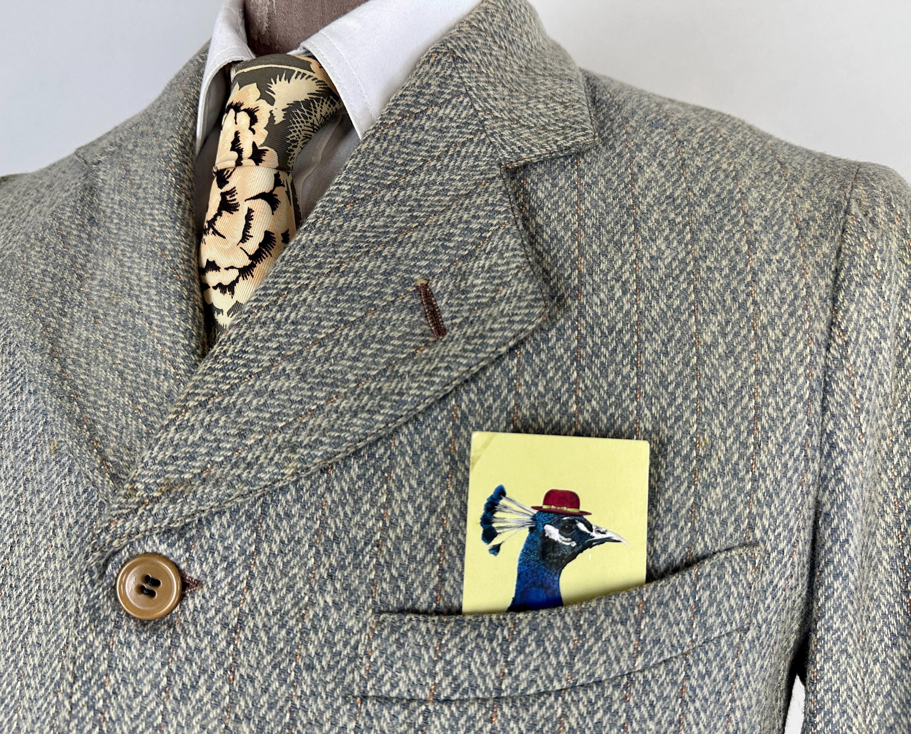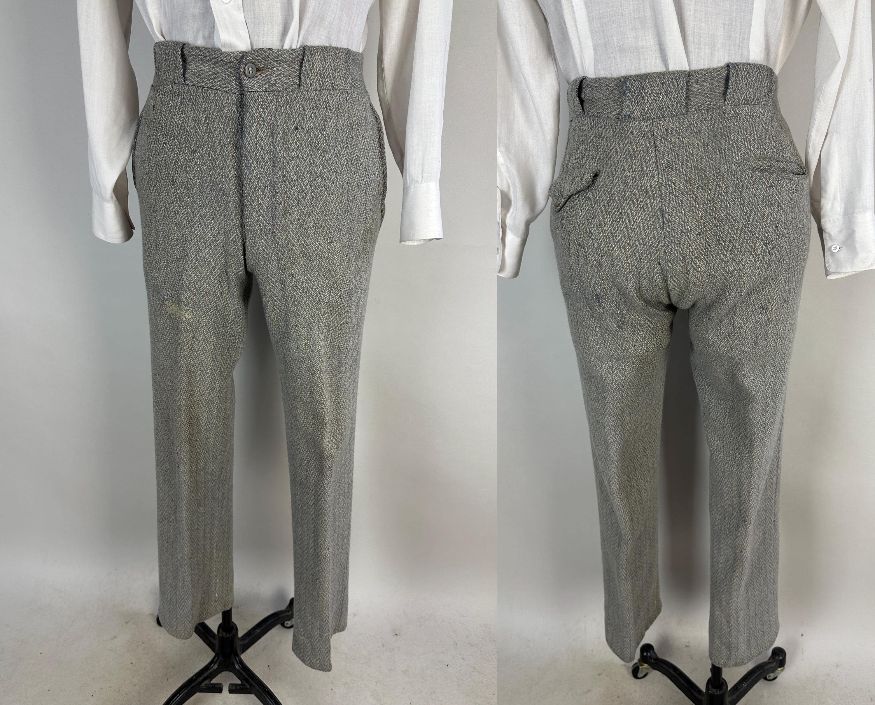 No doubt a gent in a suit is handsome indeed but you'll be upping that ante to a new level in this unique 1920s set! The wonderful wool of this suit is a stunning twist on the herringbone weave using slate blue and dove grey in a mottled tweed topped off with peach pinstripes. The single breasted jacket is butterfly lined and features notched lapels, flap hip pockets, jetted chest pocket, one inner pocket, and buff buttons. The flat front trousers have tunnel belt loops, interior suspender buttons, four welted pockets and one buttoning flap pocket on the back. Making this suit even more fabulous, an inner tag pinpoints it's date to 11-28-27! This suit is in good vintage condition, with a period mend and scattered spots of surface mothing but no holes, stains, or odors to note.