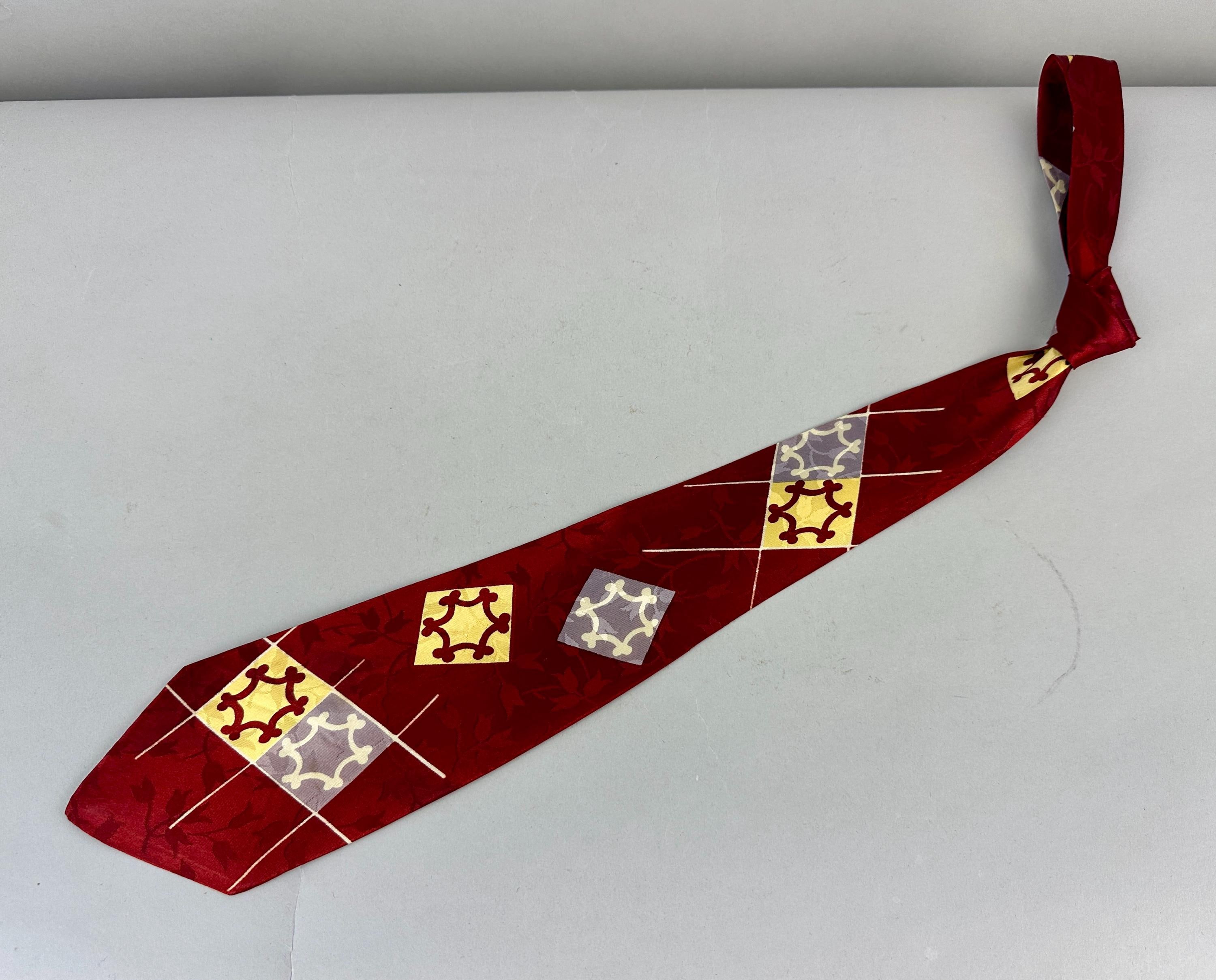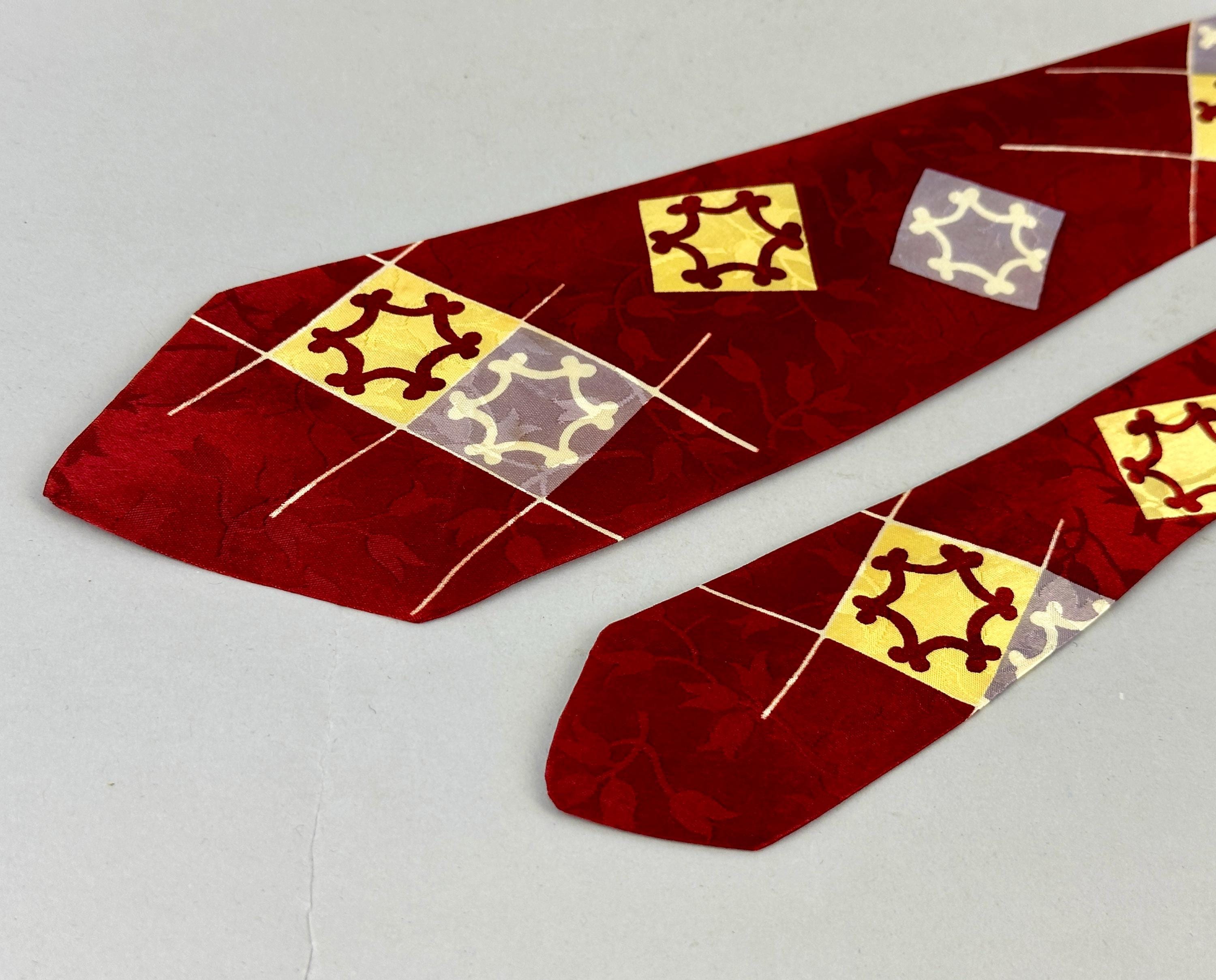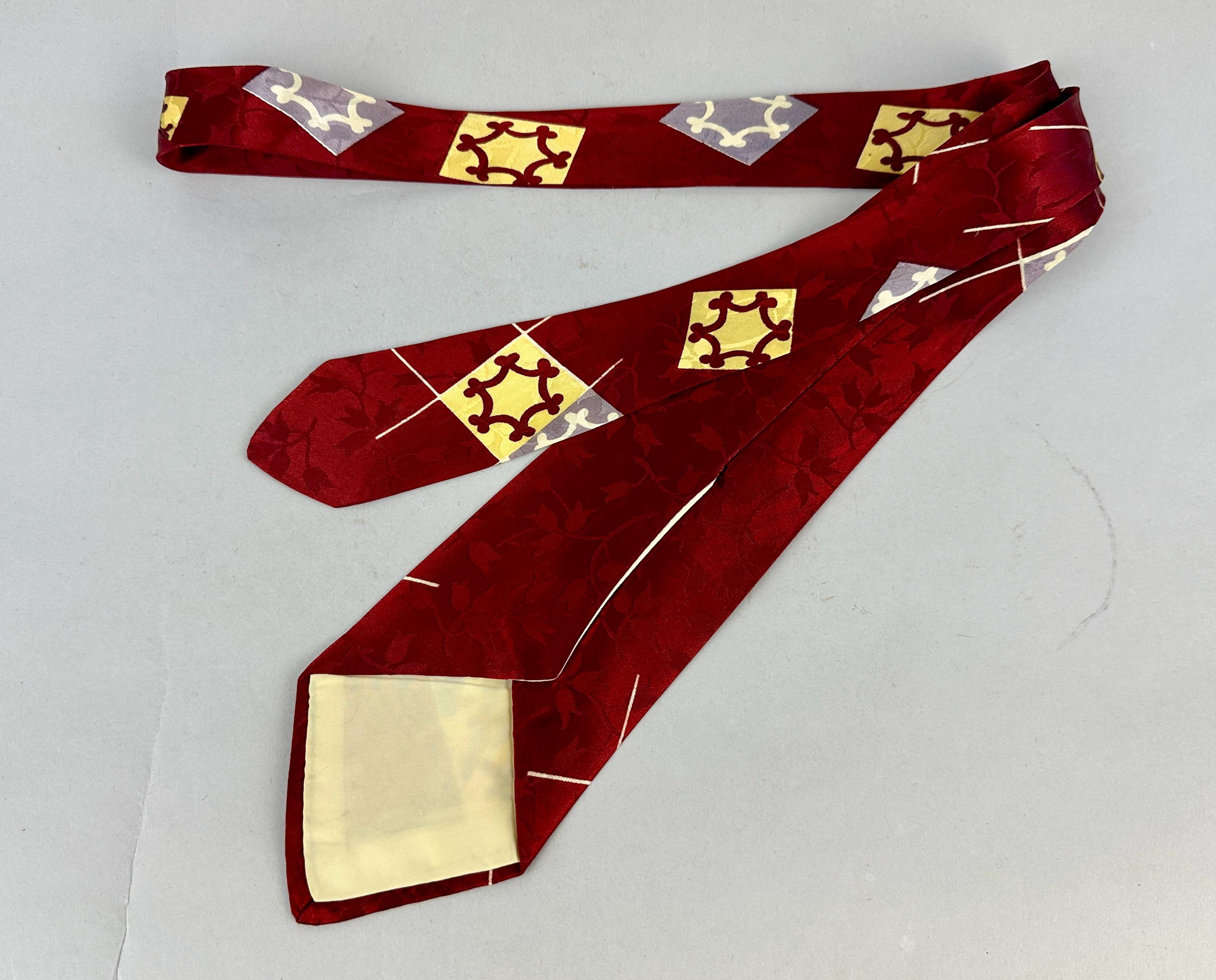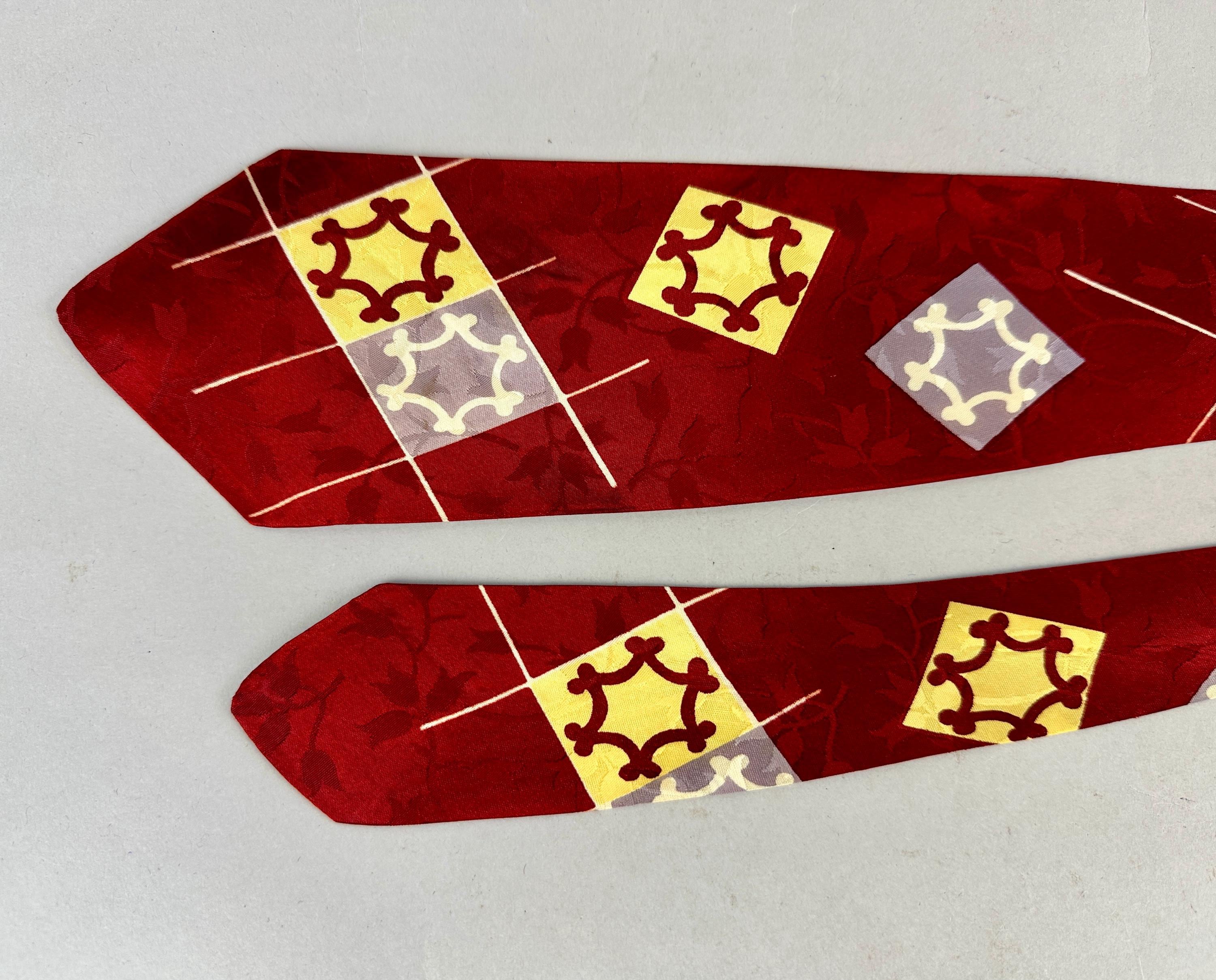 Play a kids game of Hopscotch, Four-Square, or Tic-Tac-Toe in this nostalgic 1940s necktie! Scarlet red floral rayon brocade is printed with a tic-tac-toe board with modernist flowers in sunny yellow and lavender. Fully lined. Pairs well with a wide variety of Art Deco and Mid-Century suit colors and fabric types. This tie is in excellent vintage condition with no flaws found!