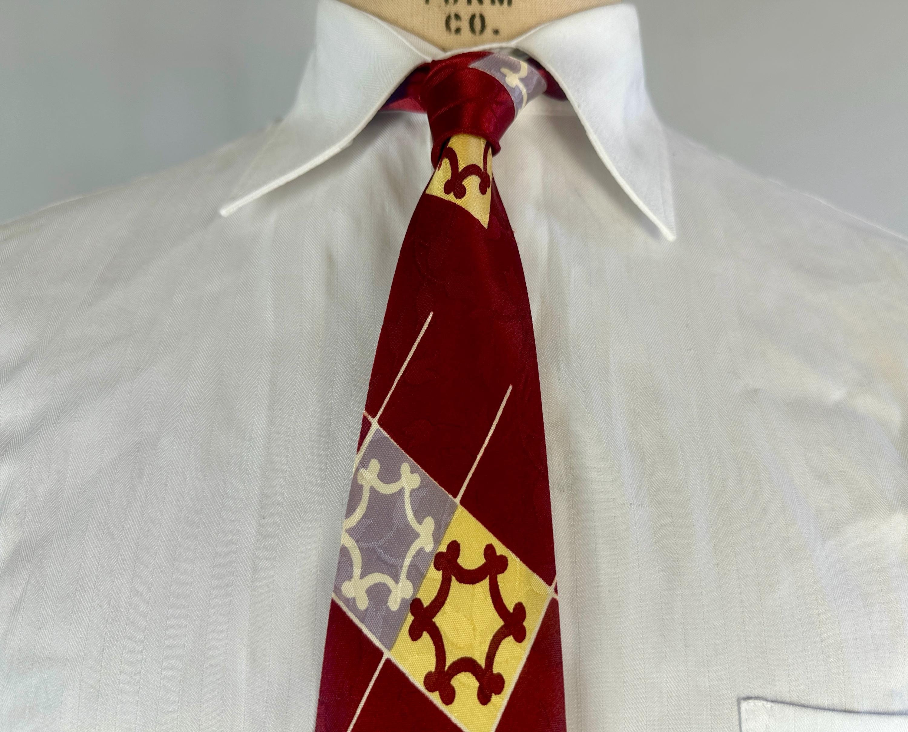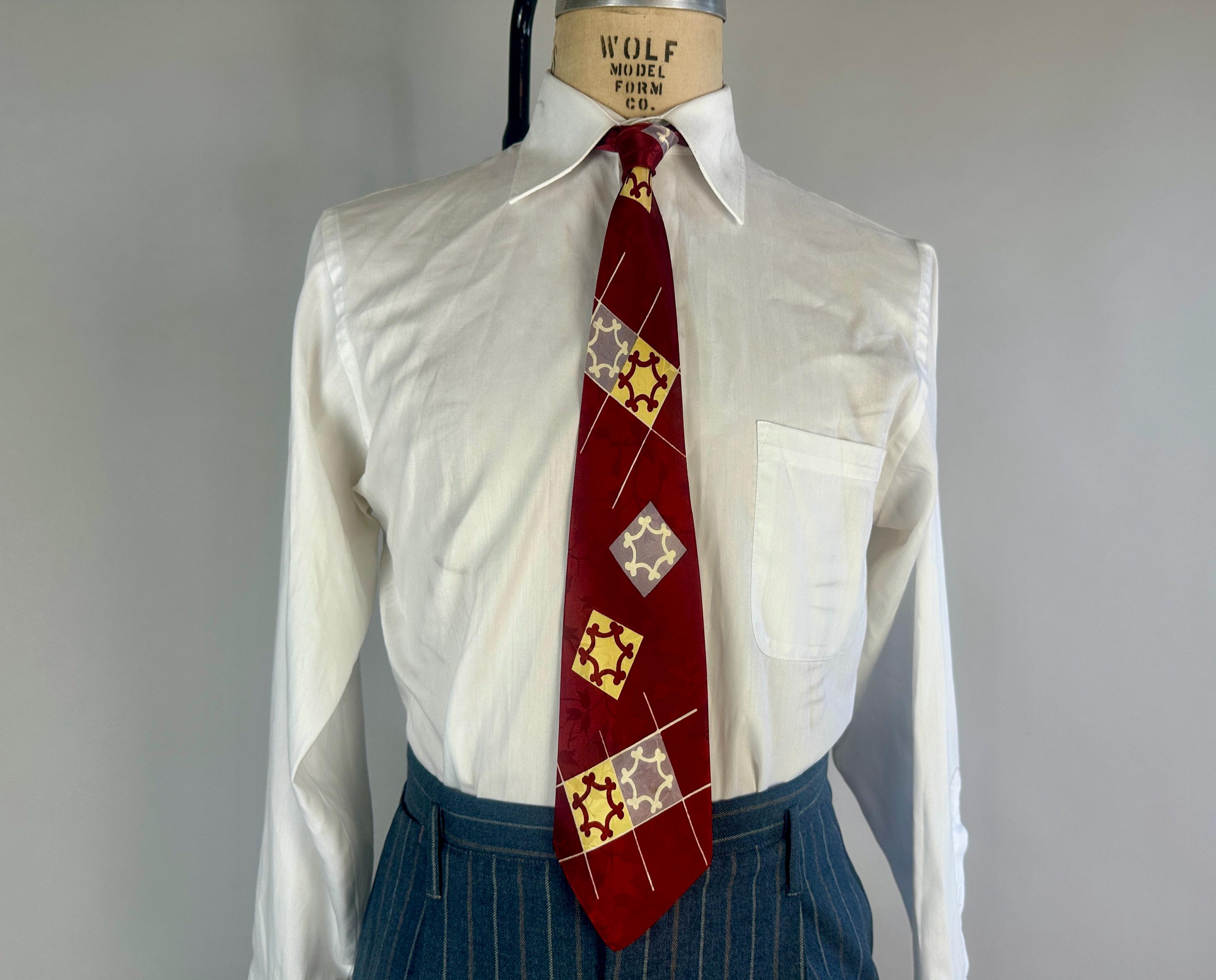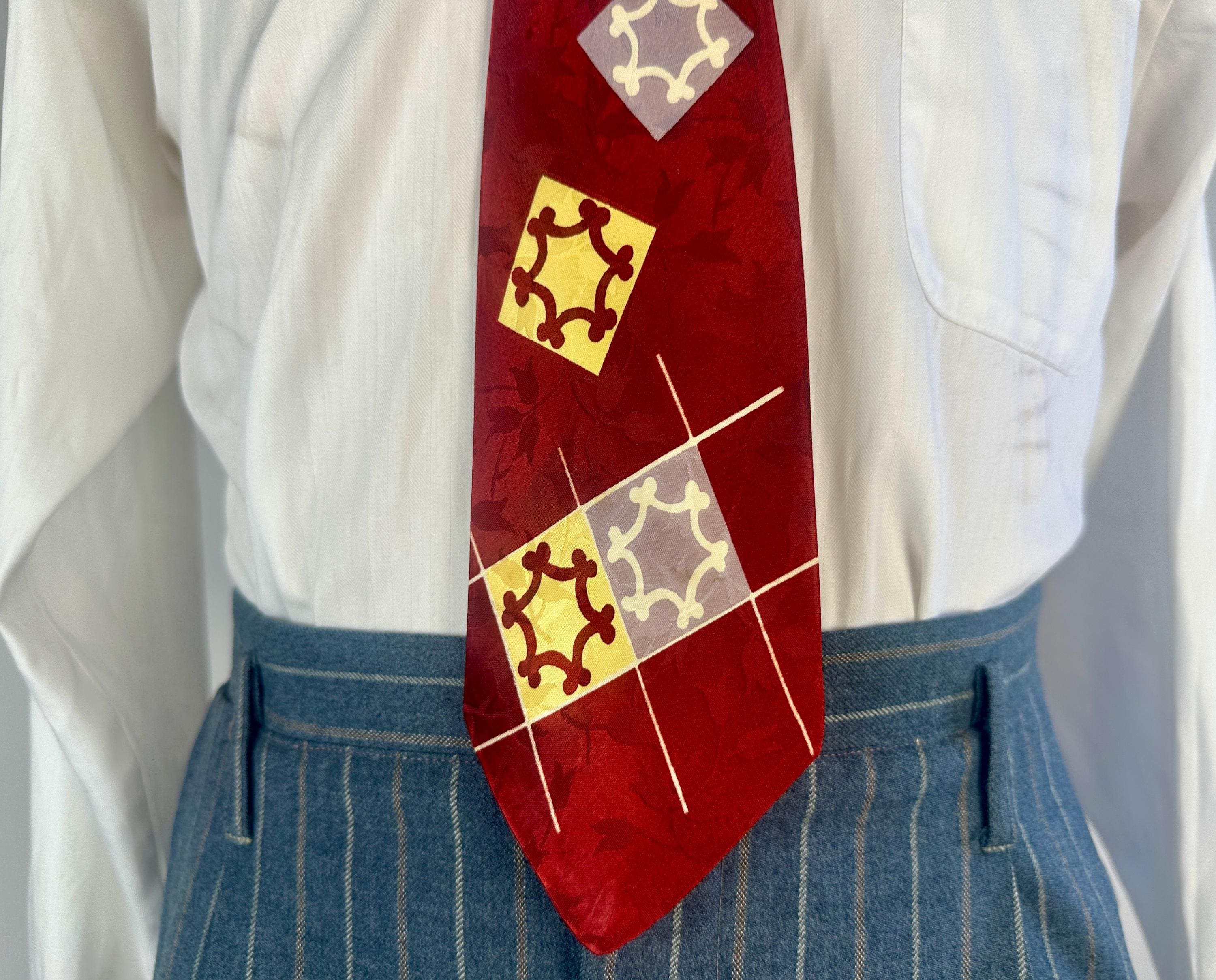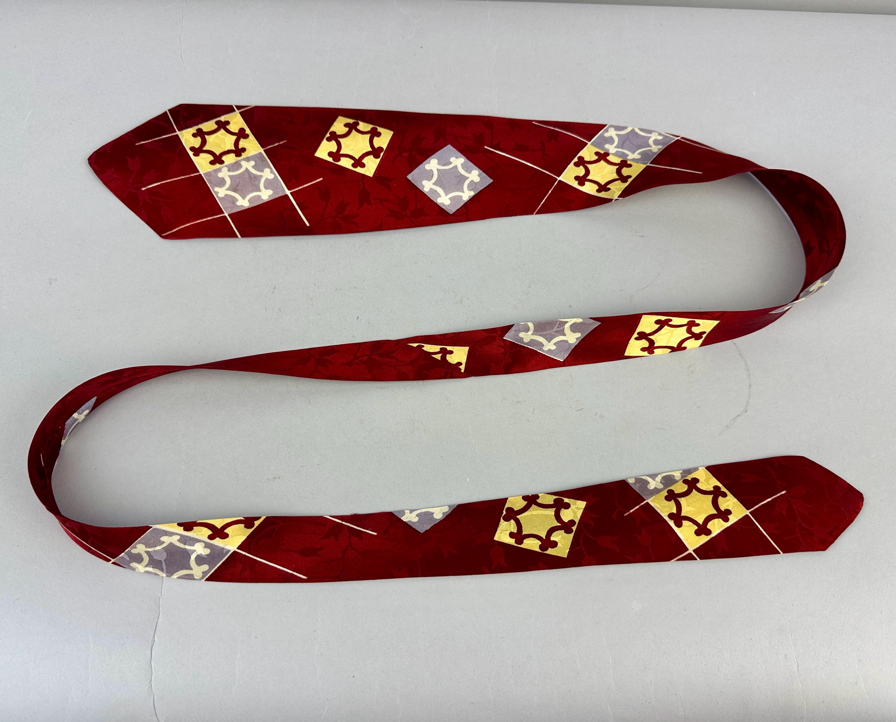 Play a kids game of Hopscotch, Four-Square, or Tic-Tac-Toe in this nostalgic 1940s necktie! Scarlet red floral rayon brocade is printed with a tic-tac-toe board with modernist flowers in sunny yellow and lavender. Fully lined. Pairs well with a wide variety of Art Deco and Mid-Century suit colors and fabric types. This tie is in excellent vintage condition with no flaws found!