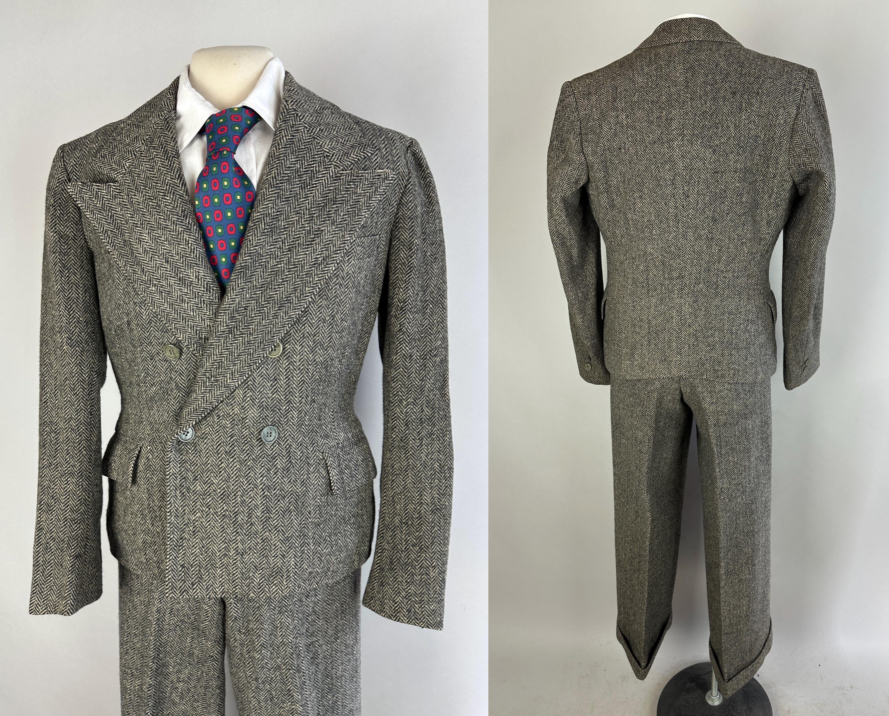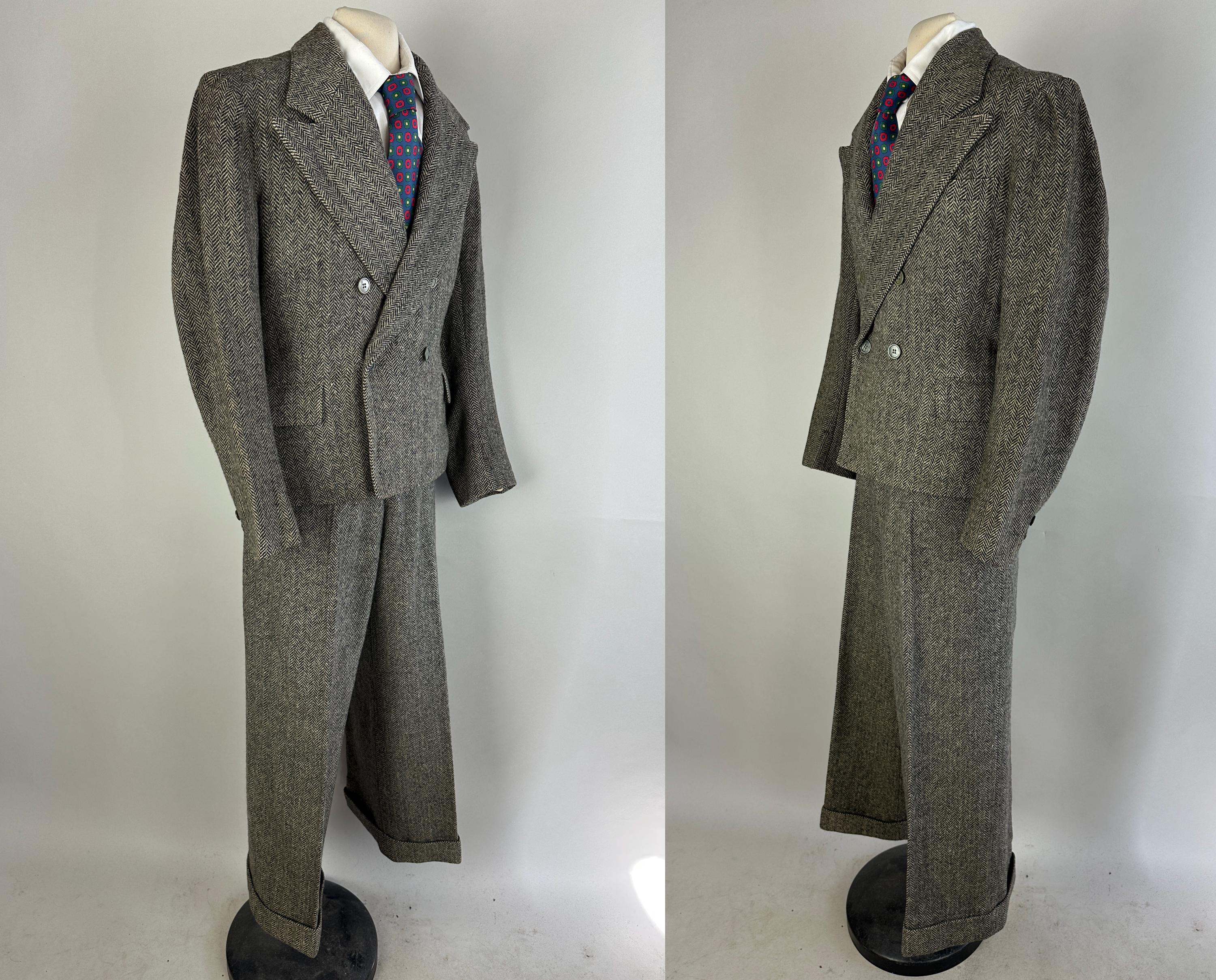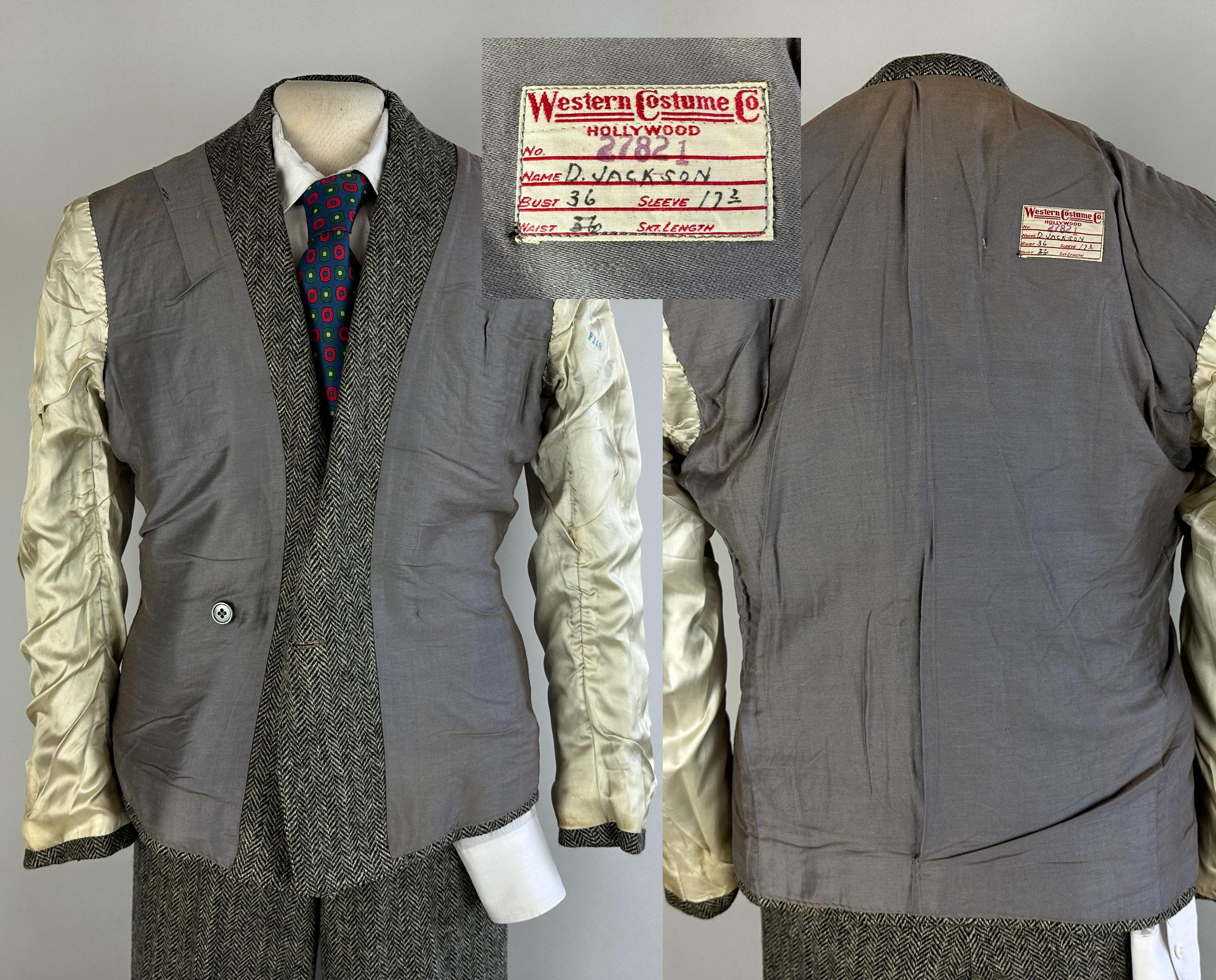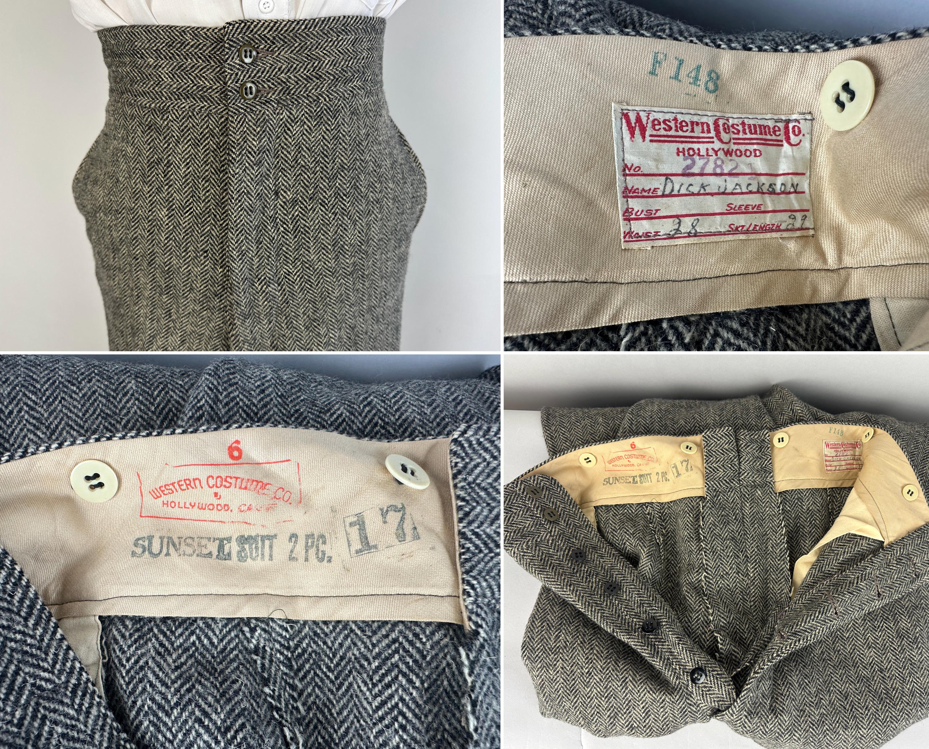Make a statement wherever you go in this amazing screen-worn collegiate suit! Black and white herringbone tweed wool sets the stage for some incredible and fun details! Double breasted peak lapel jacket features a rare 1x4 button closure, two matching buttons at each cuff, jetted chest pocket, two flapped hip pockets, and unvented "bum freezer" length cut. Fully lined interior with shoulder pads. Trousers feature an ultra-wide 3" tall waistband, flat front, side slash pockets and fantastic 26" circumference wide true oxford bags cuffs! Trousers are finished with a notch back, button fly, and full set of inner suspender buttons. Both pieces tagged-and-stamped by Western Costume of Hollywood and stamped "Sunset Suit". This suit is in great vintage condition, with no holes, stains, odors to note.