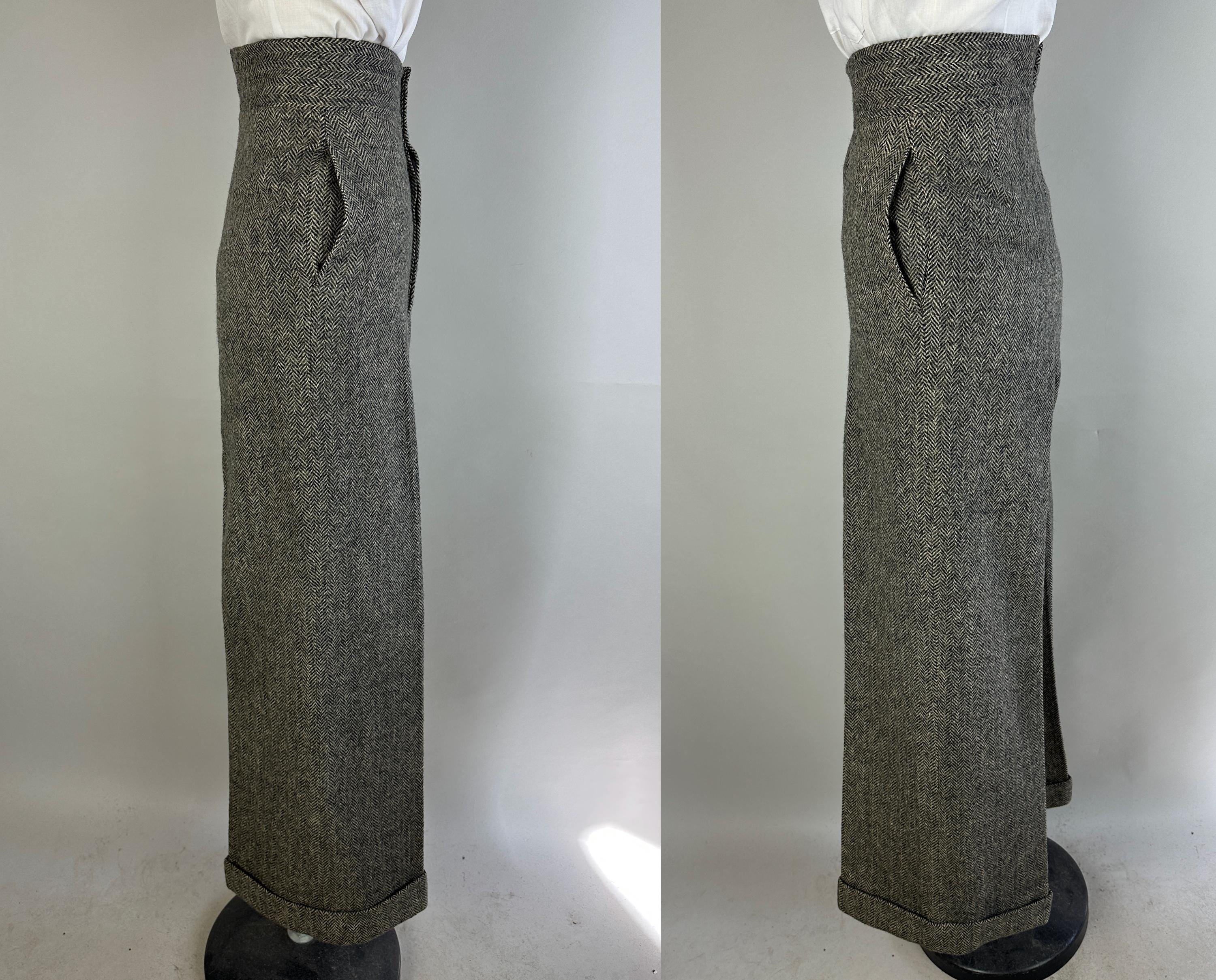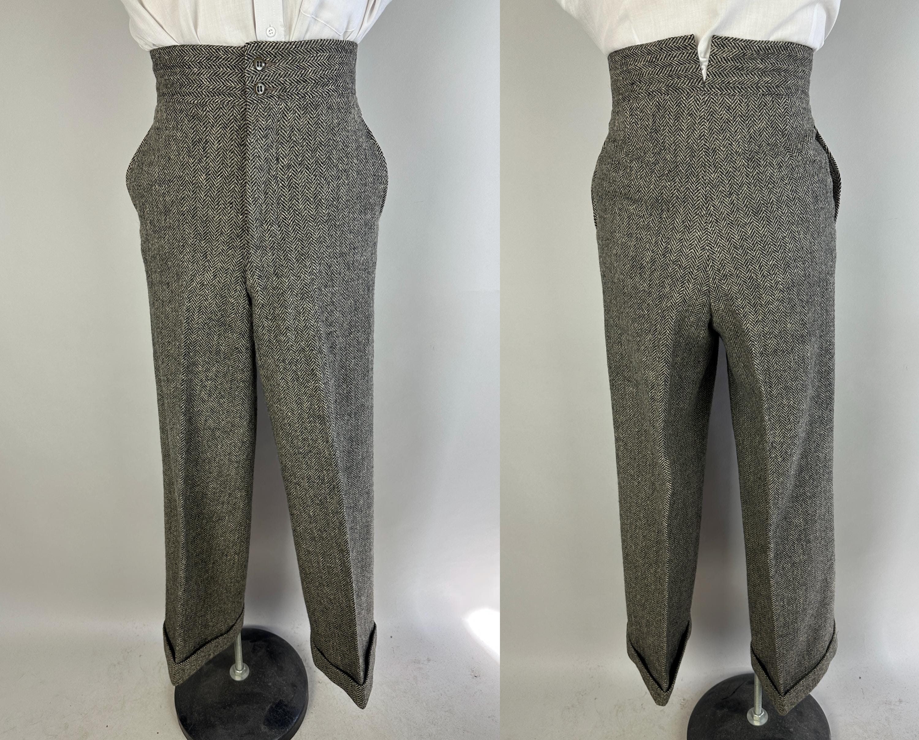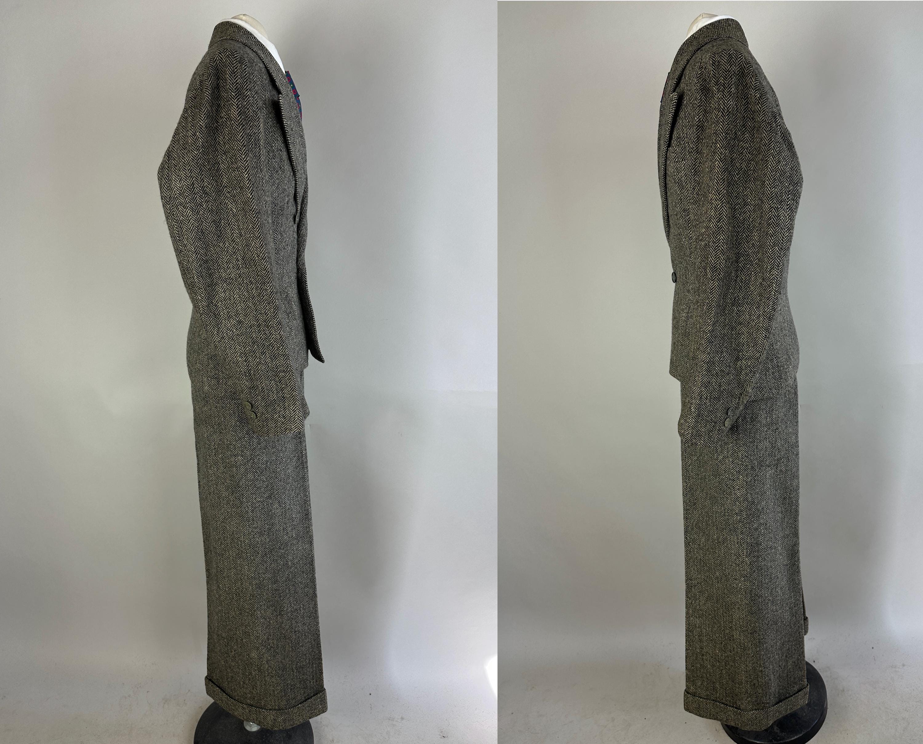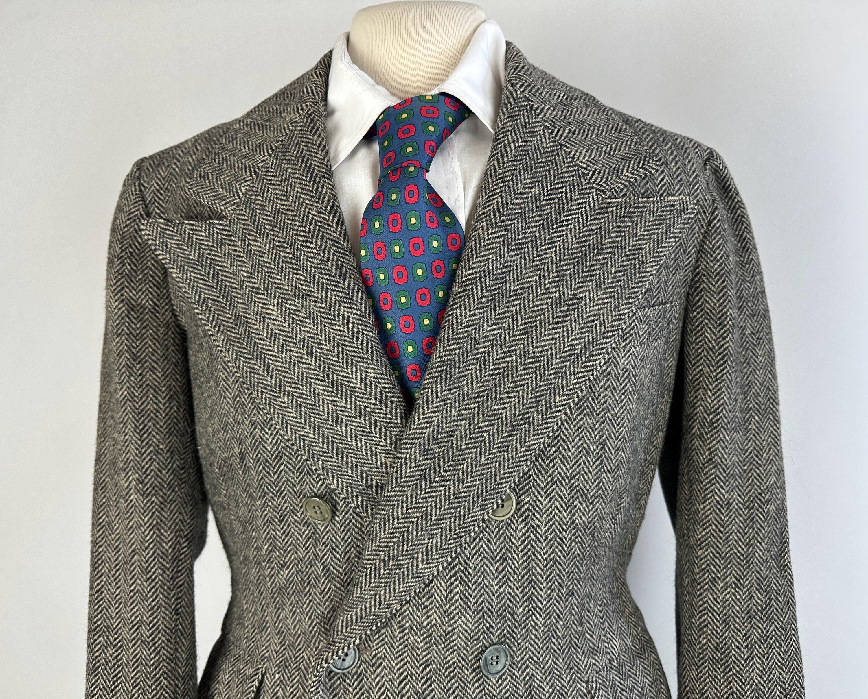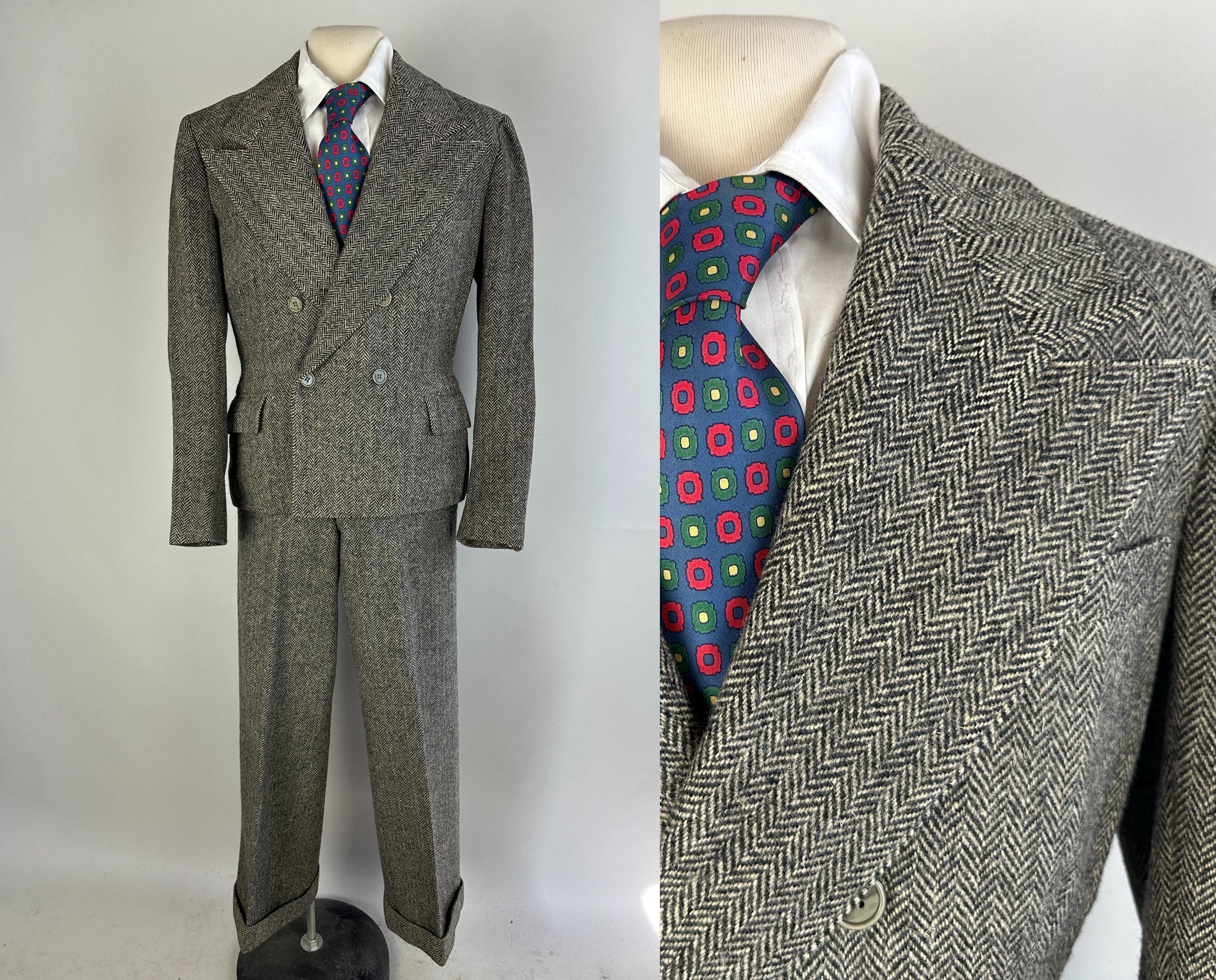 Make a statement wherever you go in this amazing screen-worn collegiate suit! Black and white herringbone tweed wool sets the stage for some incredible and fun details! Double breasted peak lapel jacket features a rare 1x4 button closure, two matching buttons at each cuff, jetted chest pocket, two flapped hip pockets, and unvented "bum freezer" length cut. Fully lined interior with shoulder pads. Trousers feature an ultra-wide 3" tall waistband, flat front, side slash pockets and fantastic 26" circumference wide true oxford bags cuffs! Trousers are finished with a notch back, button fly, and full set of inner suspender buttons. Both pieces tagged-and-stamped by Western Costume of Hollywood and stamped "Sunset Suit". This suit is in great vintage condition, with no holes, stains, odors to note.