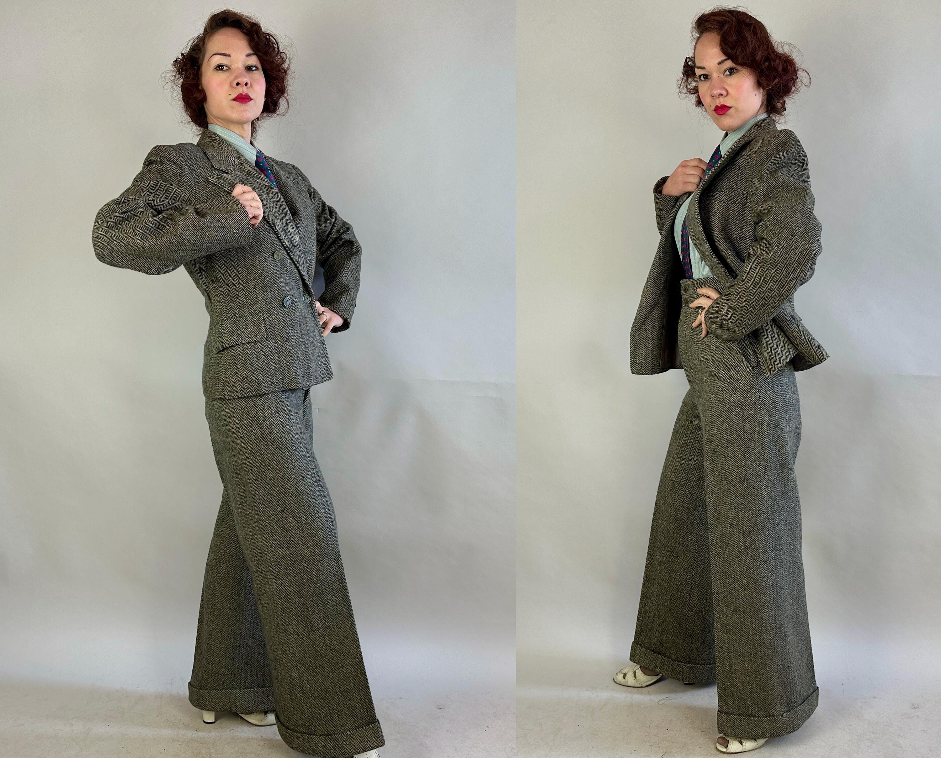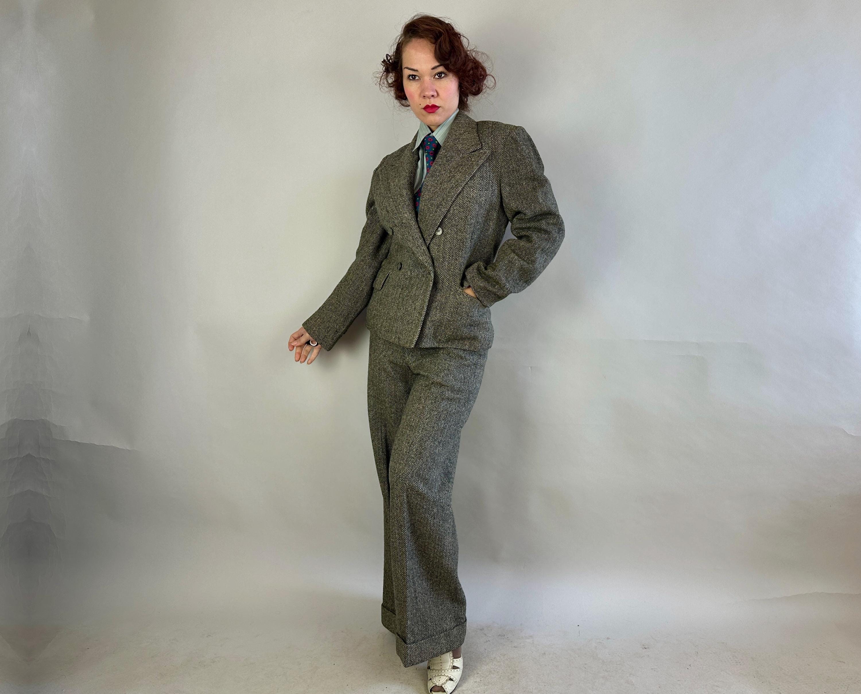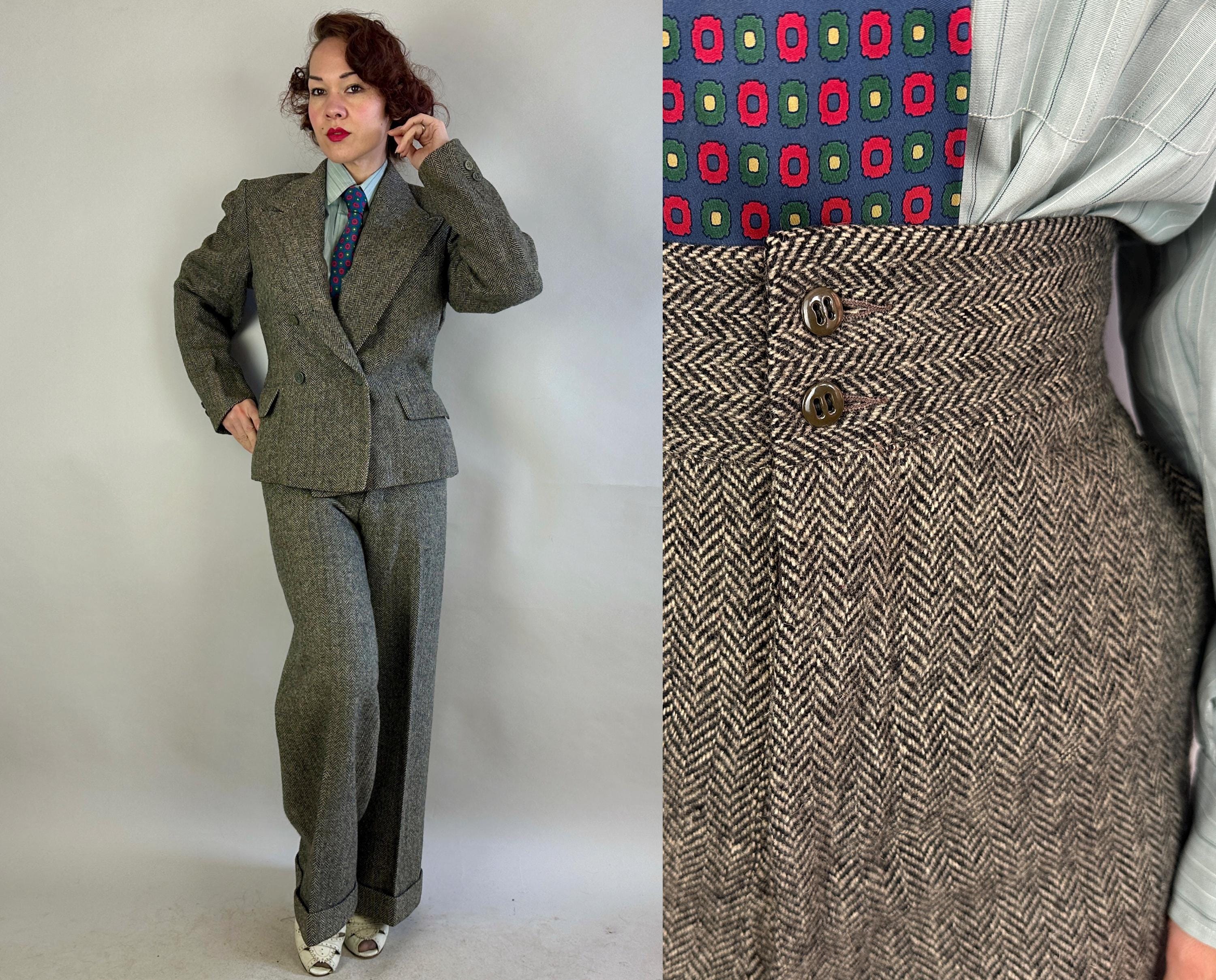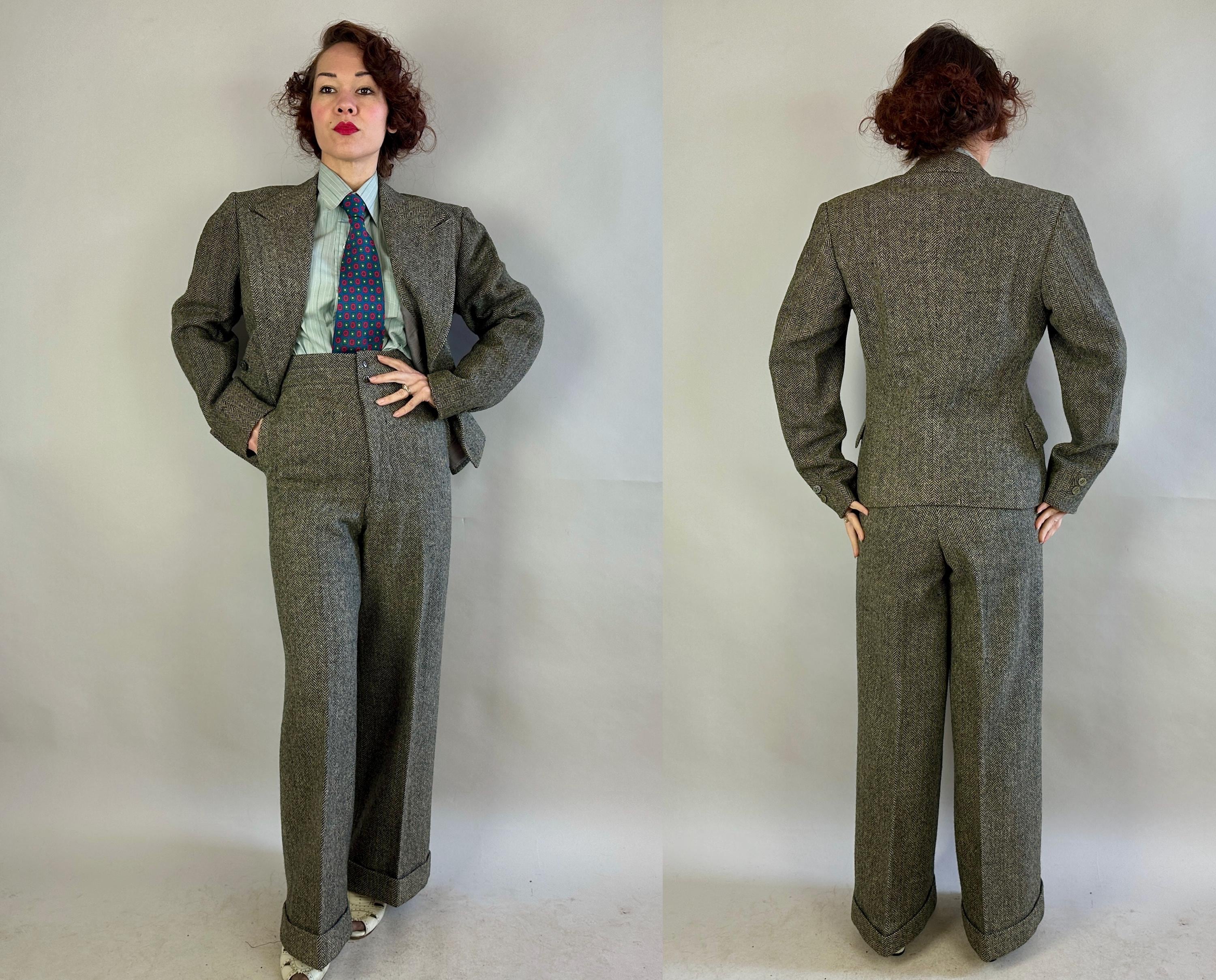 Make a statement wherever you go in this amazing screen-worn collegiate suit! Black and white herringbone tweed wool sets the stage for some incredible and fun details! Double breasted peak lapel jacket features a rare 1x4 button closure, two matching buttons at each cuff, jetted chest pocket, two flapped hip pockets, and unvented "bum freezer" length cut. Fully lined interior with shoulder pads. Trousers feature an ultra-wide 3" tall waistband, flat front, side slash pockets and fantastic 26" circumference wide true oxford bags cuffs! Trousers are finished with a notch back, button fly, and full set of inner suspender buttons. Both pieces tagged-and-stamped by Western Costume of Hollywood and stamped "Sunset Suit". This suit is in great vintage condition, with no holes, stains, odors to note.