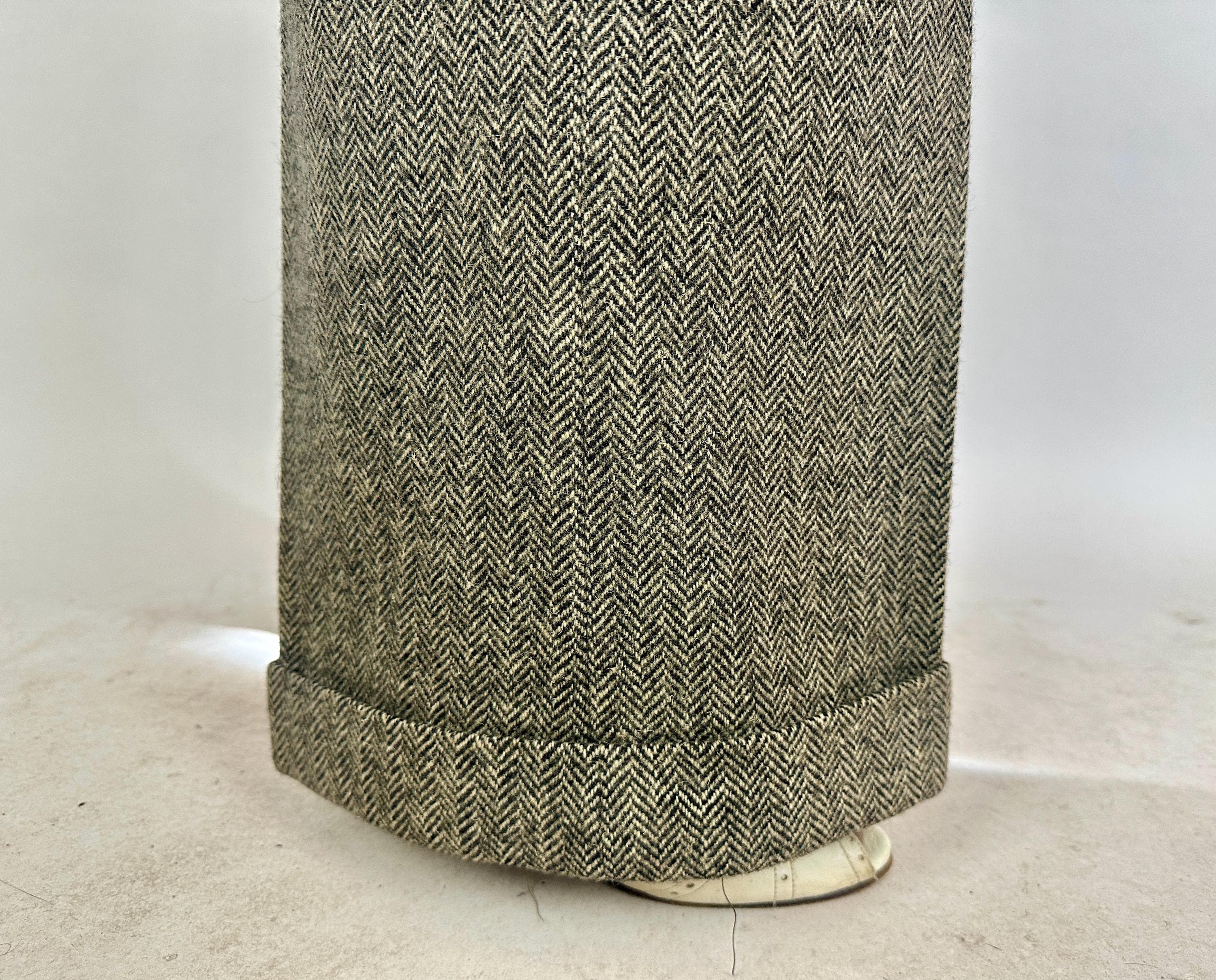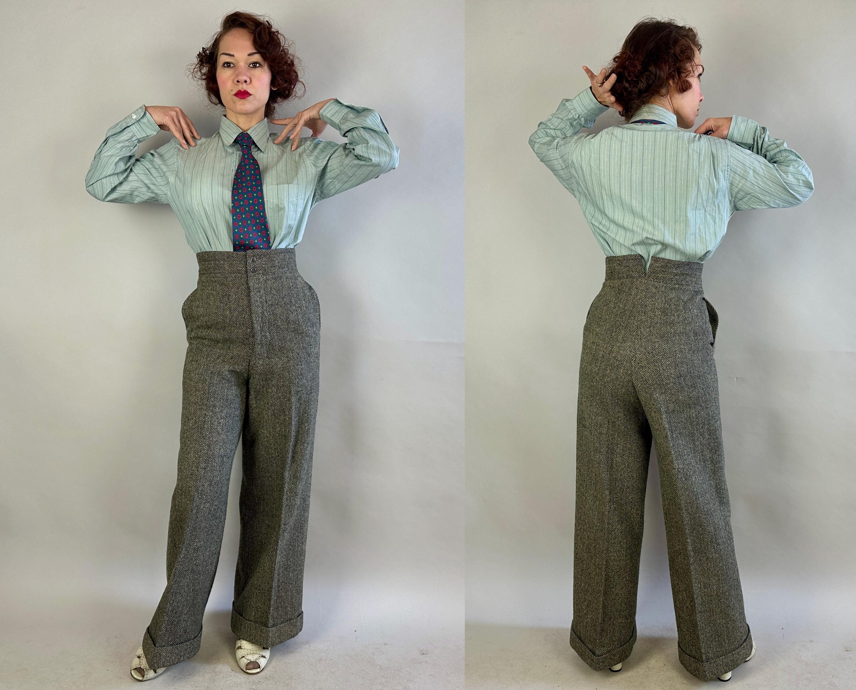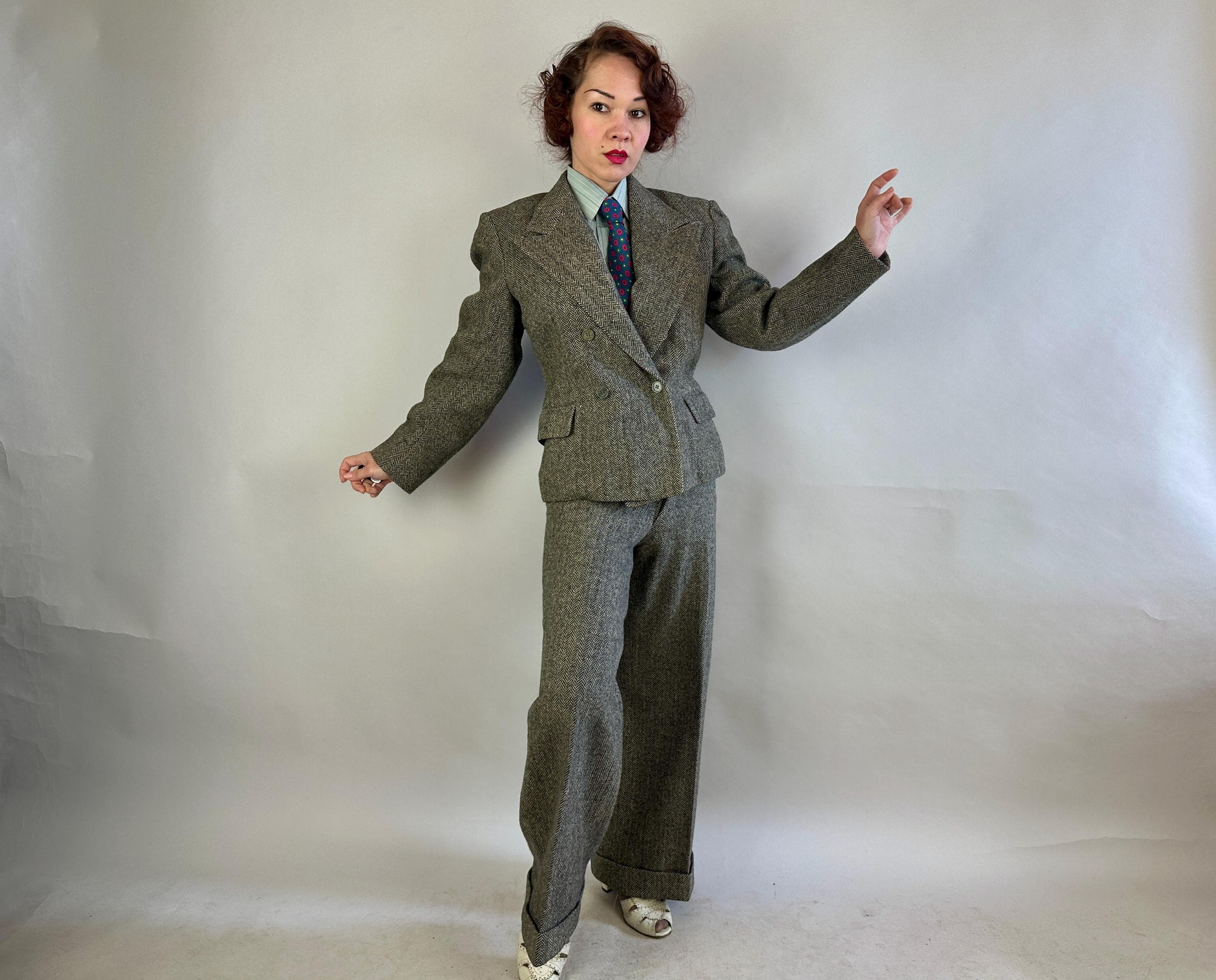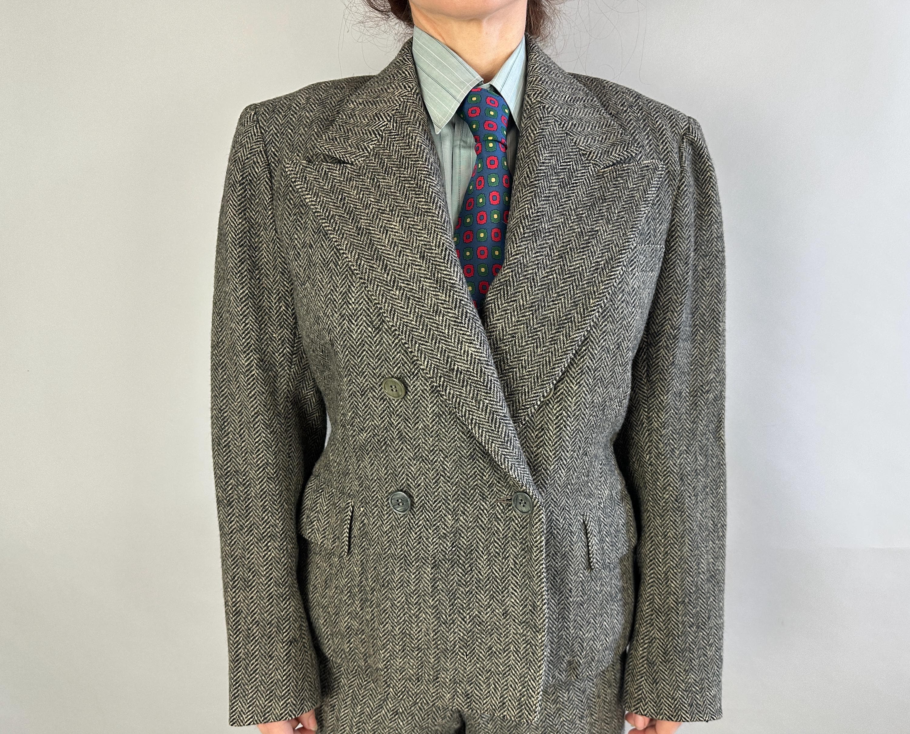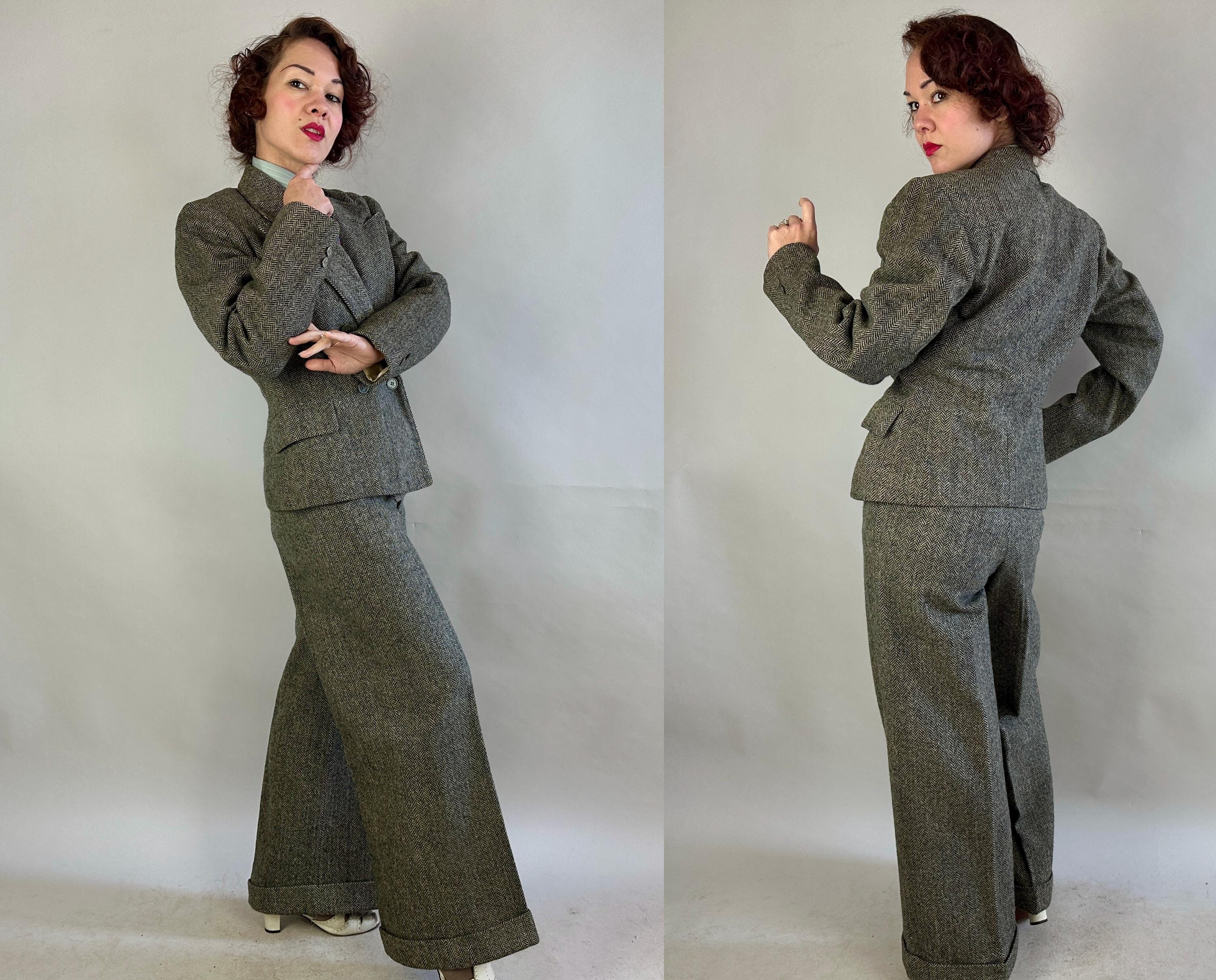 Make a statement wherever you go in this amazing screen-worn collegiate suit! Black and white herringbone tweed wool sets the stage for some incredible and fun details! Double breasted peak lapel jacket features a rare 1x4 button closure, two matching buttons at each cuff, jetted chest pocket, two flapped hip pockets, and unvented "bum freezer" length cut. Fully lined interior with shoulder pads. Trousers feature an ultra-wide 3" tall waistband, flat front, side slash pockets and fantastic 26" circumference wide true oxford bags cuffs! Trousers are finished with a notch back, button fly, and full set of inner suspender buttons. Both pieces tagged-and-stamped by Western Costume of Hollywood and stamped "Sunset Suit". This suit is in great vintage condition, with no holes, stains, odors to note.