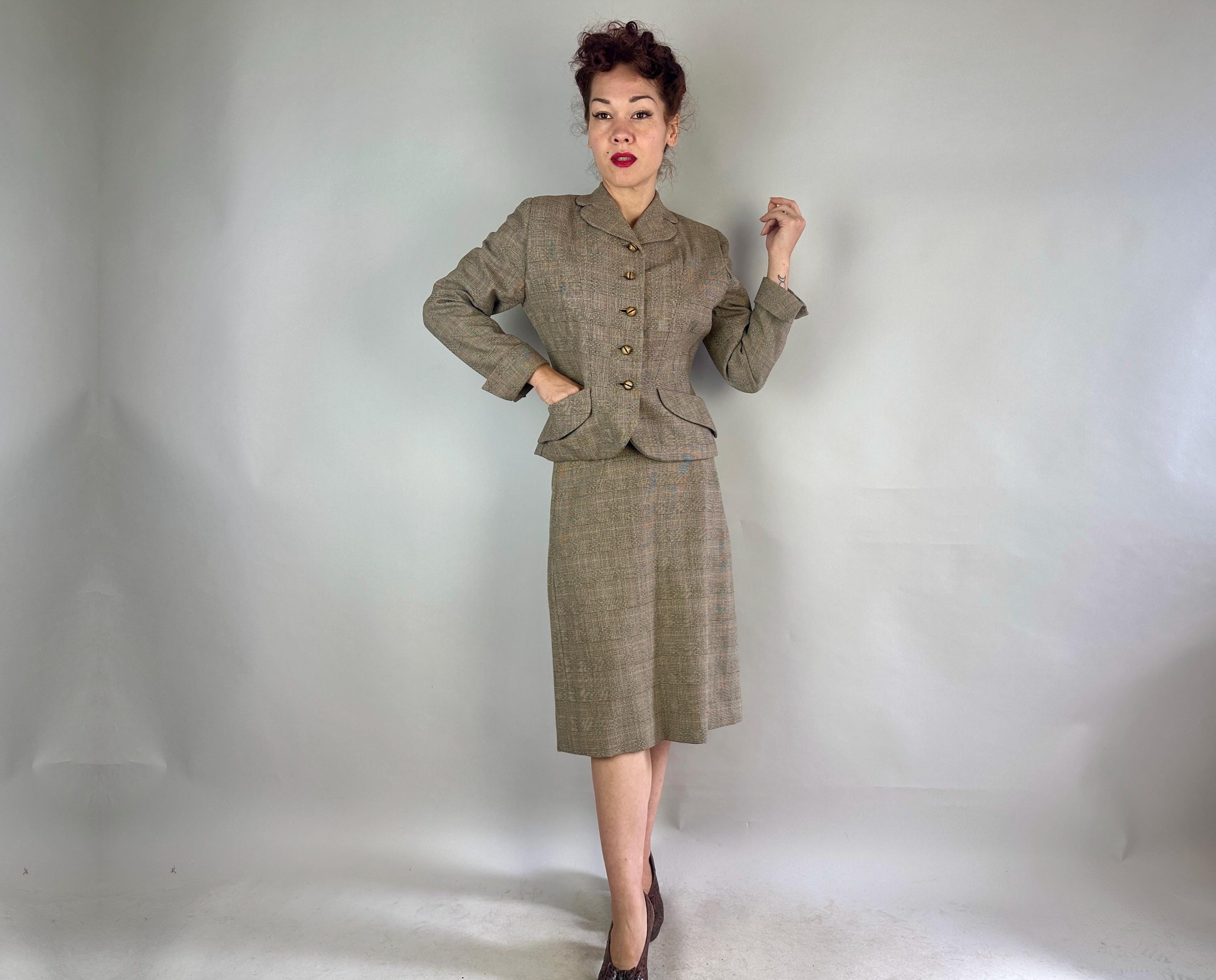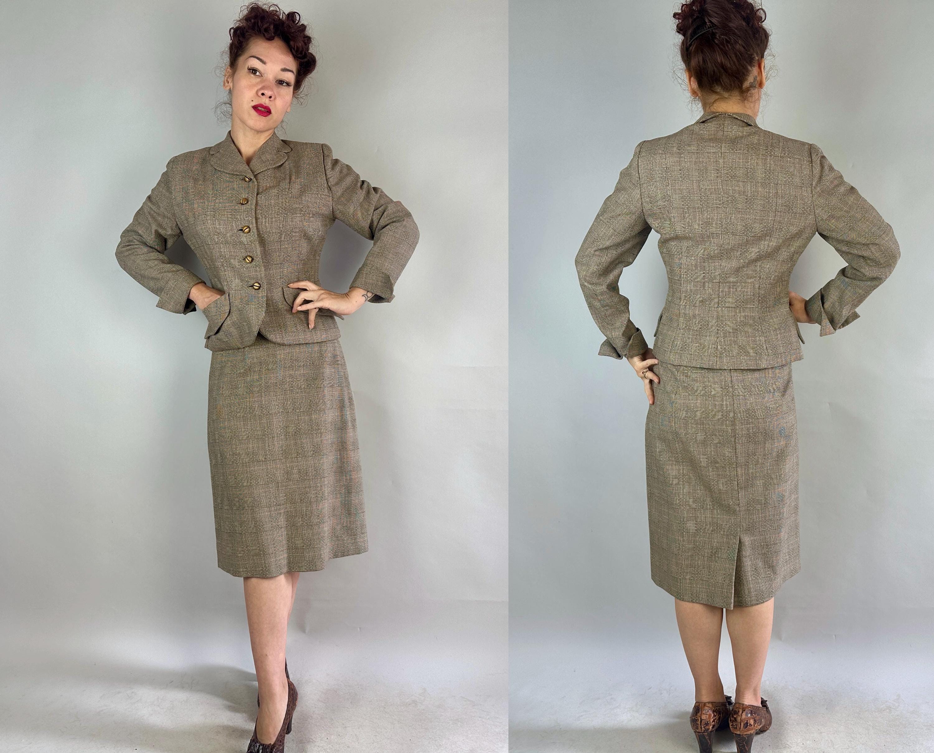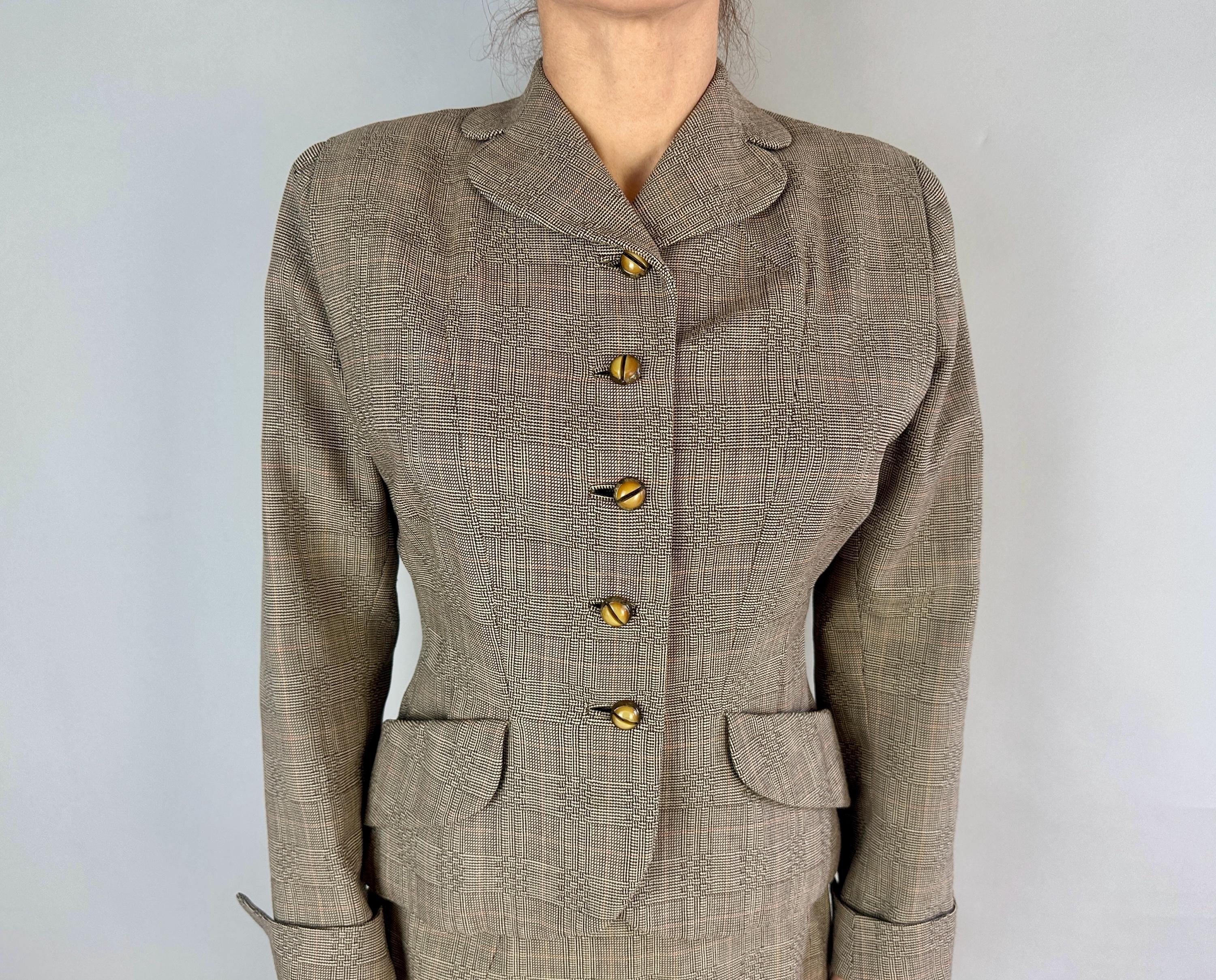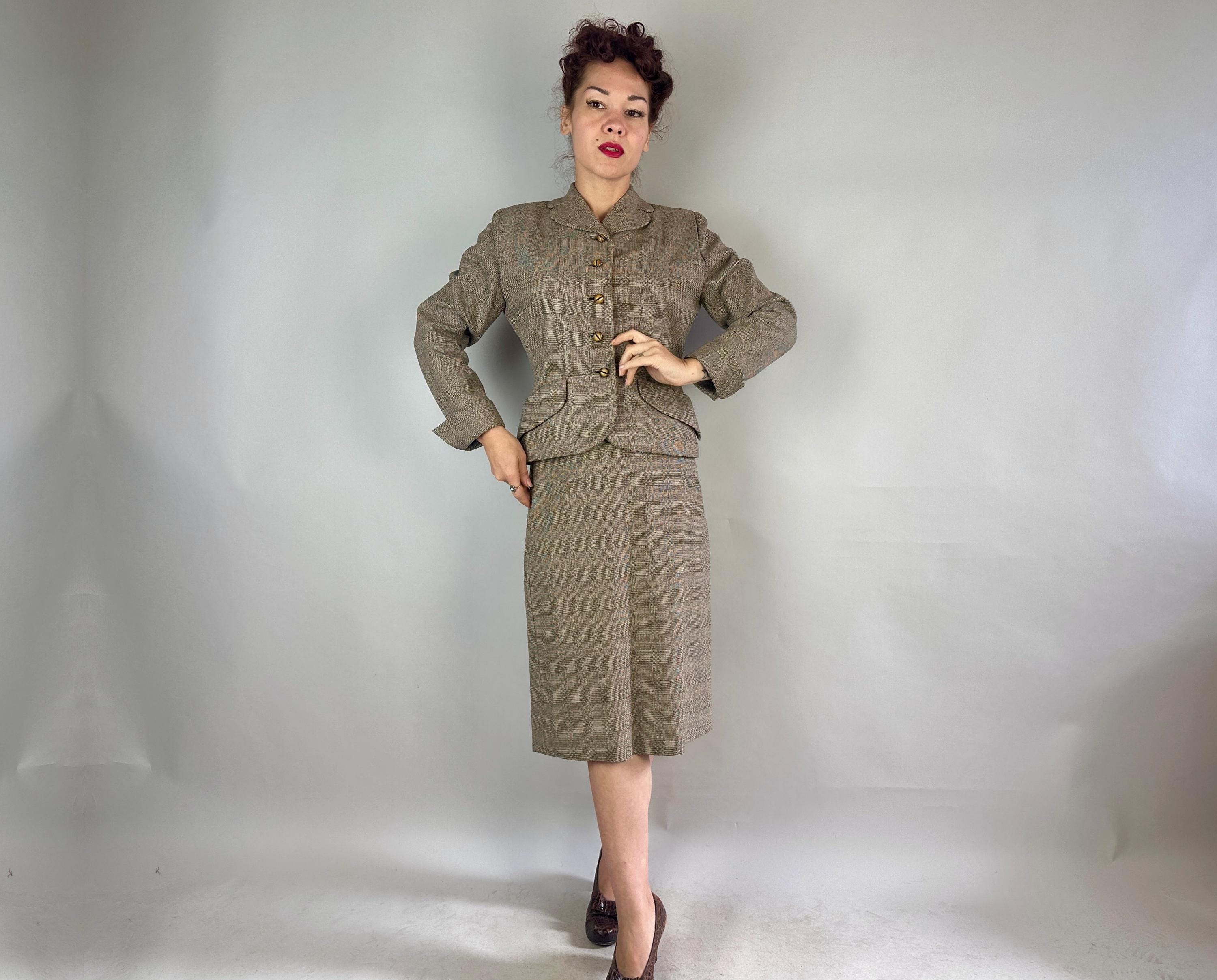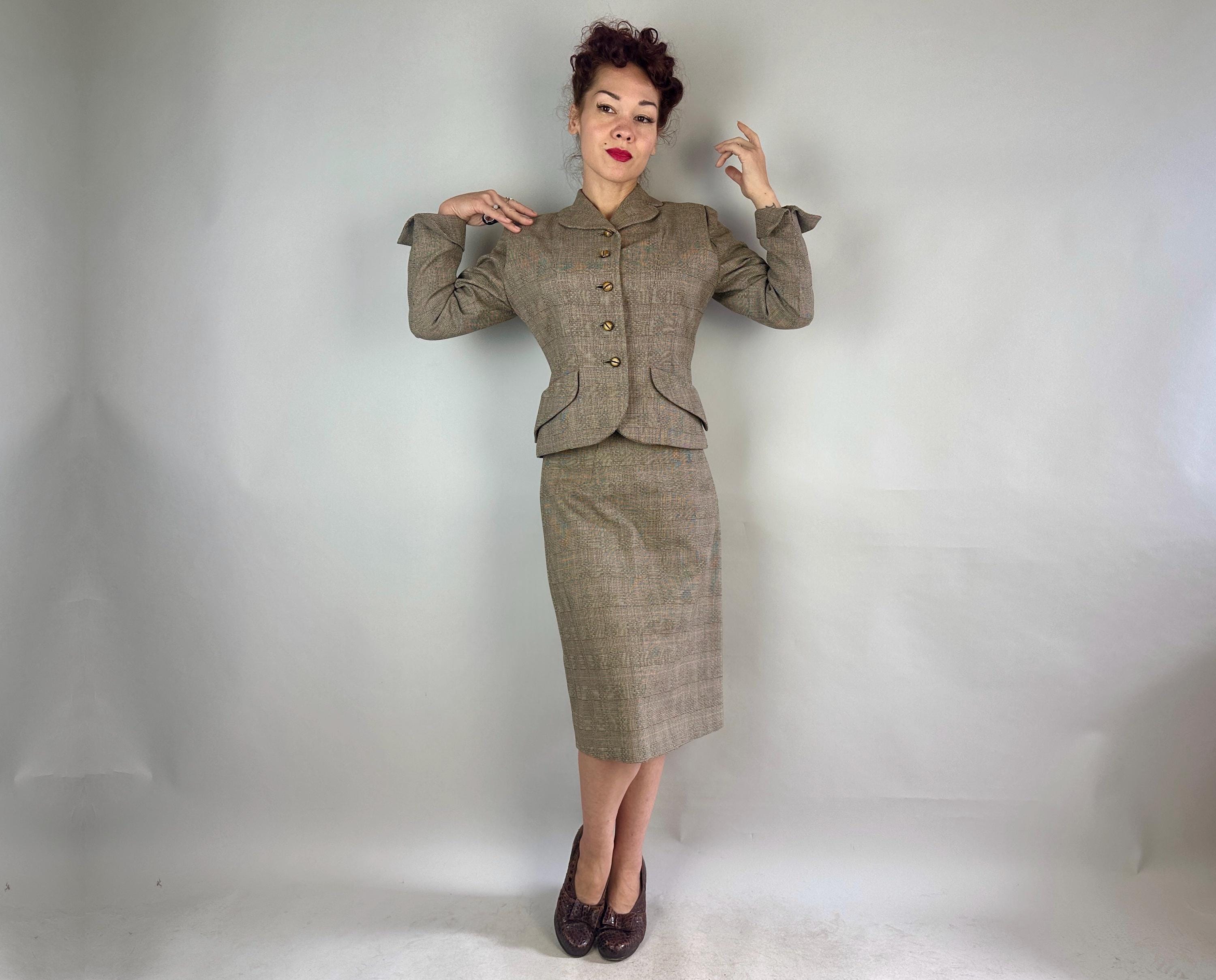 A bitter morning will be made smooth like cream in your coffee when you suit up in this 1940s set! The wool cloth is a wonderful mix of creative weaves in coffee brown and cream white and made plaid with shots of burnt orange. The jacket has a darling rounded lobe notch lapel, action pleats on the shoulder fronts, pointed notch cuffs, waist nipping seams, and hip pockets with curving flaps. The buttons are super unique with a snake eye appearance and rayon crepe makes a full lining. The pencil skirt has angular hip darts, knife kick pleat on the back, and a metal "Talon" zipper with button on the side. Labeled "The Patented Body Drum Shape Retaining Skirt". This suit is in great vintage condition, a couple very tiny well done period mends but no stains, holes, or odors to note.