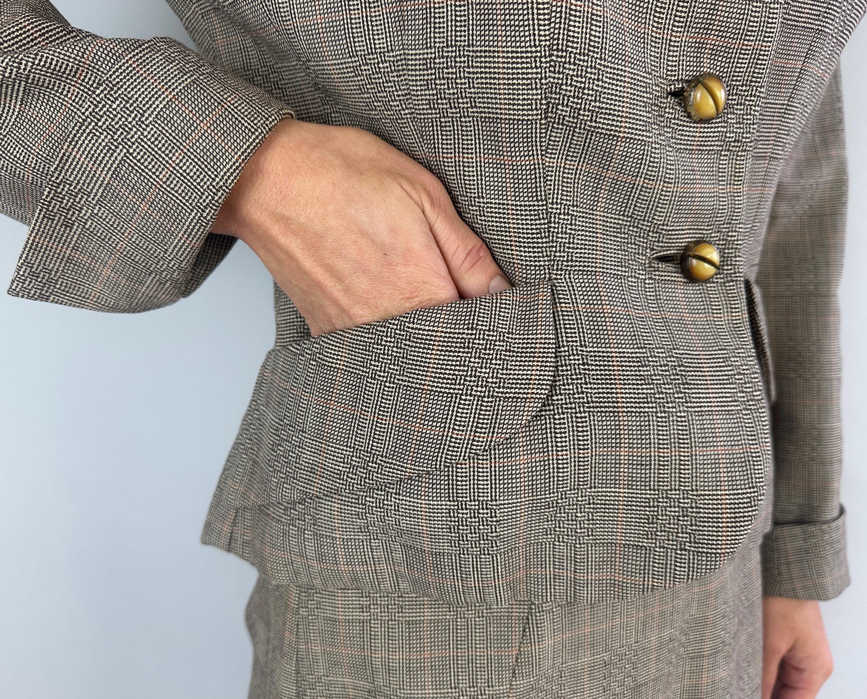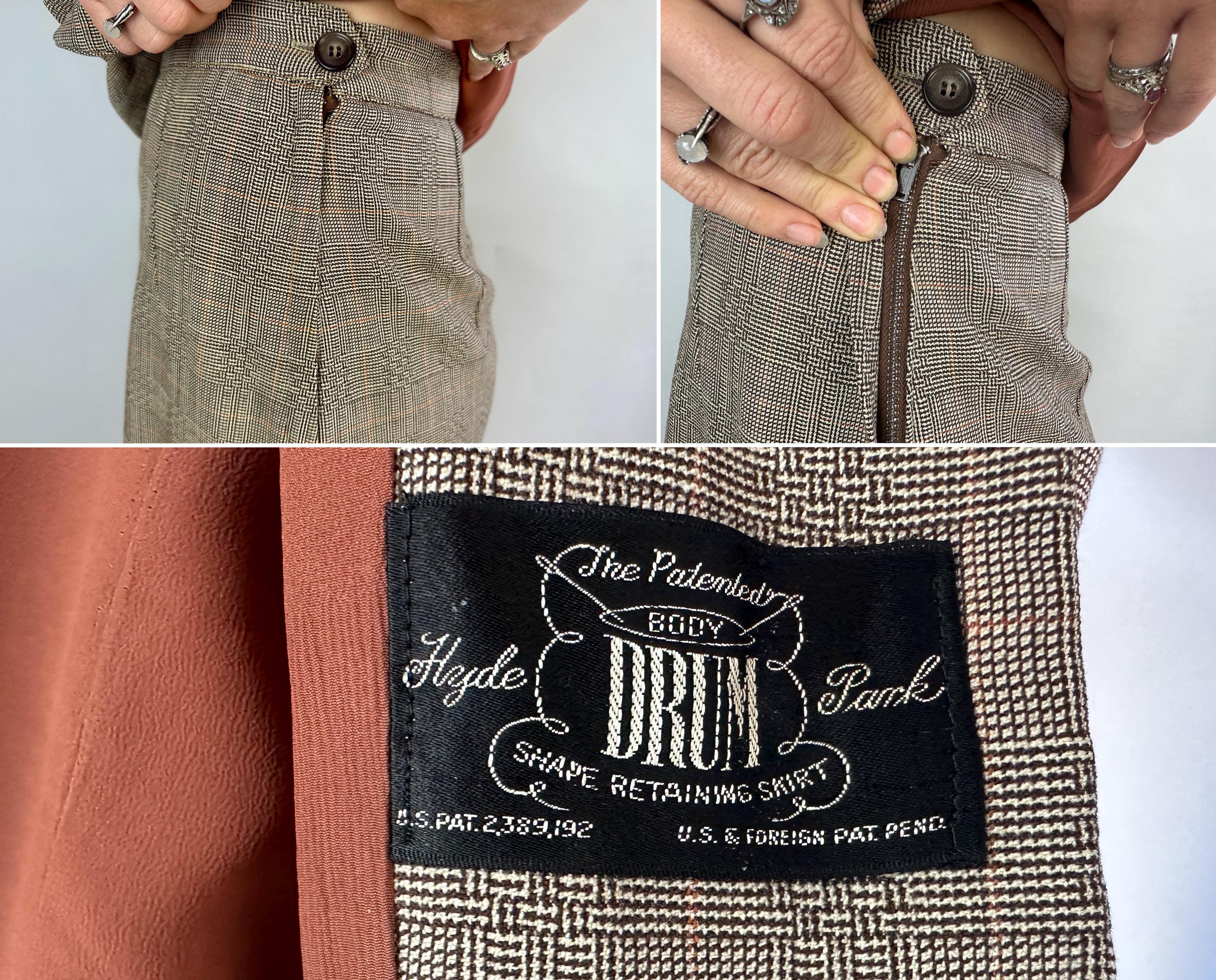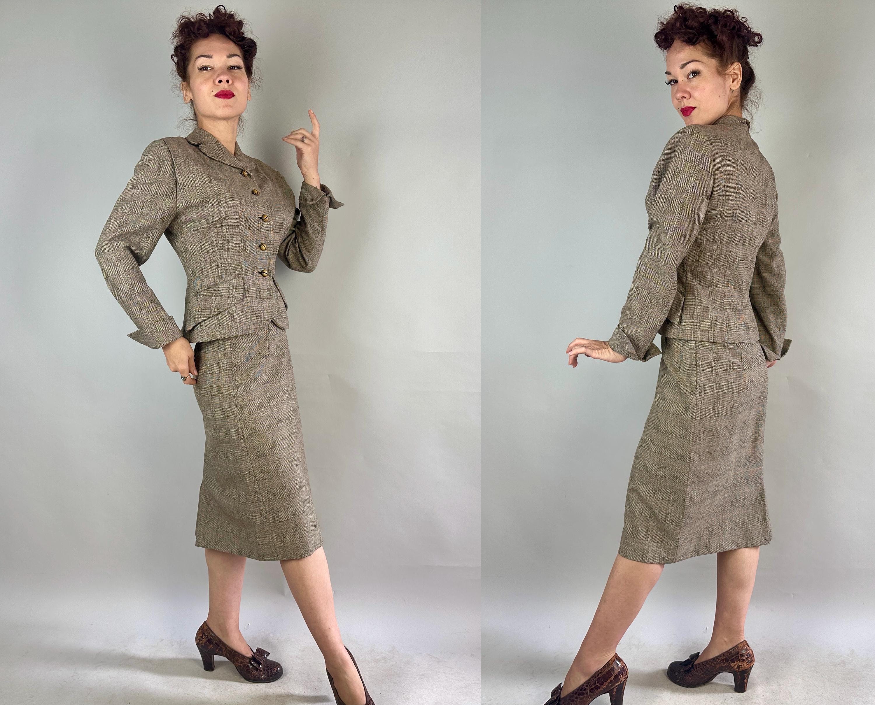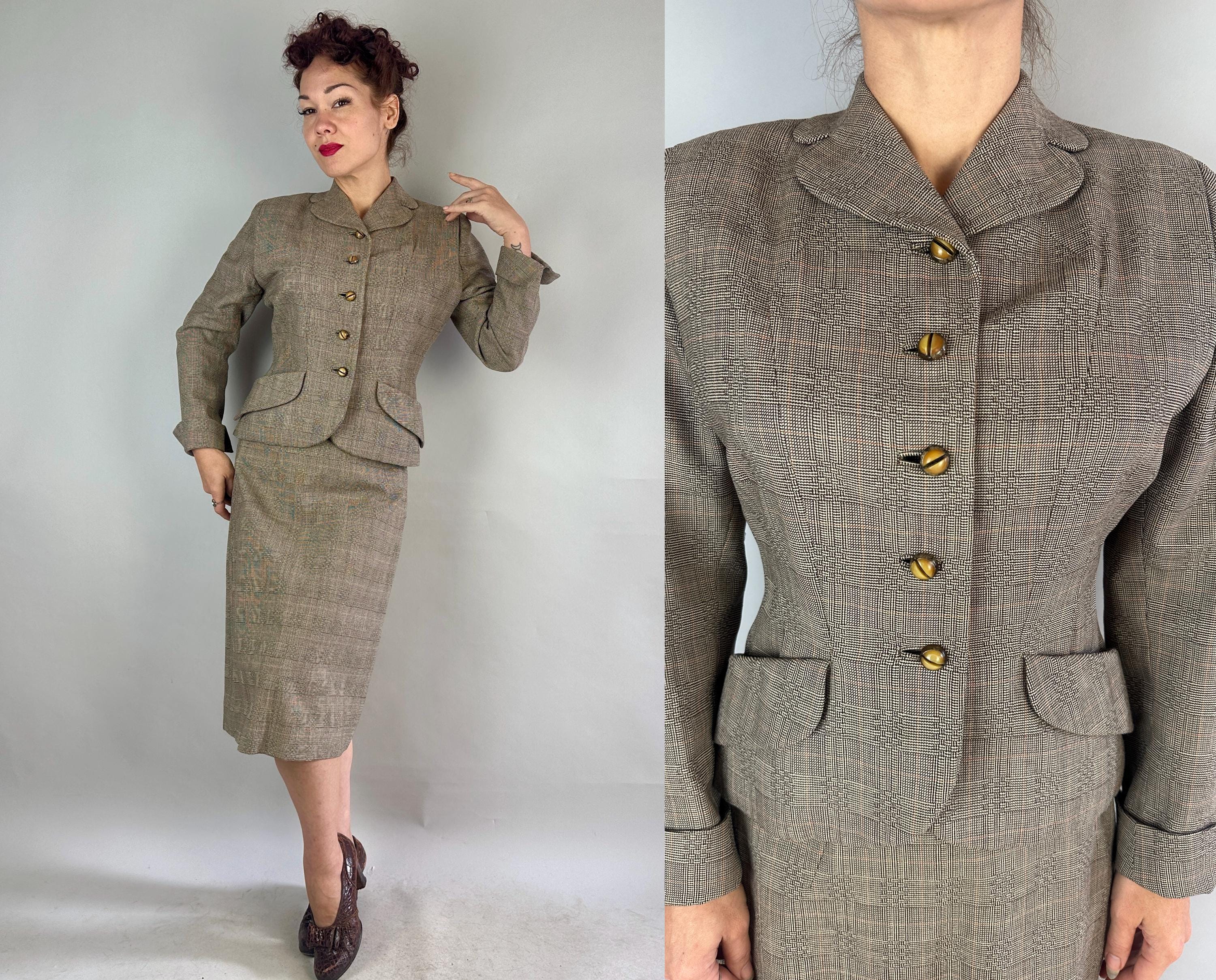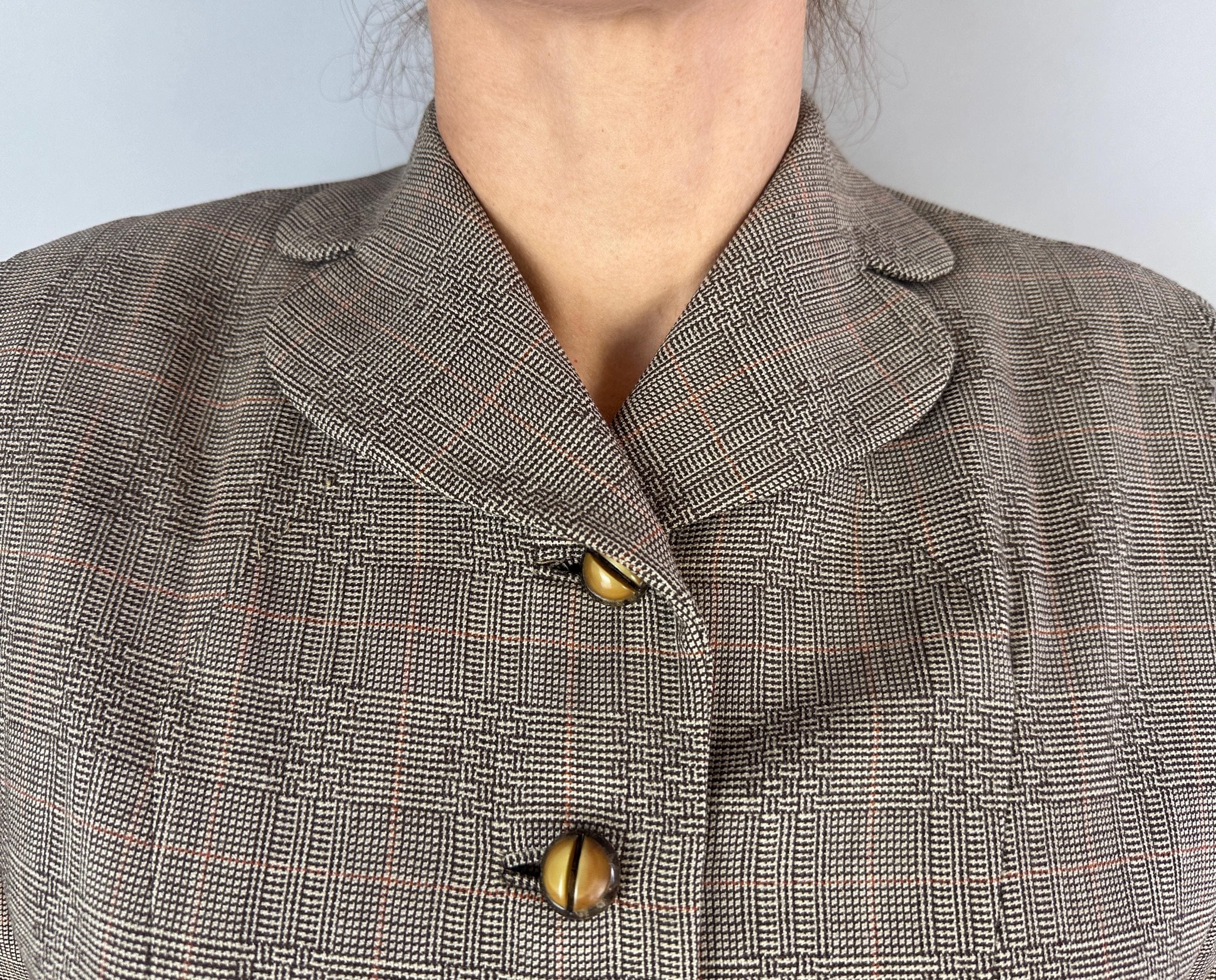 A bitter morning will be made smooth like cream in your coffee when you suit up in this 1940s set! The wool cloth is a wonderful mix of creative weaves in coffee brown and cream white and made plaid with shots of burnt orange. The jacket has a darling rounded lobe notch lapel, action pleats on the shoulder fronts, pointed notch cuffs, waist nipping seams, and hip pockets with curving flaps. The buttons are super unique with a snake eye appearance and rayon crepe makes a full lining. The pencil skirt has angular hip darts, knife kick pleat on the back, and a metal "Talon" zipper with button on the side. Labeled "The Patented Body Drum Shape Retaining Skirt". This suit is in great vintage condition, a couple very tiny well done period mends but no stains, holes, or odors to note.