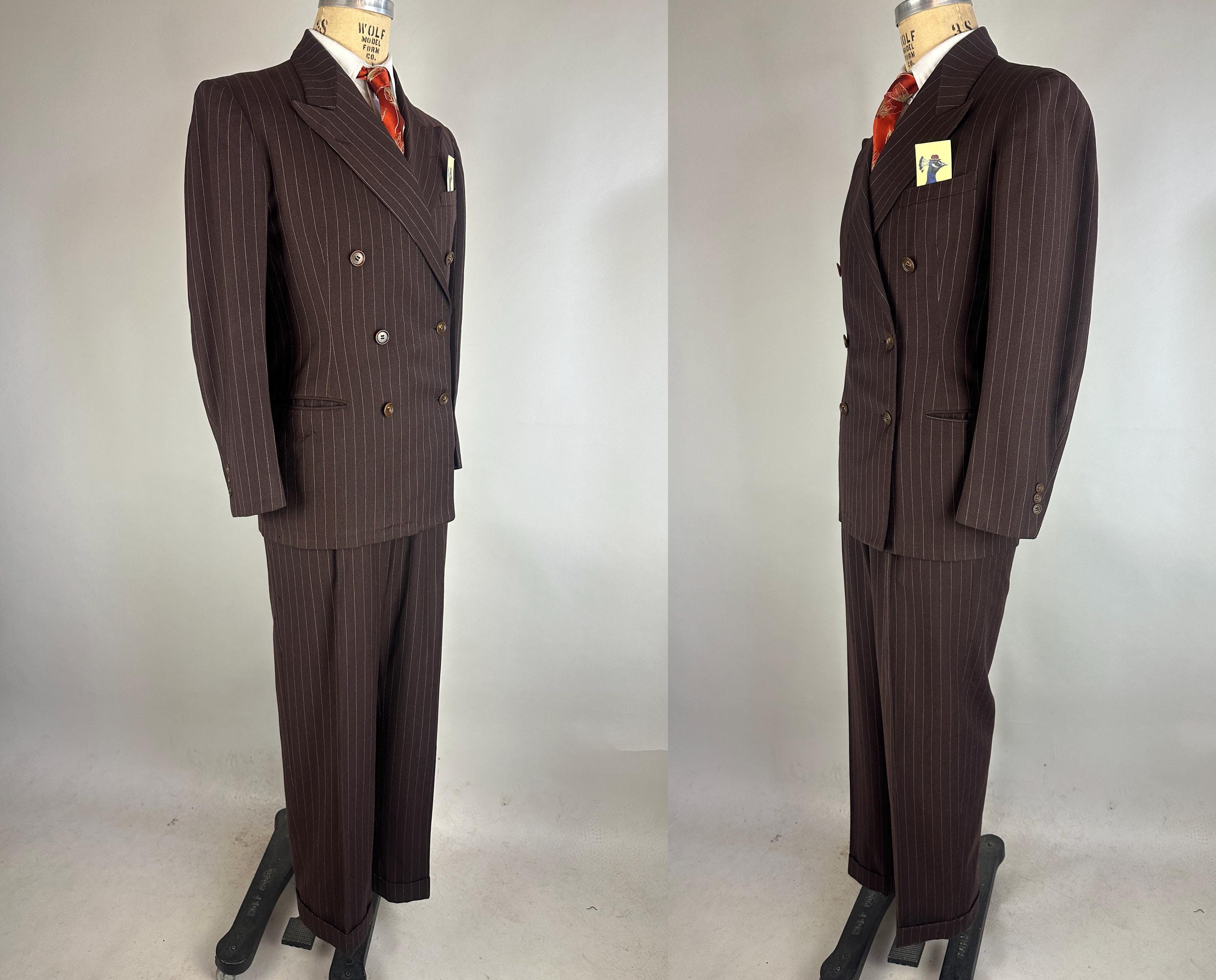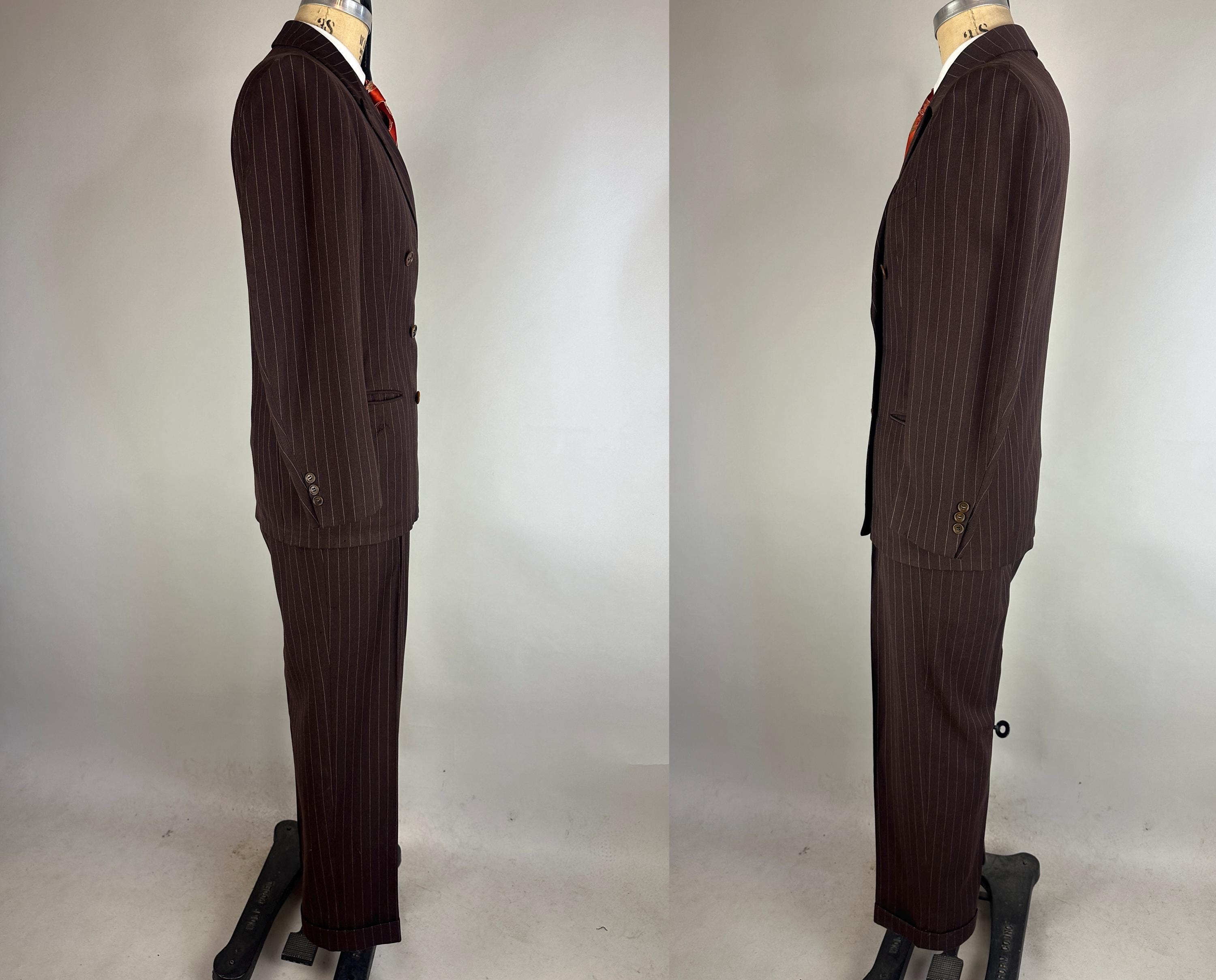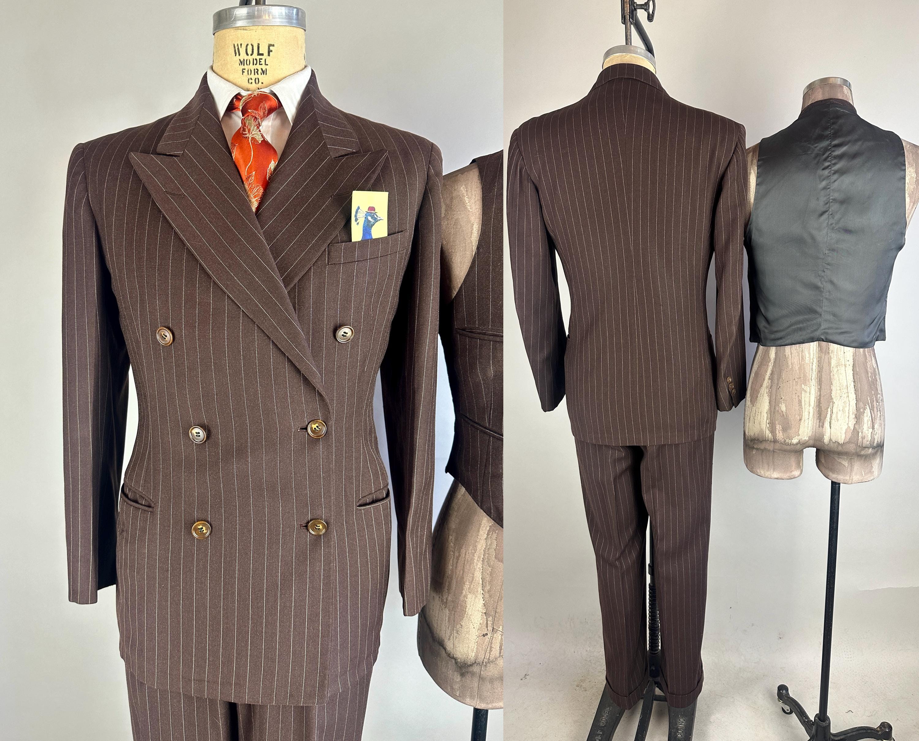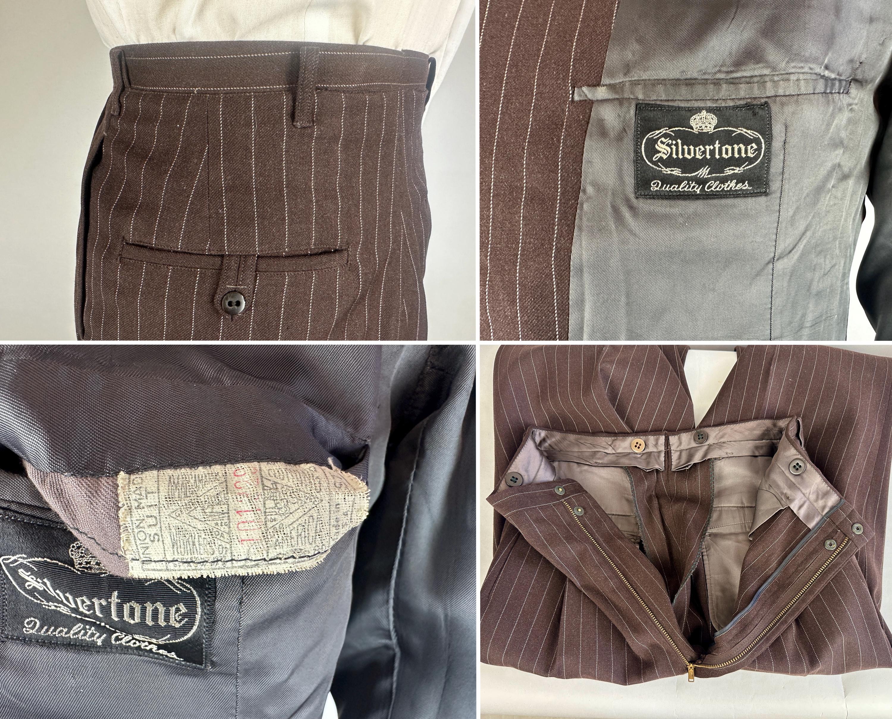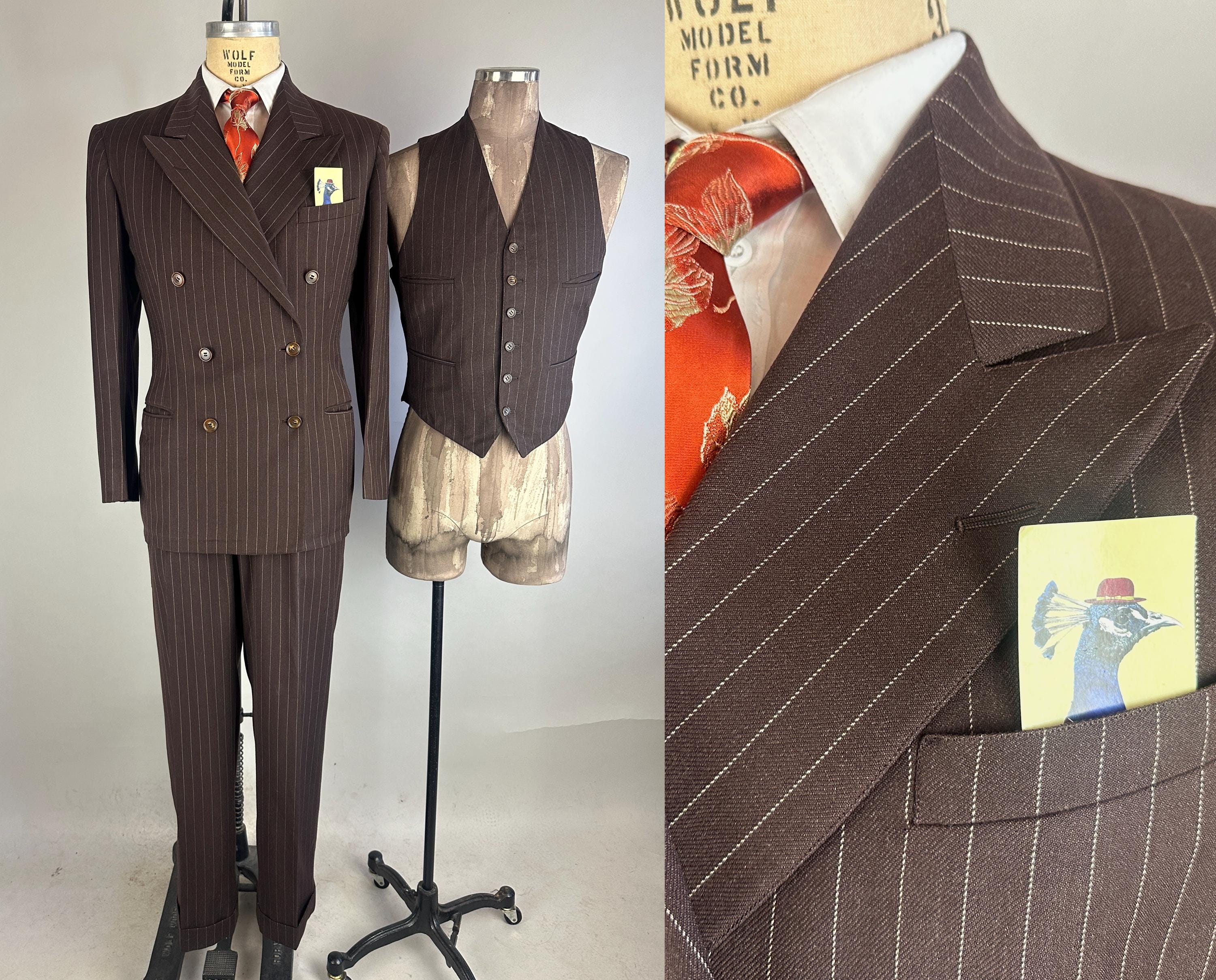 You'll get a little extra swagger for sure in this sharp 1940s three piece suit! Wake up the fashion scene with the black coffee brown wool with a classic white pinstripe. The jacket is double breasted with a 2x6 button stance in a burnt caramel. It has peak lapels, shoulder pads, welted hip pockets and a jetted chest pocket, and butterfly lining with one inner pocket. The waistcoat has a six button front done with matching caramel buttons, four welted pockets, and rayon back. The trousers have a pleated front, inner suspender buttons, dropped belt loops, five welted pockets with one buttoning on the back, and wide cuff hems. Labeled "Silvertone Quality Clothes". 1939-48 Union Label dates this suit to the 1940s. This set is in great vintage condition, with a few subtle well done period mends and no stains, holes, or odors to note.