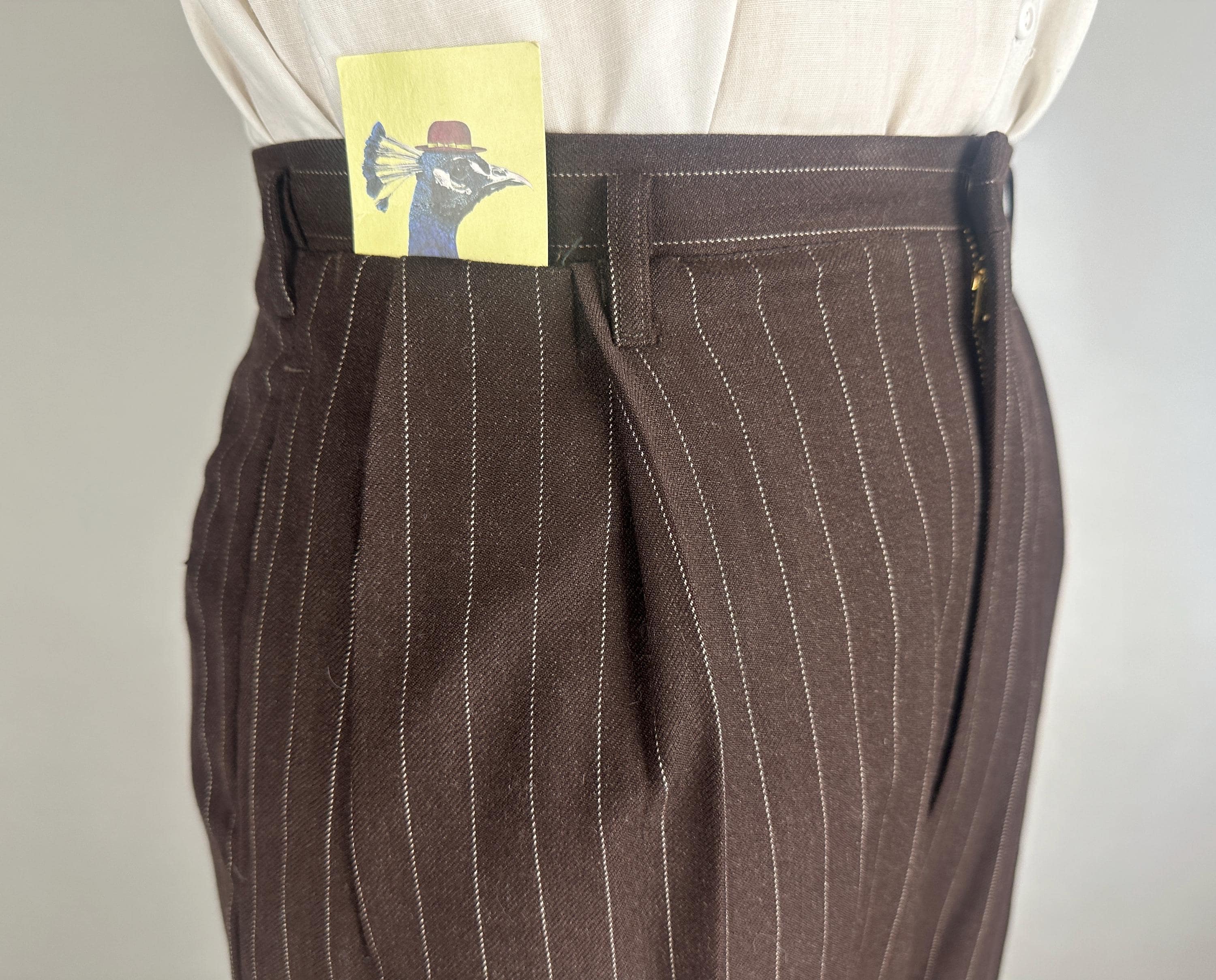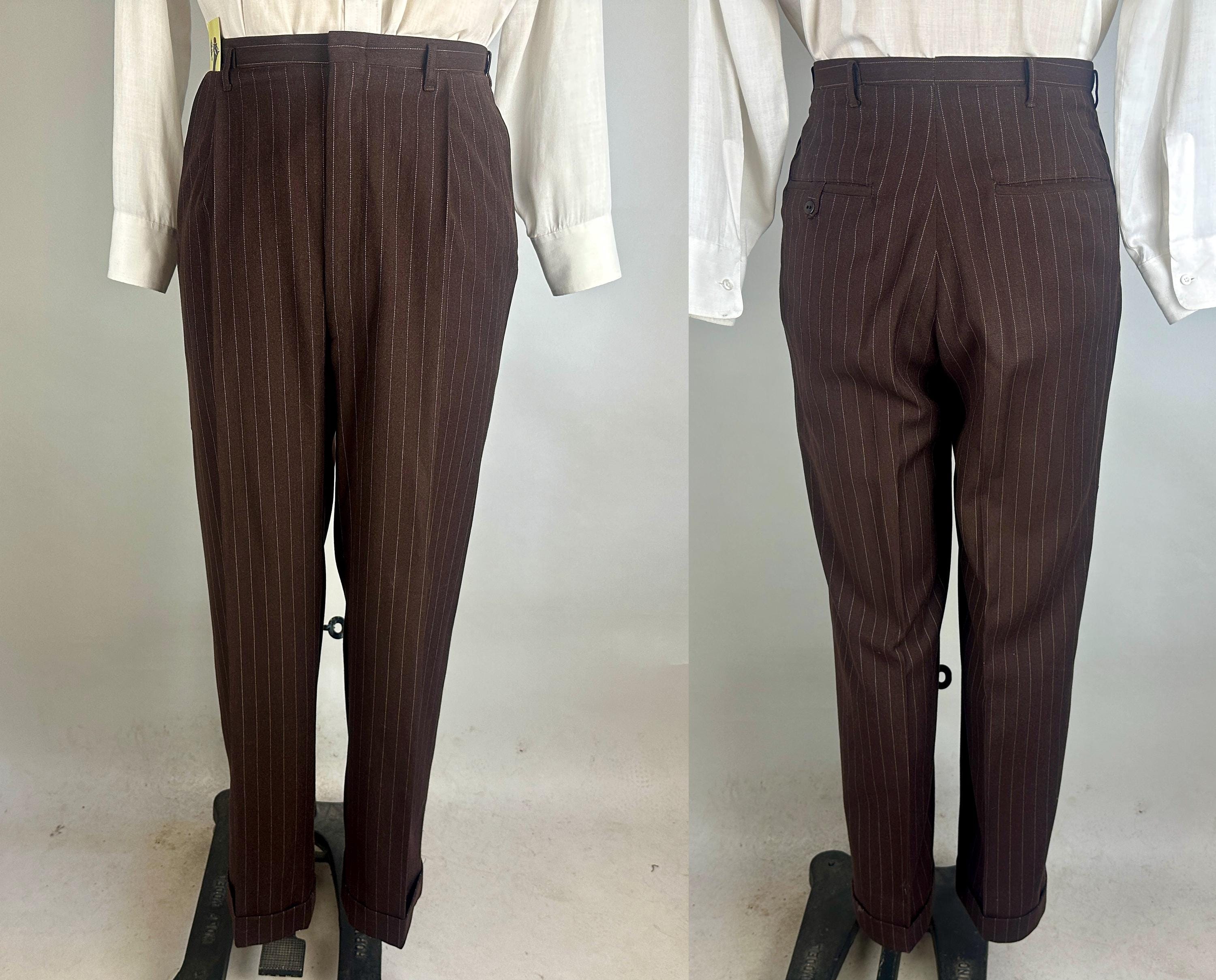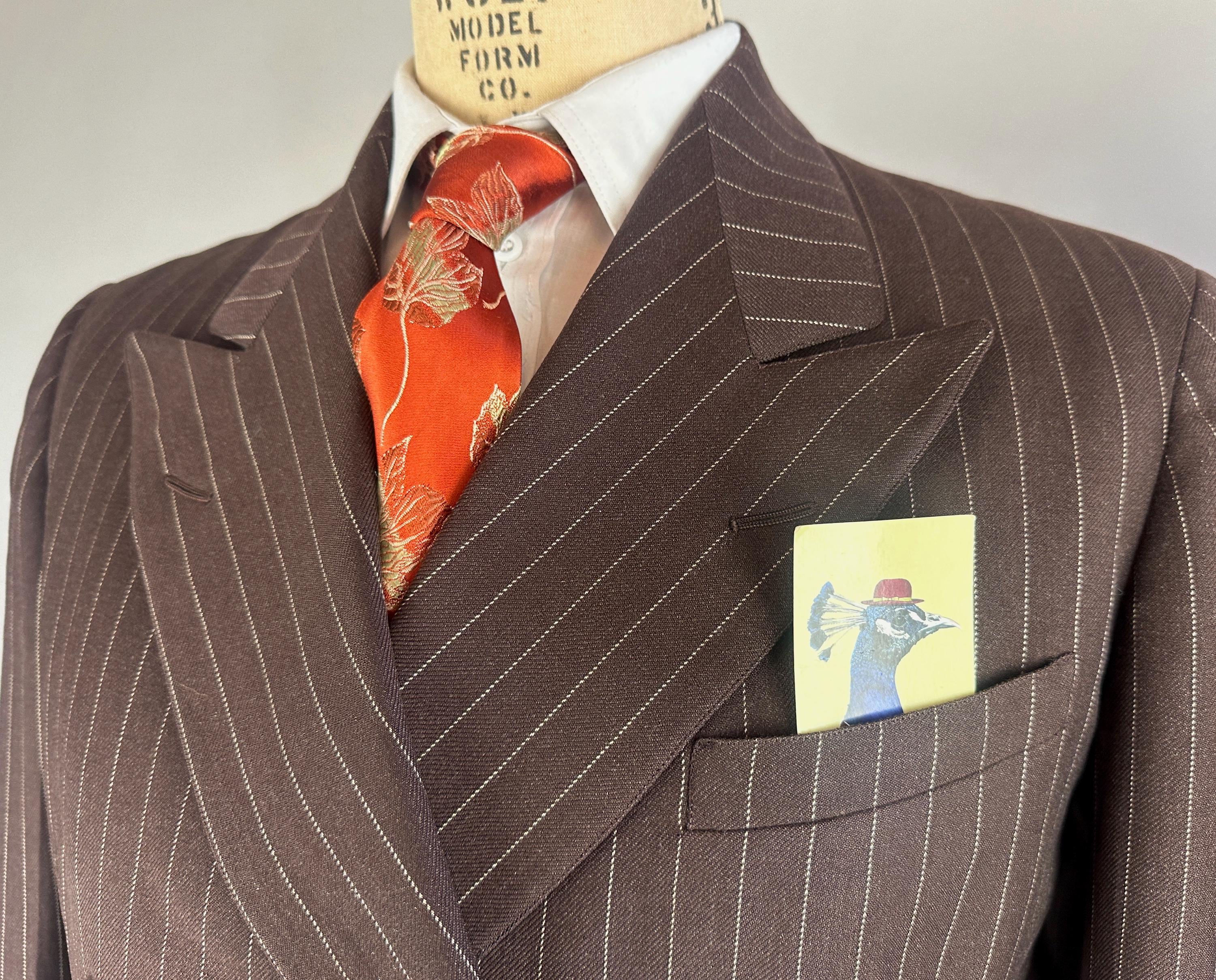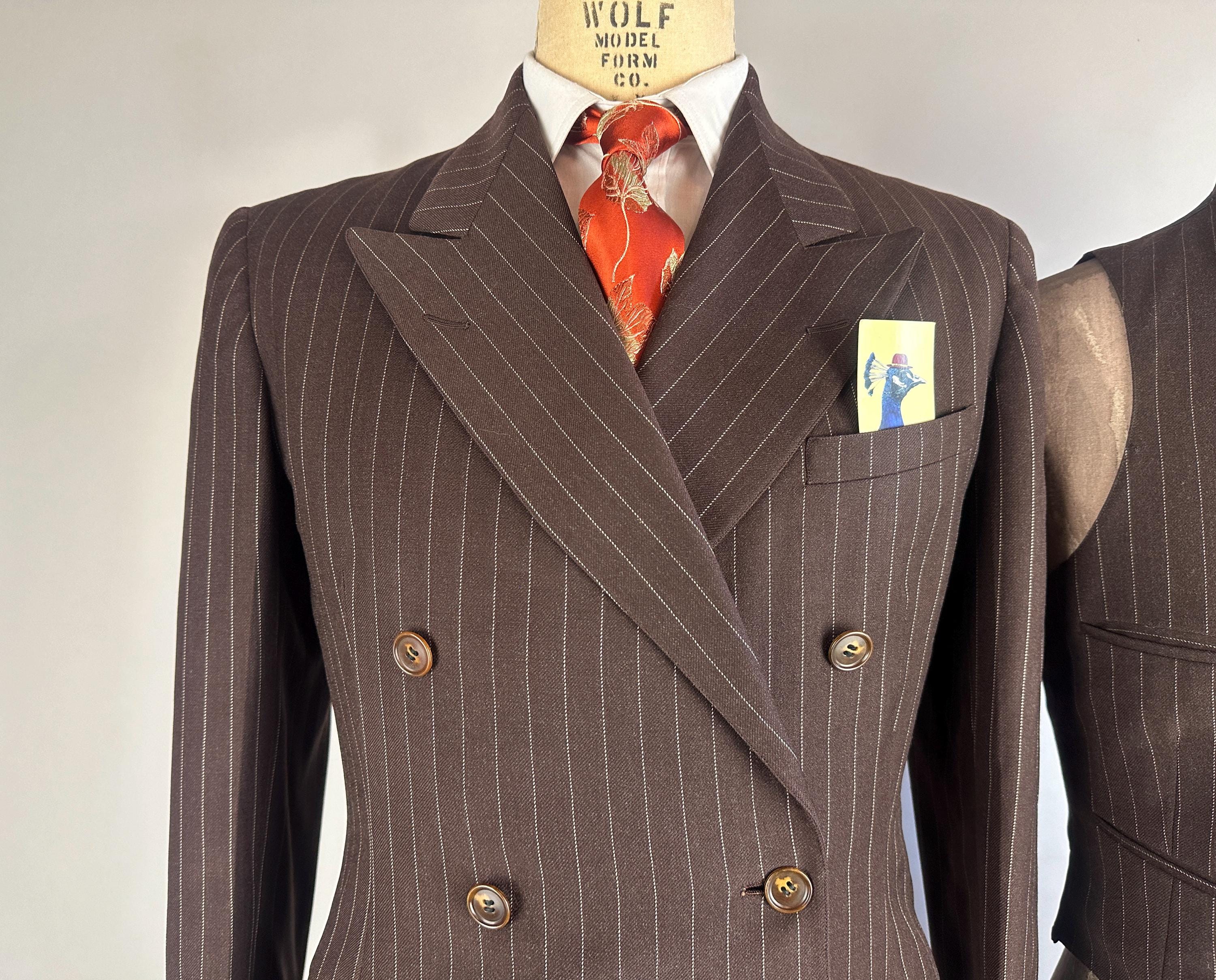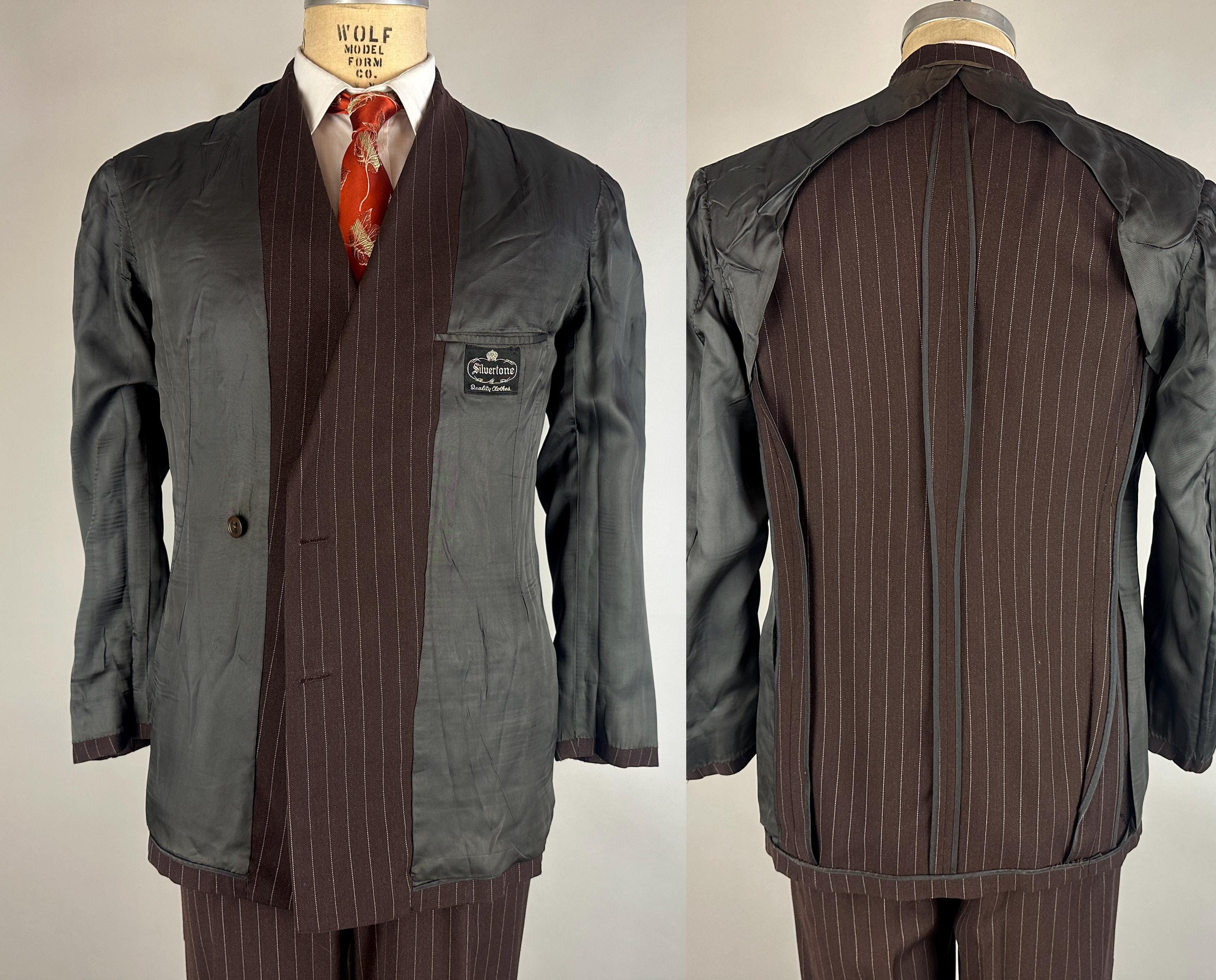 You'll get a little extra swagger for sure in this sharp 1940s three piece suit! Wake up the fashion scene with the black coffee brown wool with a classic white pinstripe. The jacket is double breasted with a 2x6 button stance in a burnt caramel. It has peak lapels, shoulder pads, welted hip pockets and a jetted chest pocket, and butterfly lining with one inner pocket. The waistcoat has a six button front done with matching caramel buttons, four welted pockets, and rayon back. The trousers have a pleated front, inner suspender buttons, dropped belt loops, five welted pockets with one buttoning on the back, and wide cuff hems. Labeled "Silvertone Quality Clothes". 1939-48 Union Label dates this suit to the 1940s. This set is in great vintage condition, with a few subtle well done period mends and no stains, holes, or odors to note.