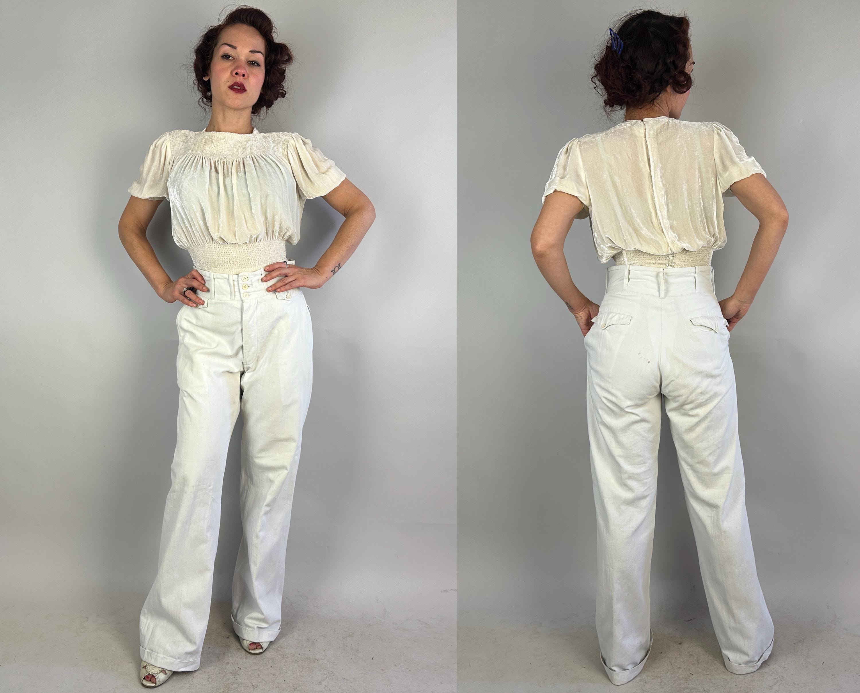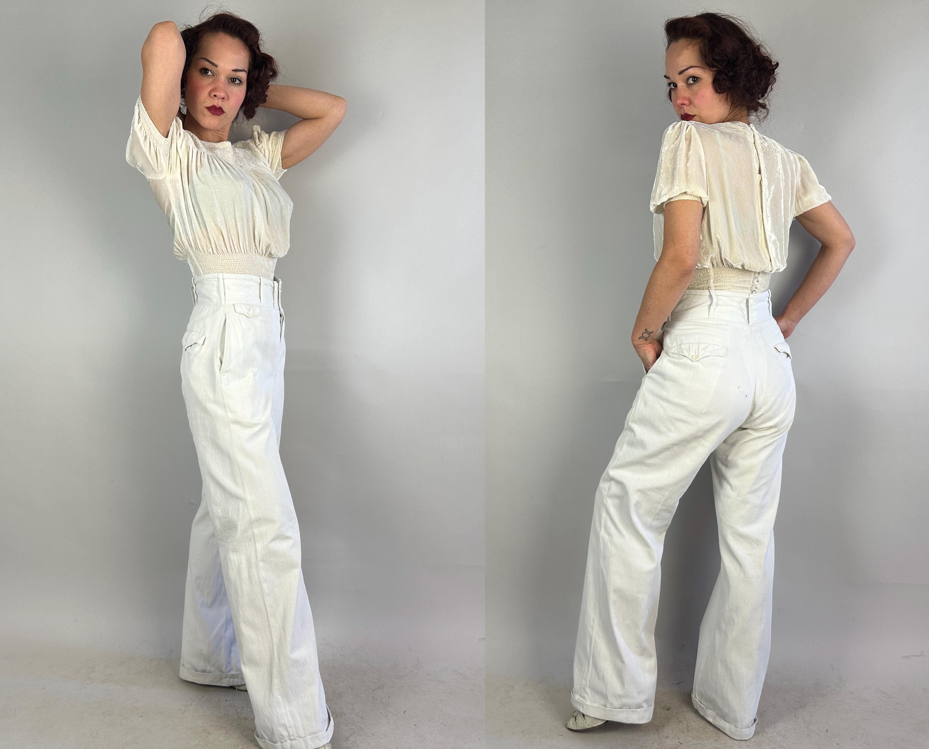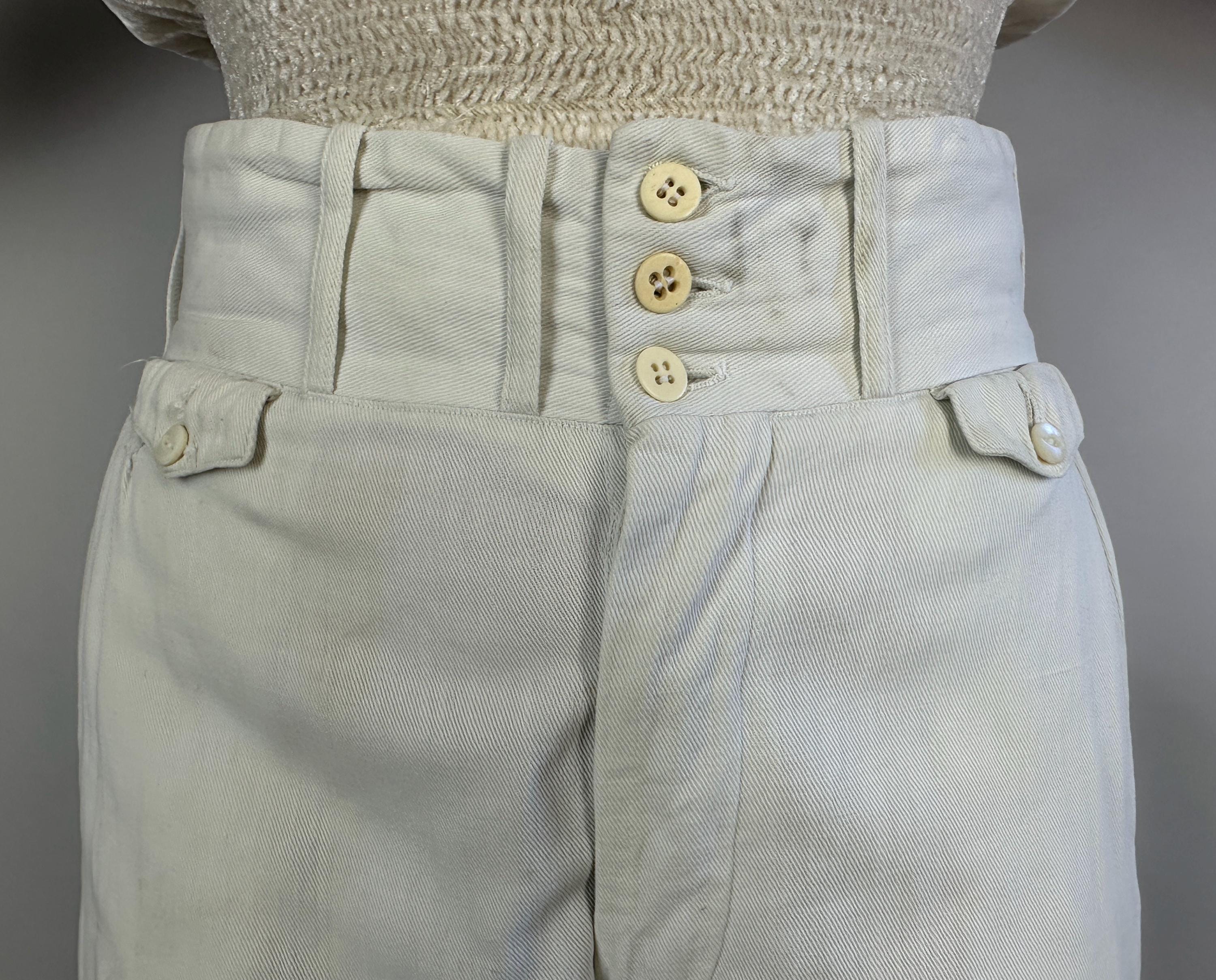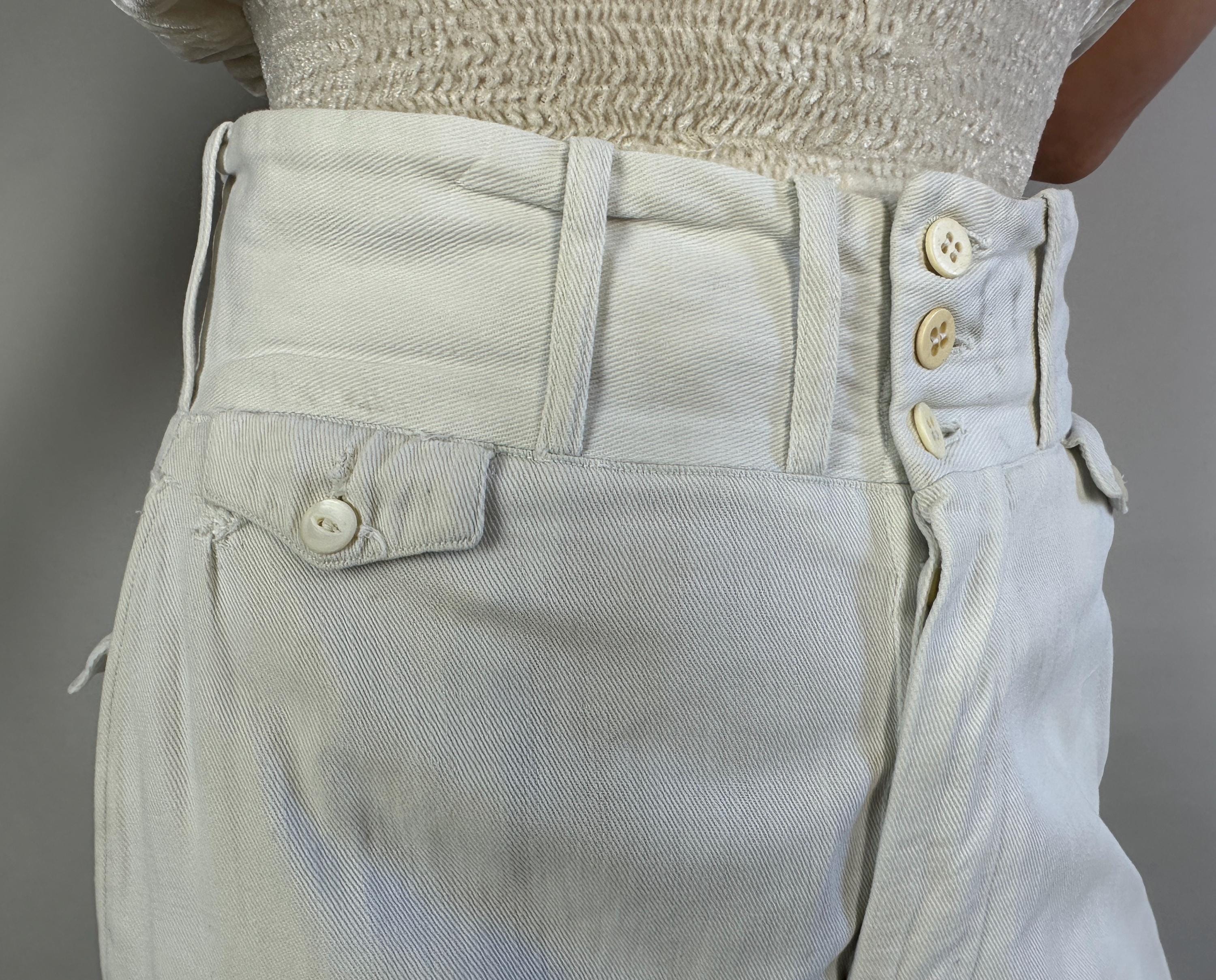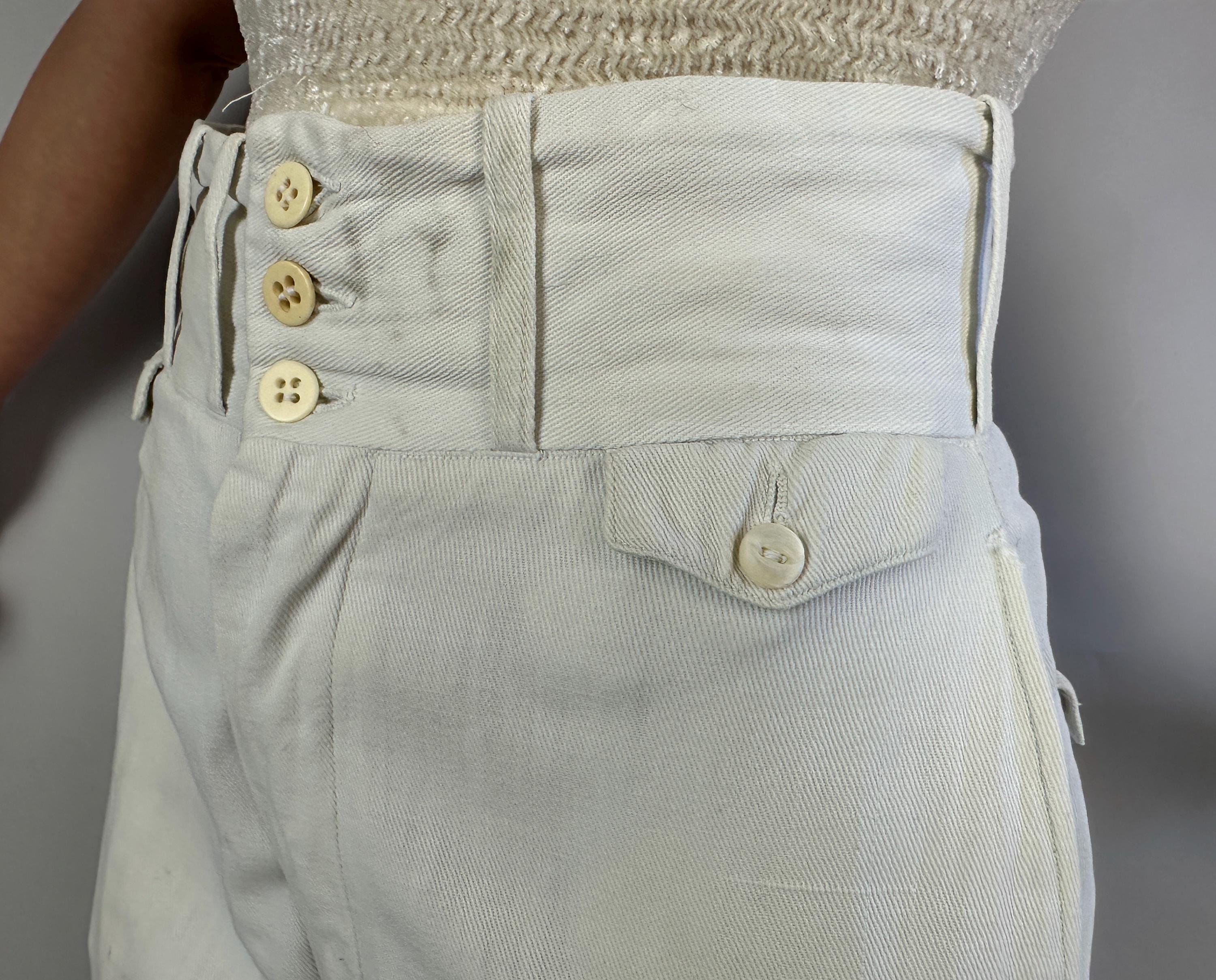 Own the campus like a daring debutante in these 1930s trousers! Rare and ultra chic, these white pants are made of a sturdy cotton twill and will have you winning all the lawn games. These have a 2.75" wide collegiate waistband with three buttons and a button fly. You've got pockets a-plenty with the standard welted hip pockets, two buttoning flap pockets on the back, and two coin pockets like mini versions of the ones on the back. The wide hems are cuffed and belt loops span the wide width of the waistband. These trousers are in great vintage condition, some very faint marks but no holes or odors to note.