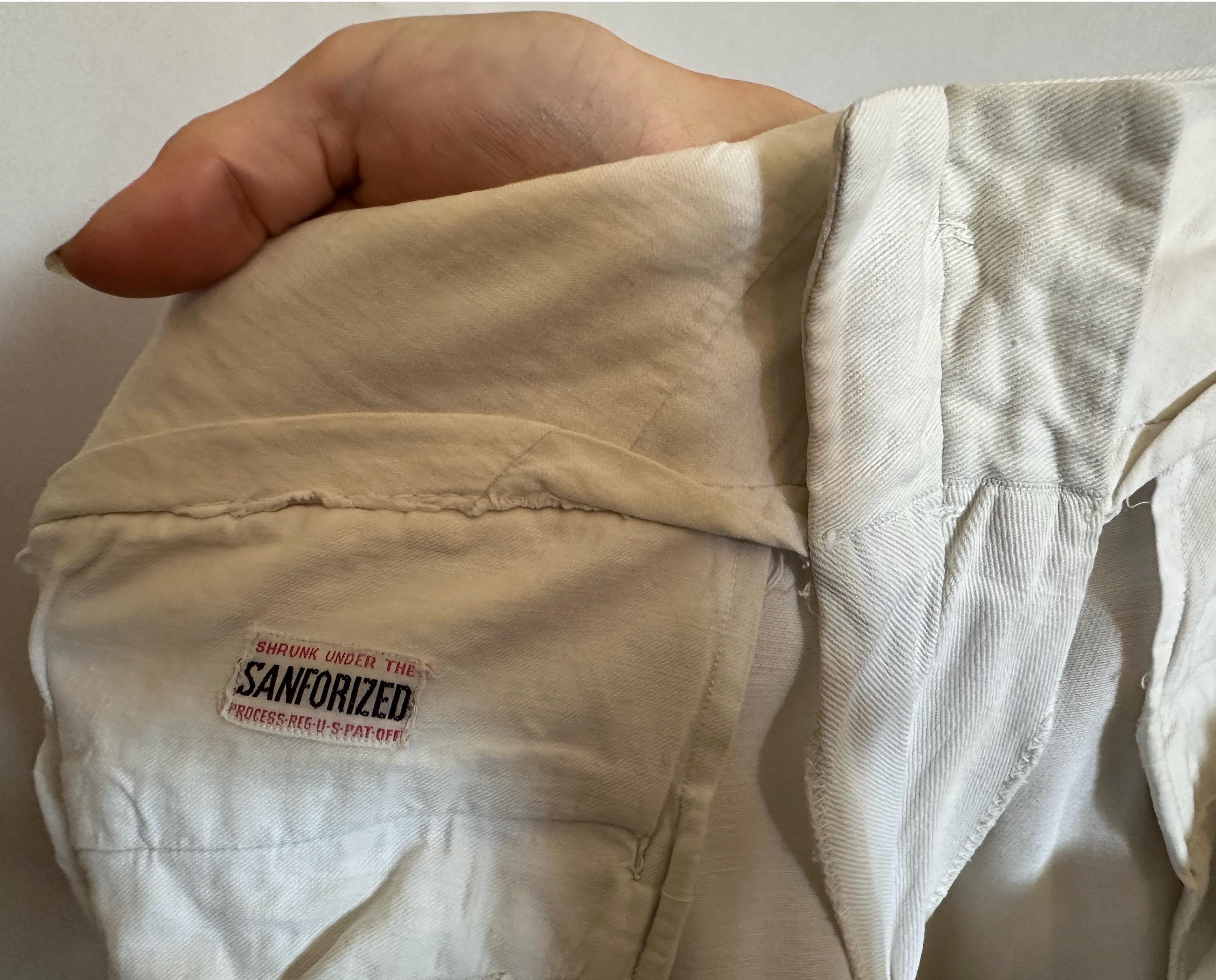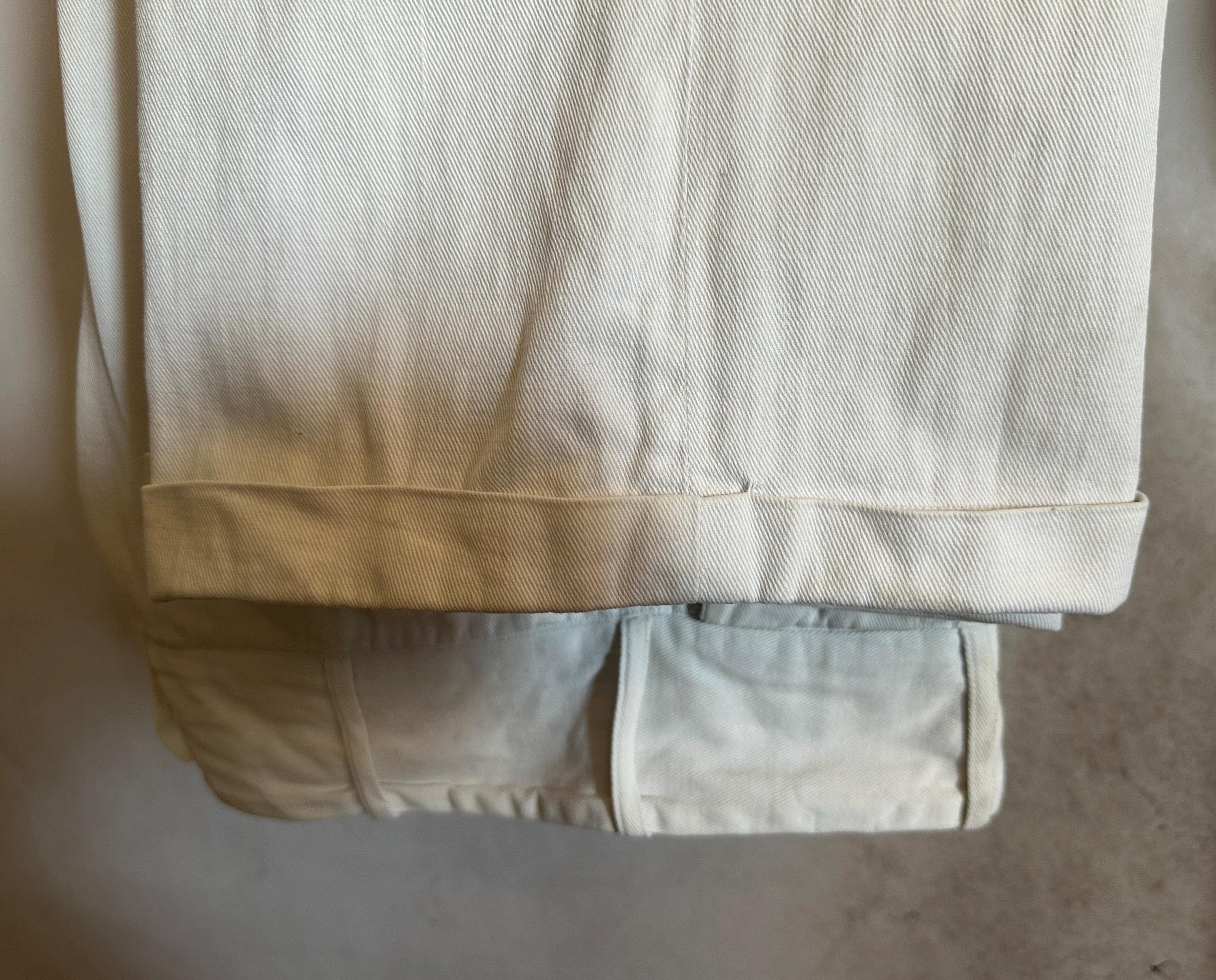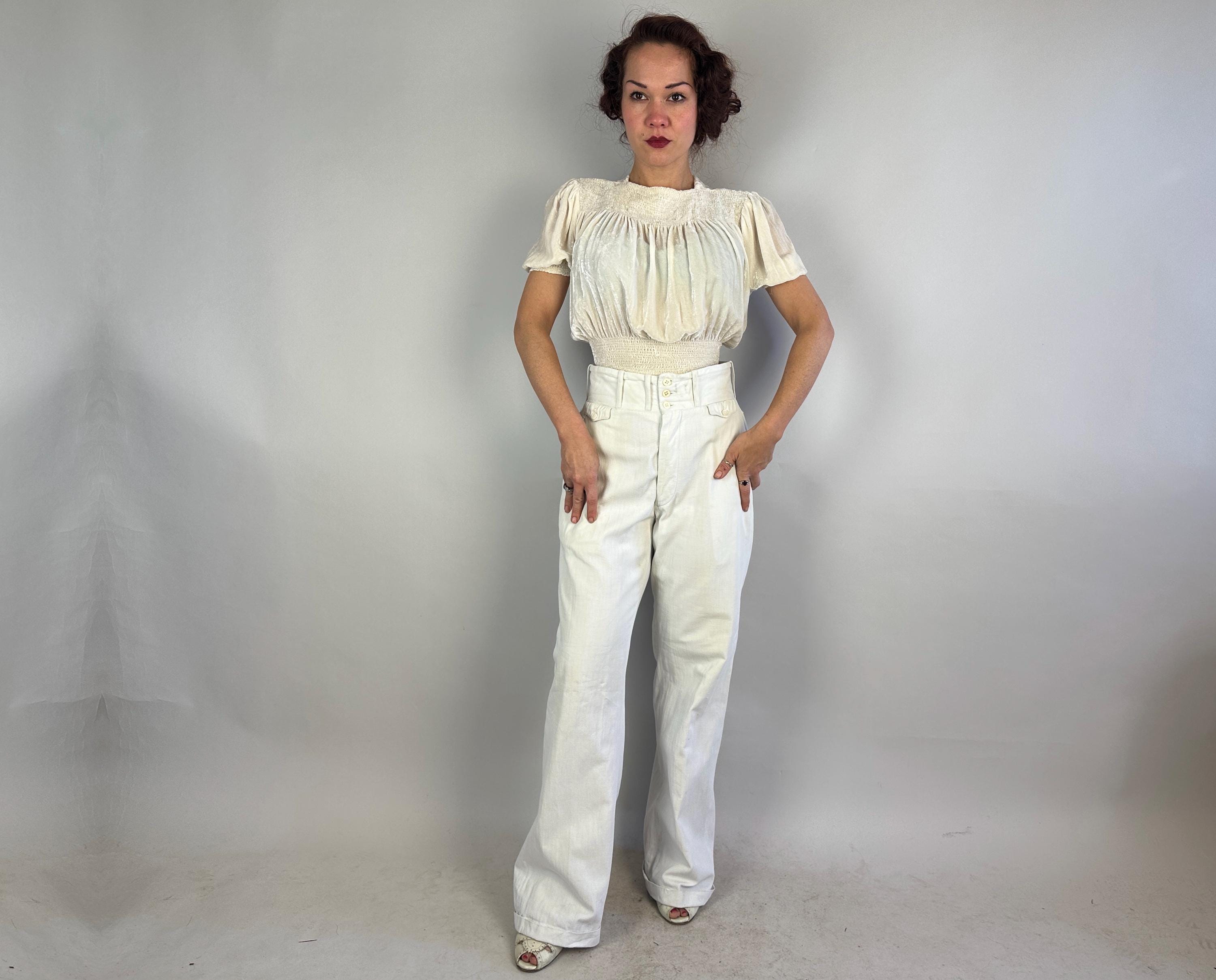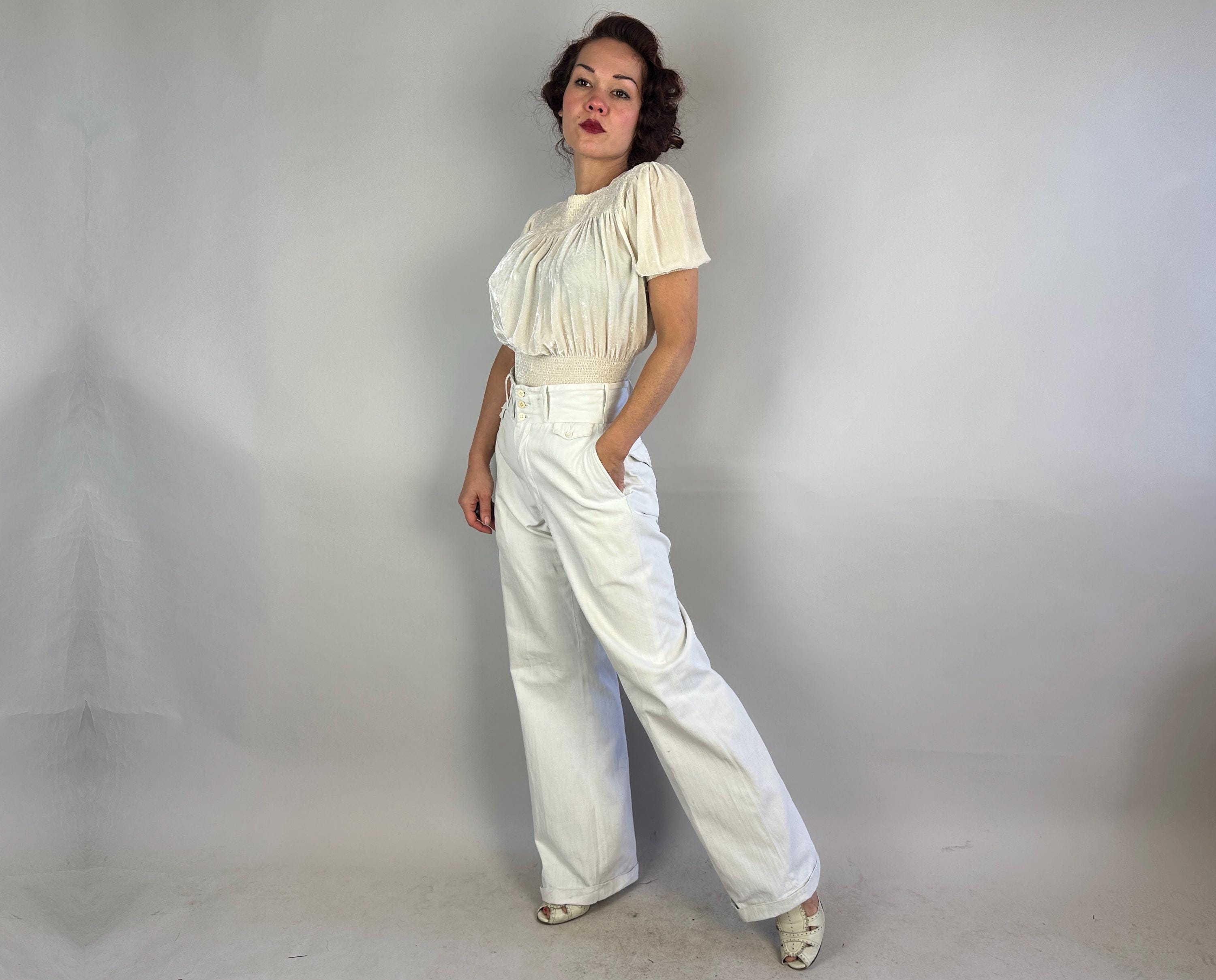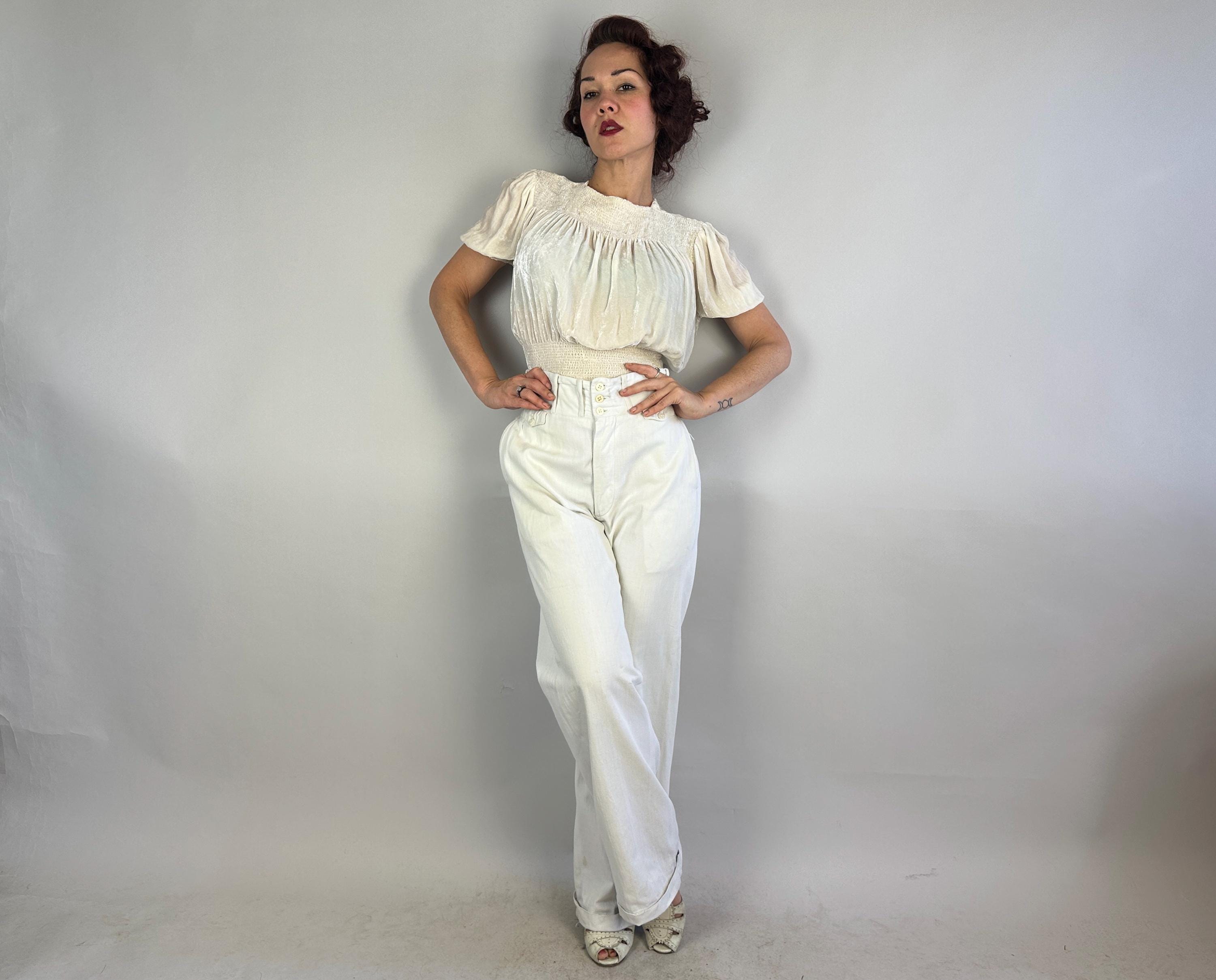 Own the campus like a daring debutante in these 1930s trousers! Rare and ultra chic, these white pants are made of a sturdy cotton twill and will have you winning all the lawn games. These have a 2.75" wide collegiate waistband with three buttons and a button fly. You've got pockets a-plenty with the standard welted hip pockets, two buttoning flap pockets on the back, and two coin pockets like mini versions of the ones on the back. The wide hems are cuffed and belt loops span the wide width of the waistband. These trousers are in great vintage condition, some very faint marks but no holes or odors to note.