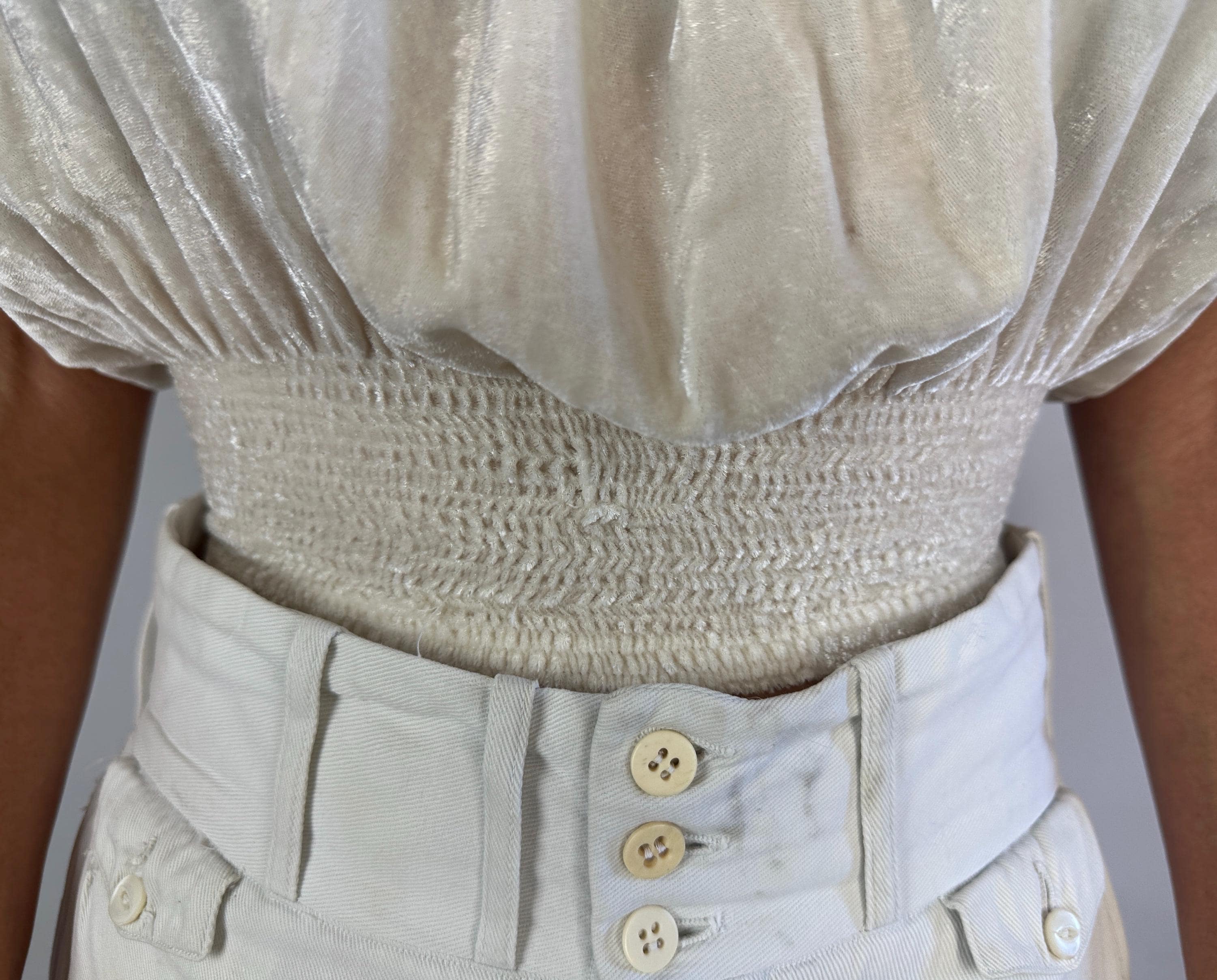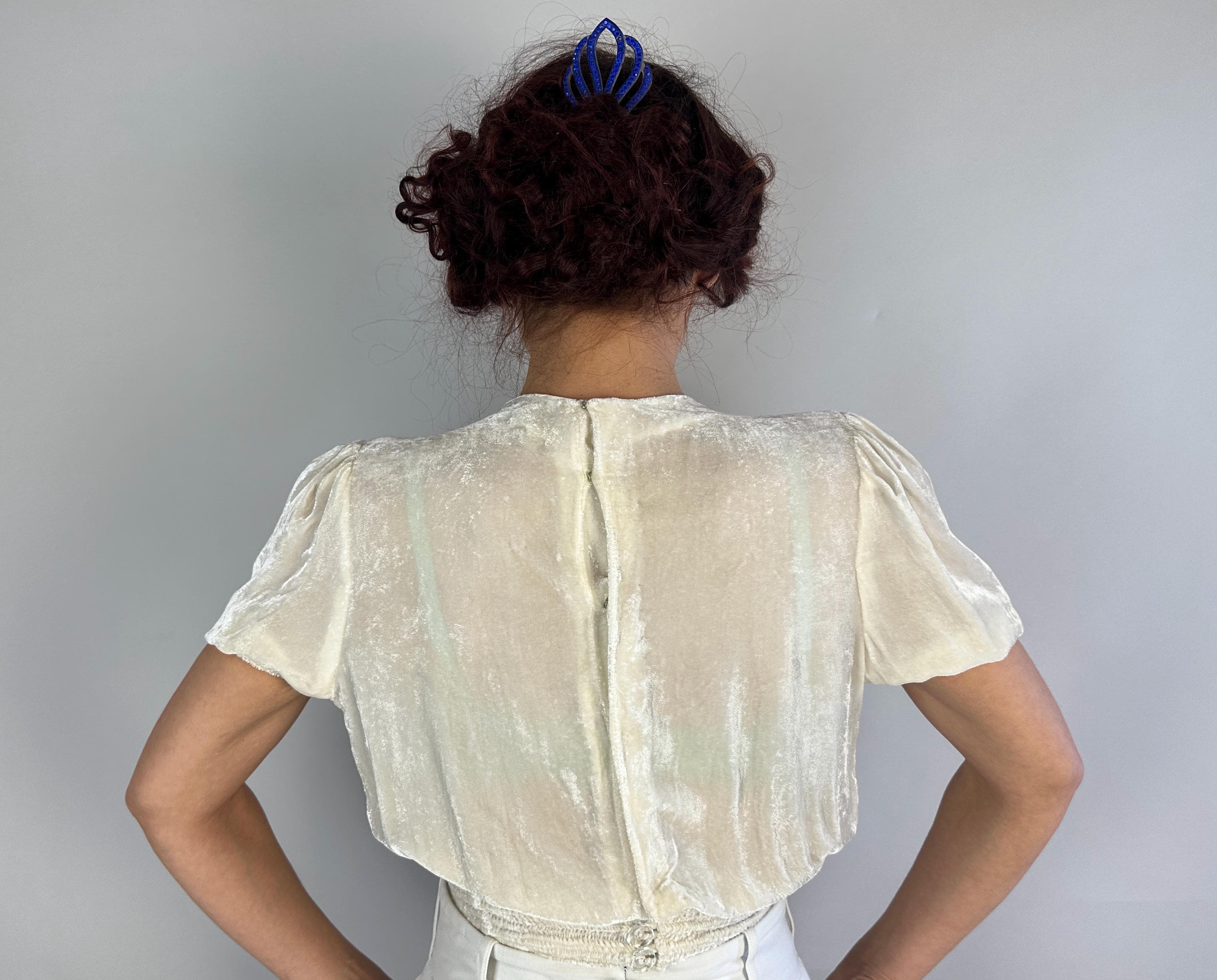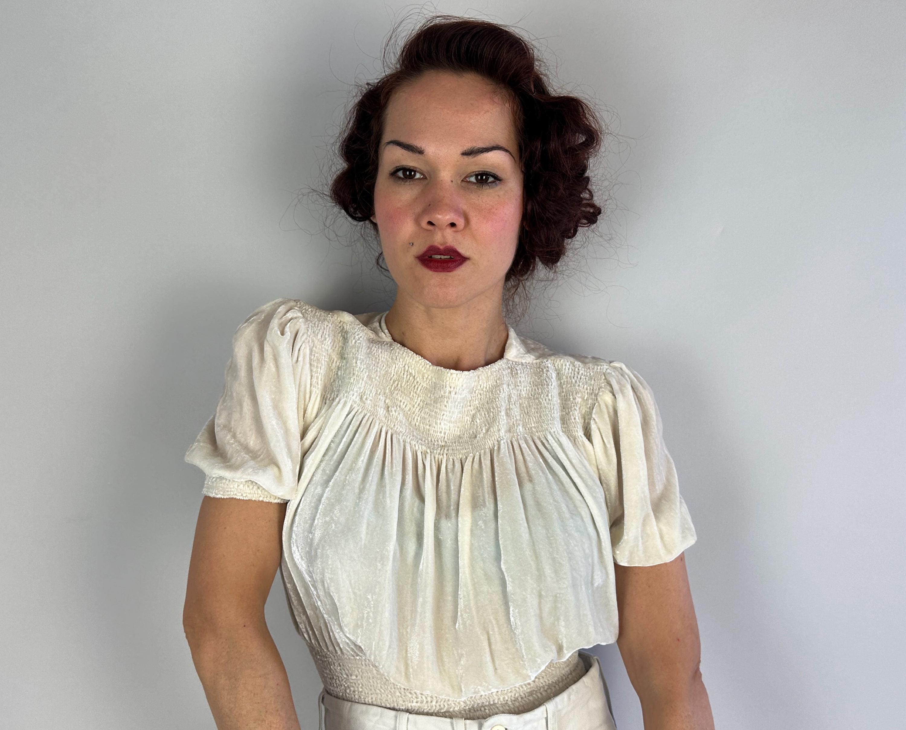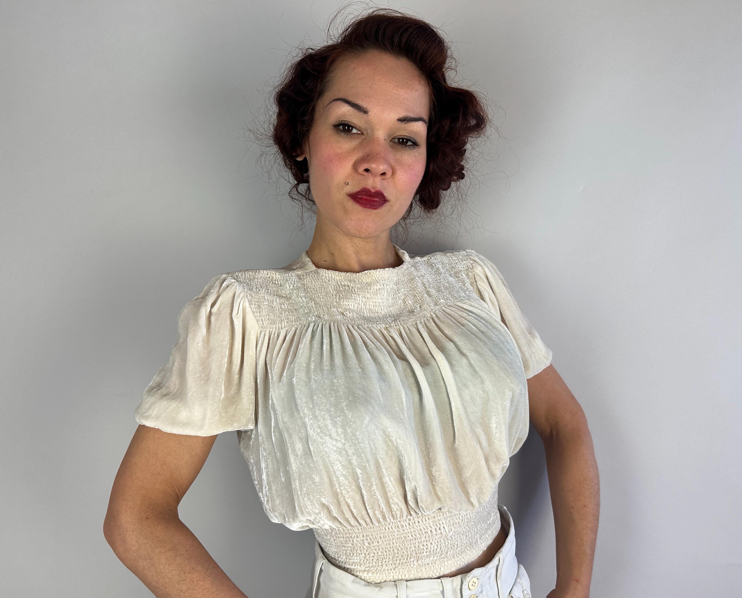 You'll be sugar and spice and playing it nice in this 1930s blouse! The virginal white crushed silk velvet will glow in the evening light and drapes beautifully from the blousey gathers formed by the dense smocking. Inspired by peasant blouses, the smocking is used on the front yoke, cuffs of the puff sleeves, and making a wide waistband to perfectly nip the waist in the most comfortable way. Hidden snaps fasten up the back along with four lucite buttons just on the waistband (or leave the snaps open for a vampy back slit!). This blouse is in great vintage condition, a couple of the tiniest faintest freckles on the sleeve but no holes or odors to note.