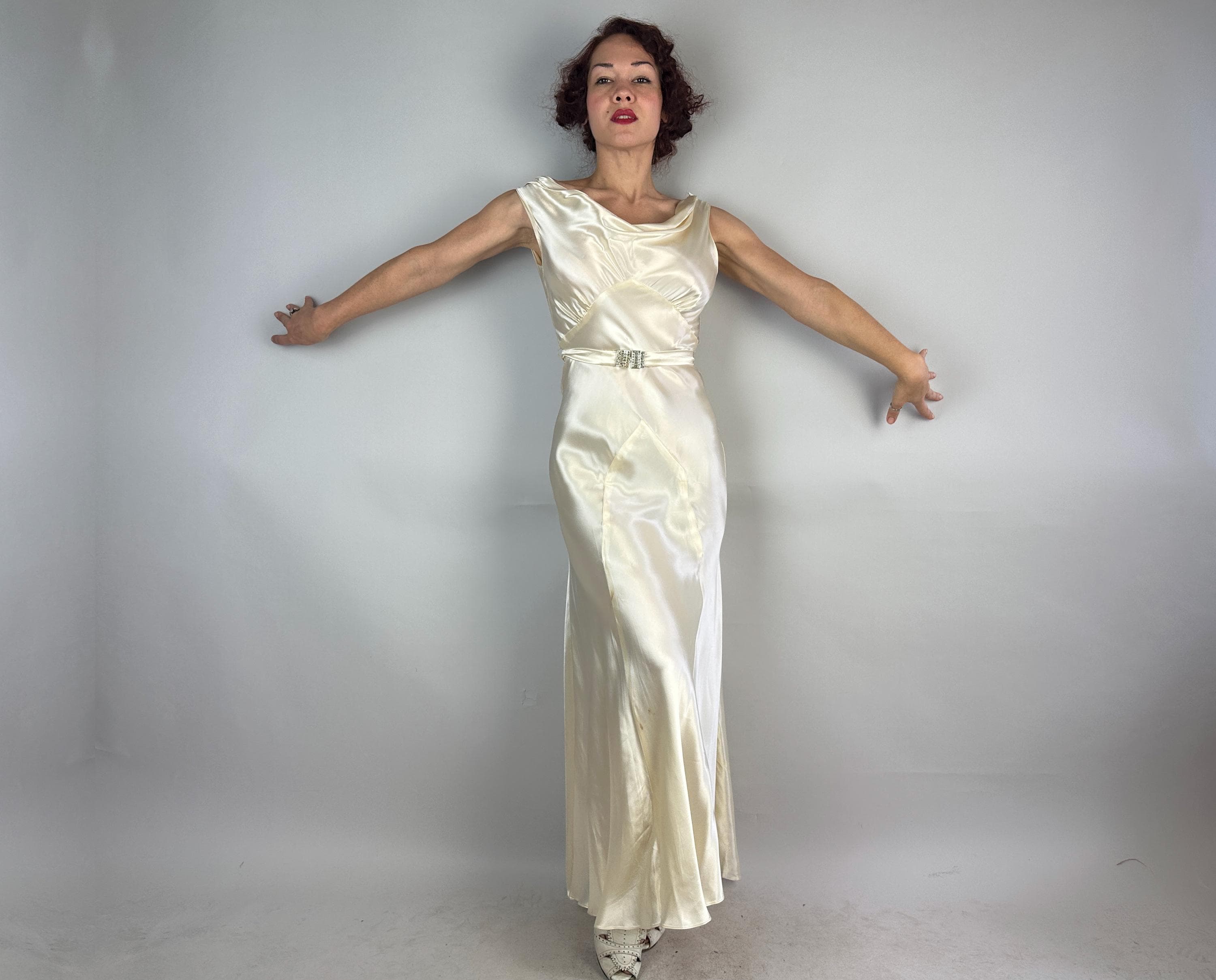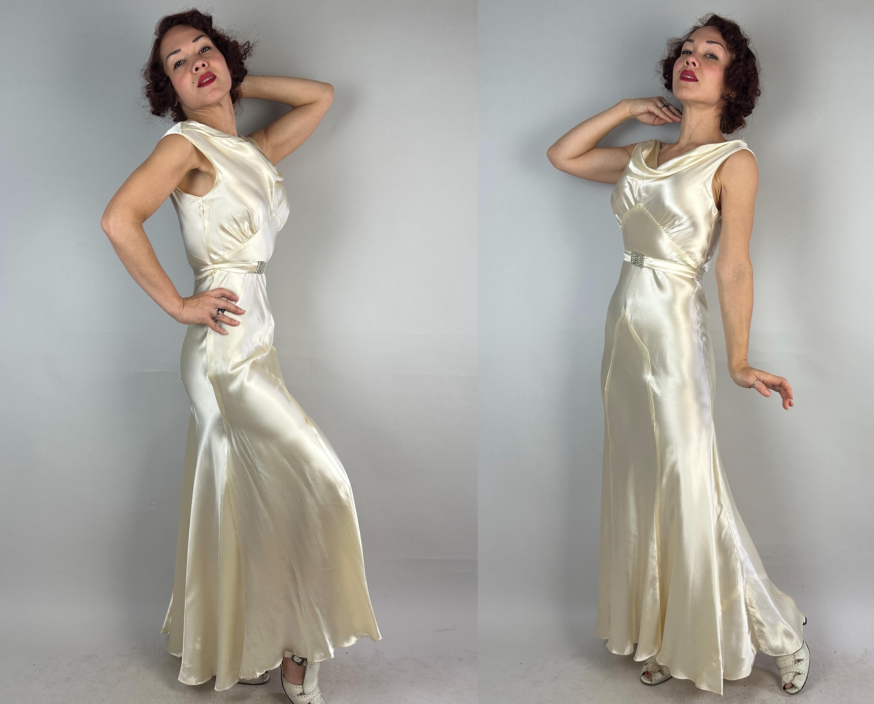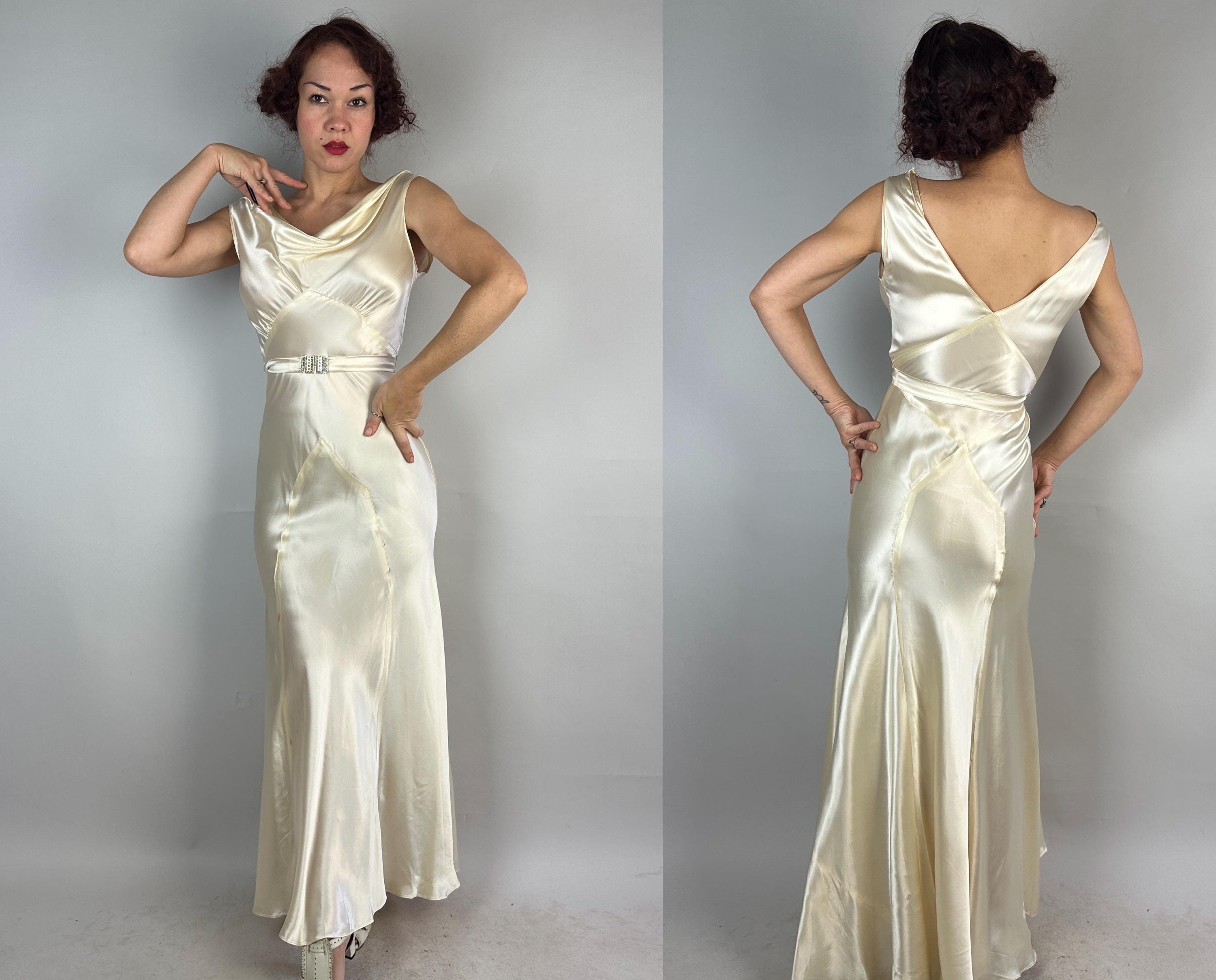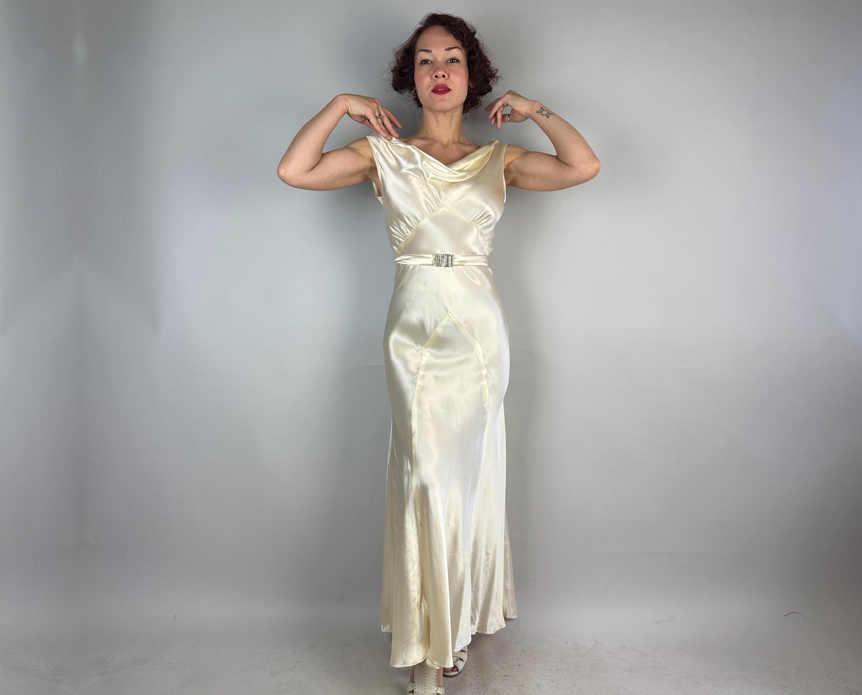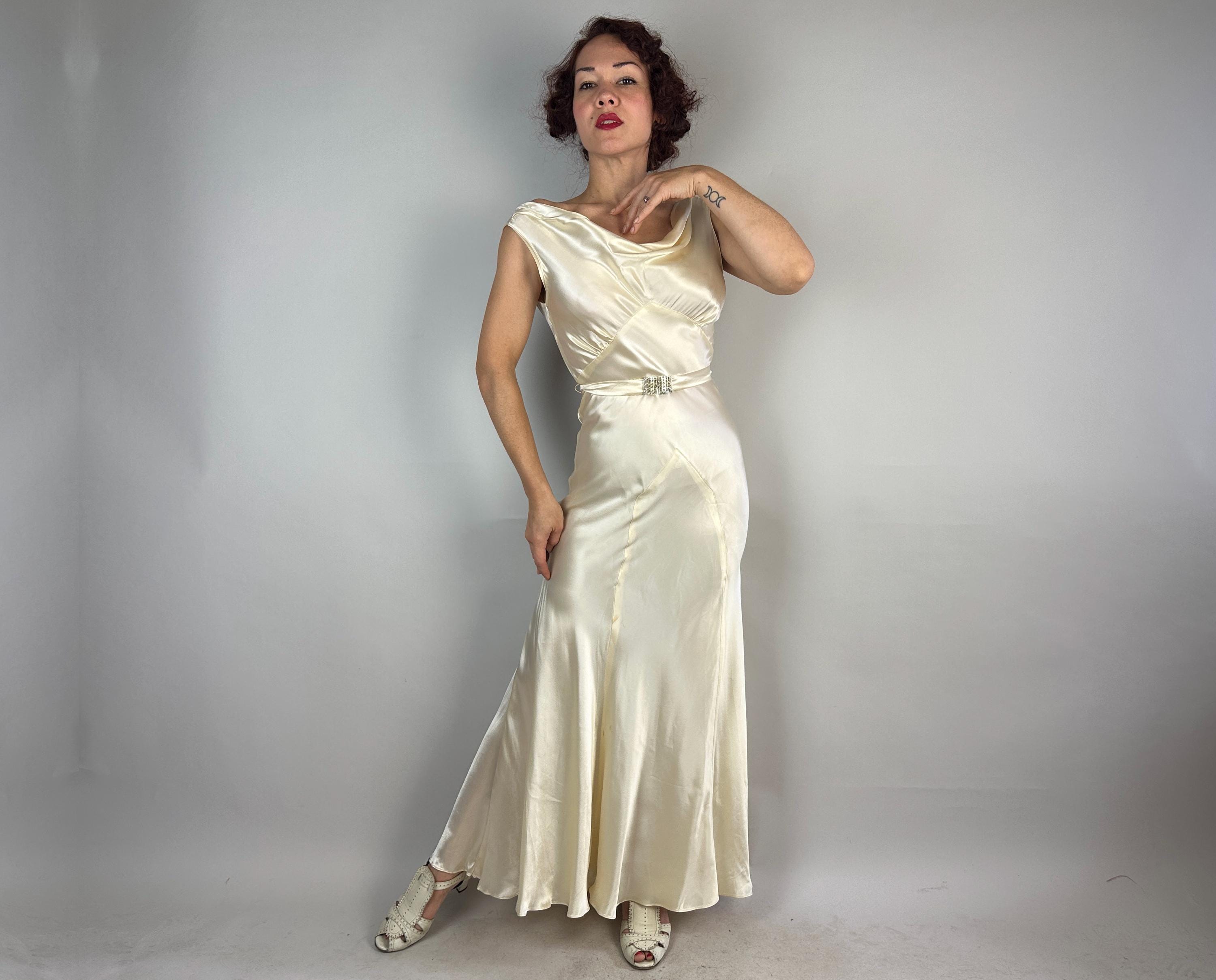 Just as Jean Harlow dazzled in Dinner at Eight, so will you when you channel her in this 1930s gown! Whether for an evening out or your walk down the aisle, the ivory rayon satin in a bias cut is swoon worthy. The neckline may look demure with it's high cowl drape but the deep cut of the back gives it a kick. Bust gathers tuck into the peaked waist and deco diamond seaming on the skirt gives extra panache to the bias cut with every curve gracefully hugged and the hem flaring pleasingly. A matching belt with rhinestone buckle cinches the waist. This dress is in great vintage condition, with a couple small faint spots in the skirting but no holes or odors to note.