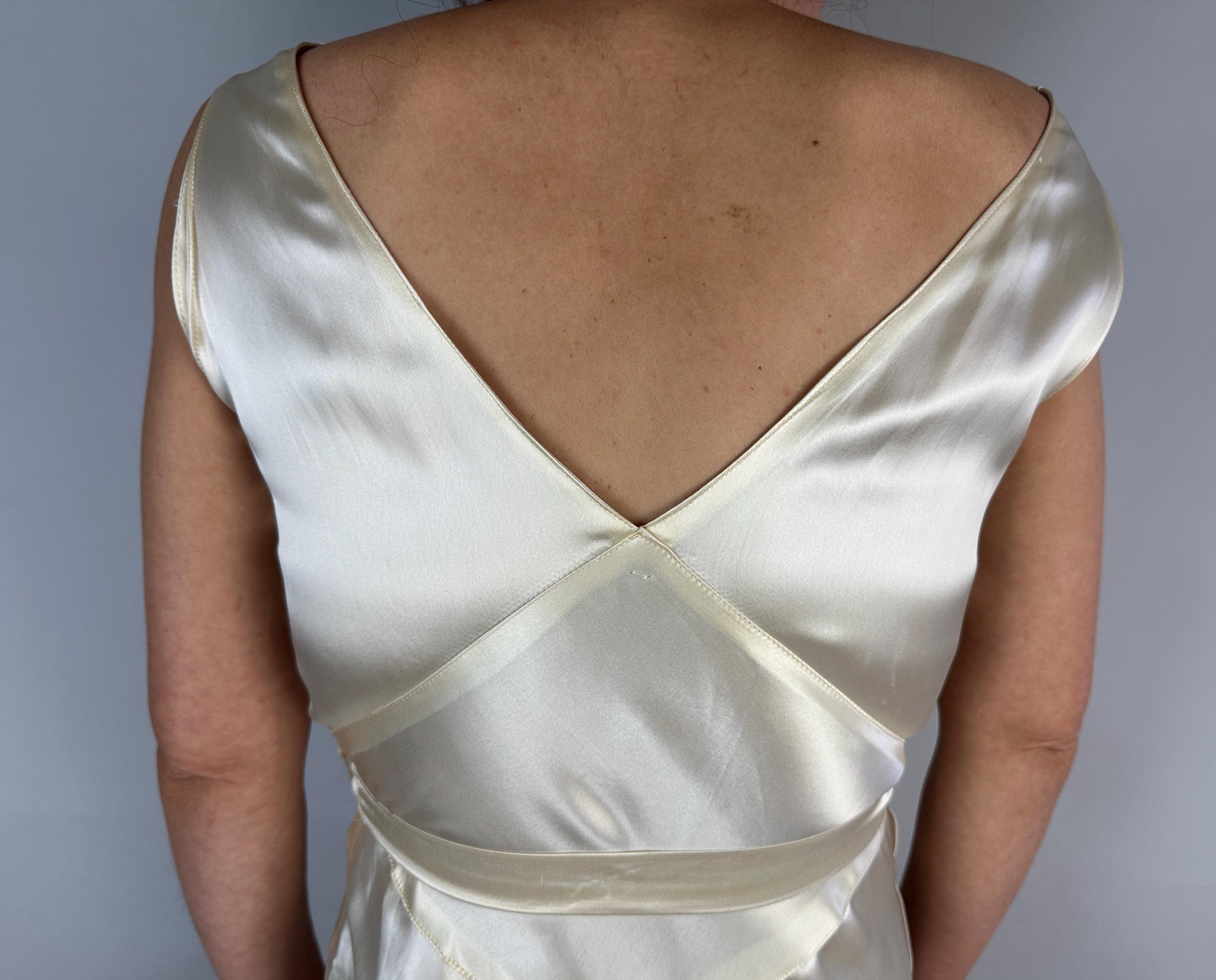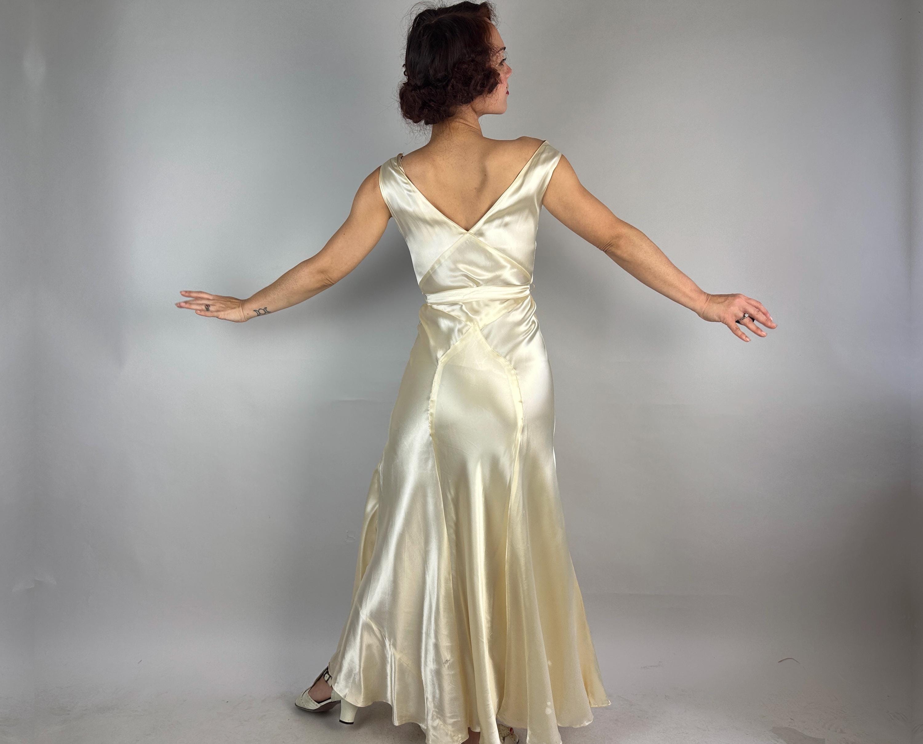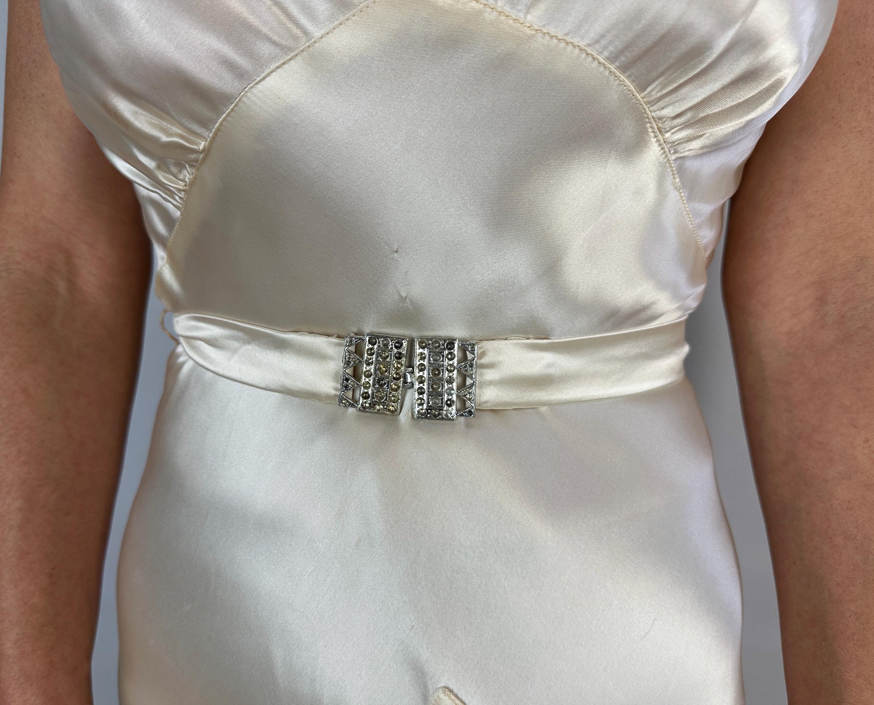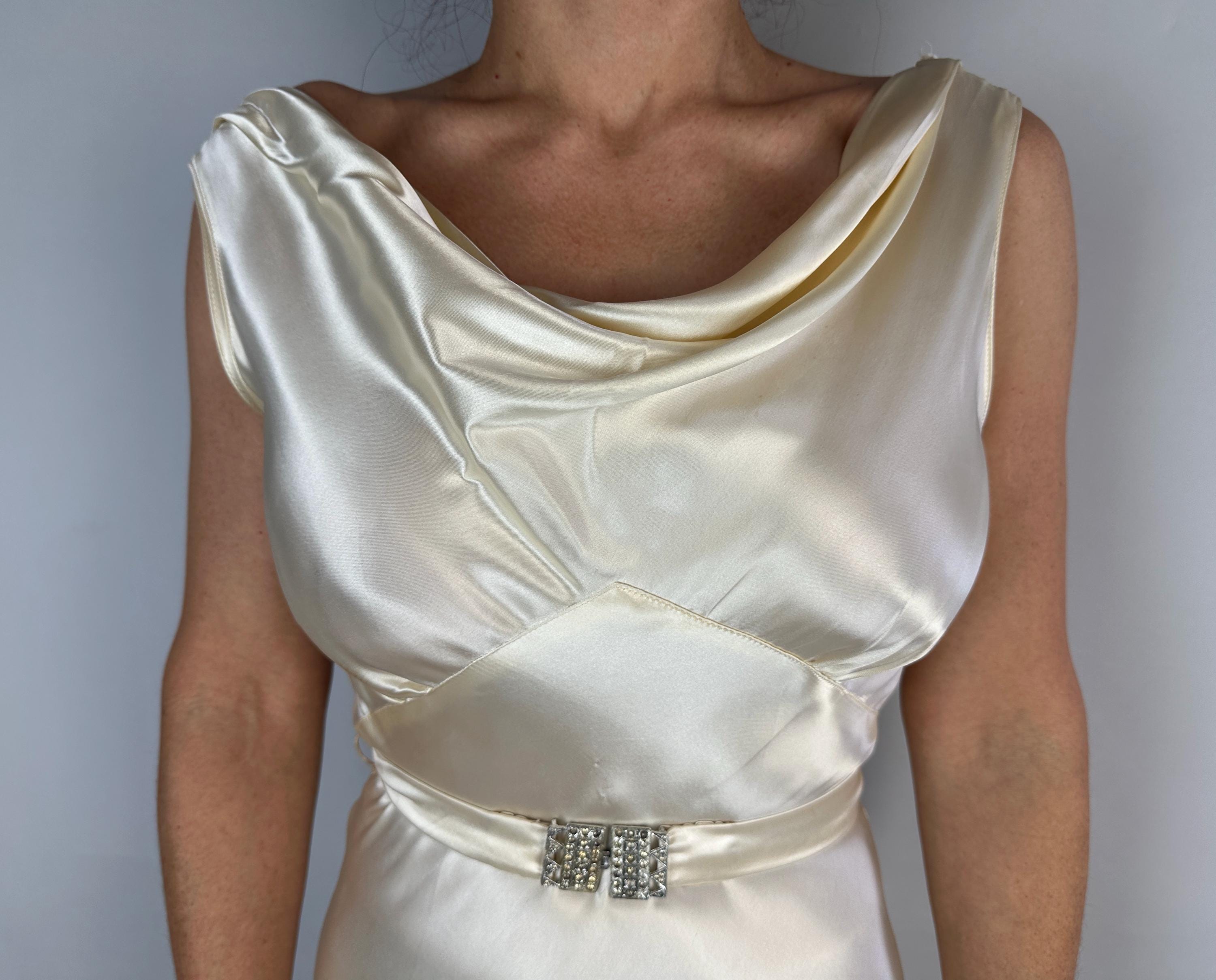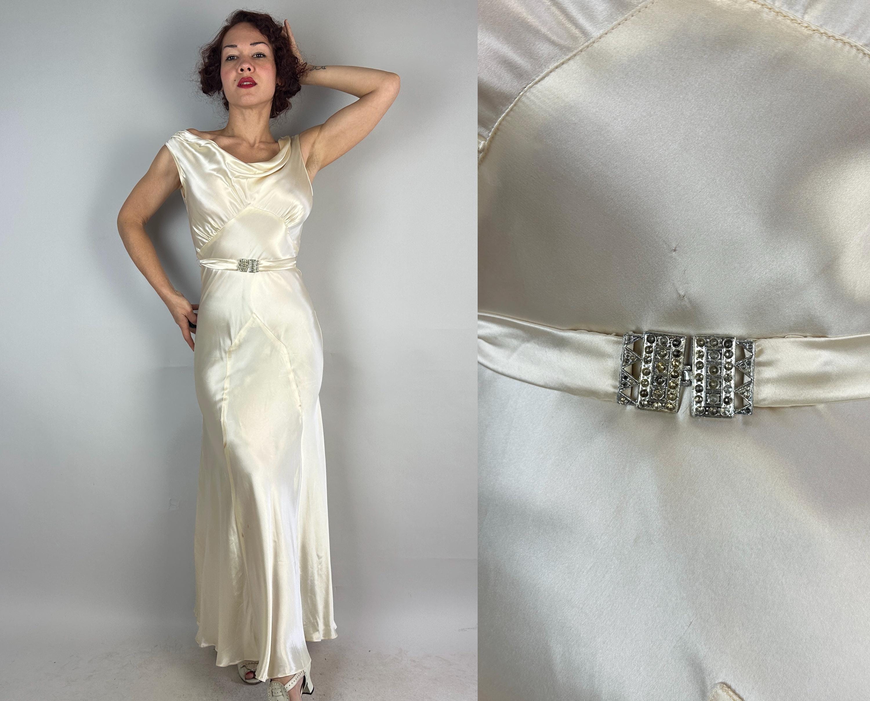 Just as Jean Harlow dazzled in Dinner at Eight, so will you when you channel her in this 1930s gown! Whether for an evening out or your walk down the aisle, the ivory rayon satin in a bias cut is swoon worthy. The neckline may look demure with it's high cowl drape but the deep cut of the back gives it a kick. Bust gathers tuck into the peaked waist and deco diamond seaming on the skirt gives extra panache to the bias cut with every curve gracefully hugged and the hem flaring pleasingly. A matching belt with rhinestone buckle cinches the waist. This dress is in great vintage condition, with a couple small faint spots in the skirting but no holes or odors to note.