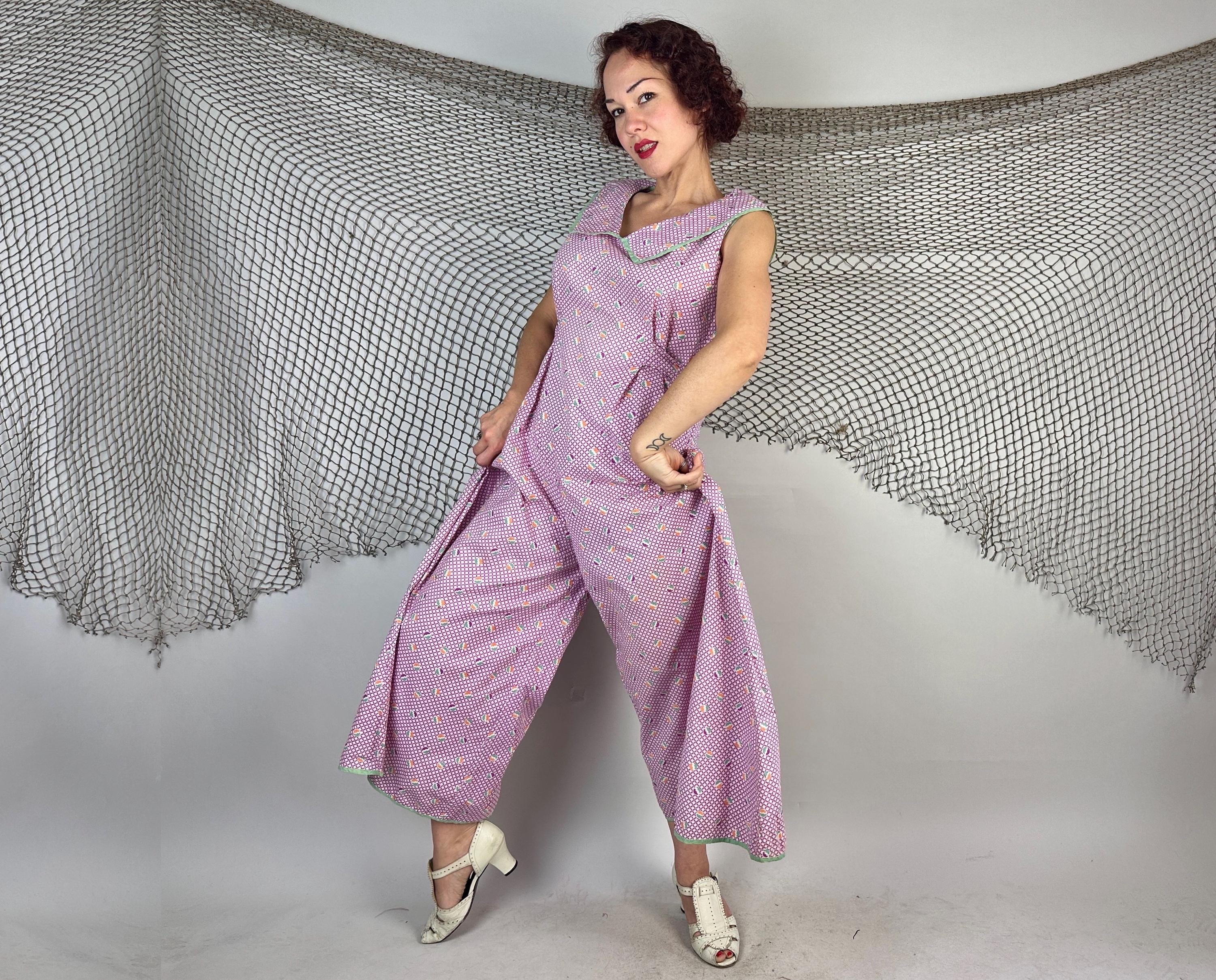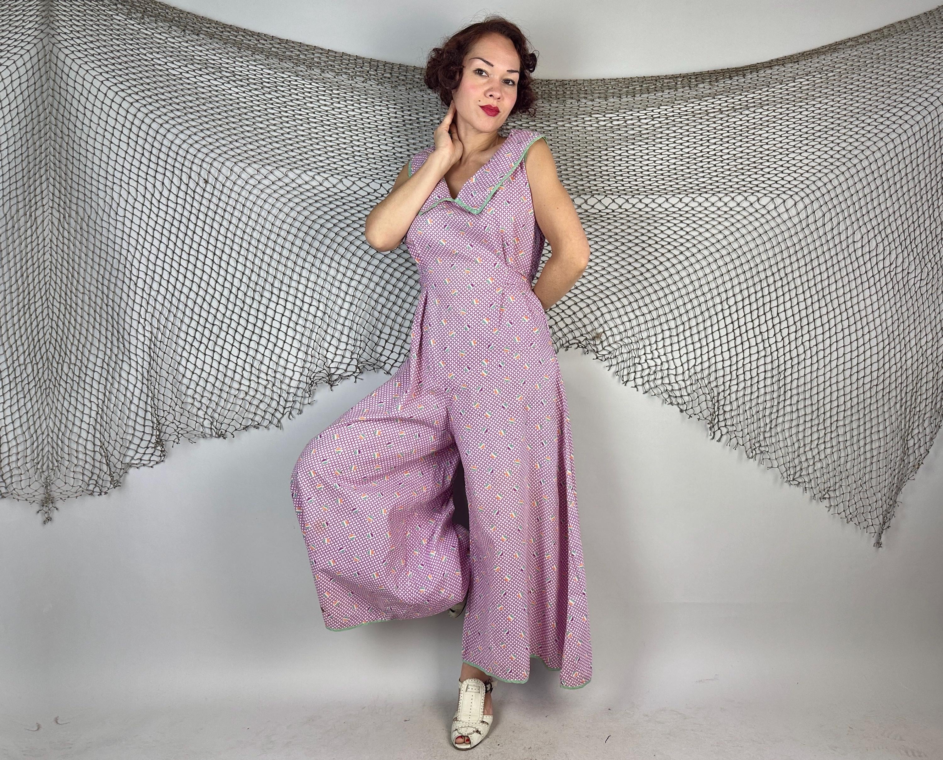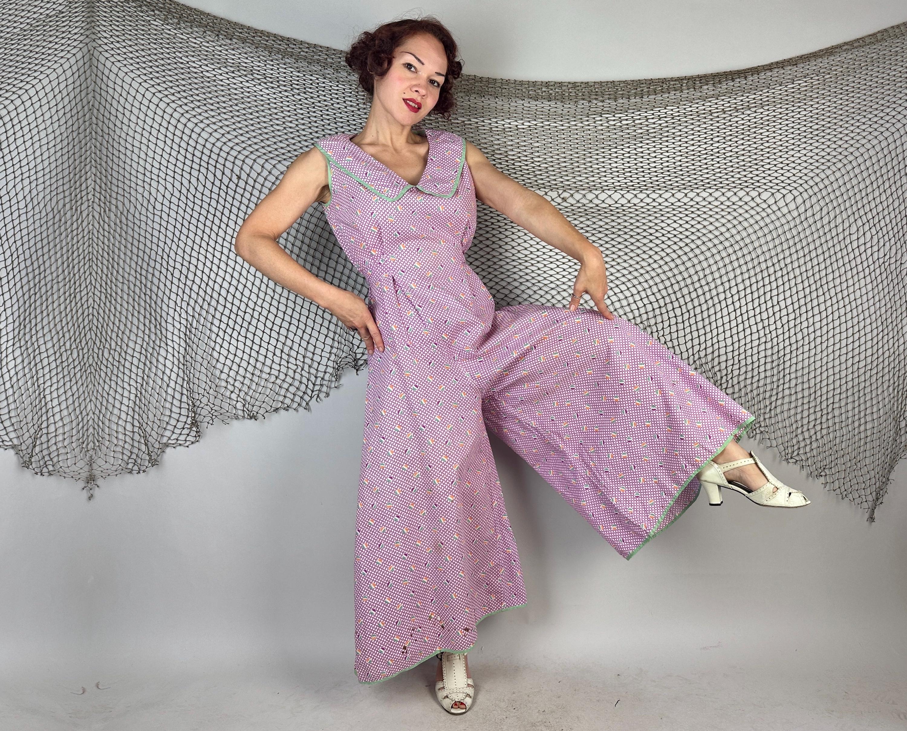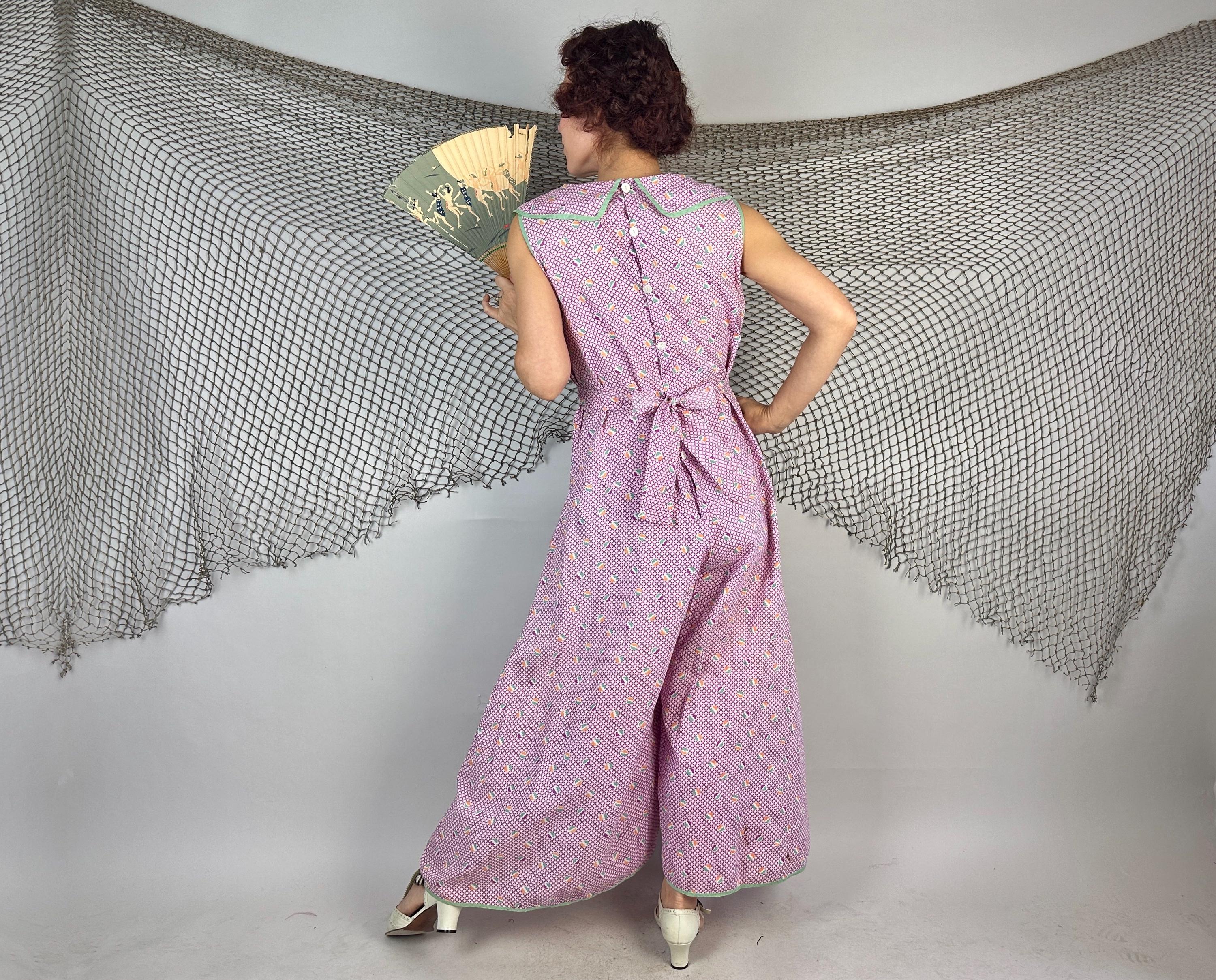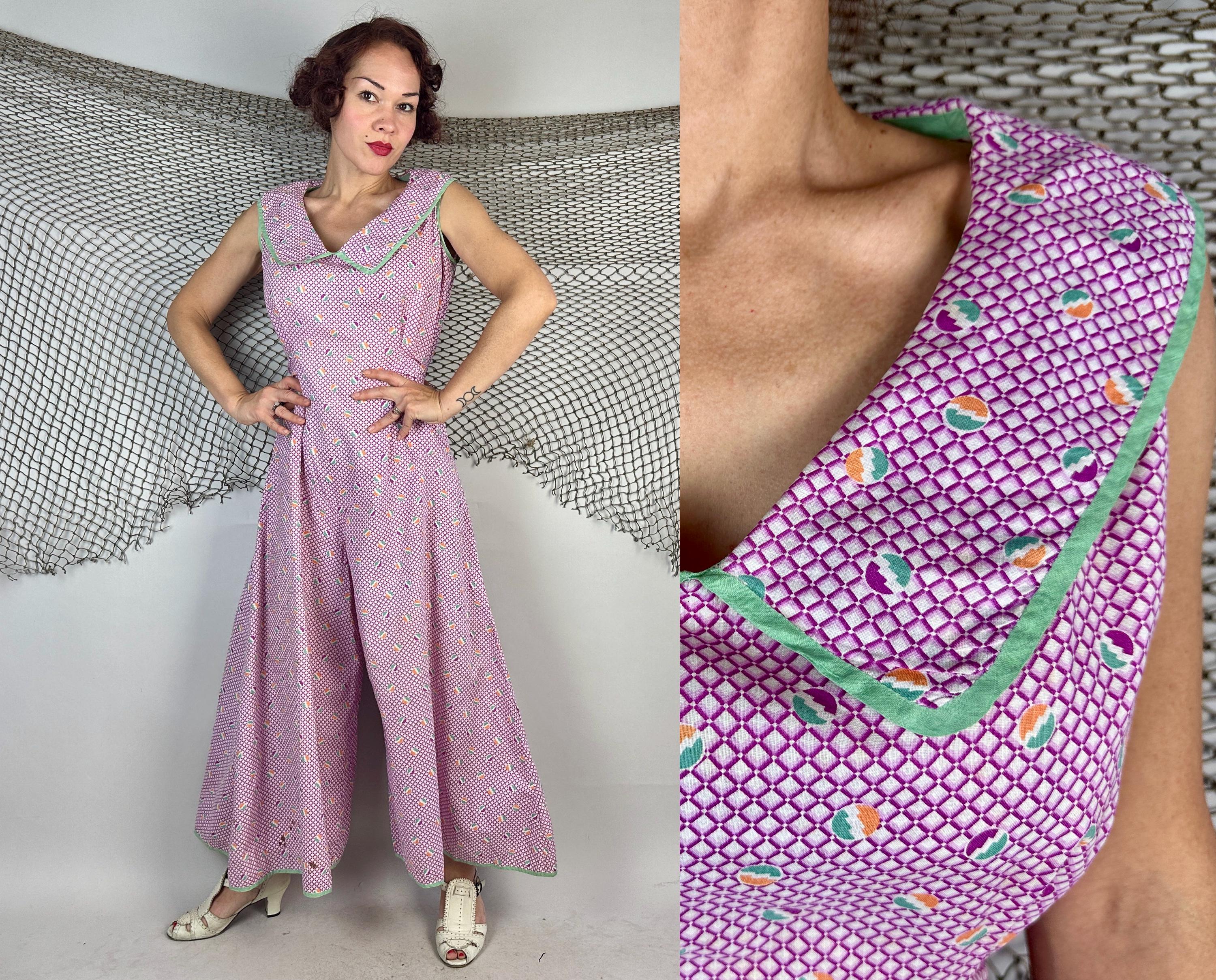You'll have a ball strutting the boardwalk in these 1920's beach pajamas! Cotton with a fabulous print of bouncing balls on a fishnet background makes a statement in orchid purple, spearmint green, creamsicle orange, and white. Styled with a wide double notche Peter Pan collar, deco hip seams, and super wide legs to keep you cool and comfy. Attached waist ties mae a jaunty bow around the back where white shell buttons fasten. These PJs are in great vintage condition, with some spots near the hem, easily lost in the ultra-full legs, and no other stains, holes, nor odors to note.