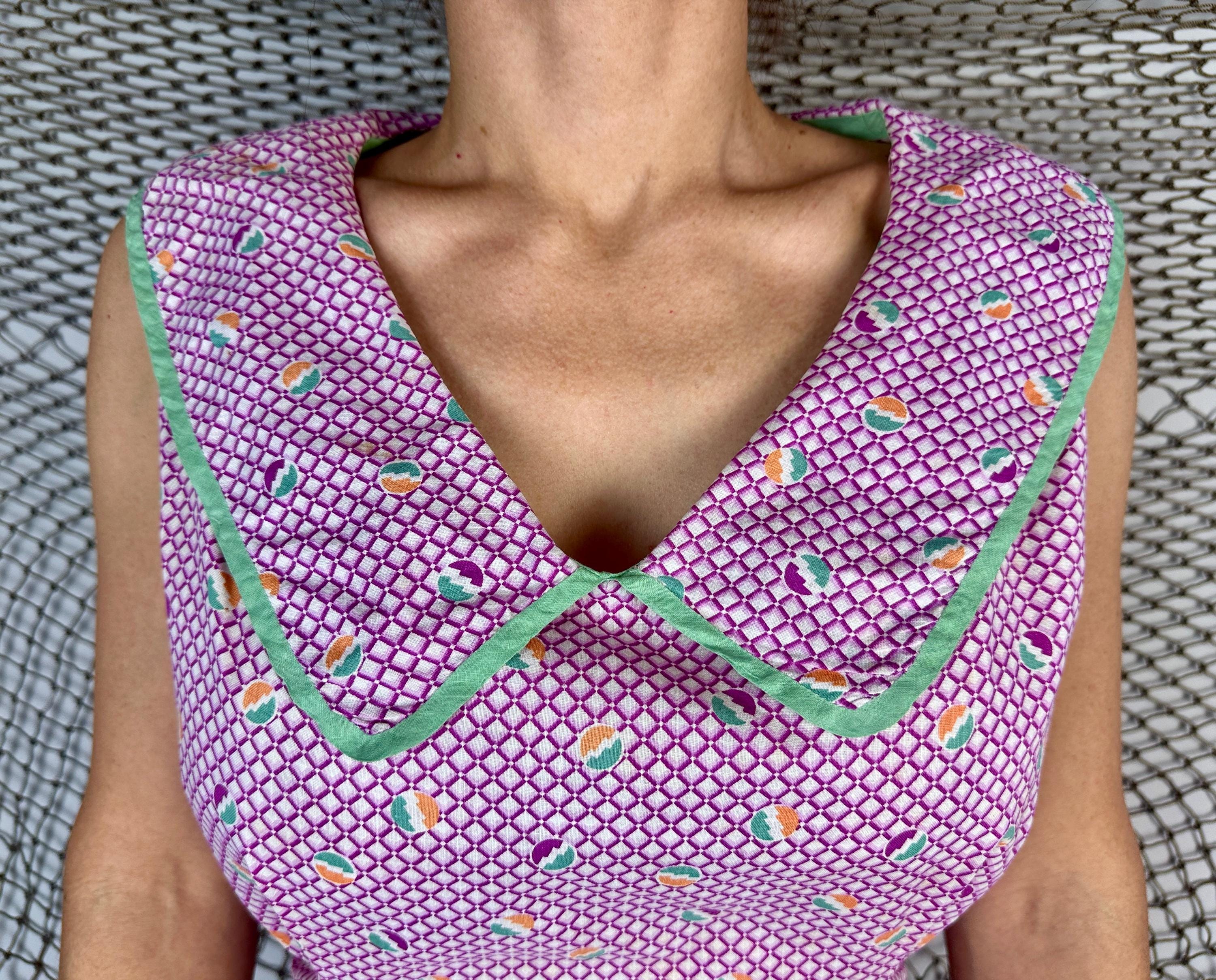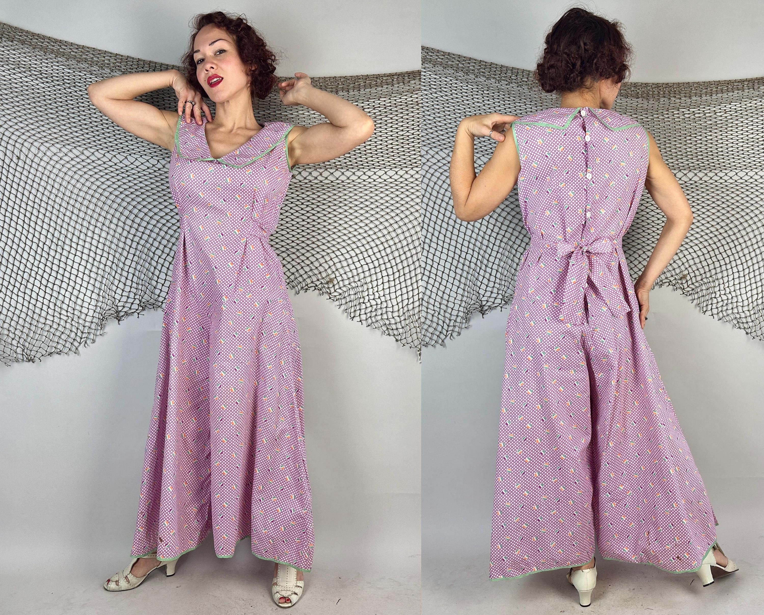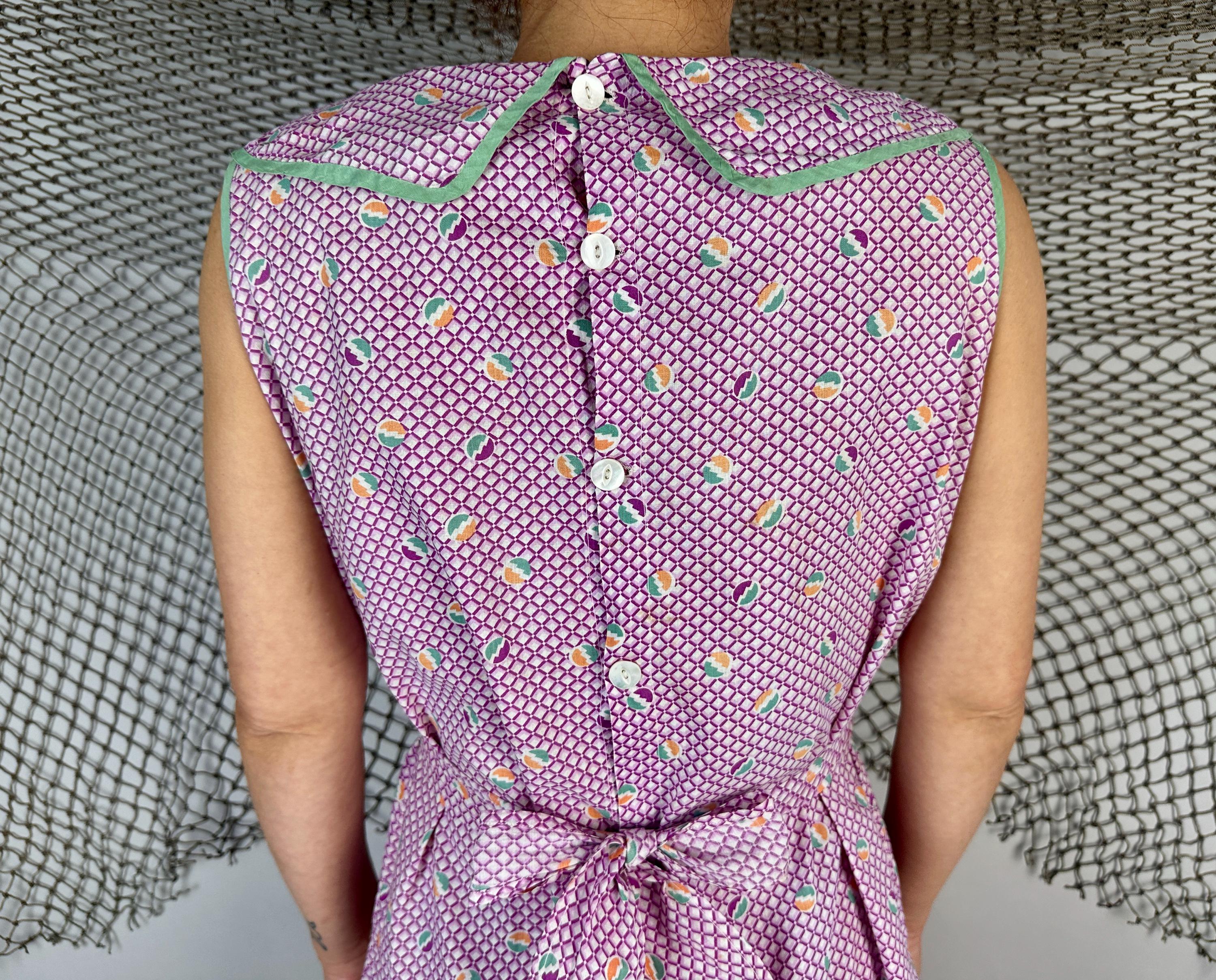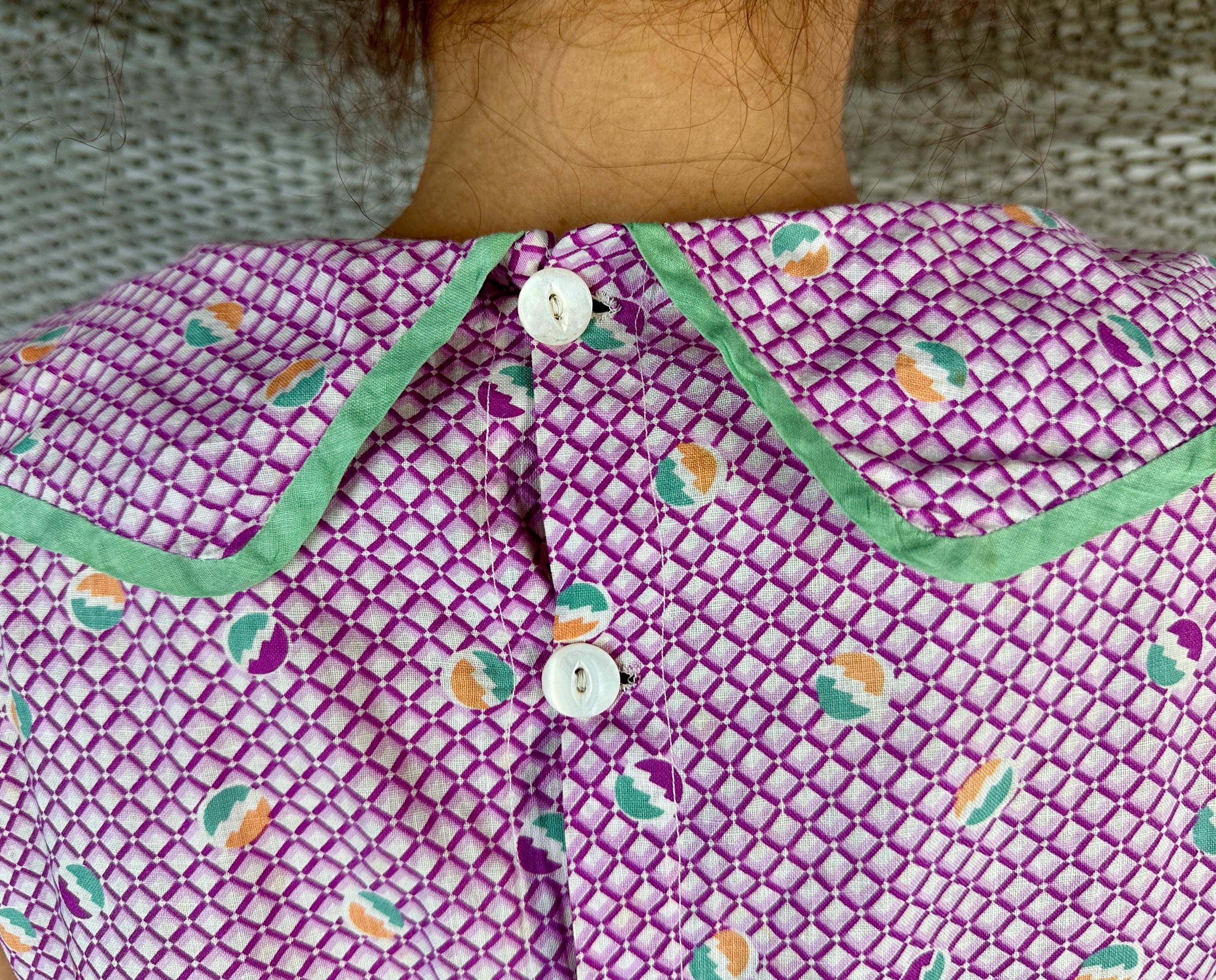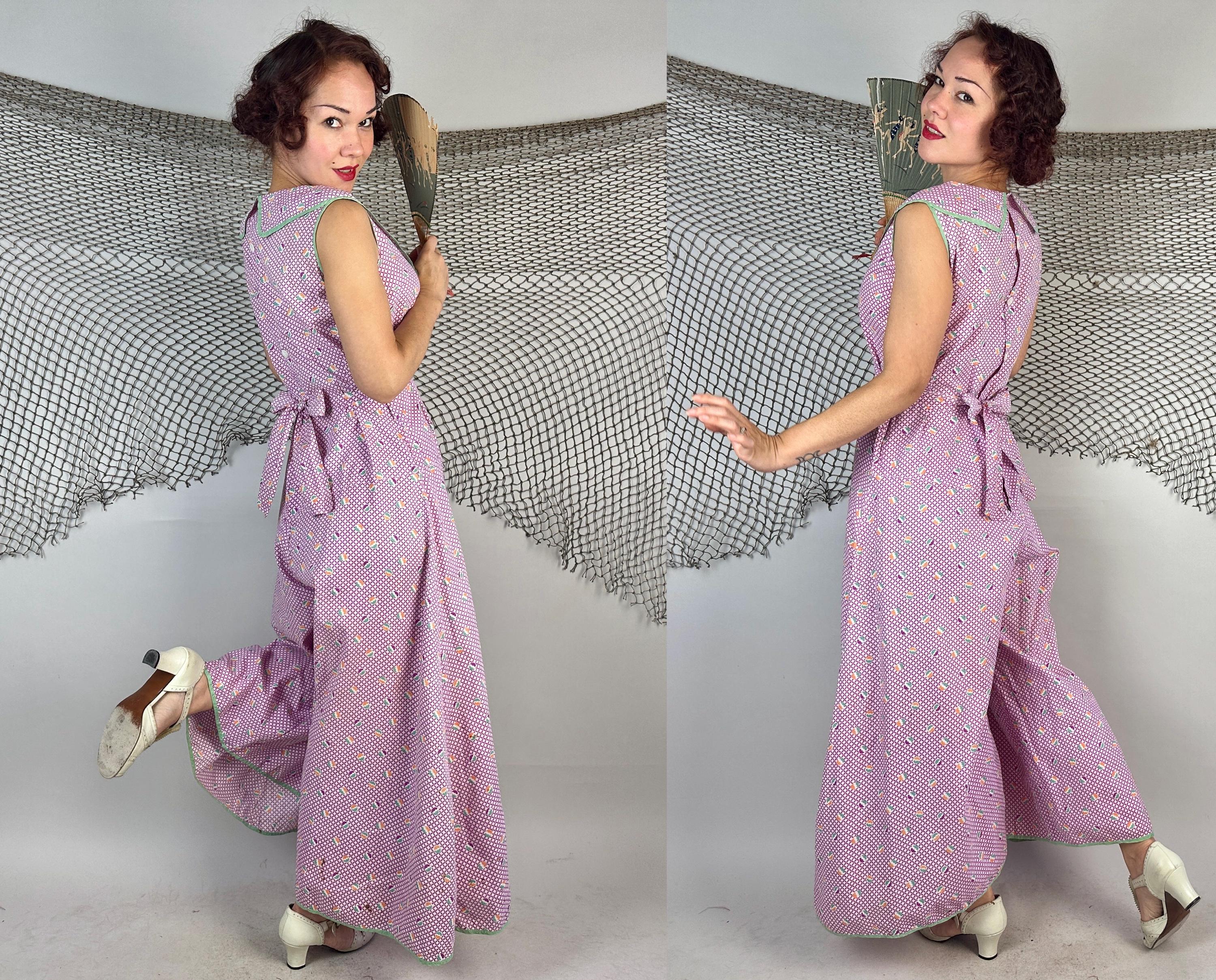 You'll have a ball strutting the boardwalk in these 1920's beach pajamas! Cotton with a fabulous print of bouncing balls on a fishnet background makes a statement in orchid purple, spearmint green, creamsicle orange, and white. Styled with a wide double notche Peter Pan collar, deco hip seams, and super wide legs to keep you cool and comfy. Attached waist ties mae a jaunty bow around the back where white shell buttons fasten. These PJs are in great vintage condition, with some spots near the hem, easily lost in the ultra-full legs, and no other stains, holes, nor odors to note.