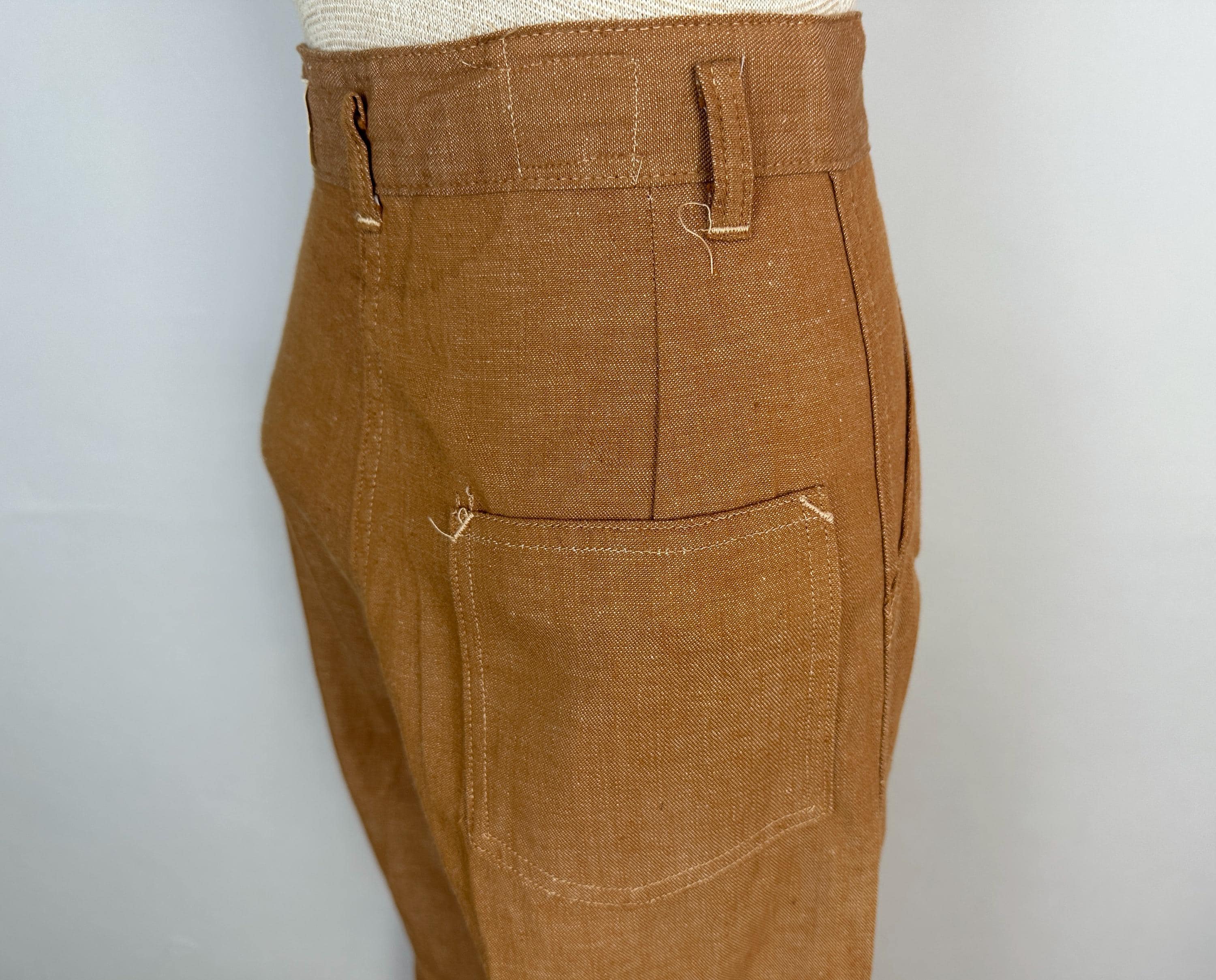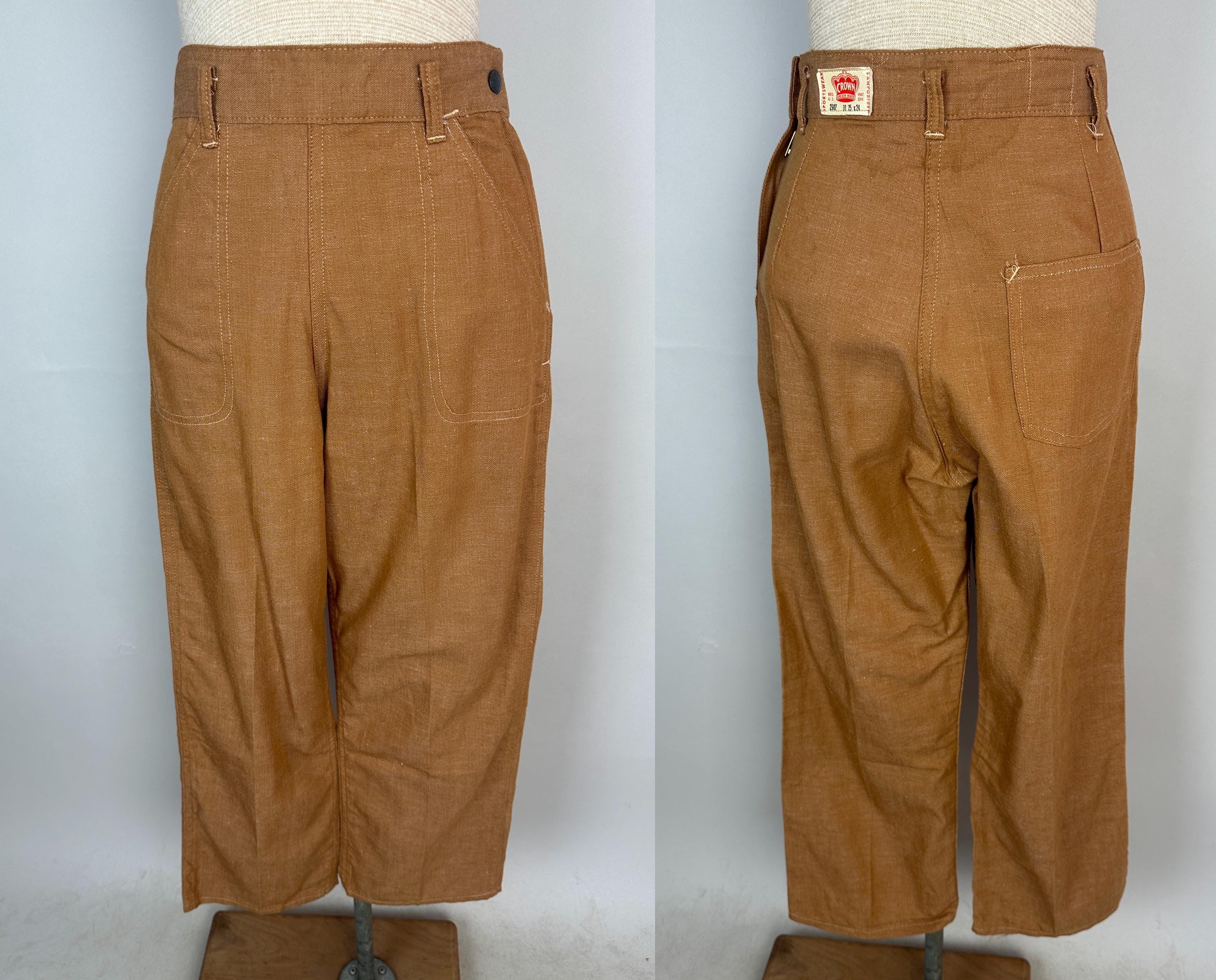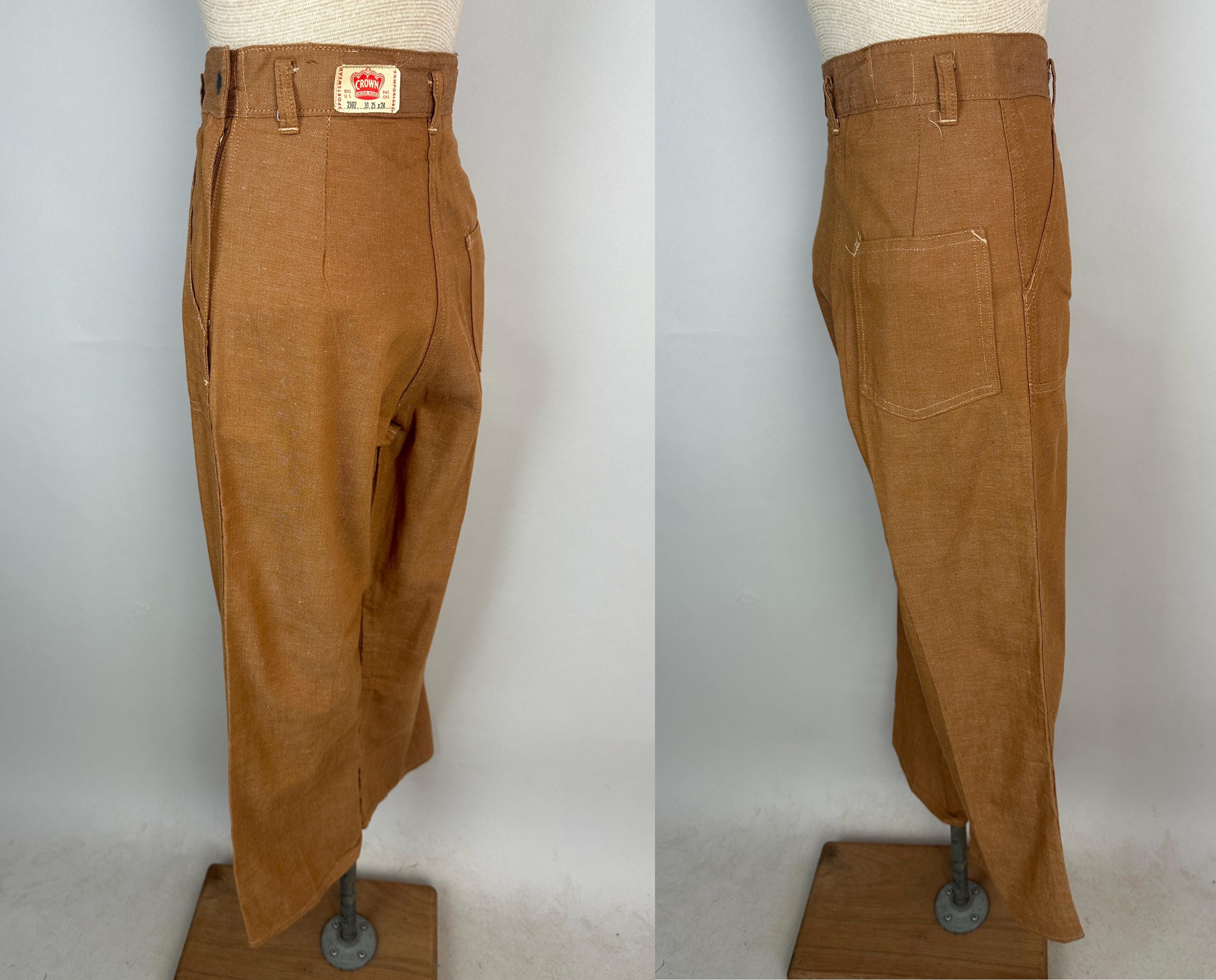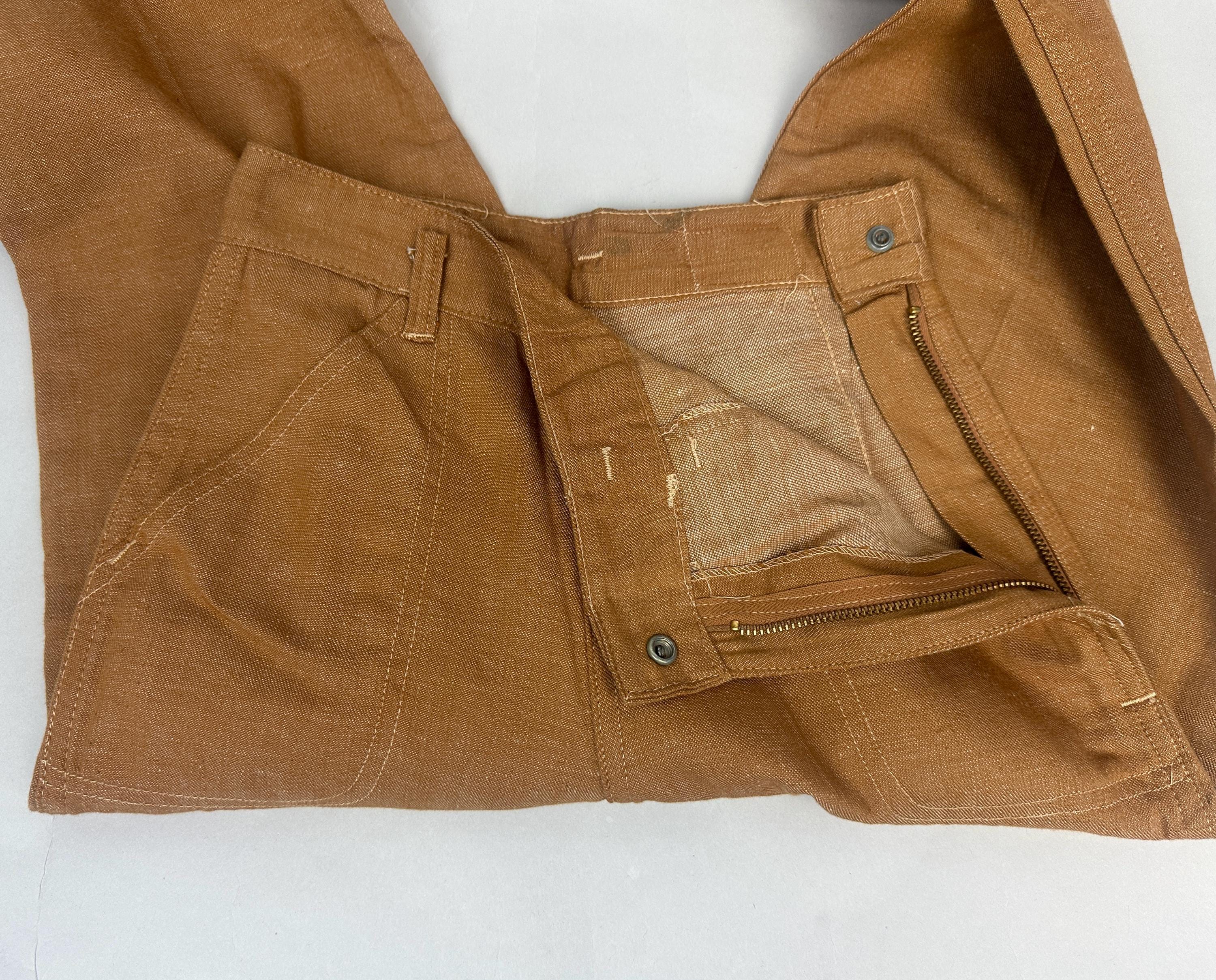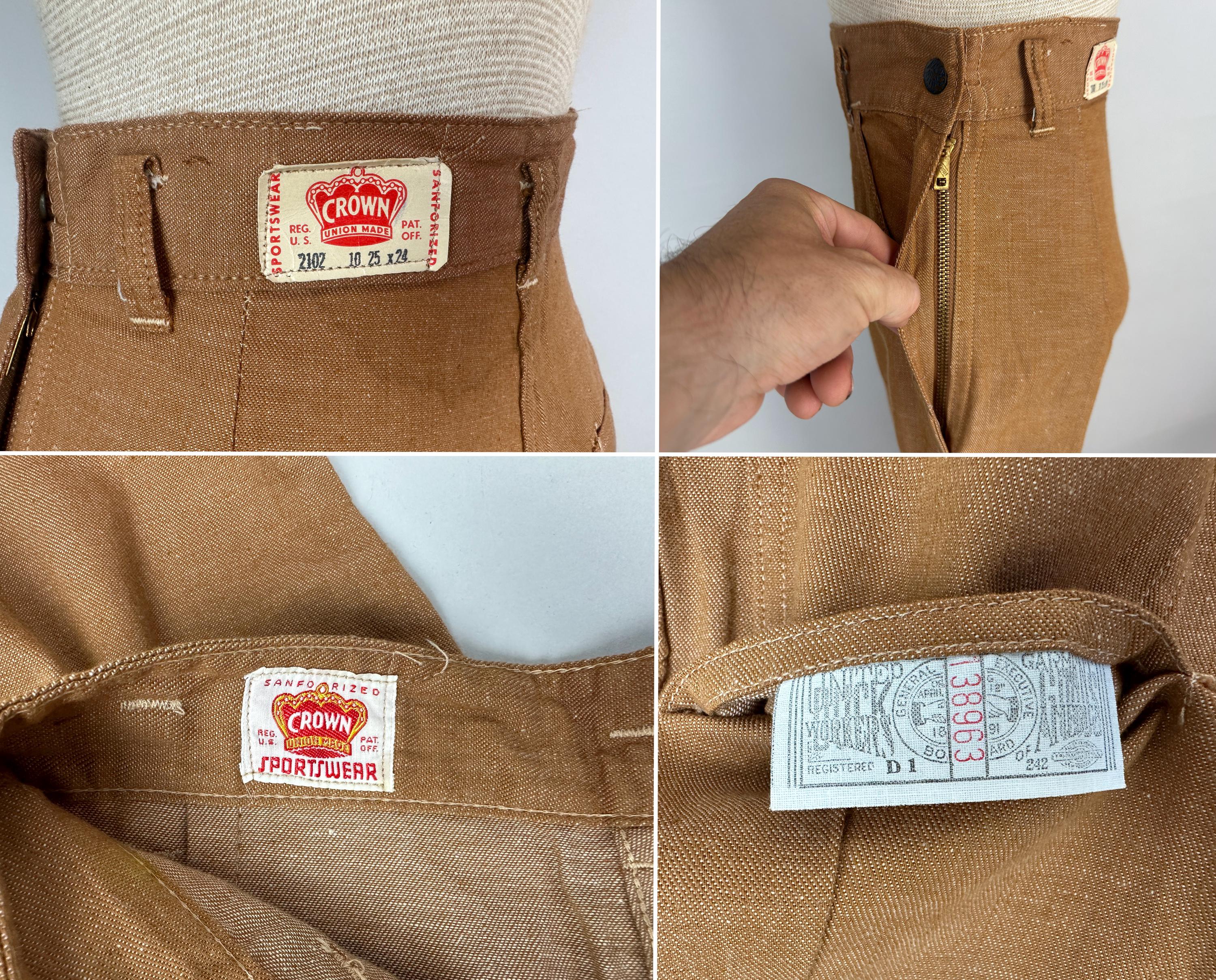 Crusing, carousing, and camping, you'll be set wearing these 1950s jeans! Cotton denim in a unique shade of latte brown, they feature ecru top stitching, slanted hip pockets, one back pocket, and high waist with dropped belt loops. Metal zipper and snap on the side. Original deadstock tag intact and branded "Crown". These trousers are in great vintage condition, with no holes, stains, odors to note.