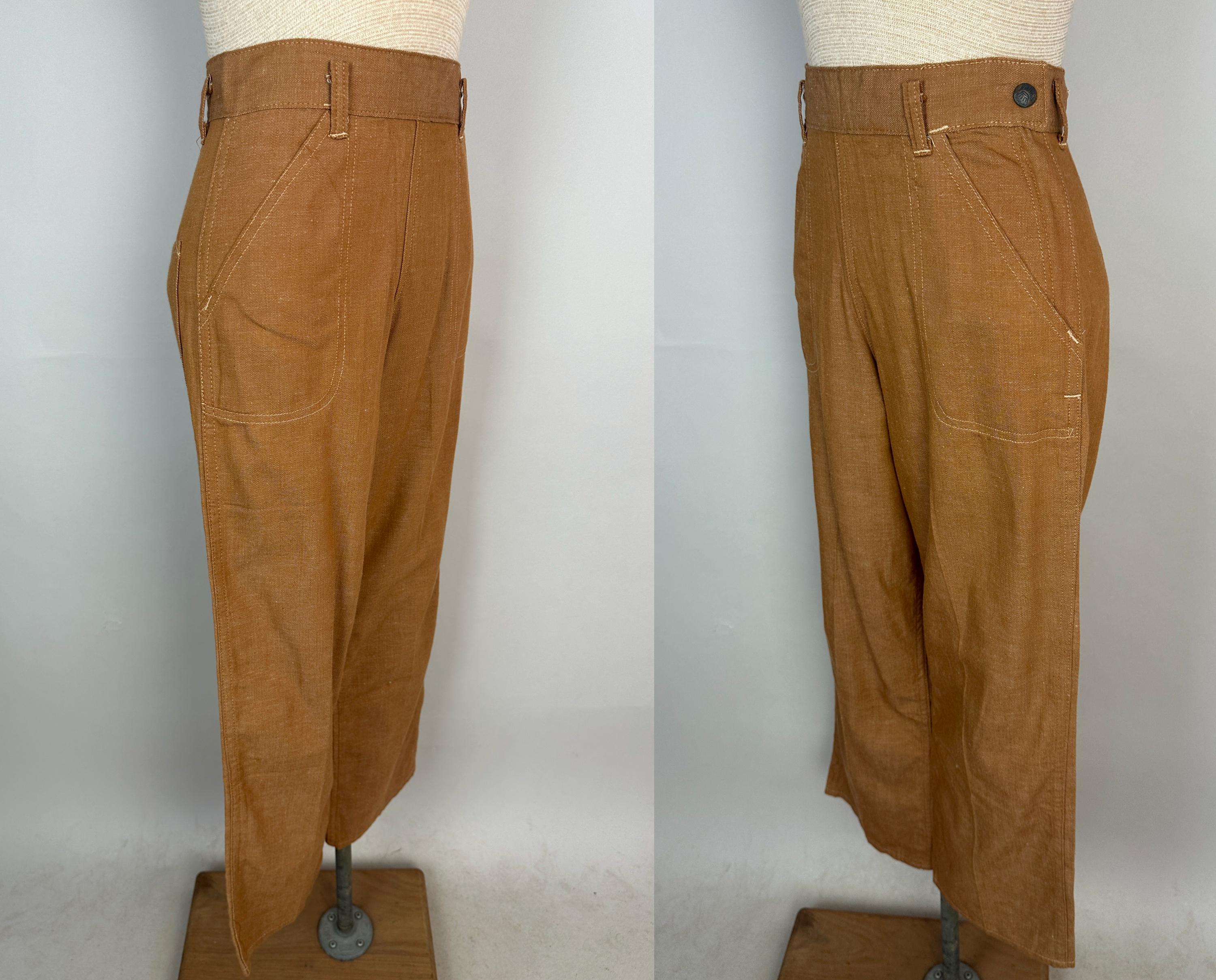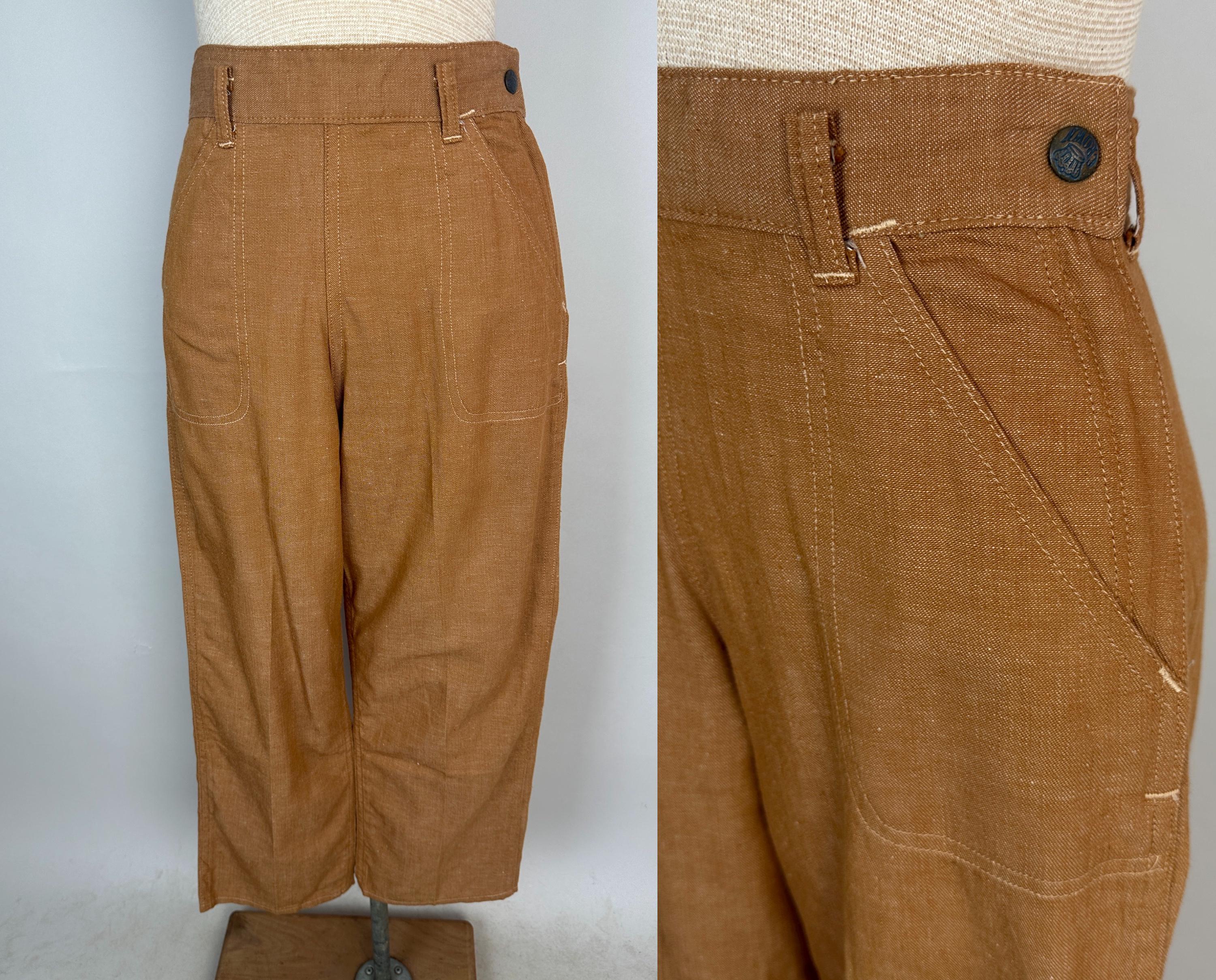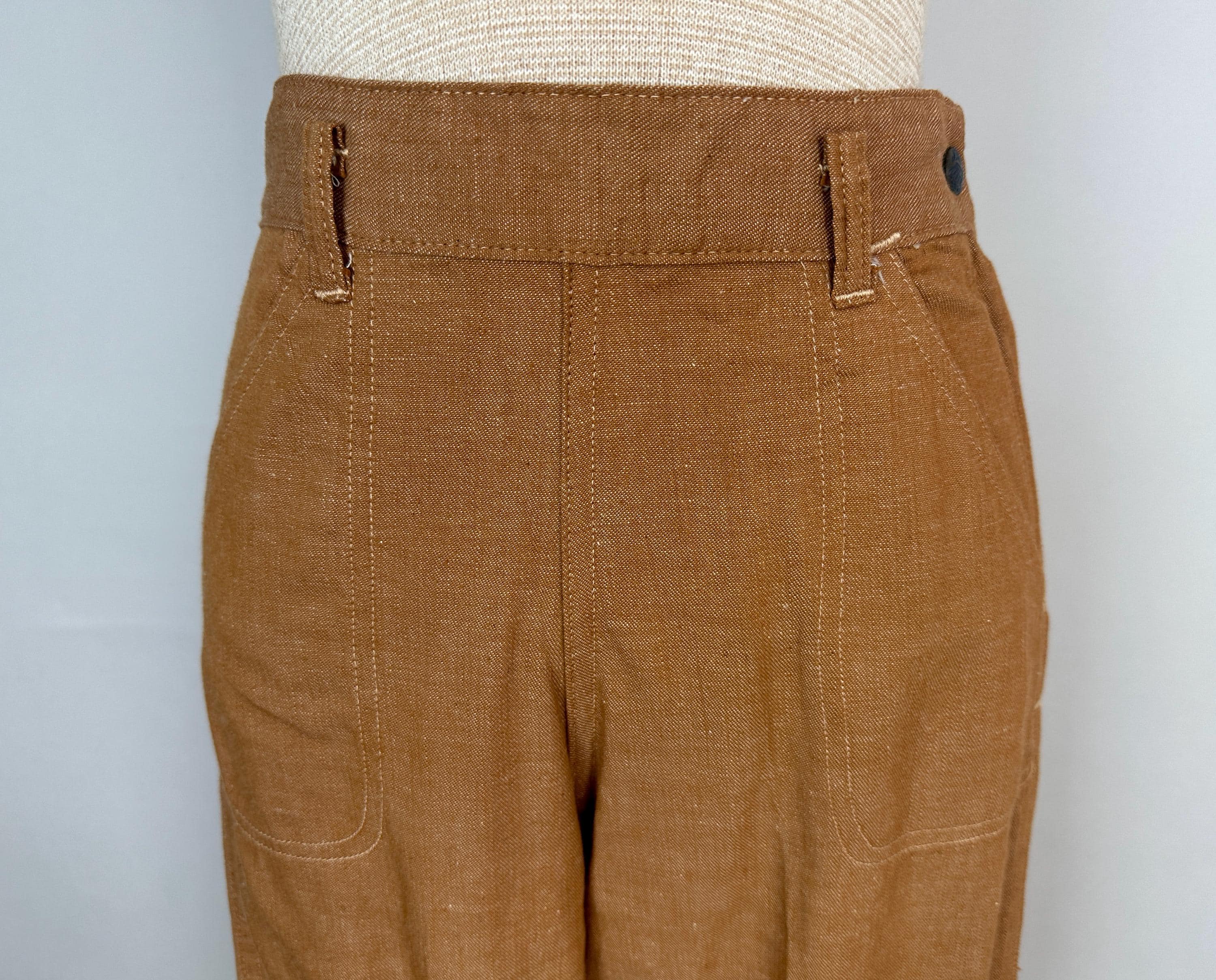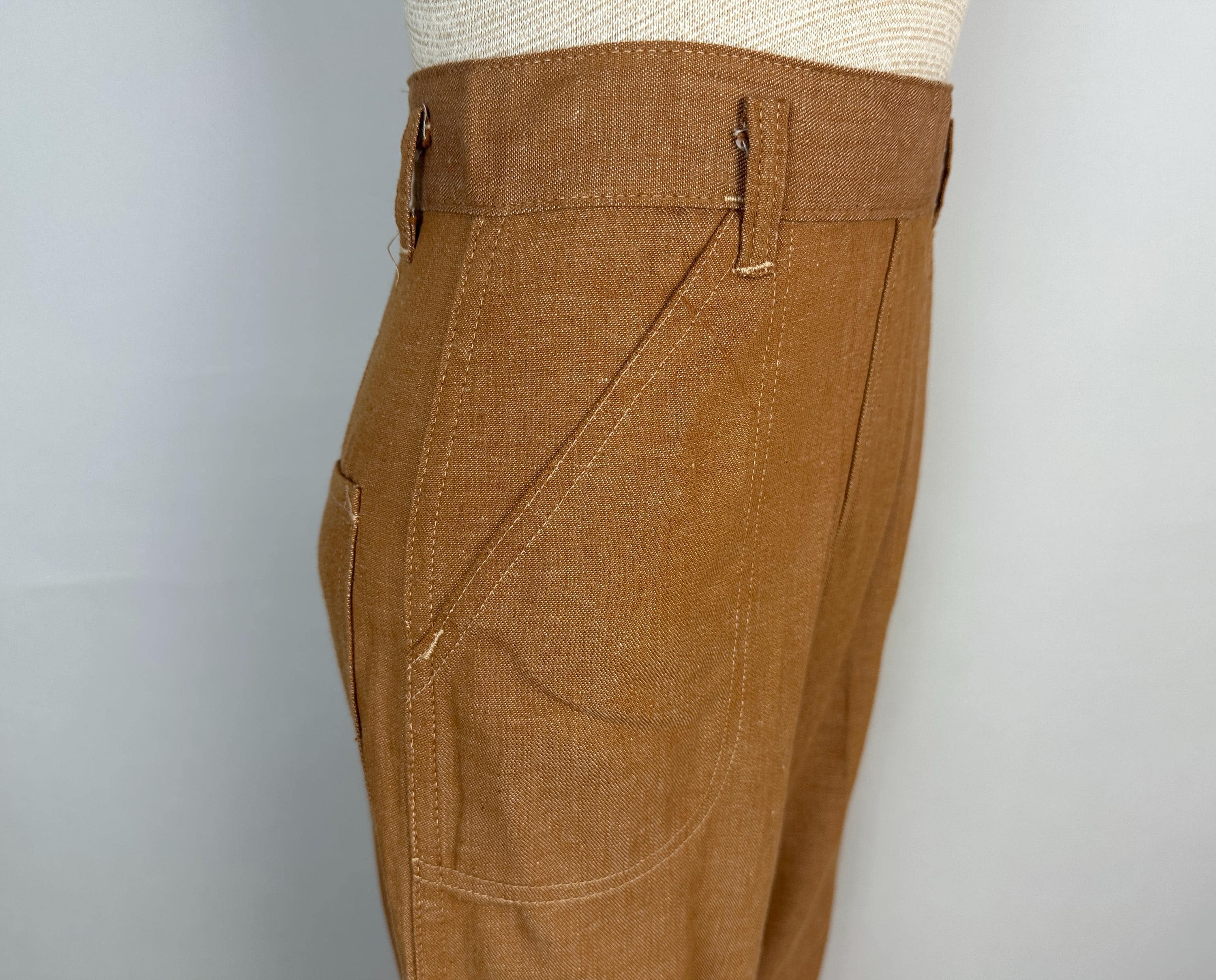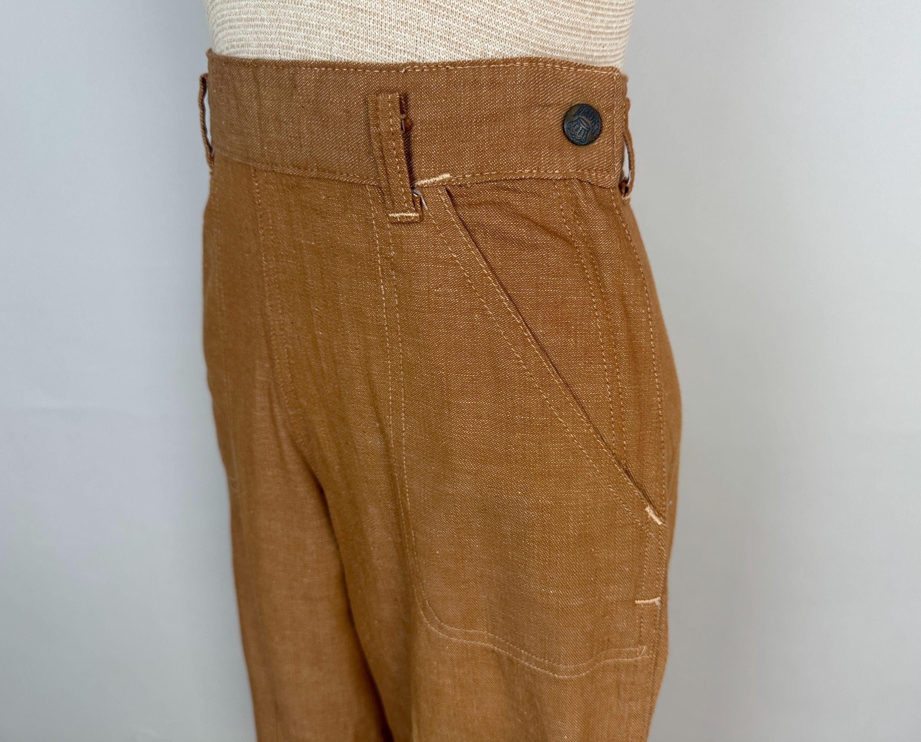 Crusing, carousing, and camping, you'll be set wearing these 1950s jeans! Cotton denim in a unique shade of latte brown, they feature ecru top stitching, slanted hip pockets, one back pocket, and high waist with dropped belt loops. Metal zipper and snap on the side. Original deadstock tag intact and branded "Crown". These trousers are in great vintage condition, with no holes, stains, odors to note.