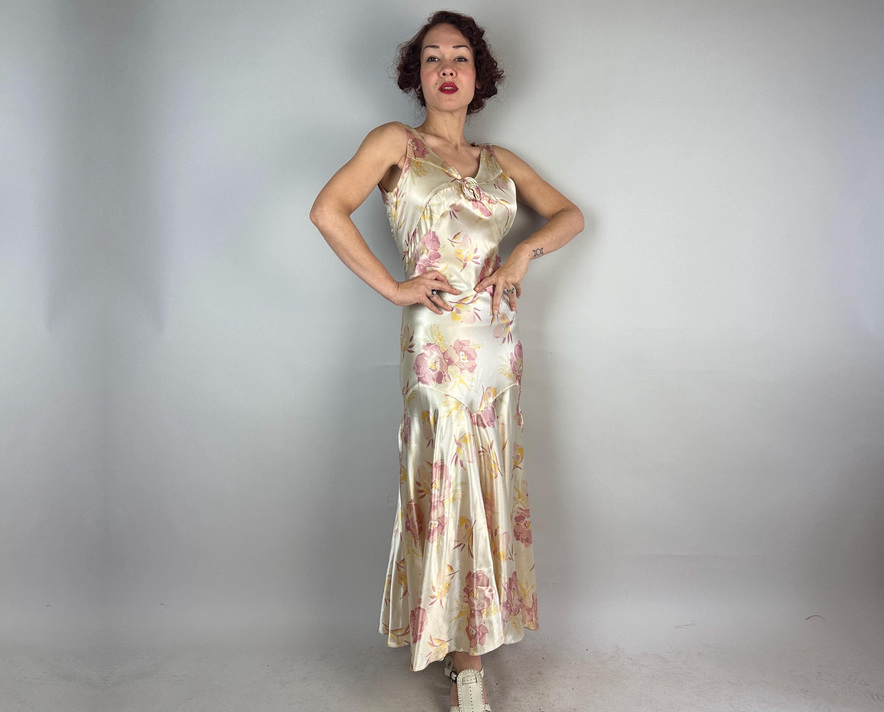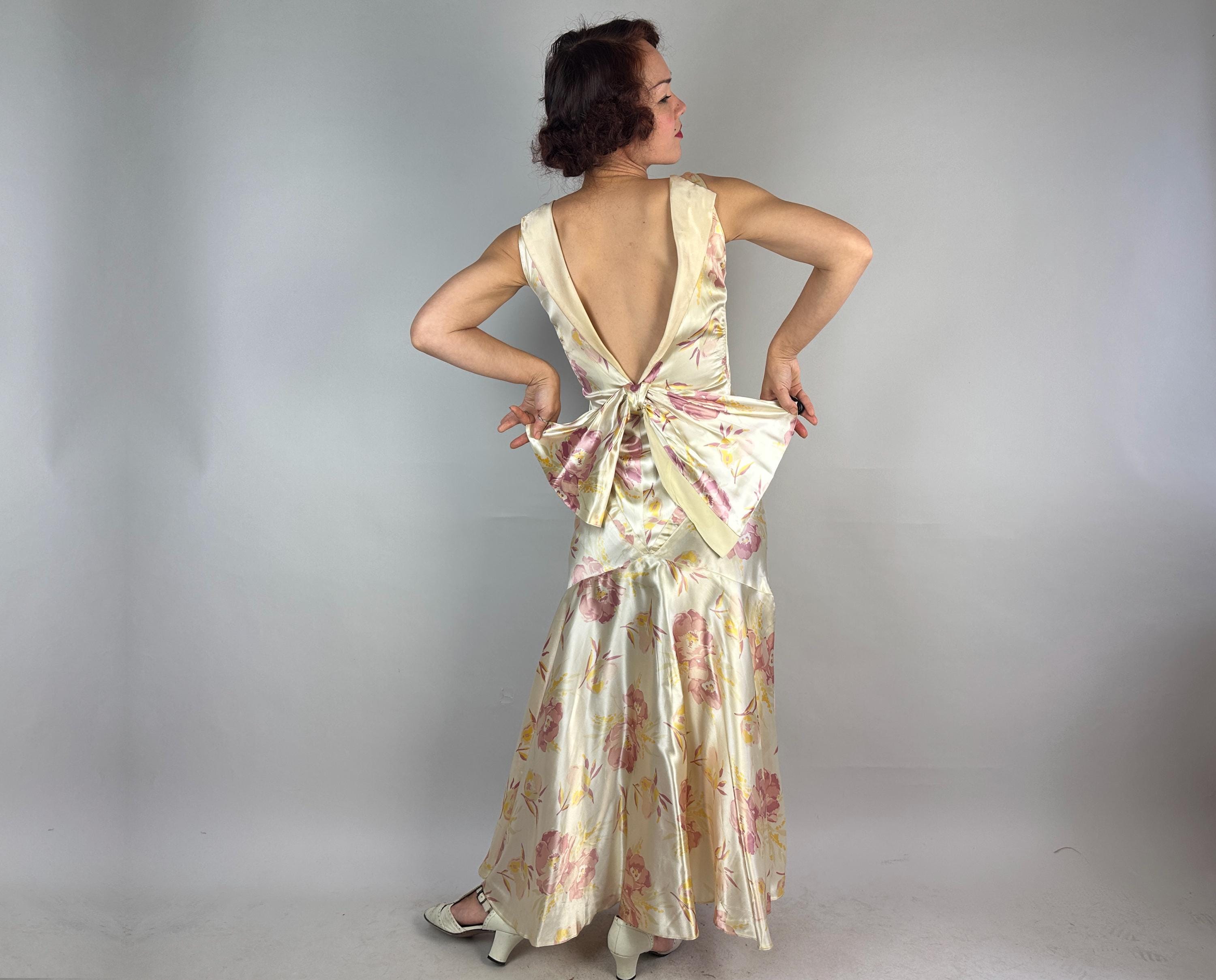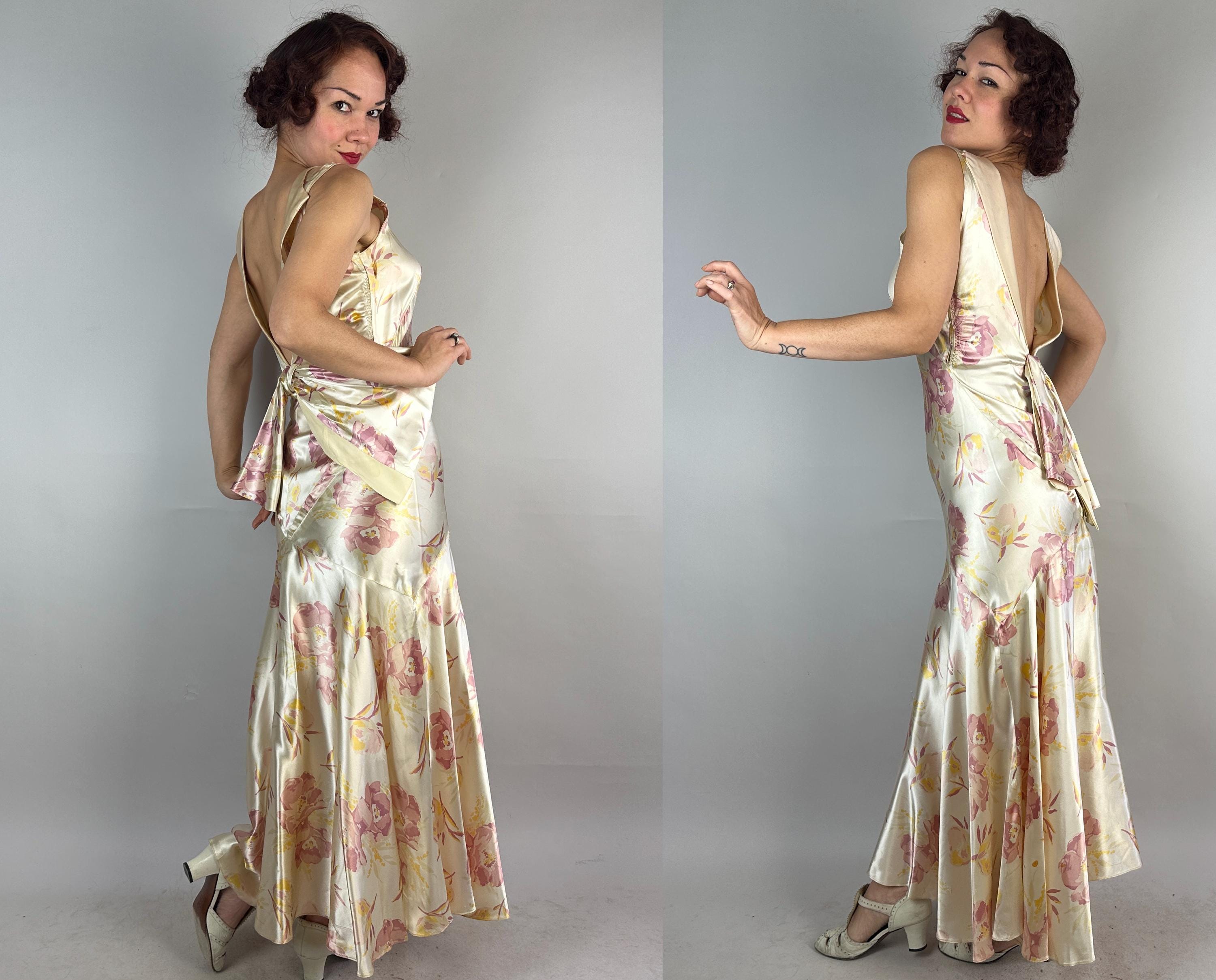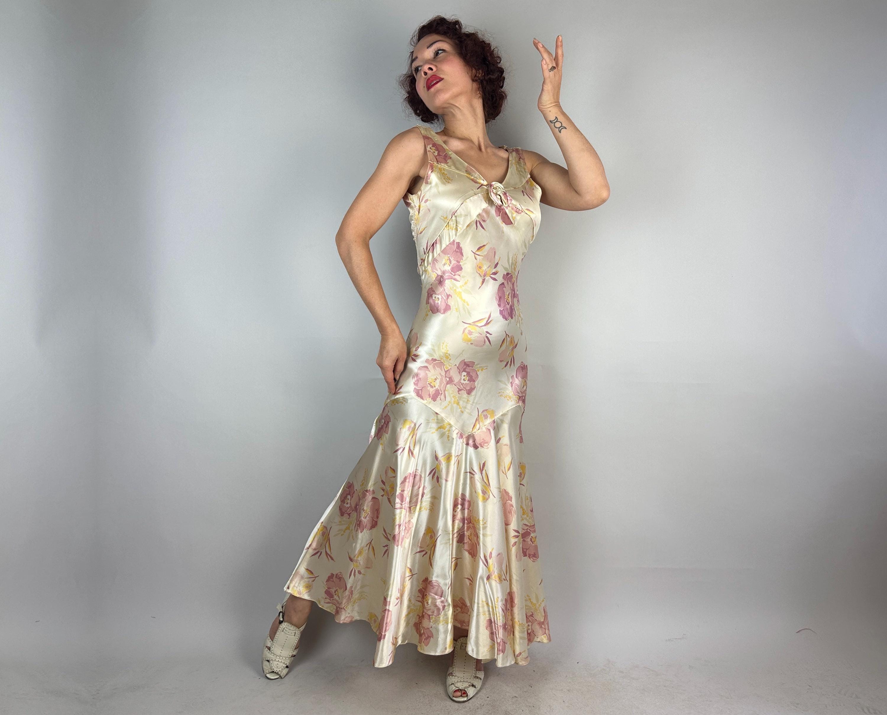 Like the first rose to bloom in the garden, you'll be a vision to behold in this 1930s gown! Sensuous silk satin in a bias cut makes a perfect match with the curve hugging drape spotlighting the gorgeous shimmer and sheen of the pearl white base. A gloriously feminine floral print in a watercolor style adds tones of orchid pink and marigold yellow. The wide V-neck is adorned with a fabric rosette with radiating pintuck seams extening over the bust and narrow ruching details the sides of the torso. The back plunges to an exaggerated bow and lapels flank the opening. Deco seamwork graces the skirt with a stunning mermaid tail drape to the hem. Snaps on the side. This dress is in great vintage condition, with a few very minor/small fabric imperfections.