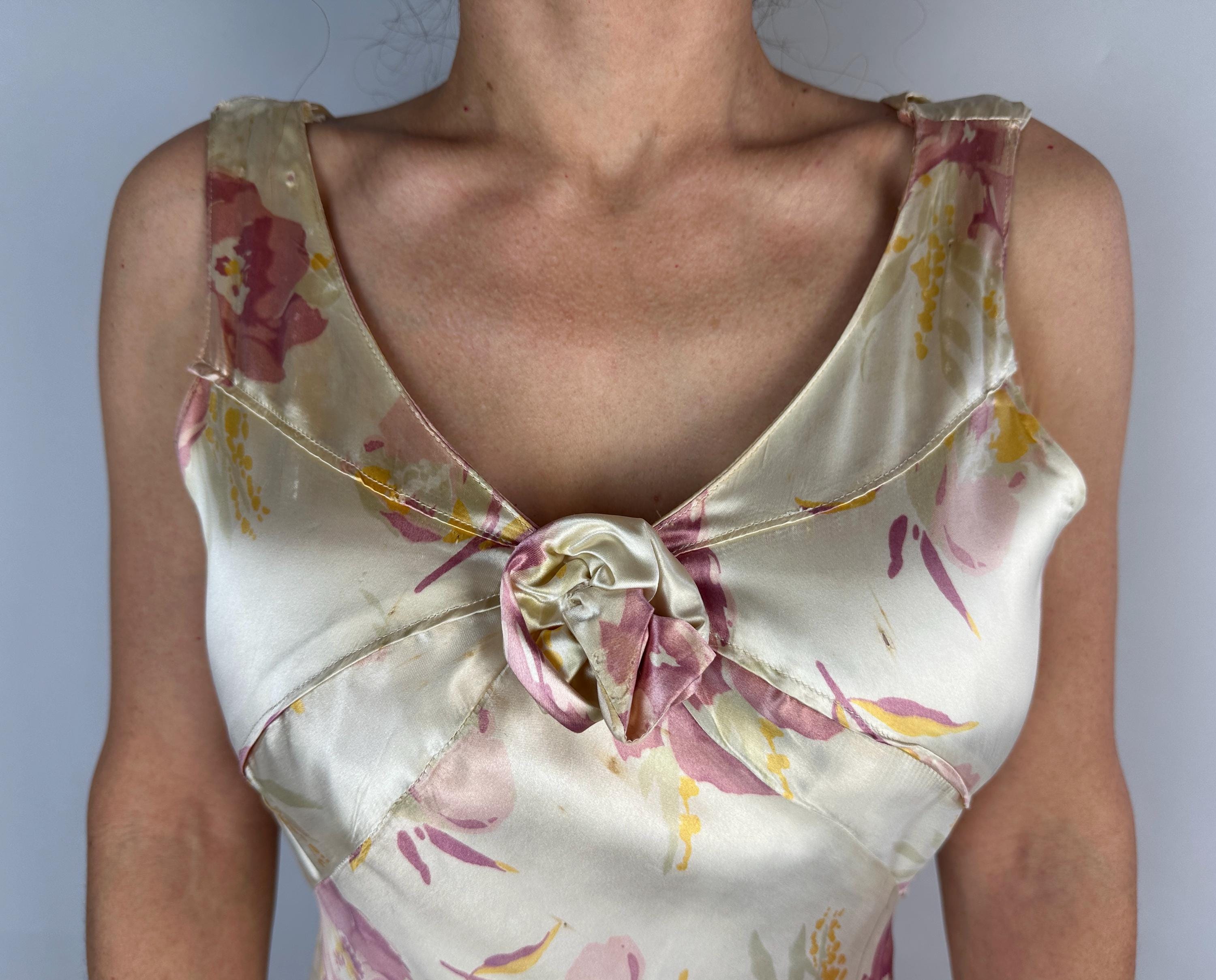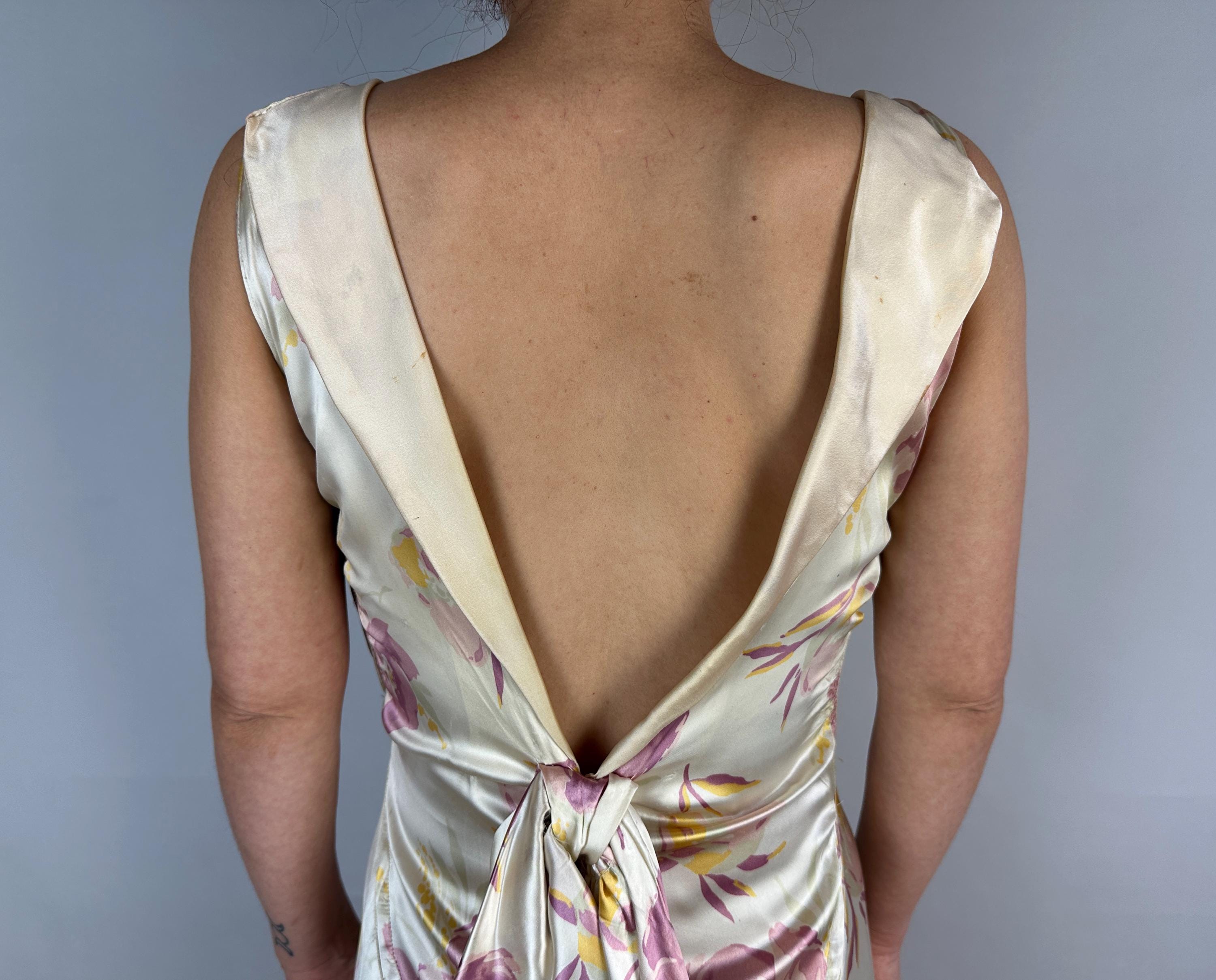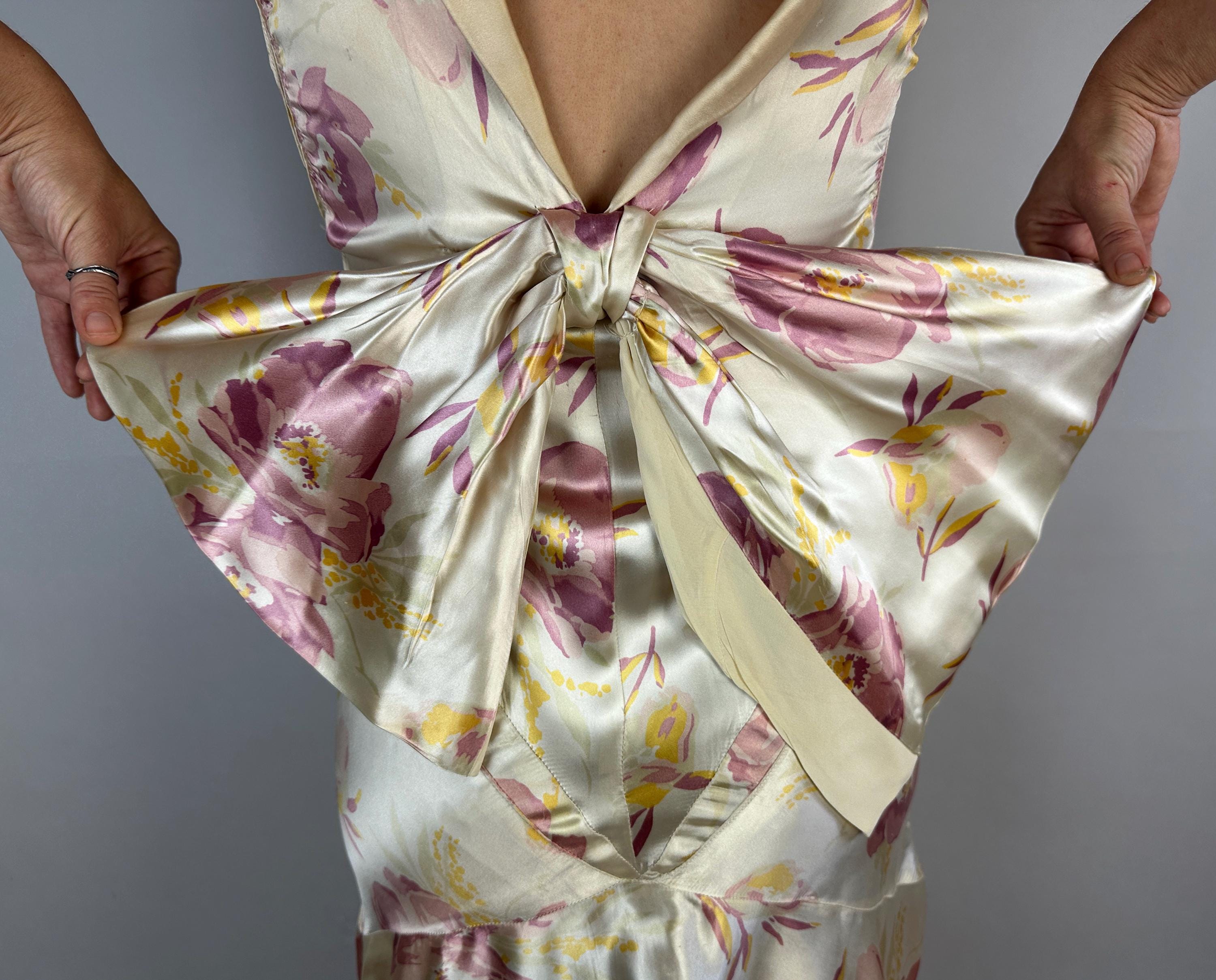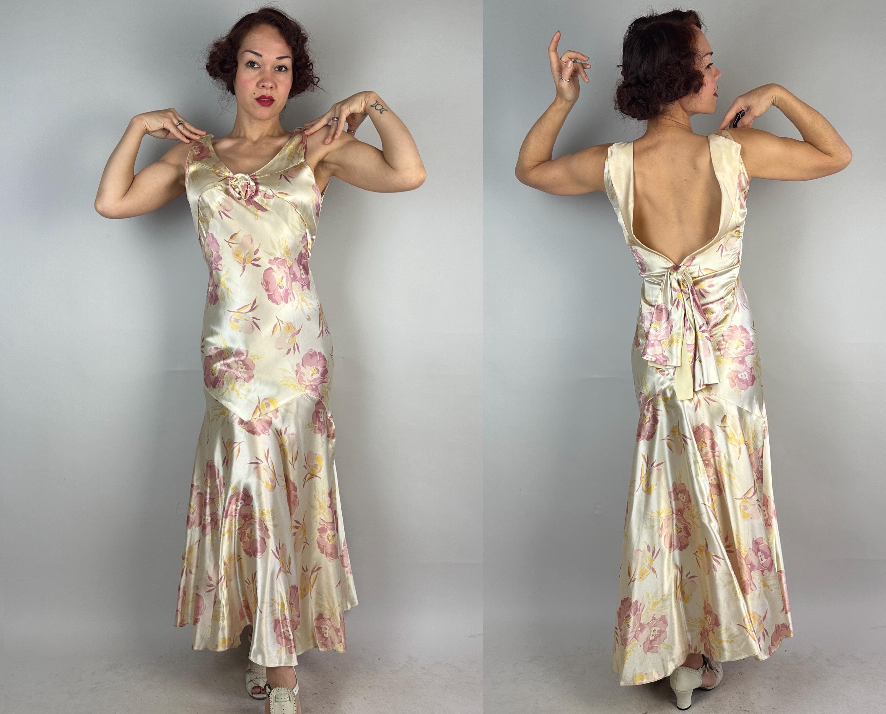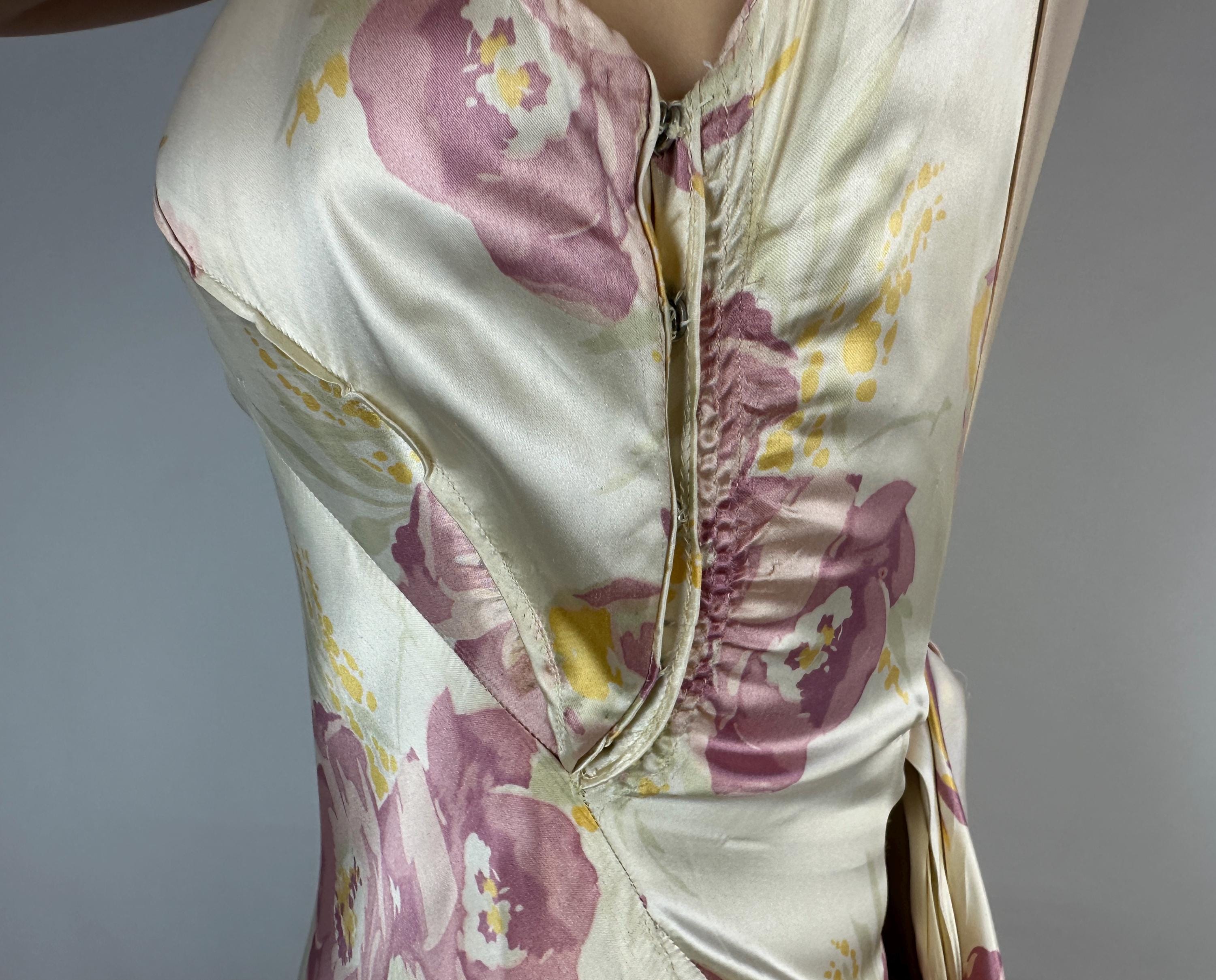 Like the first rose to bloom in the garden, you'll be a vision to behold in this 1930s gown! Sensuous silk satin in a bias cut makes a perfect match with the curve hugging drape spotlighting the gorgeous shimmer and sheen of the pearl white base. A gloriously feminine floral print in a watercolor style adds tones of orchid pink and marigold yellow. The wide V-neck is adorned with a fabric rosette with radiating pintuck seams extening over the bust and narrow ruching details the sides of the torso. The back plunges to an exaggerated bow and lapels flank the opening. Deco seamwork graces the skirt with a stunning mermaid tail drape to the hem. Snaps on the side. This dress is in great vintage condition, with a few very minor/small fabric imperfections.
