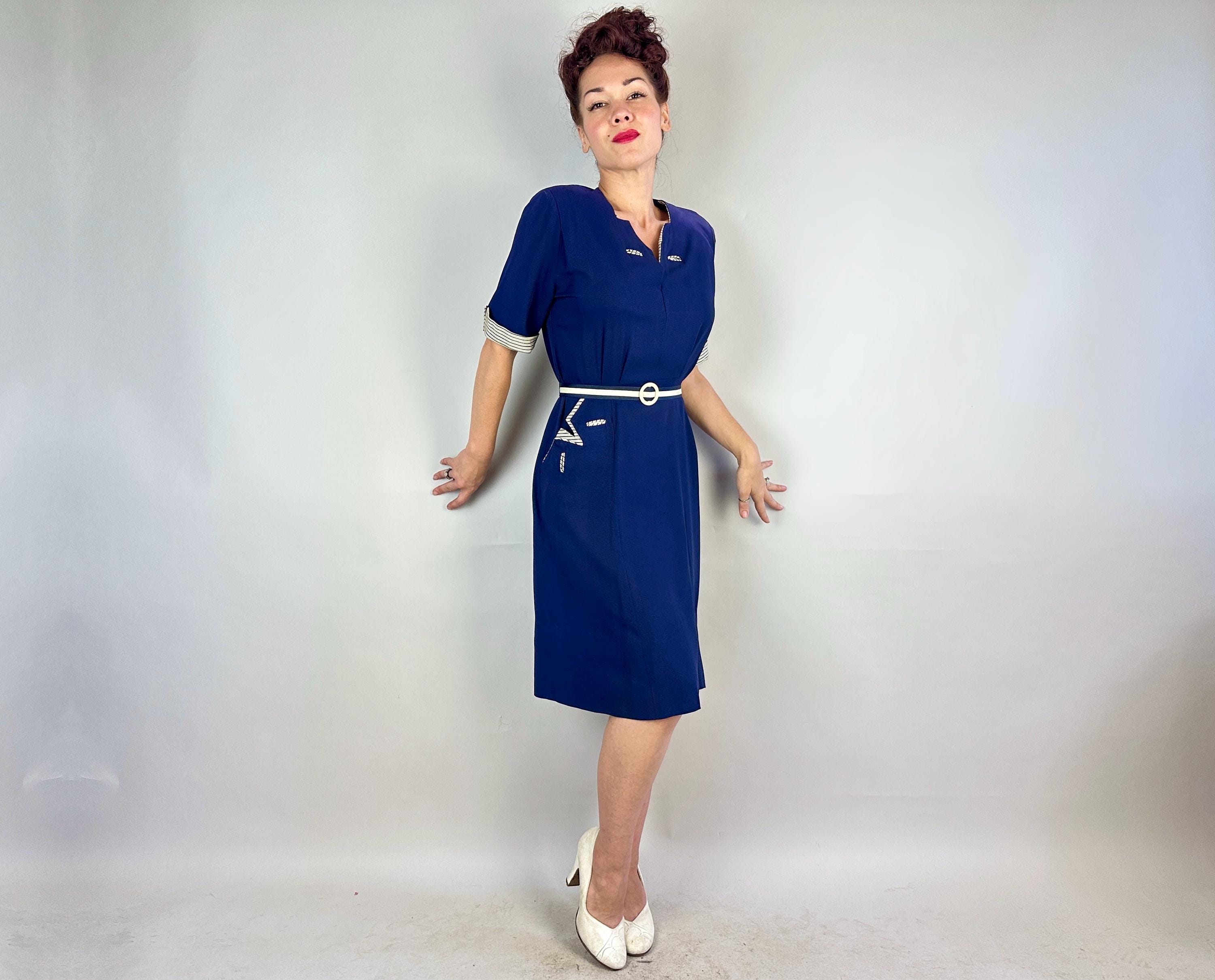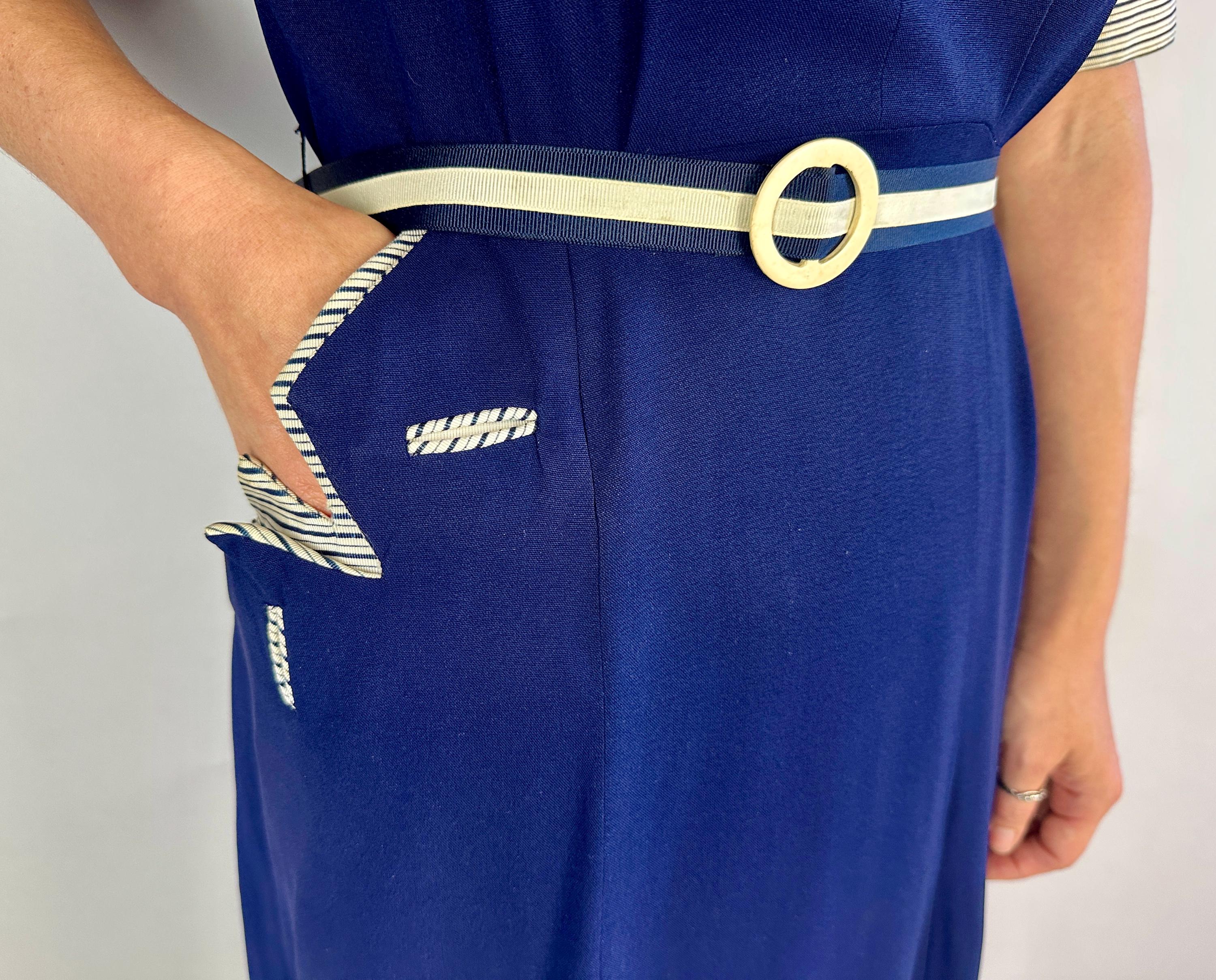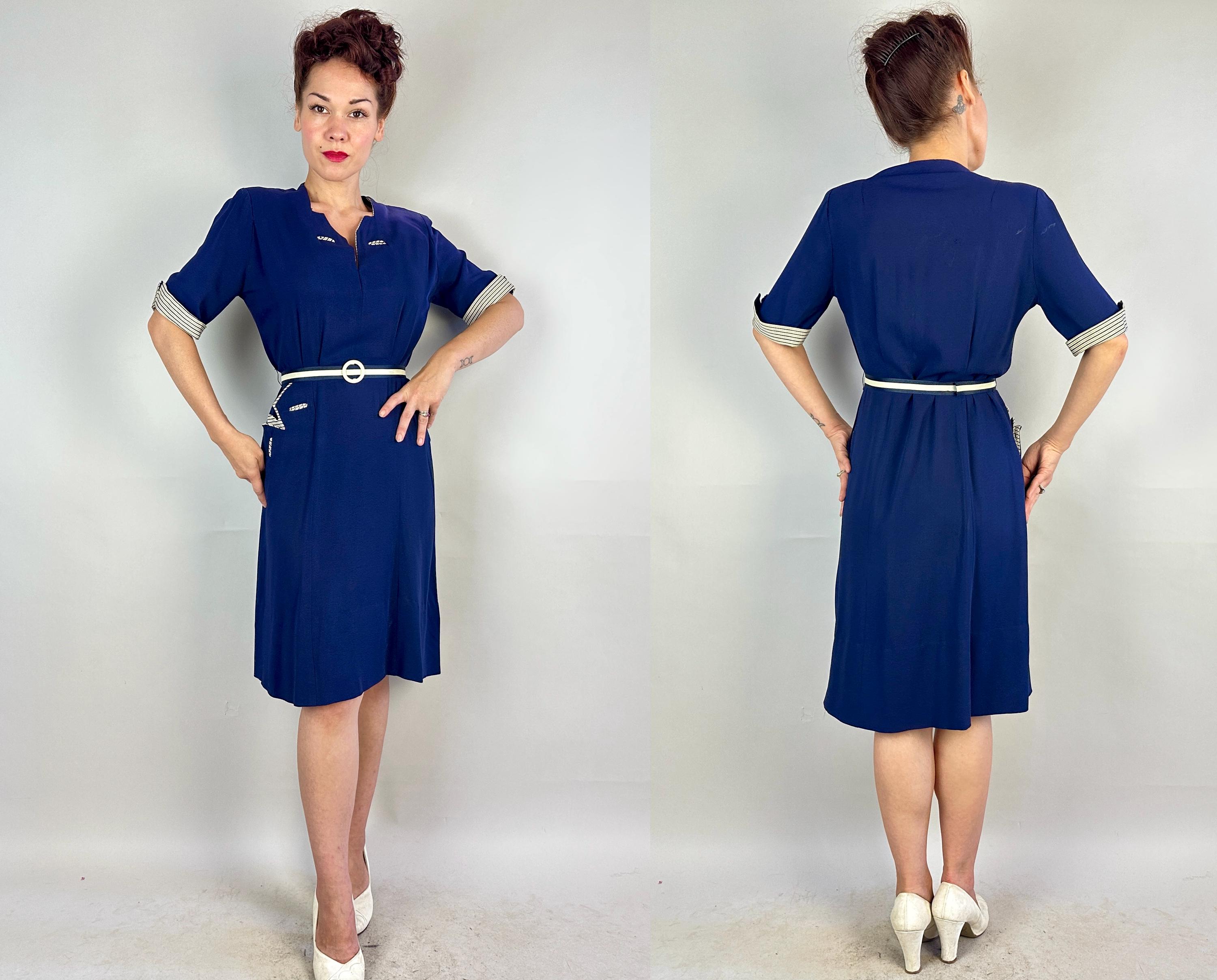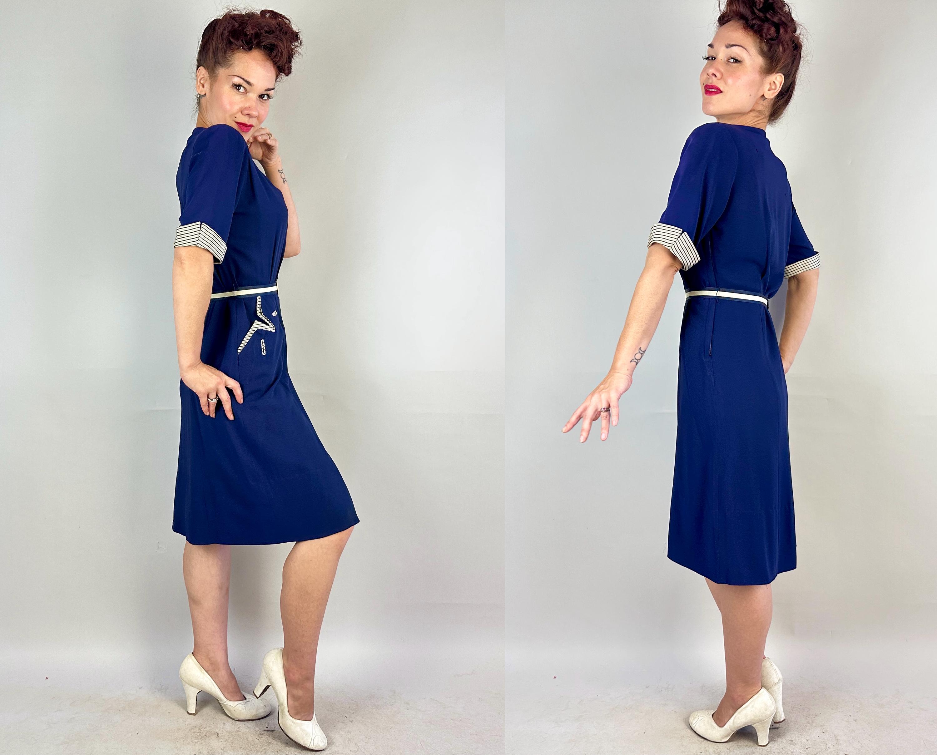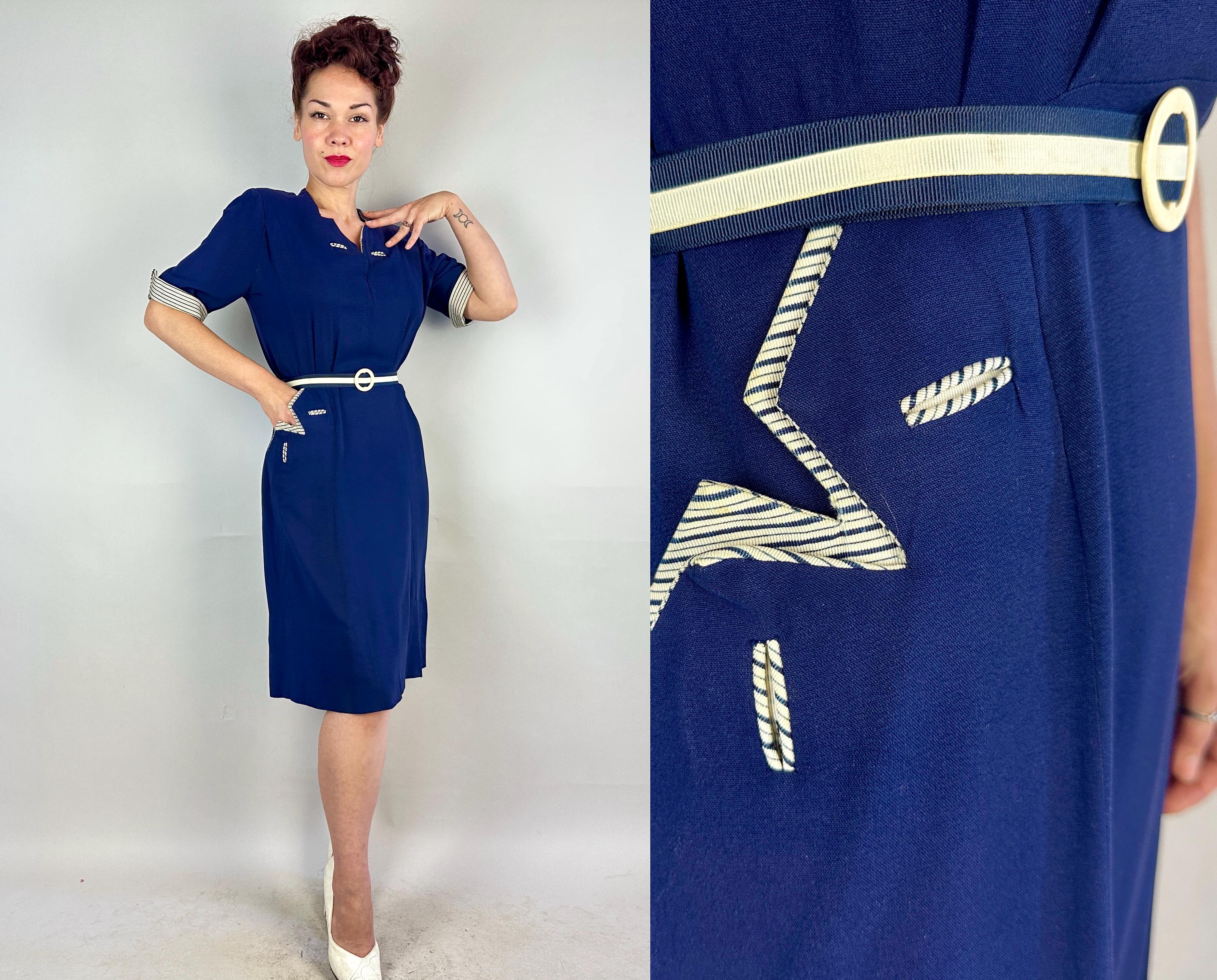 Accentuate the positive with the positively clever accents on this 1940s dress! Mainly comprised of navy blue rayon, touches of two tone come from grosgrain banding of white with navy blue stripes in varying widths which you'll find it lining the bodice so that it shows on the edges, trimming the faux button holes, turned up cuffs, and making a double layered slanted hip pocket. Deep triangular notches link a theme from the neckline, cufss, and to the pocket. Padded shoulders and a two tone slide belt make for good form. Metal zipper on the side. This dress is in good vintage condition, typical fade at the shoulders but no holes, stains, or odors to note.