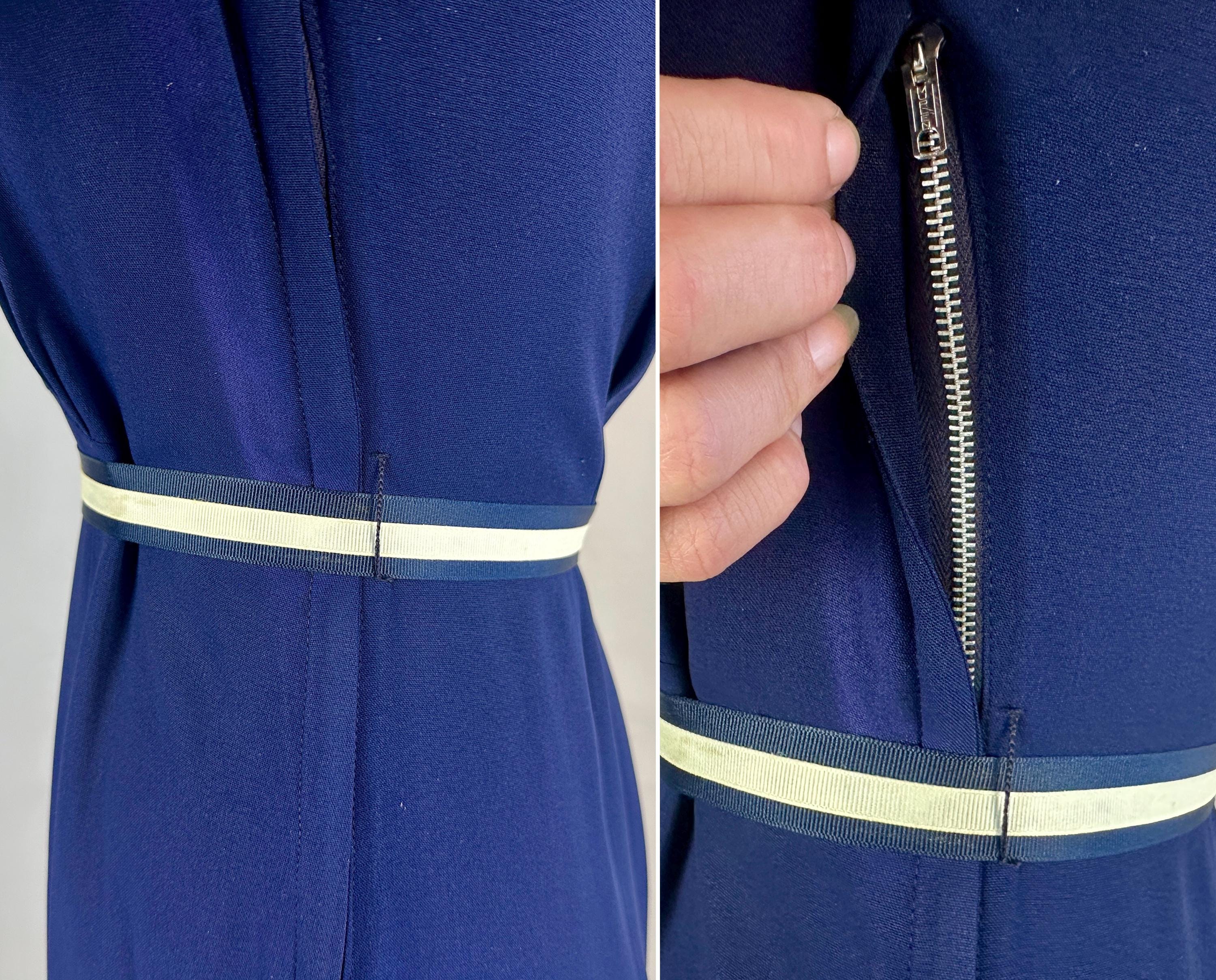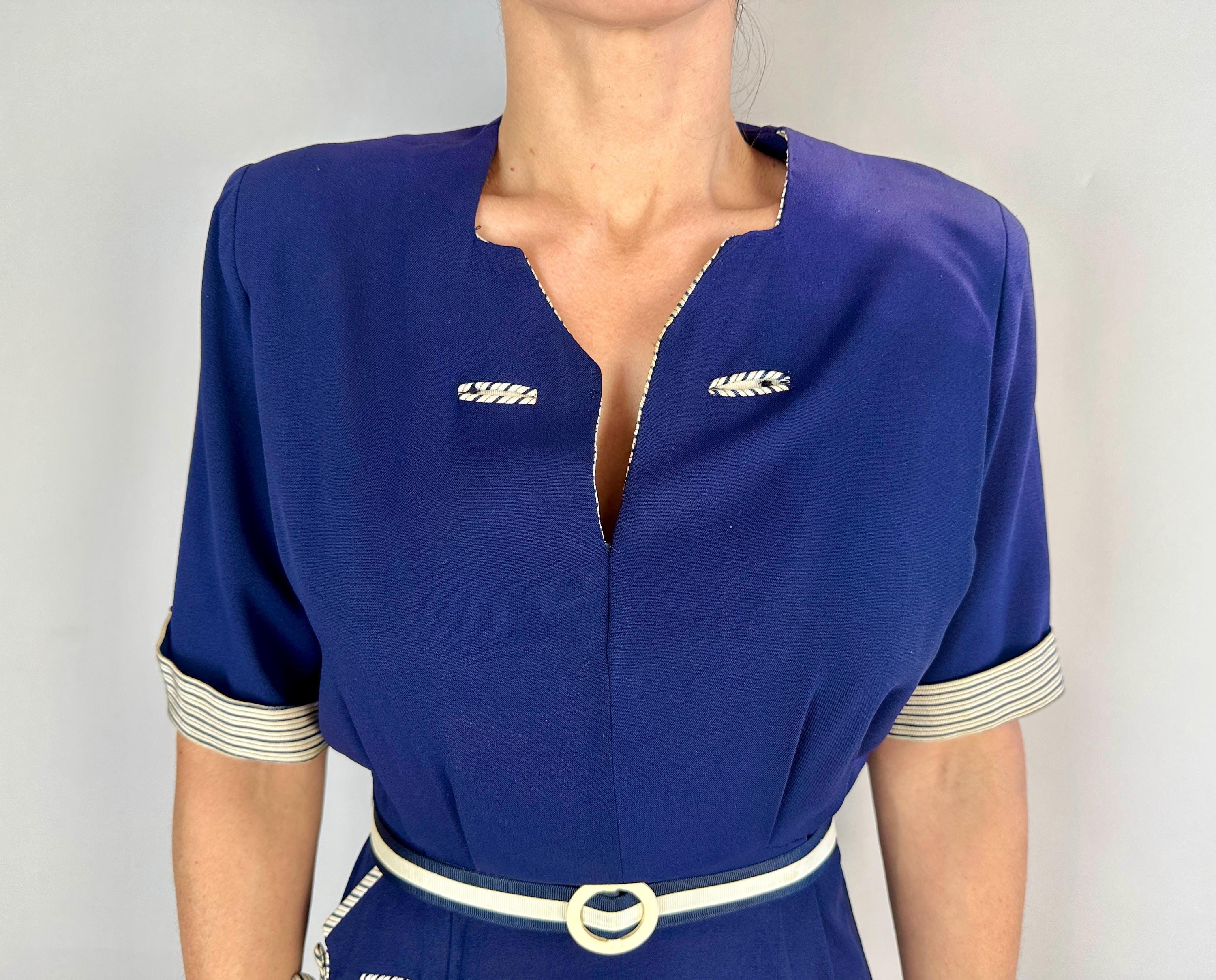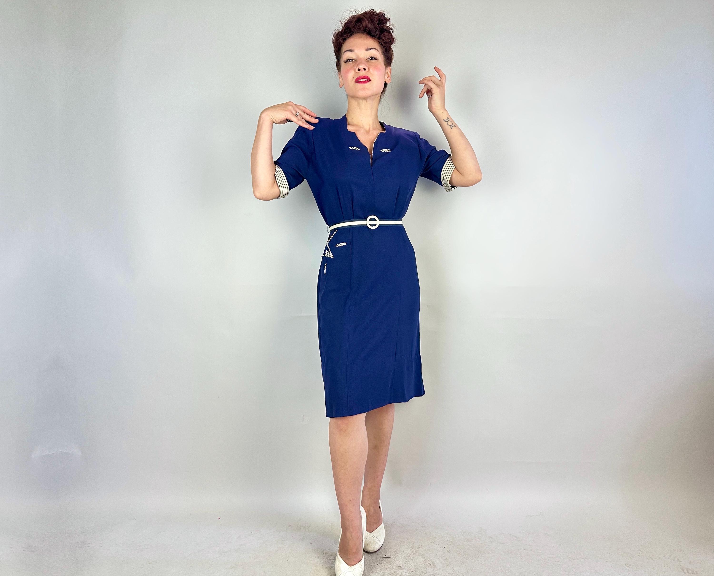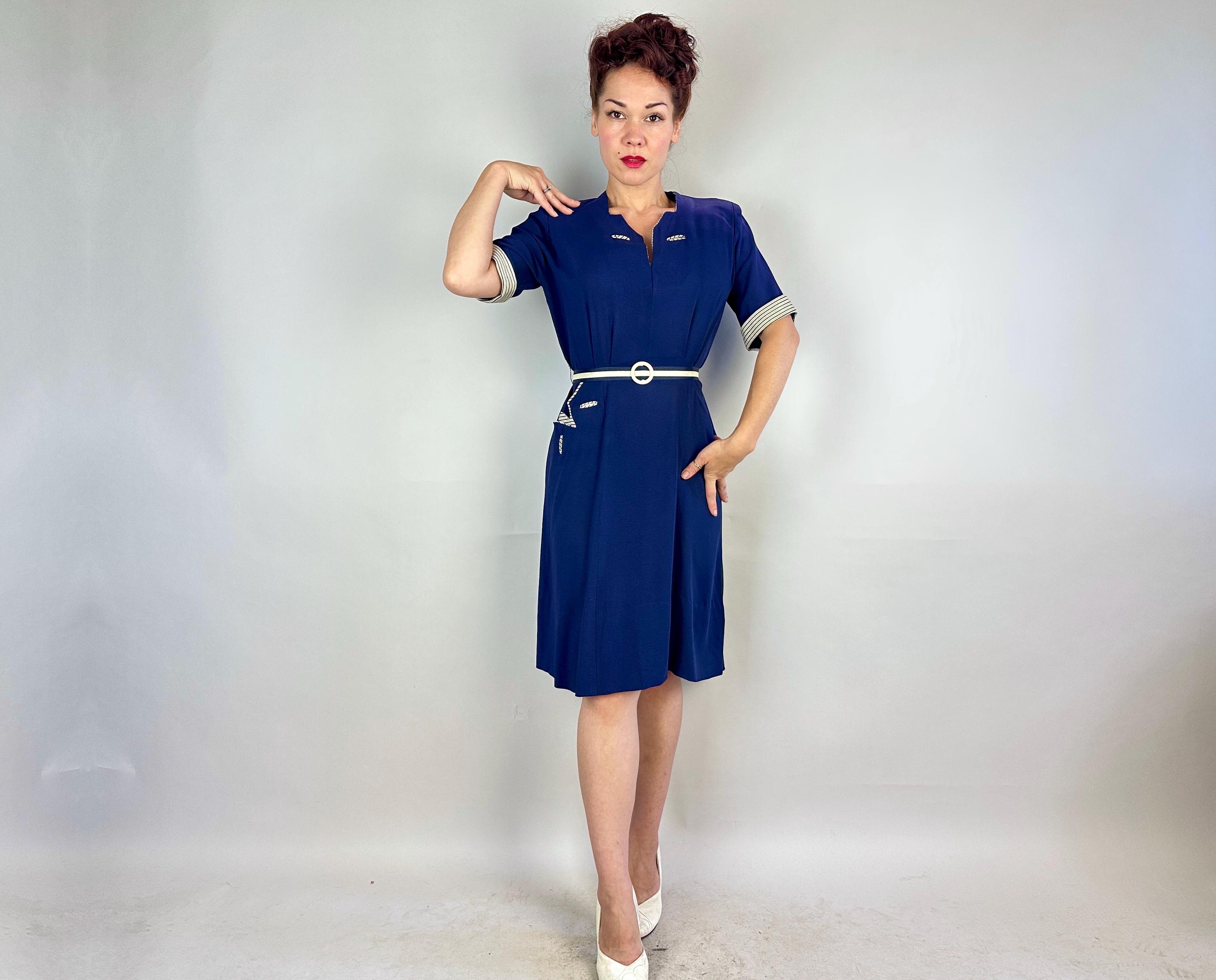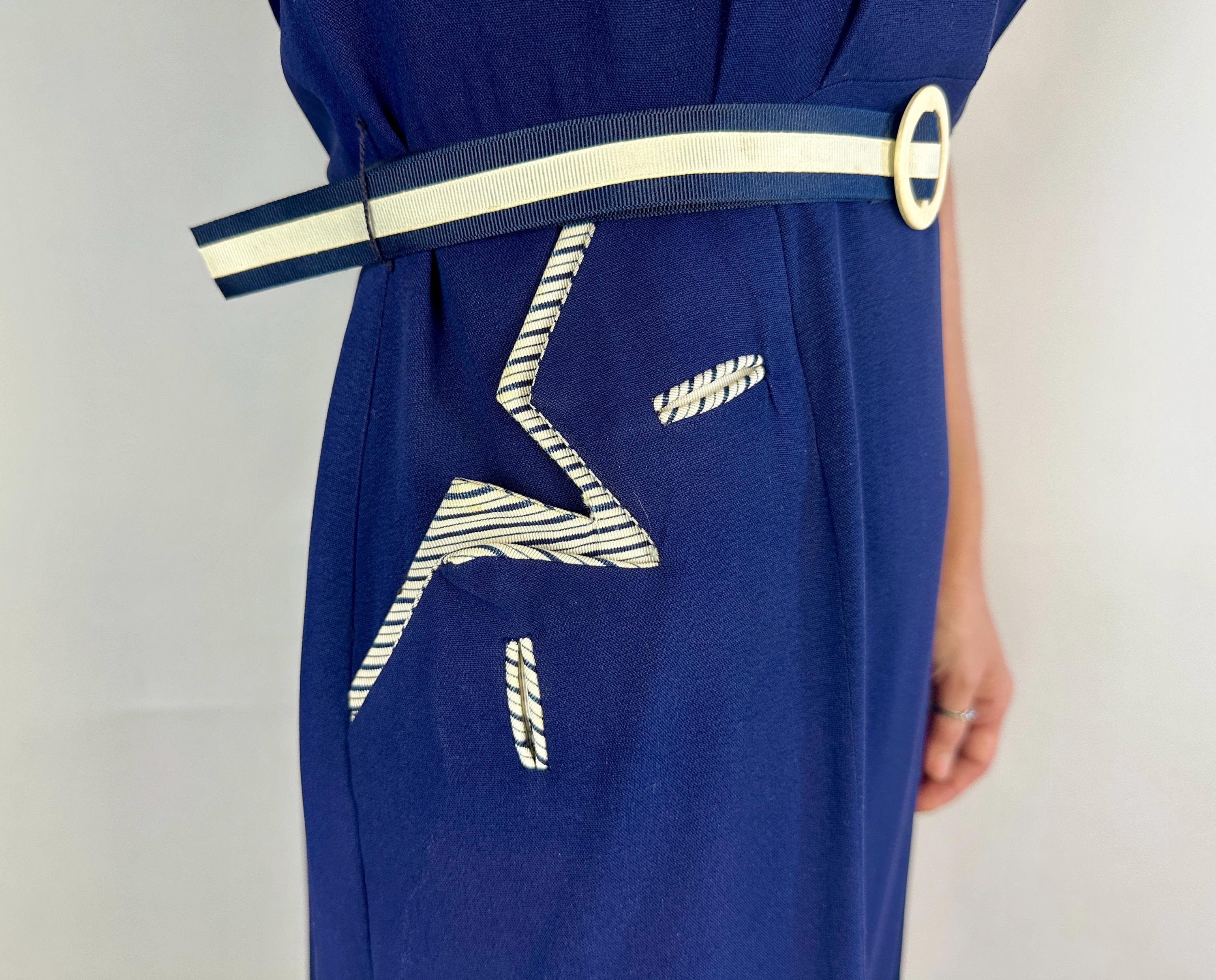 Accentuate the positive with the positively clever accents on this 1940s dress! Mainly comprised of navy blue rayon, touches of two tone come from grosgrain banding of white with navy blue stripes in varying widths which you'll find it lining the bodice so that it shows on the edges, trimming the faux button holes, turned up cuffs, and making a double layered slanted hip pocket. Deep triangular notches link a theme from the neckline, cufss, and to the pocket. Padded shoulders and a two tone slide belt make for good form. Metal zipper on the side. This dress is in good vintage condition, typical fade at the shoulders but no holes, stains, or odors to note.