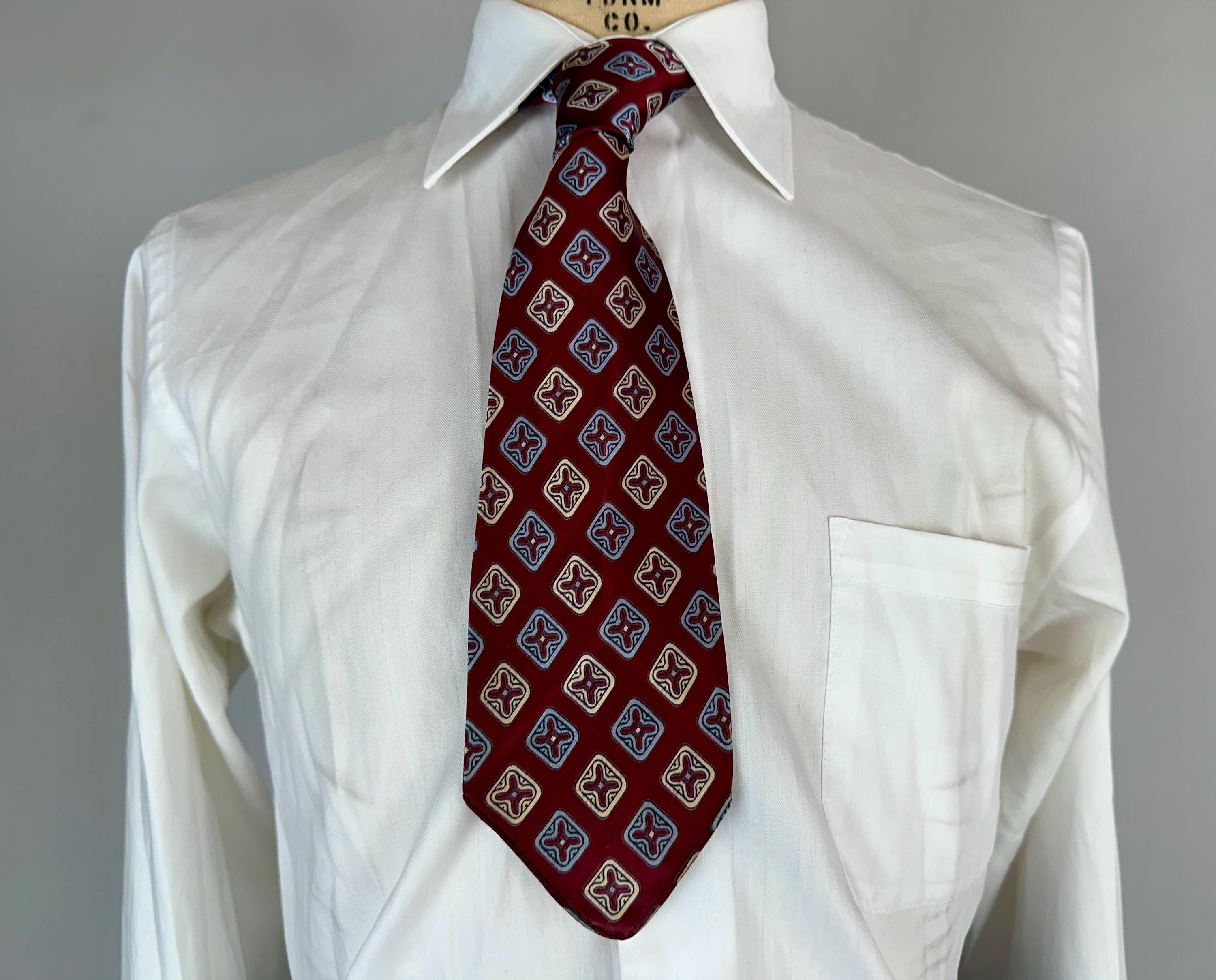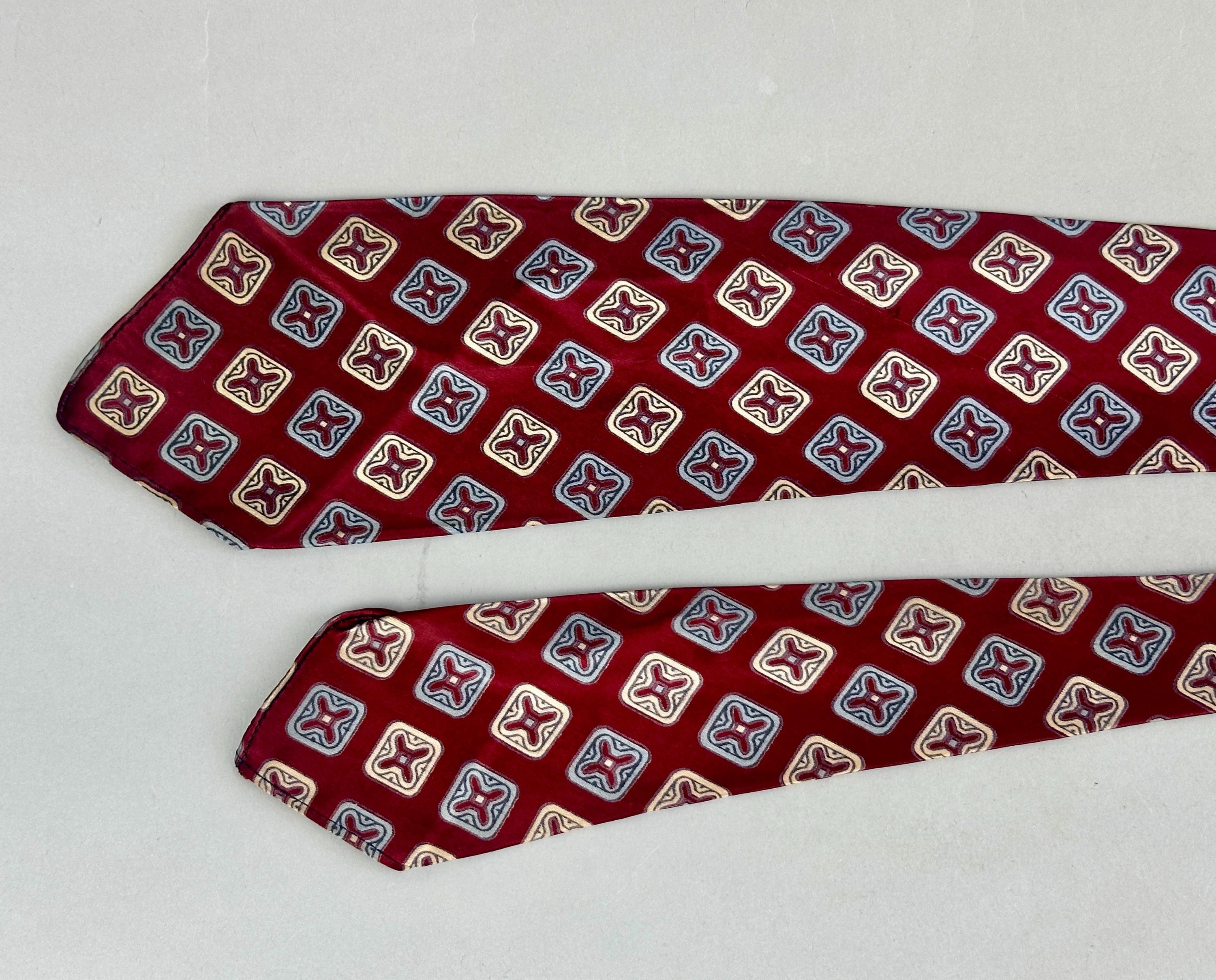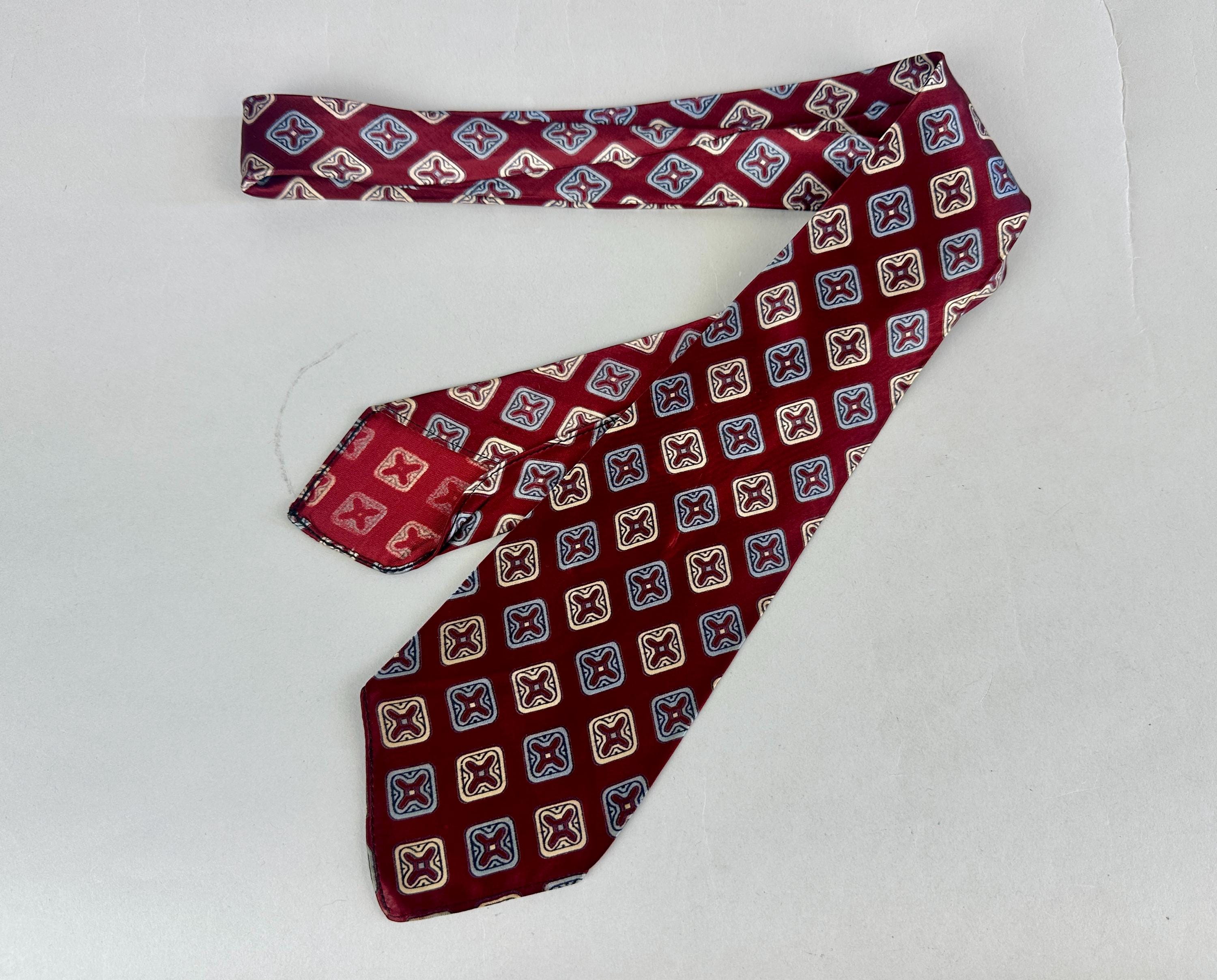 Like sunlight through a stained glass window, you'll look glorious in this 1930s necktie! Shimmering silk in ox blood red is printed with crosses in diamonds of white and cornflower blue looking like leaded stained glass windows. Unlined. Pairs well with a wide variety of Art Deco and Mid-Century suit colors and fabric types. This tie is in great vintage condition with no flaws found!
