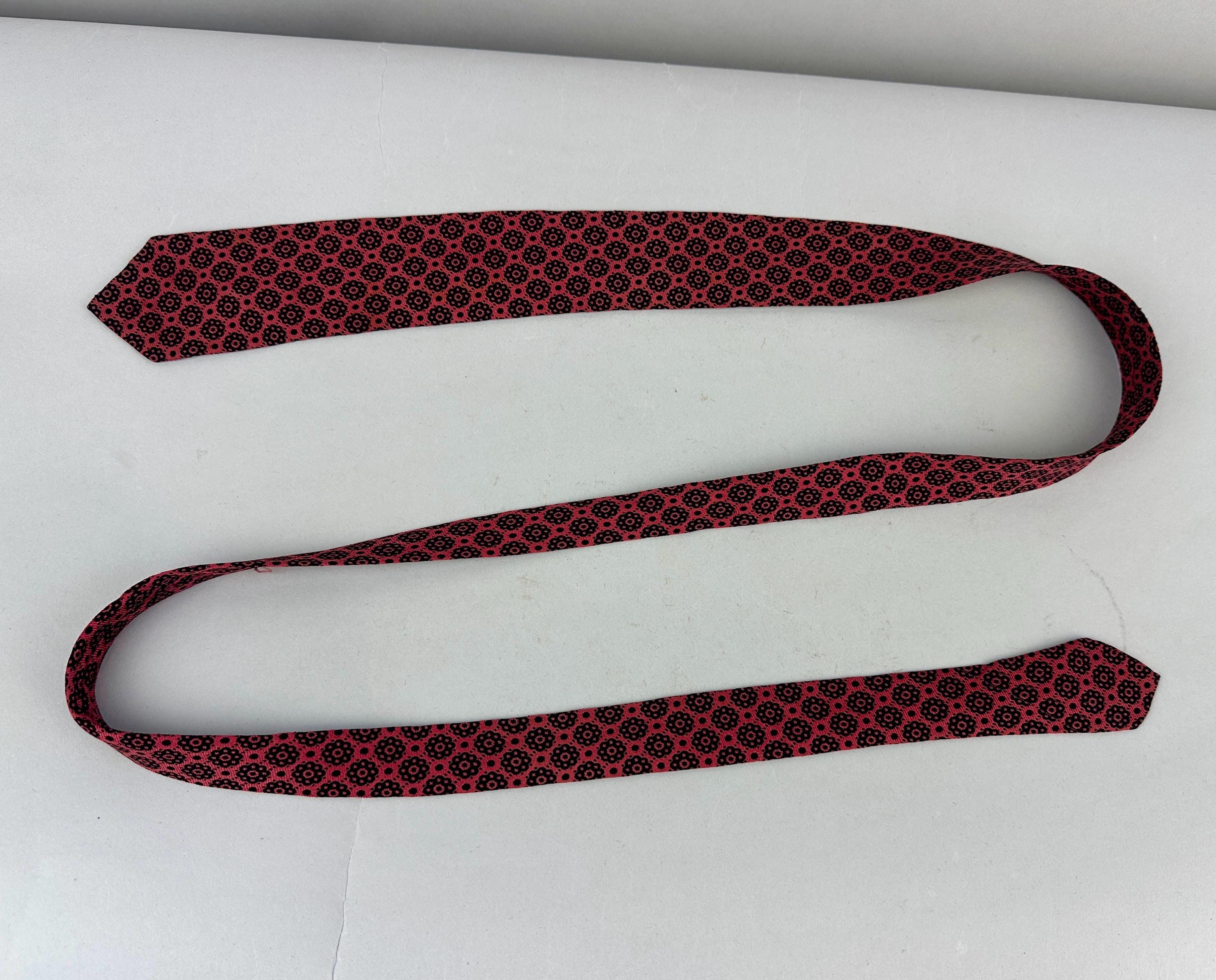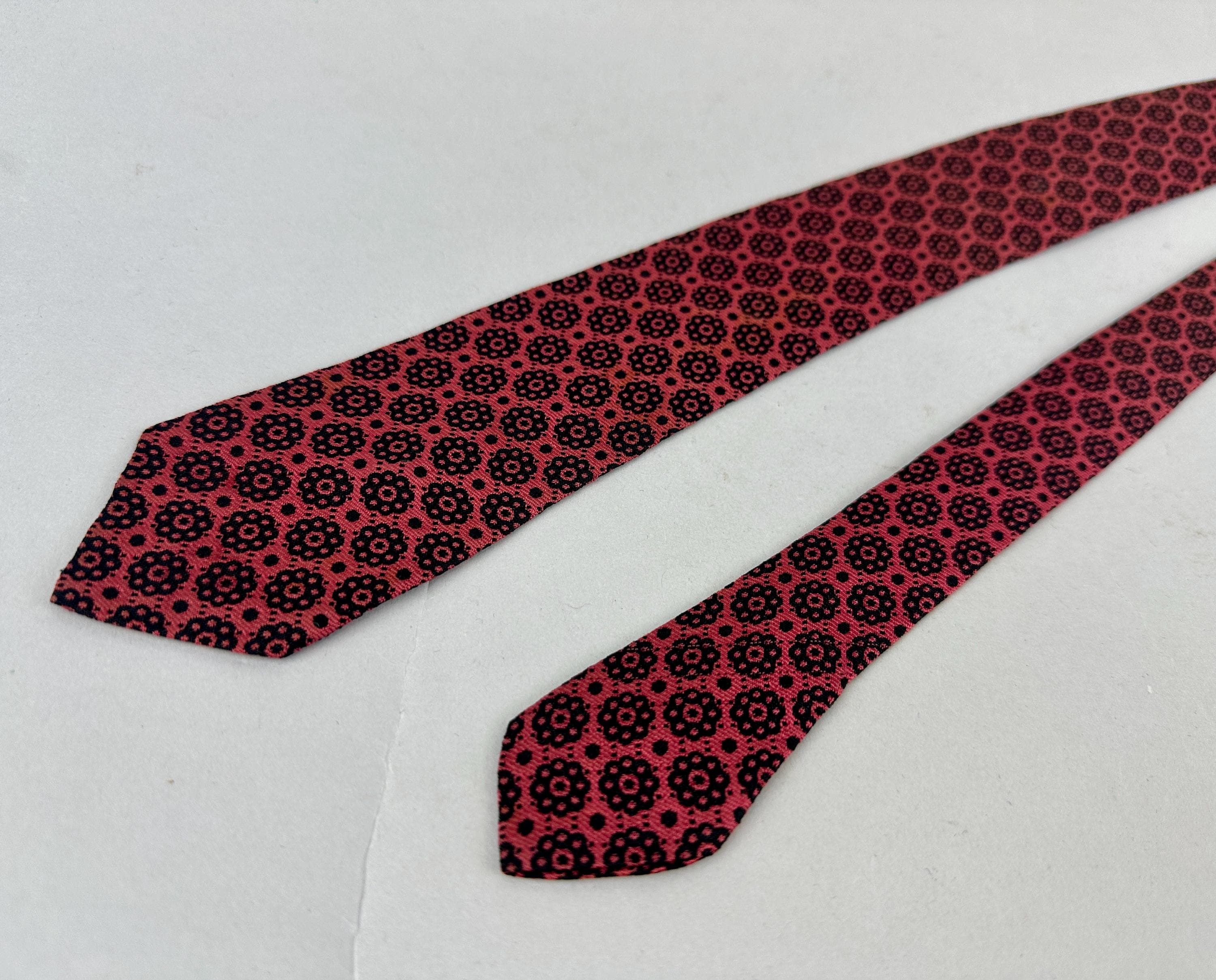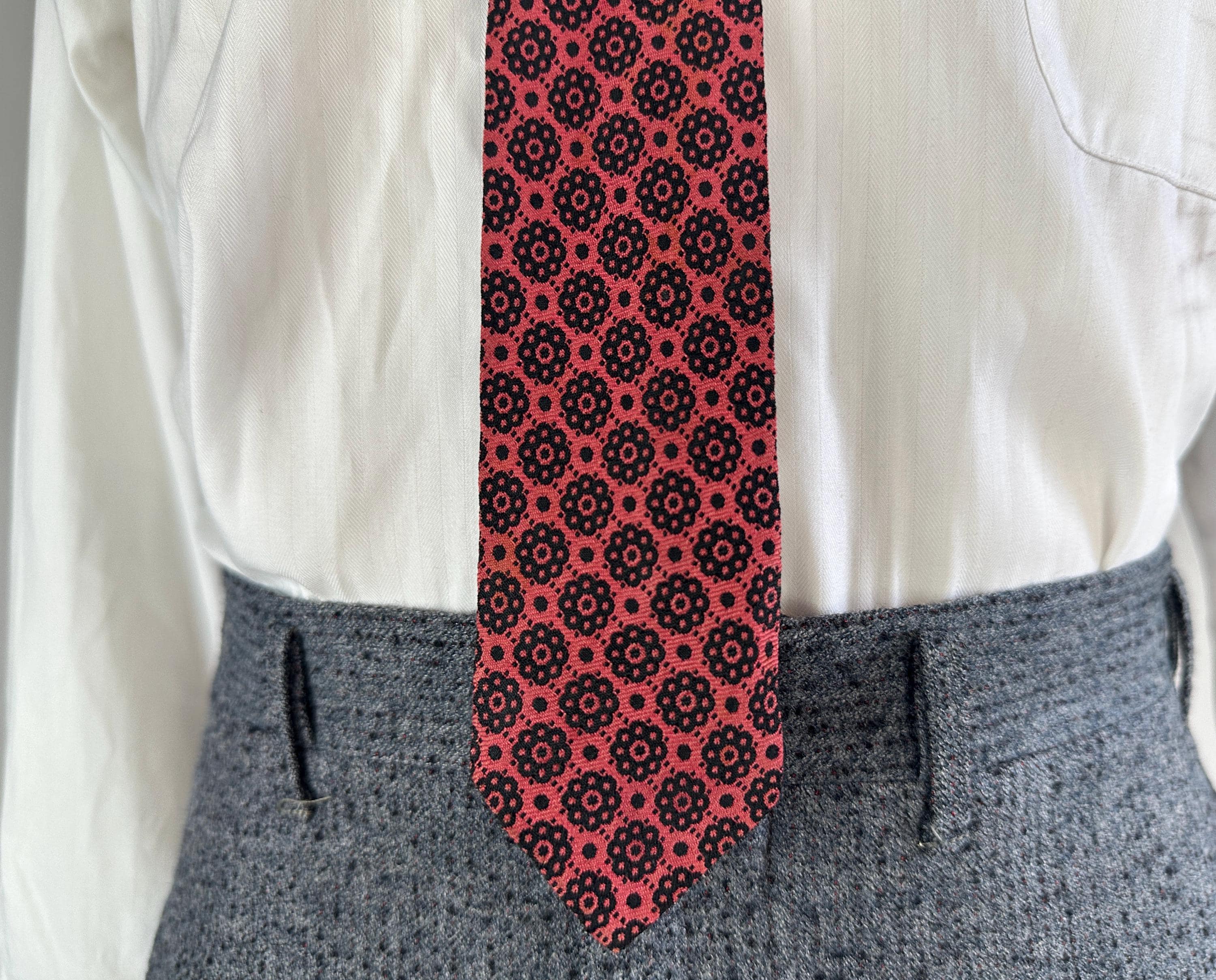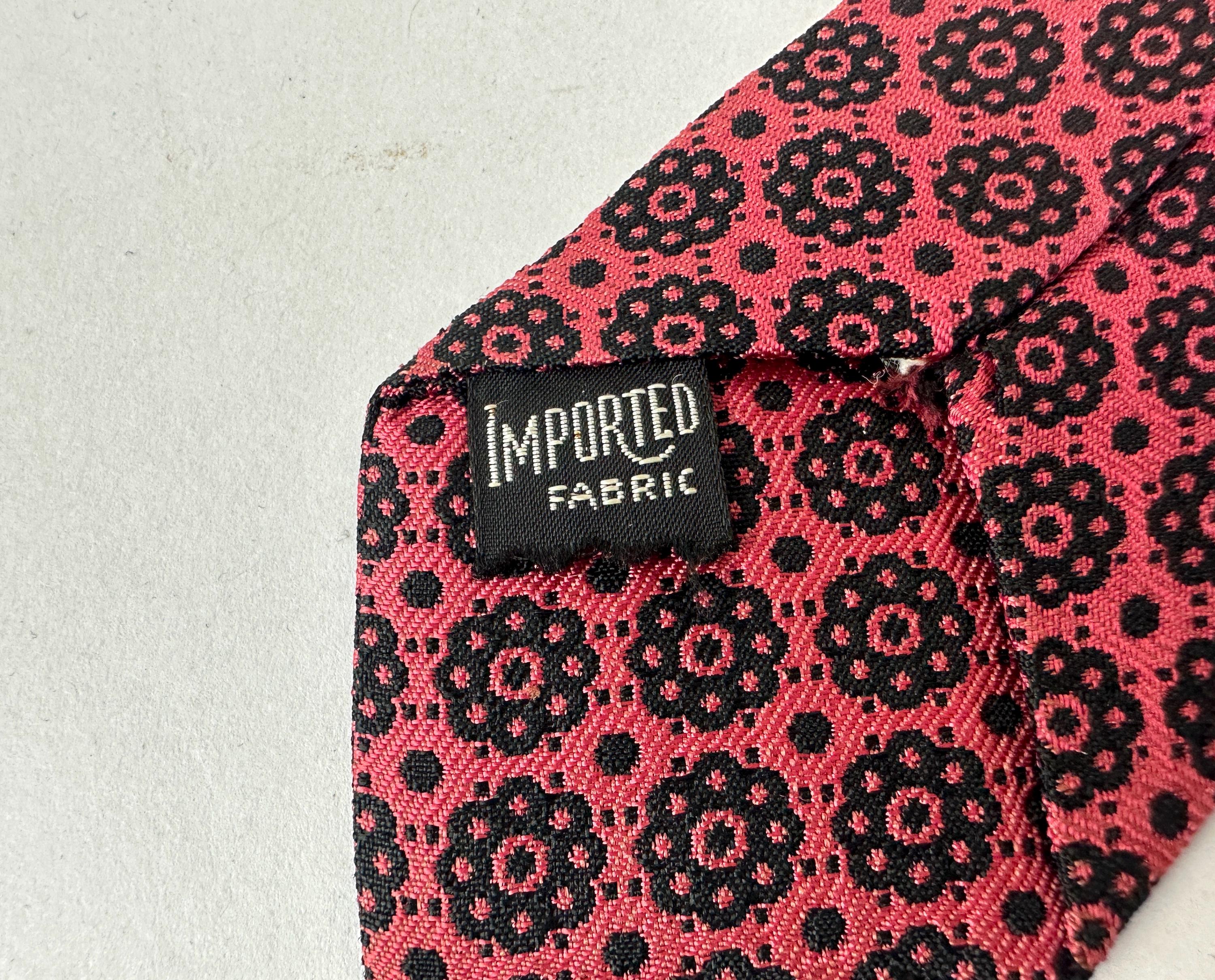 This 1950s necktie will put a spring in your step! A silk damask in grapefruit pink has a dense pattern of black blossoms and spots. Unlined and marked "Imported Fabric". Pairs well with a wide variety of Art Deco and Mid-Century suit colors and fabric types. This tie is in great vintage condition, with no flaws found!