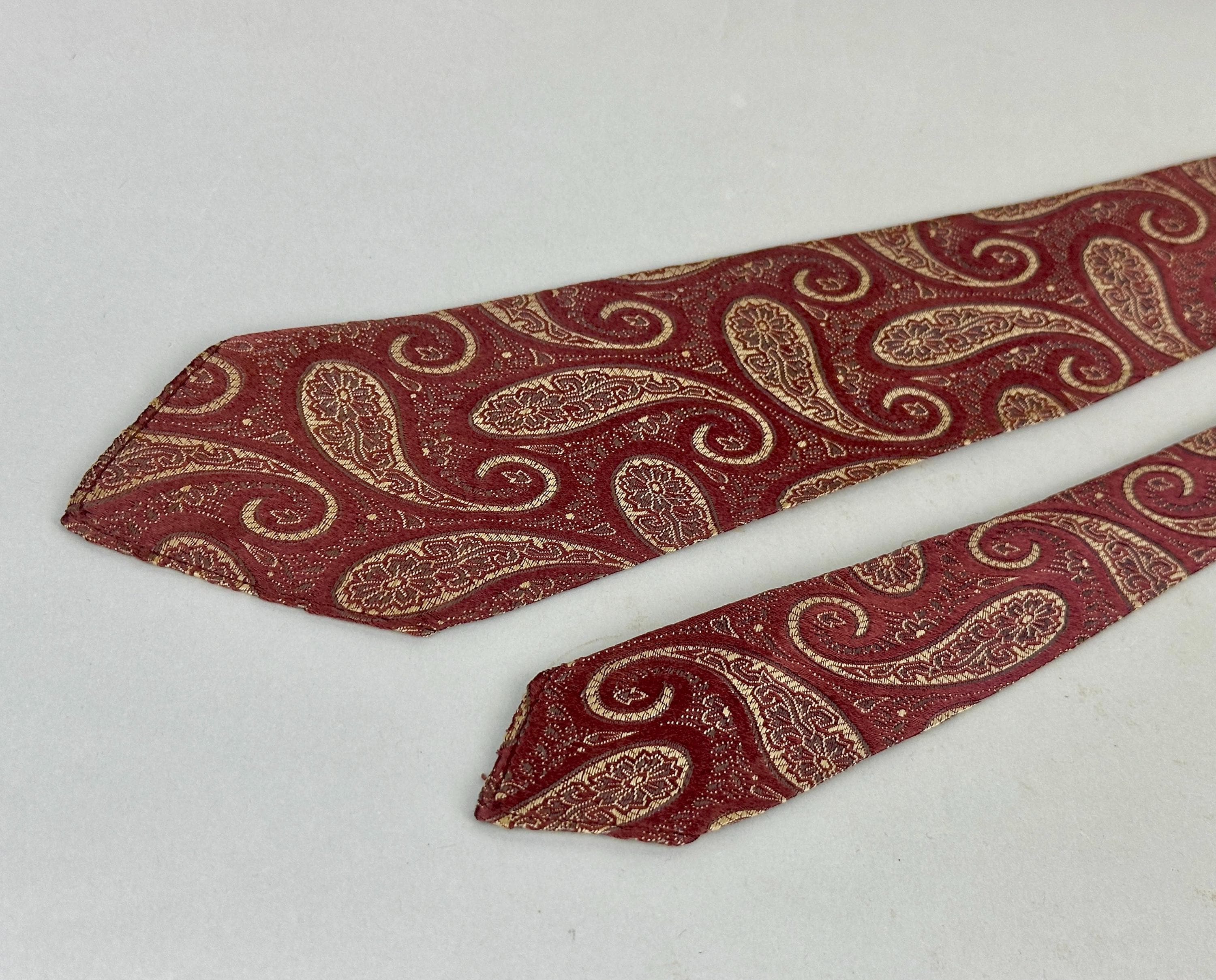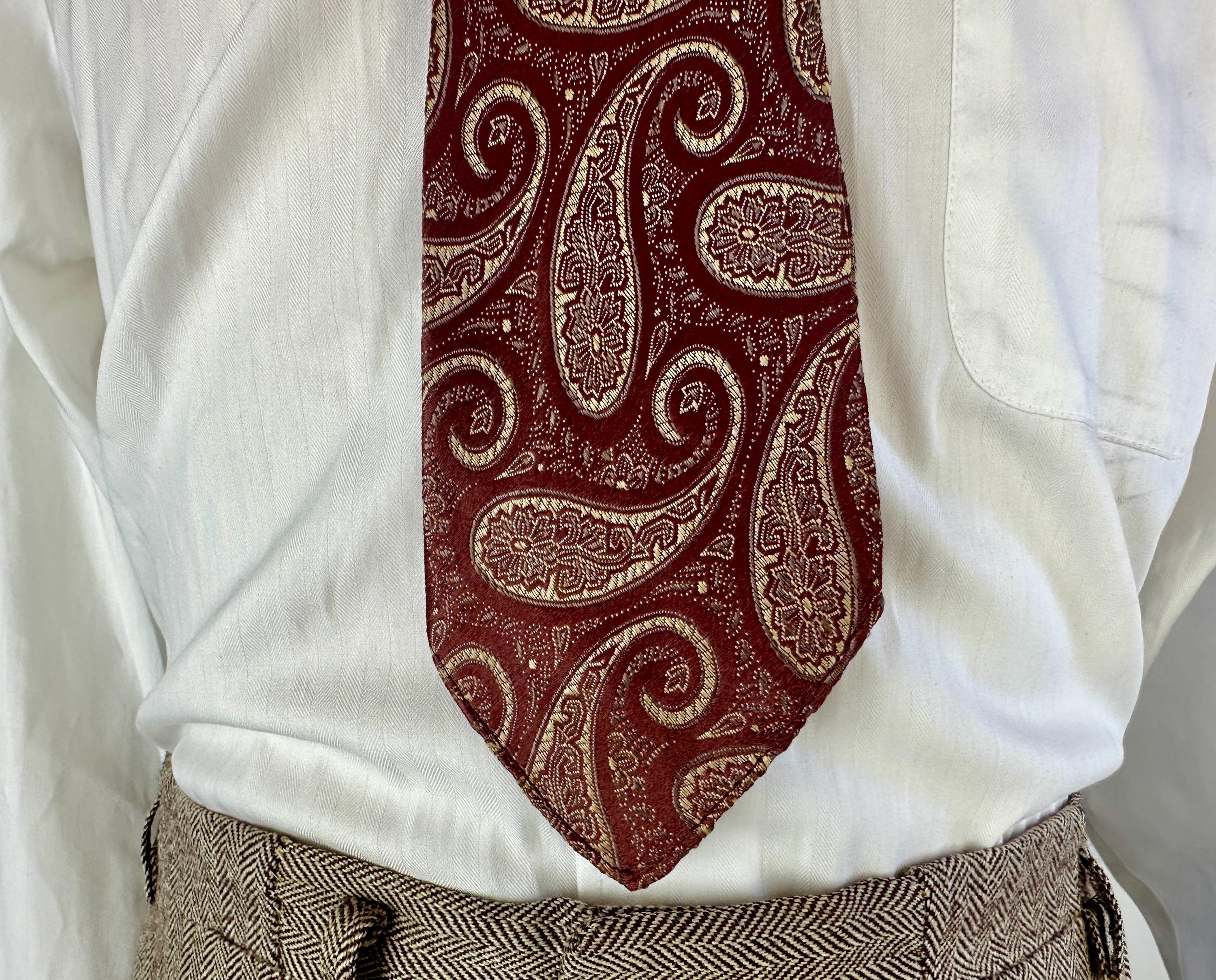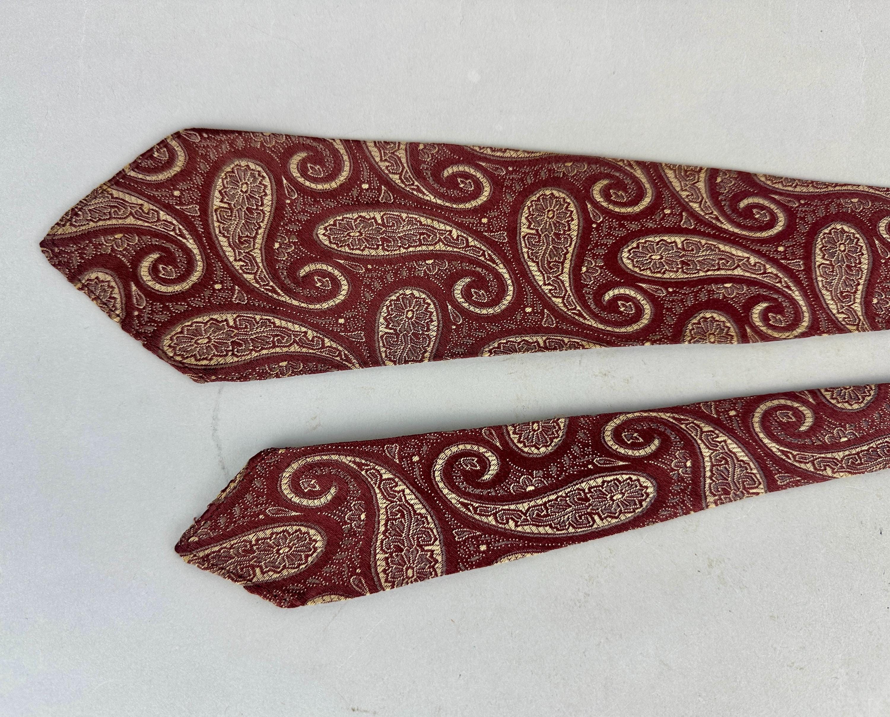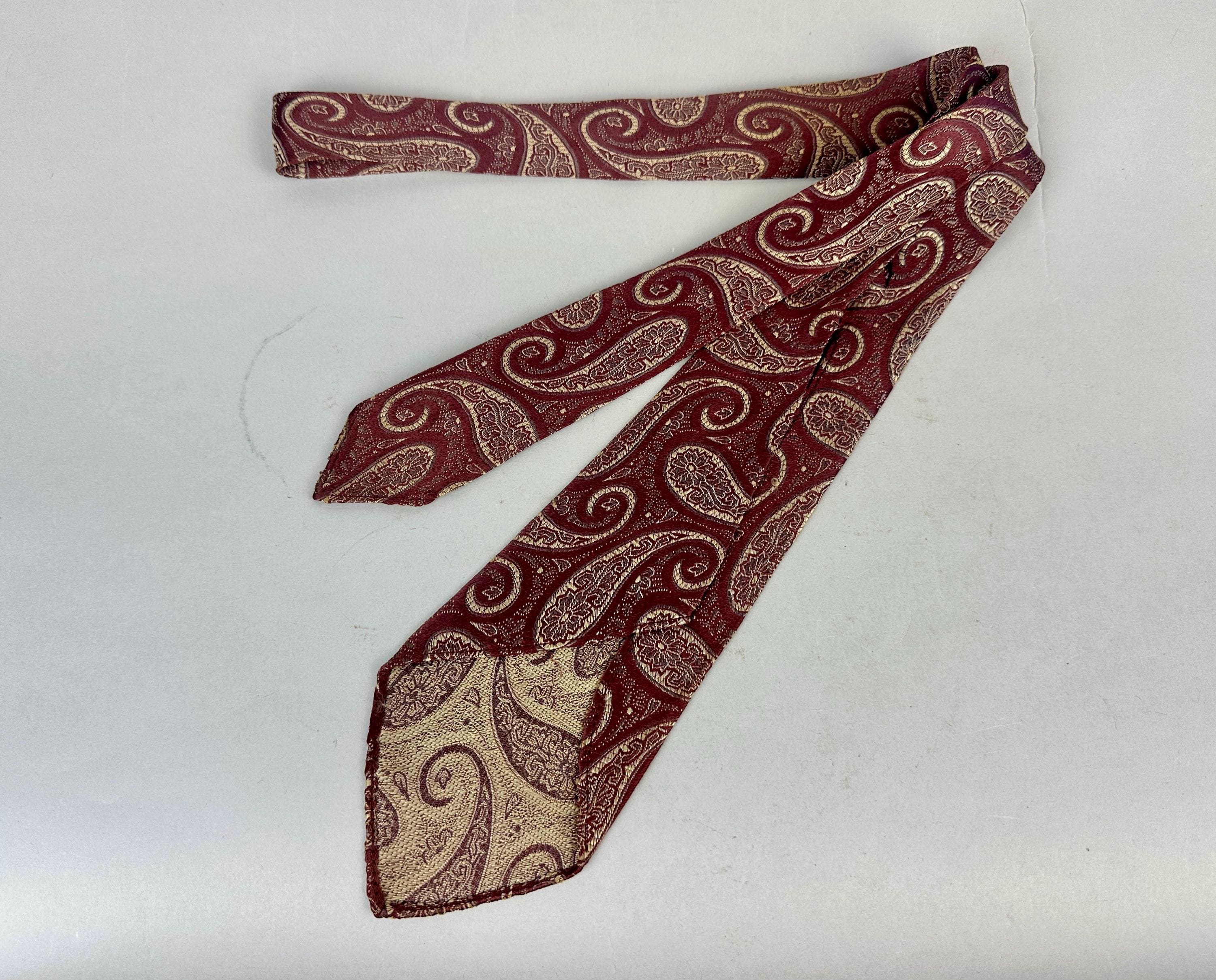 Dance and twirl in this playful 1930s necktie! Maroon red silk brocade with cream paisley swirls throughout. Unlined, by Arrow. Pairs well with a wide variety of Art Deco and Mid-Century suit colors and fabric types. This tie is in excellent vintage condition with no flaws found!
