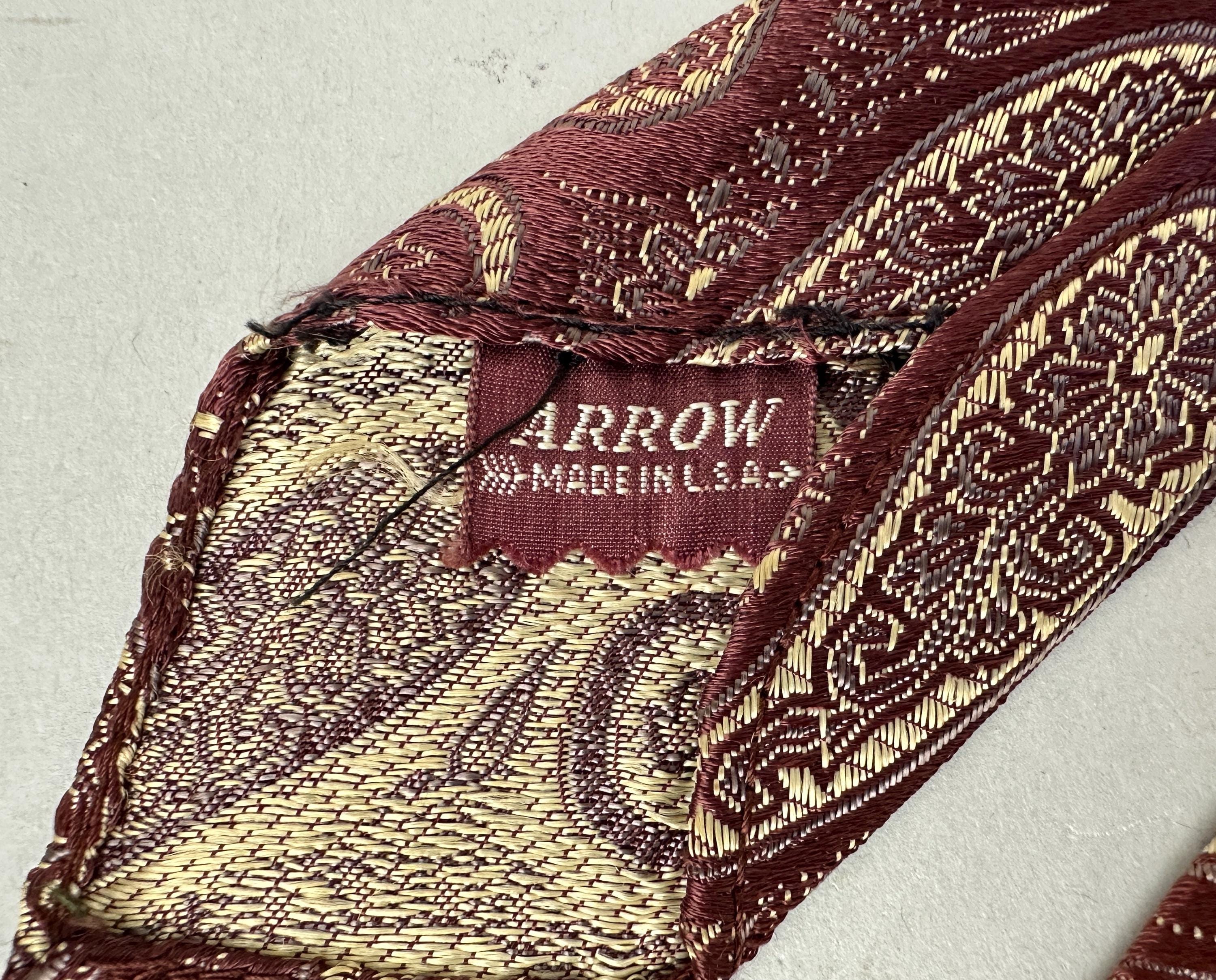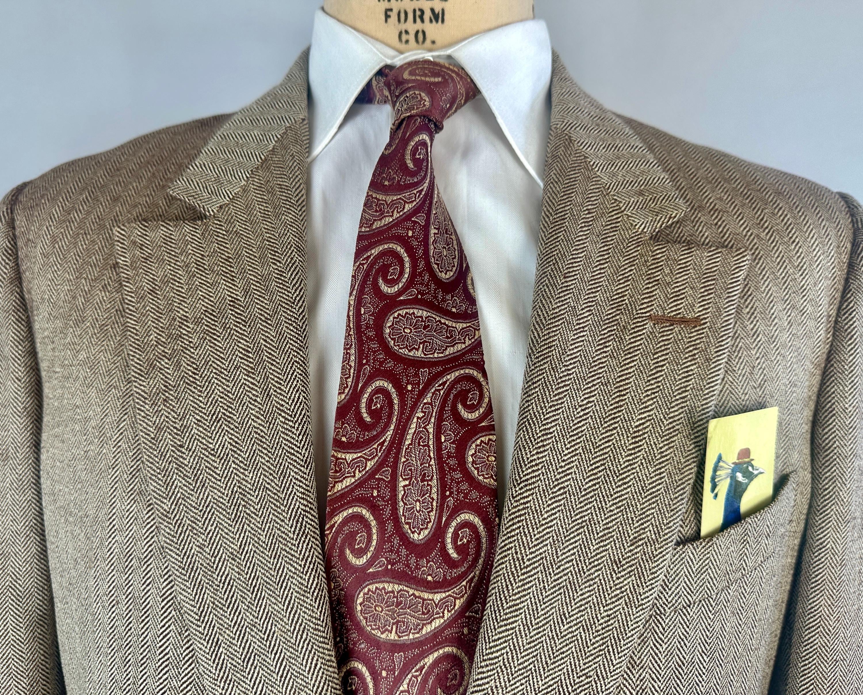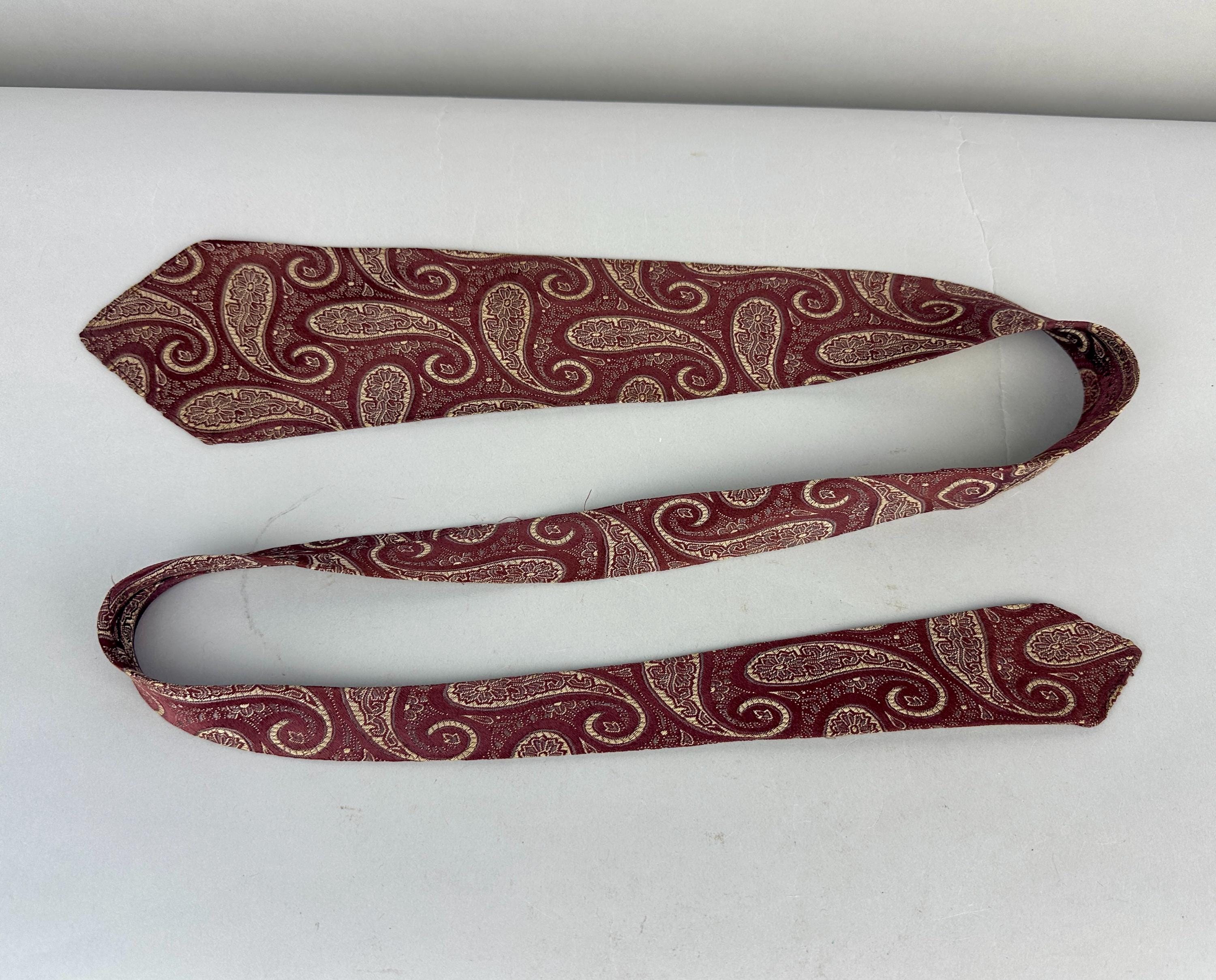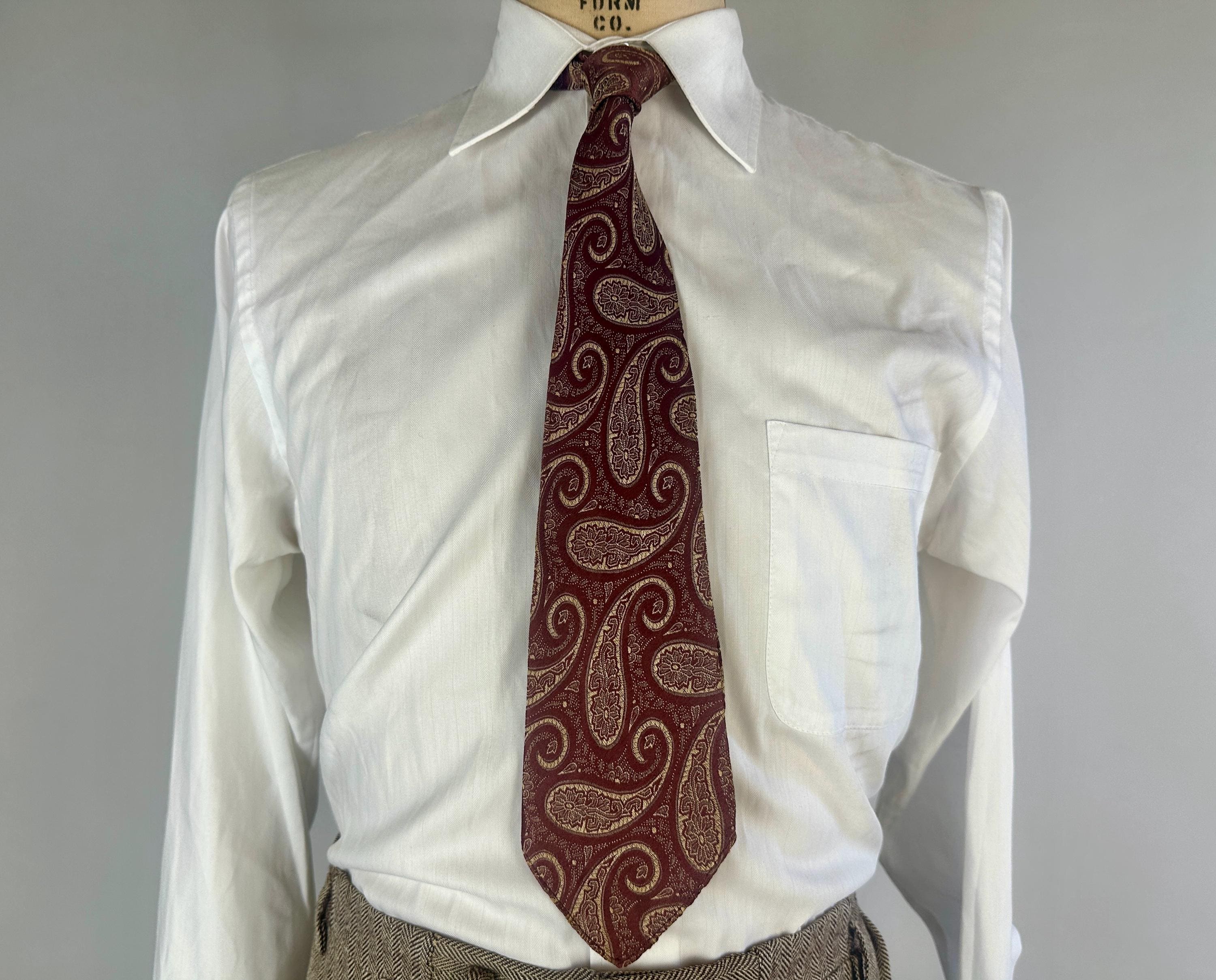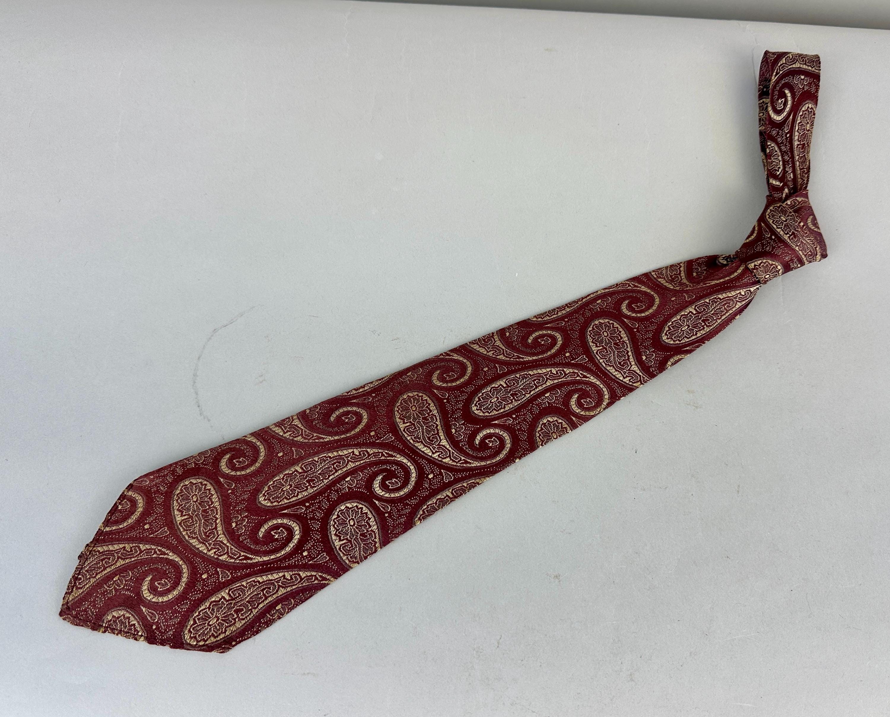 Dance and twirl in this playful 1930s necktie! Maroon red silk brocade with cream paisley swirls throughout. Unlined, by Arrow. Pairs well with a wide variety of Art Deco and Mid-Century suit colors and fabric types. This tie is in excellent vintage condition with no flaws found!