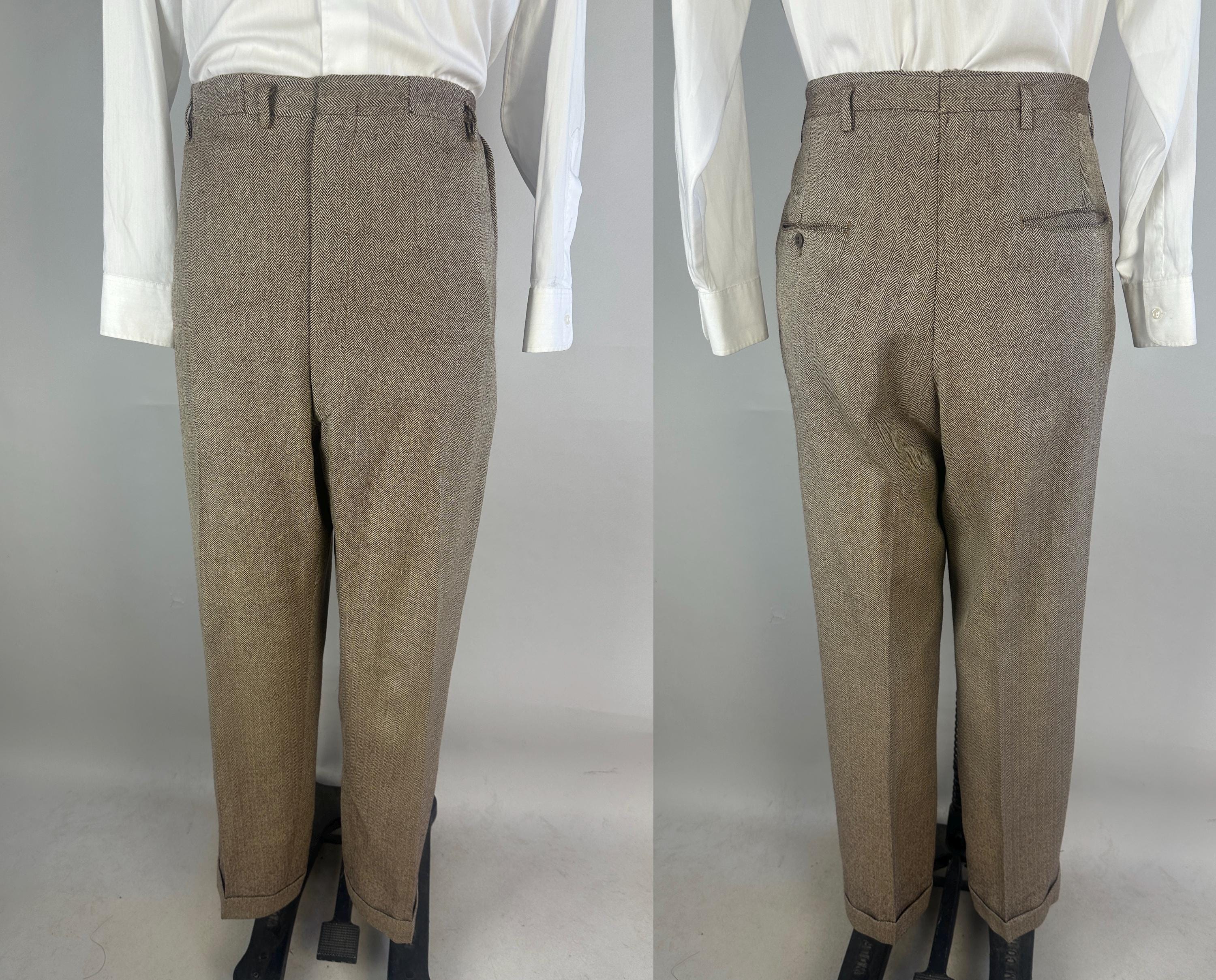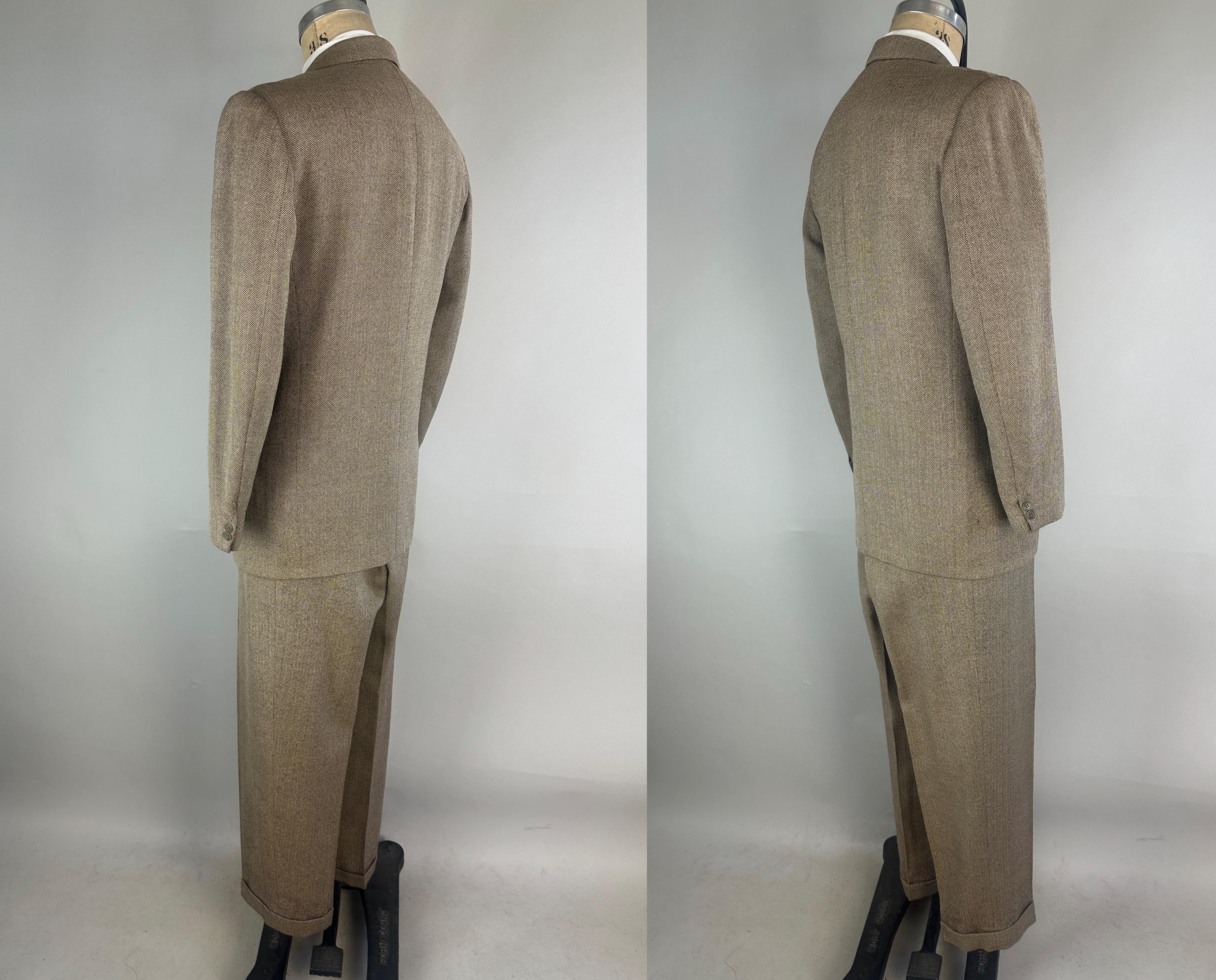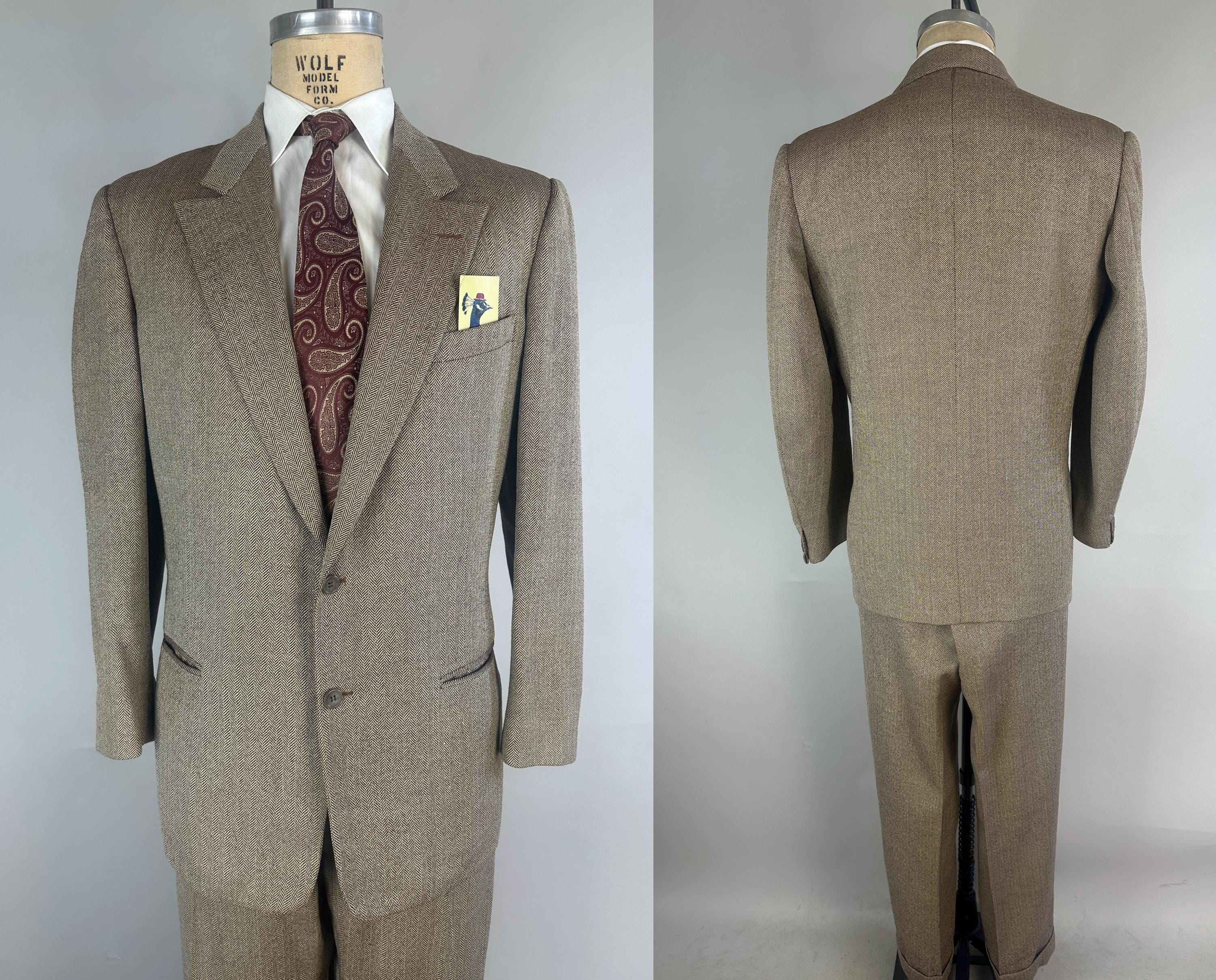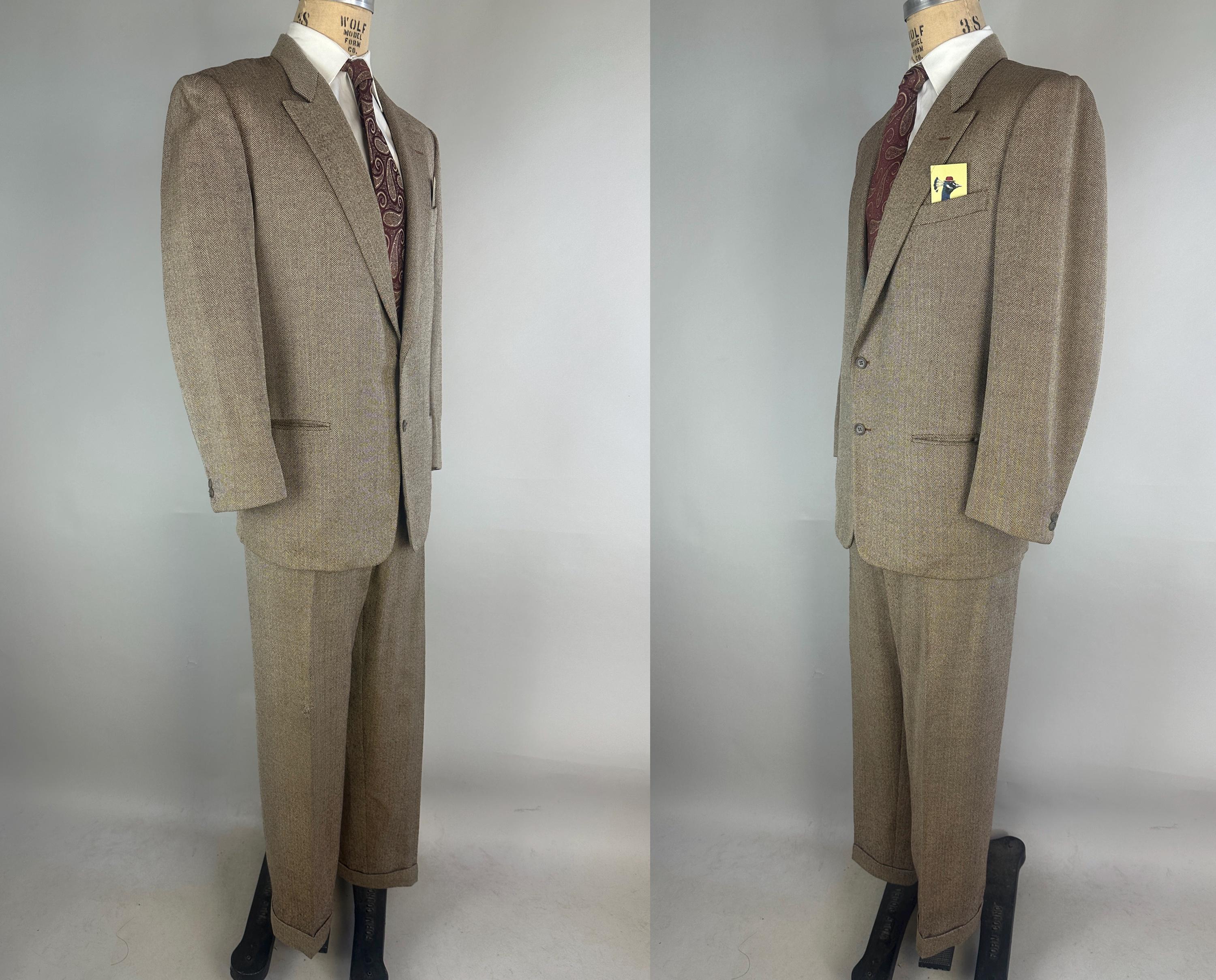 Step out in our favorite styled suit - the elusive but very sought after "peak" of suiting fashion - a single-breasted peak lapel suit! Brown and white herringbone wool tweed gives a lot of pairing options for this 1950s suit. Jacket features a two-button closure, sharp peak lapels, pairs of matching buttons at each cuff, jetted chest pocket, two welted hip pockets, with an unvented back. Half-lined in rayon with two additional inner pockets. Trousers have a flat-front, dropped belt loops, healthy wide cuffs, five pockets with one buttoning in back, and a brass zip & hook closure. By 'Charing Cross' with a 1949-62 Union Label dating this suit to the 1950s. This suit is in great vintage condition, with a couple very subtle period mends and no holes, stains, odors to note.