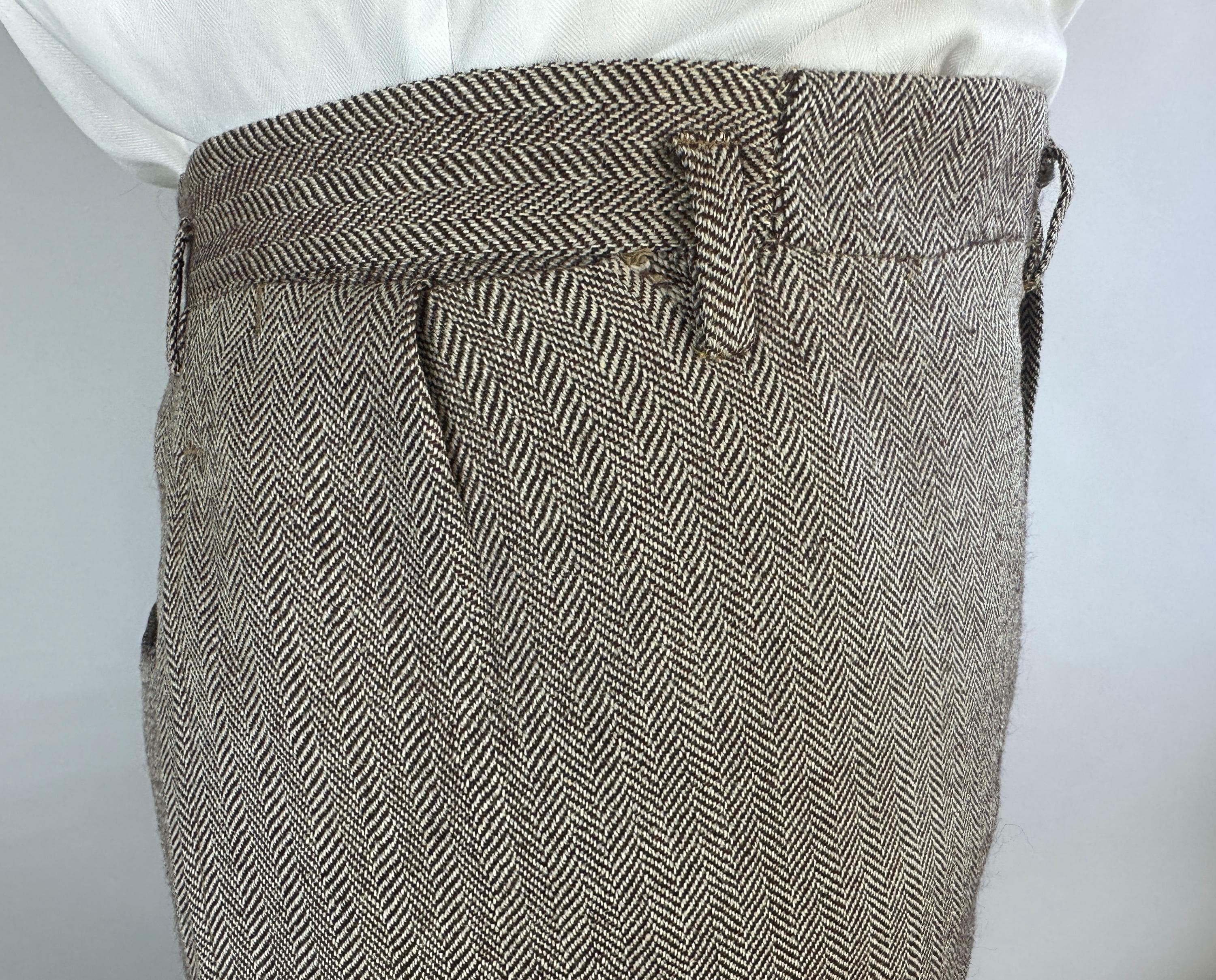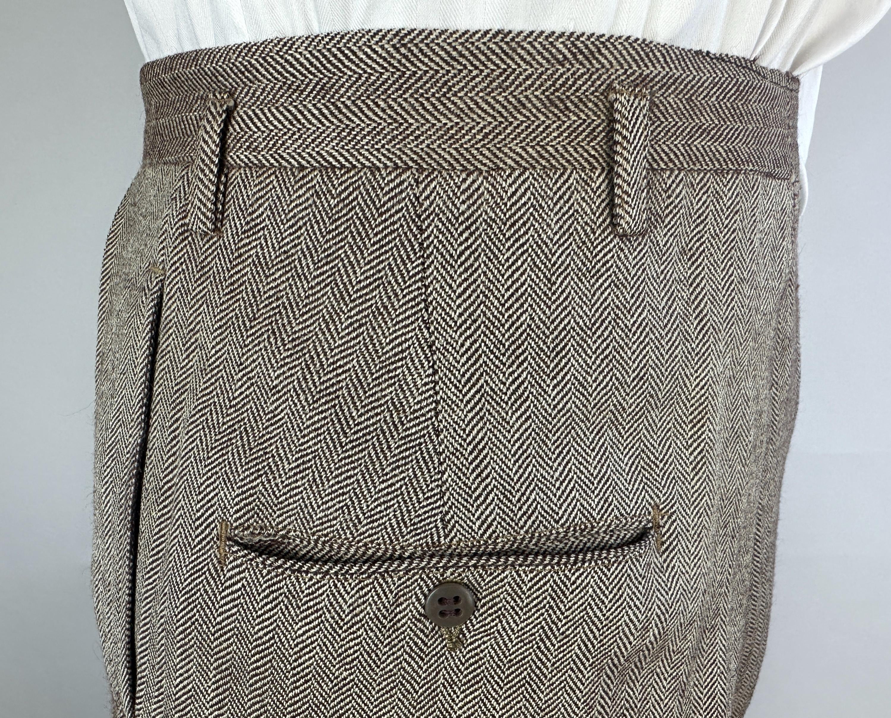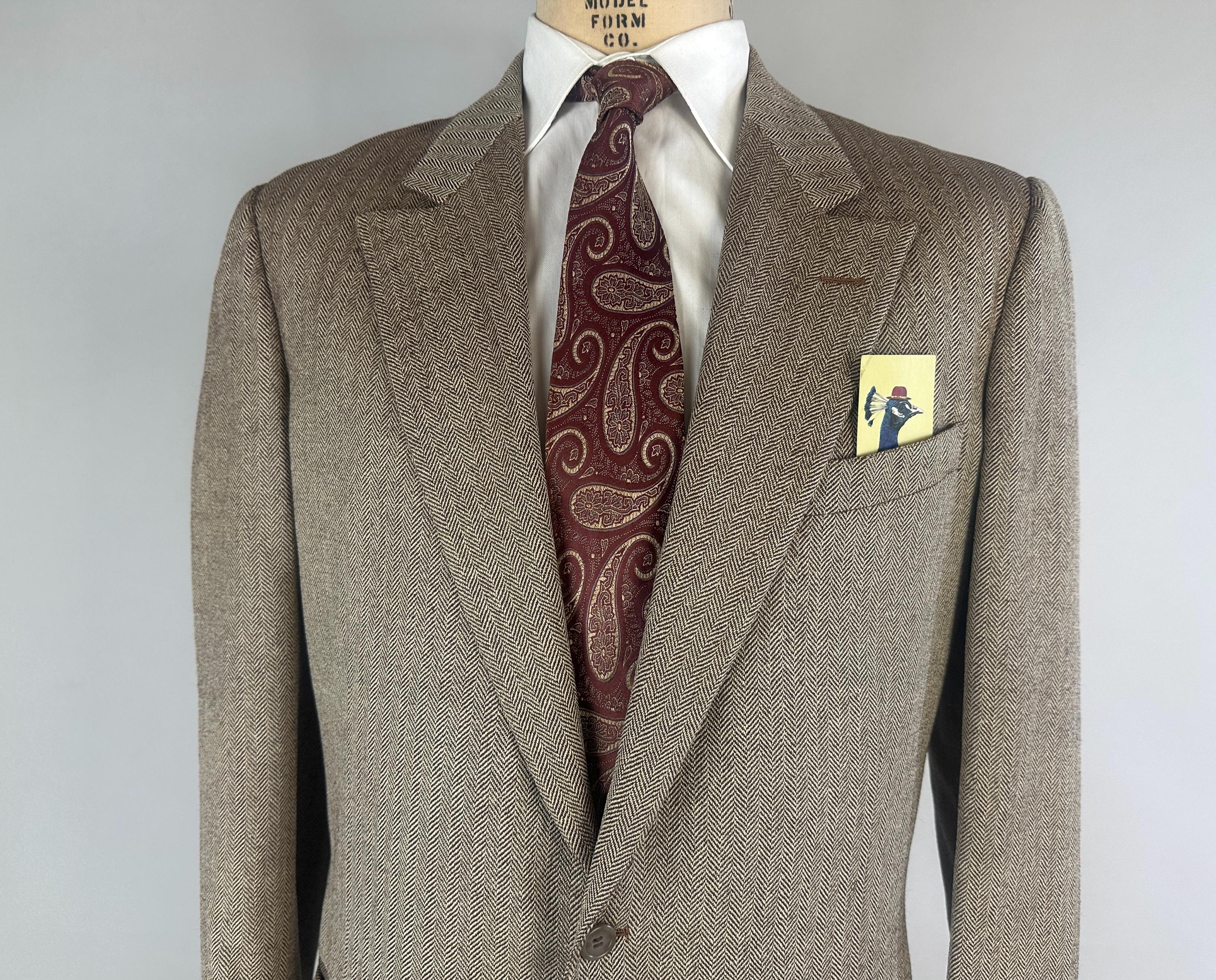 Step out in our favorite styled suit - the elusive but very sought after "peak" of suiting fashion - a single-breasted peak lapel suit! Brown and white herringbone wool tweed gives a lot of pairing options for this 1950s suit. Jacket features a two-button closure, sharp peak lapels, pairs of matching buttons at each cuff, jetted chest pocket, two welted hip pockets, with an unvented back. Half-lined in rayon with two additional inner pockets. Trousers have a flat-front, dropped belt loops, healthy wide cuffs, five pockets with one buttoning in back, and a brass zip & hook closure. By 'Charing Cross' with a 1949-62 Union Label dating this suit to the 1950s. This suit is in great vintage condition, with a couple very subtle period mends and no holes, stains, odors to note.