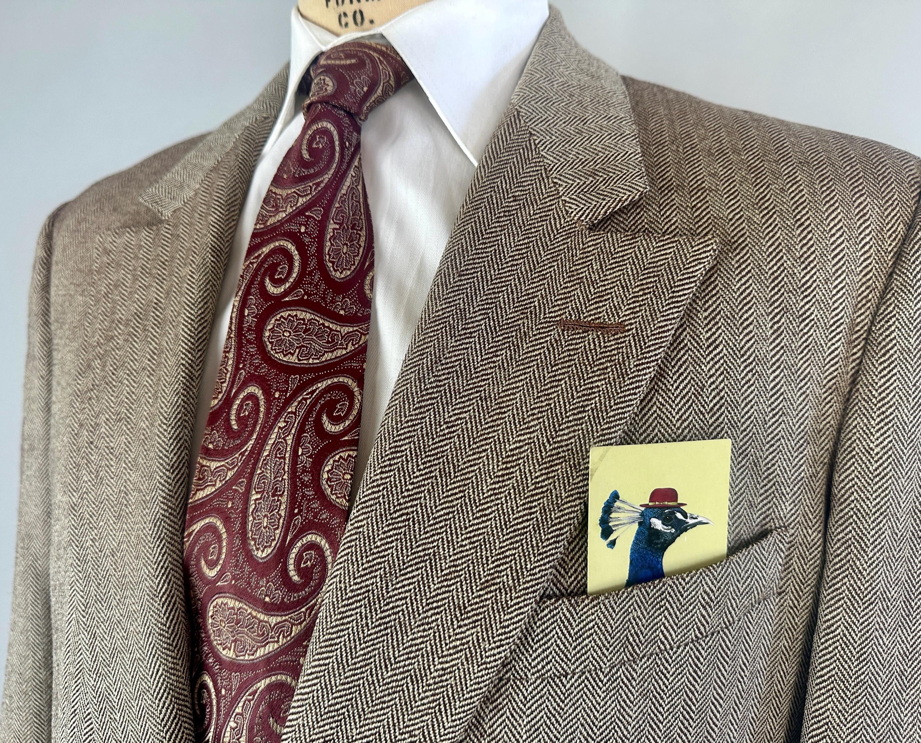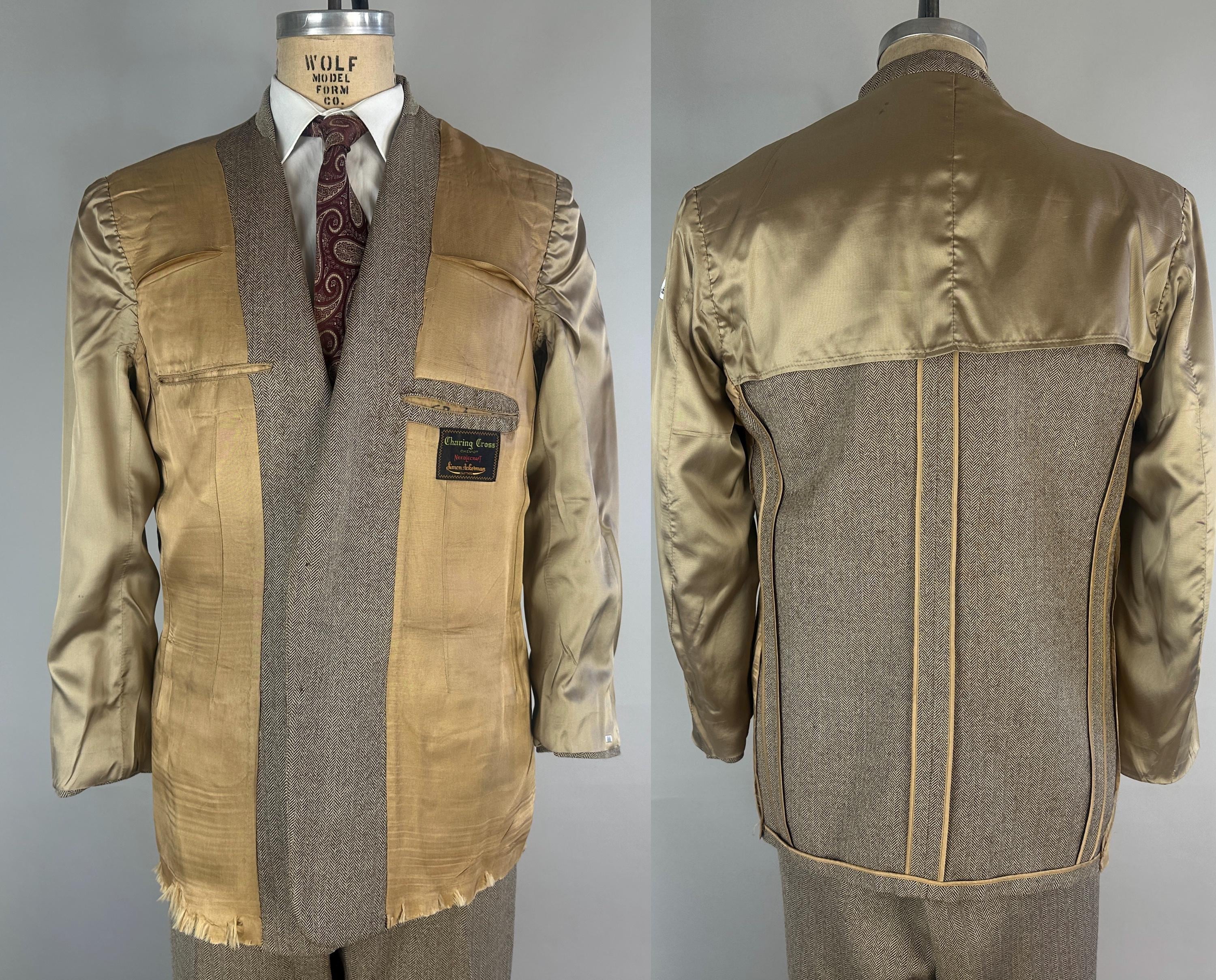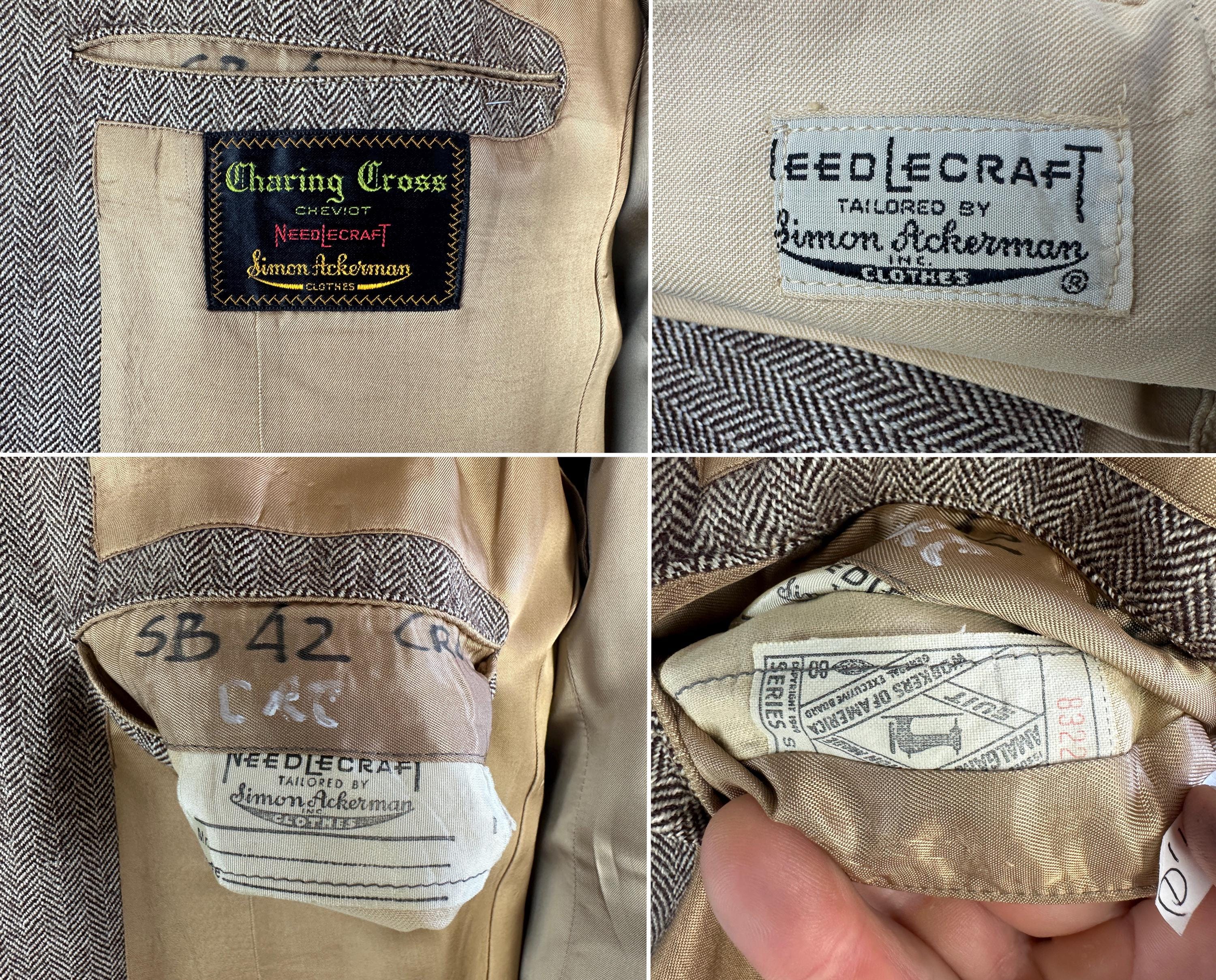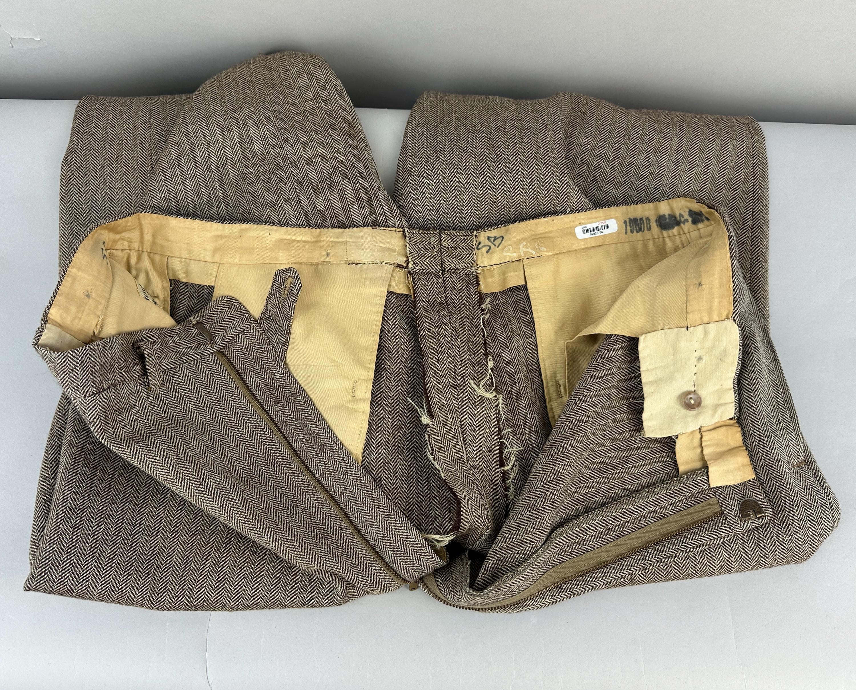 Step out in our favorite styled suit - the elusive but very sought after "peak" of suiting fashion - a single-breasted peak lapel suit! Brown and white herringbone wool tweed gives a lot of pairing options for this 1950s suit. Jacket features a two-button closure, sharp peak lapels, pairs of matching buttons at each cuff, jetted chest pocket, two welted hip pockets, with an unvented back. Half-lined in rayon with two additional inner pockets. Trousers have a flat-front, dropped belt loops, healthy wide cuffs, five pockets with one buttoning in back, and a brass zip & hook closure. By 'Charing Cross' with a 1949-62 Union Label dating this suit to the 1950s. This suit is in great vintage condition, with a couple very subtle period mends and no holes, stains, odors to note.
