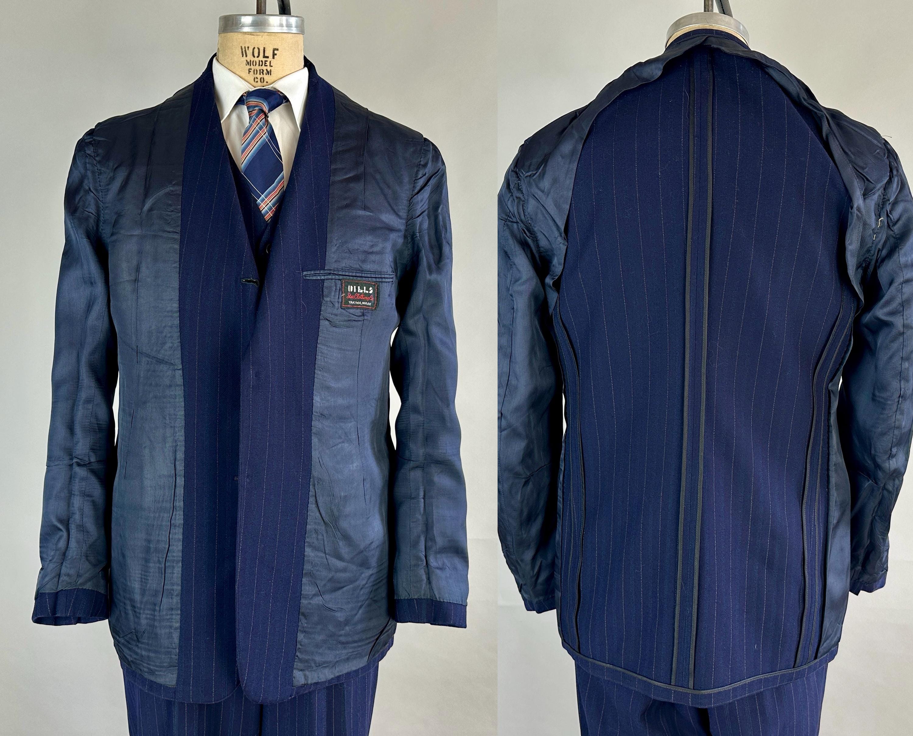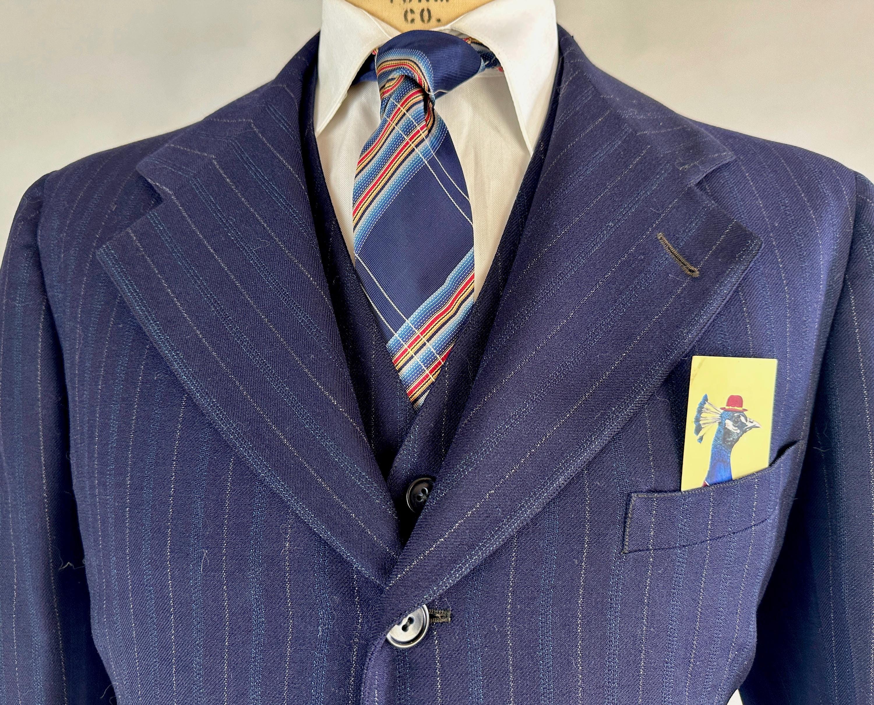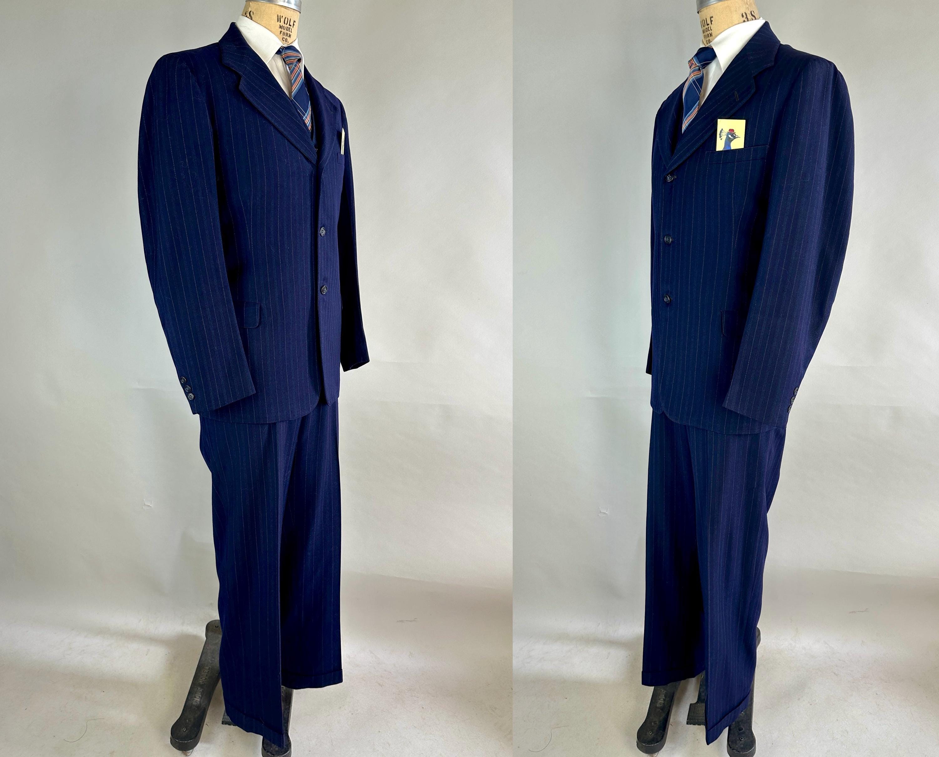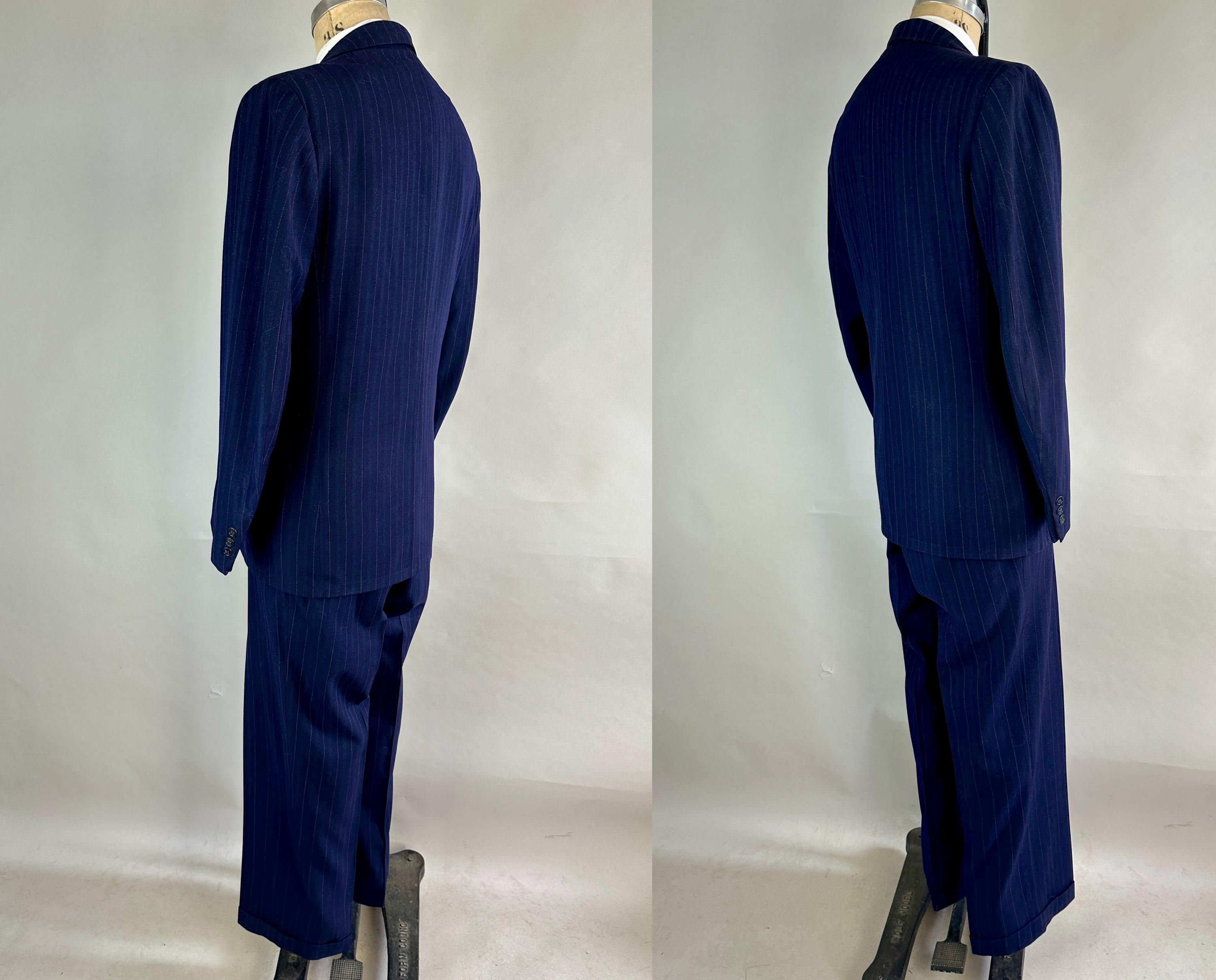 Shock them as you stroll down electric avenue in this 1940s three-piece suit! Navy blue wool with white pinstripes and trios of electric blue pinstripes that really pop! Jacket features a three-button single-breasted closure with notch lapels, trios of matching buttons at each cuff, jetted chest pocket, two flapped hip pockets, and unvented back. Butterfly lined in rayon with shoulder pads and one inner pocket. Vest has a six-button front with four jetted pockets, backed in rayon and fully lined in cotton. Trousers have a flat-front, belt loops, five pockets with one buttoning in back, healthy wide cuffs, a full set of inner suspender buttons, and closes with a Talon steel zip and button. By "Dills" of Washington, with a 1939-48 Union Label dating this suit to the 1940s. This suit is in great vintage condition, with no holes, stains, odors to note.