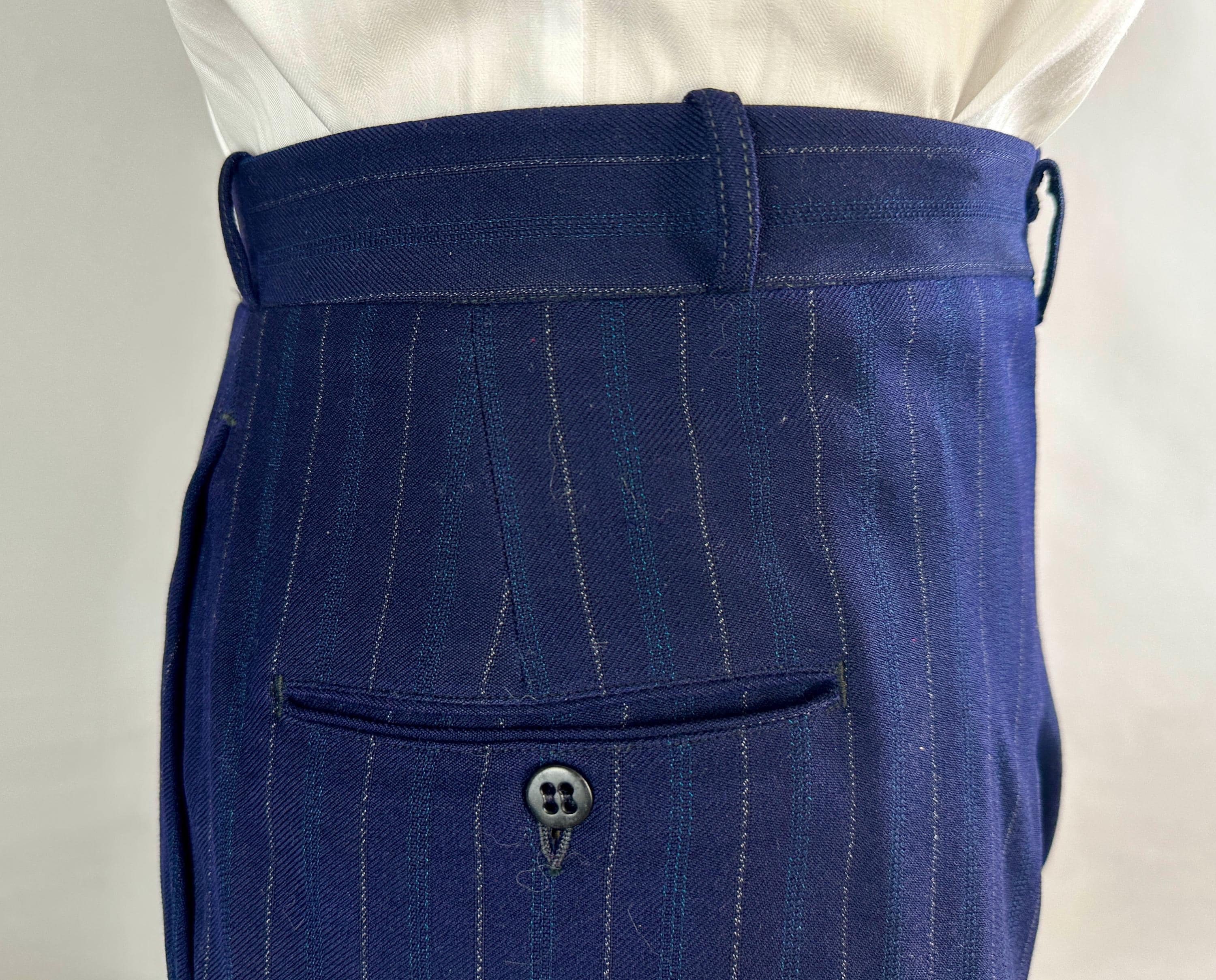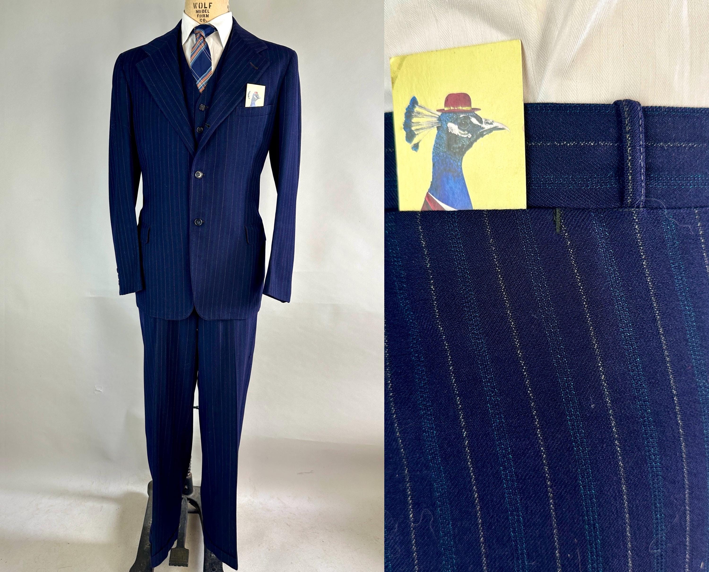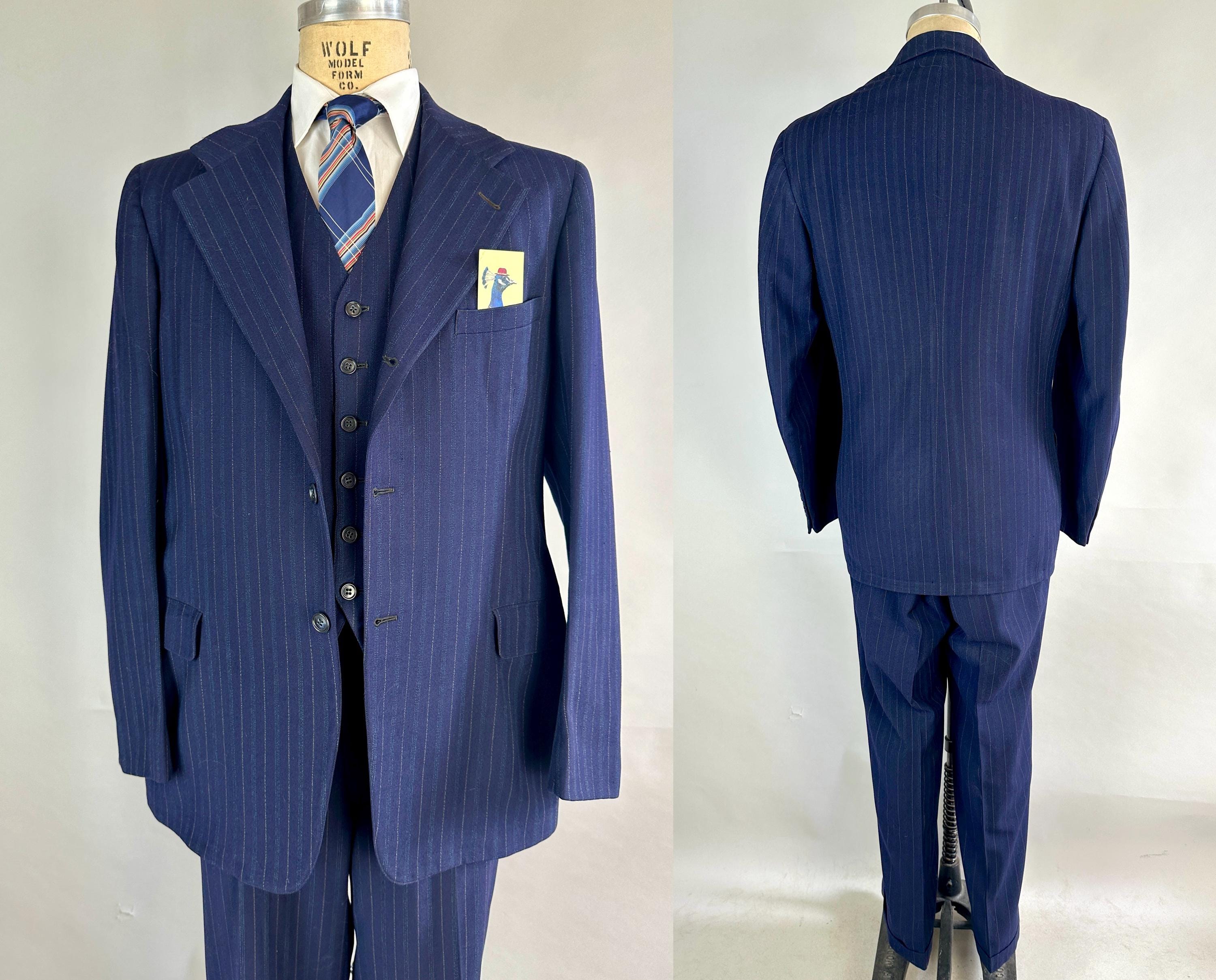 Shock them as you stroll down electric avenue in this 1940s three-piece suit! Navy blue wool with white pinstripes and trios of electric blue pinstripes that really pop! Jacket features a three-button single-breasted closure with notch lapels, trios of matching buttons at each cuff, jetted chest pocket, two flapped hip pockets, and unvented back. Butterfly lined in rayon with shoulder pads and one inner pocket. Vest has a six-button front with four jetted pockets, backed in rayon and fully lined in cotton. Trousers have a flat-front, belt loops, five pockets with one buttoning in back, healthy wide cuffs, a full set of inner suspender buttons, and closes with a Talon steel zip and button. By "Dills" of Washington, with a 1939-48 Union Label dating this suit to the 1940s. This suit is in great vintage condition, with no holes, stains, odors to note.