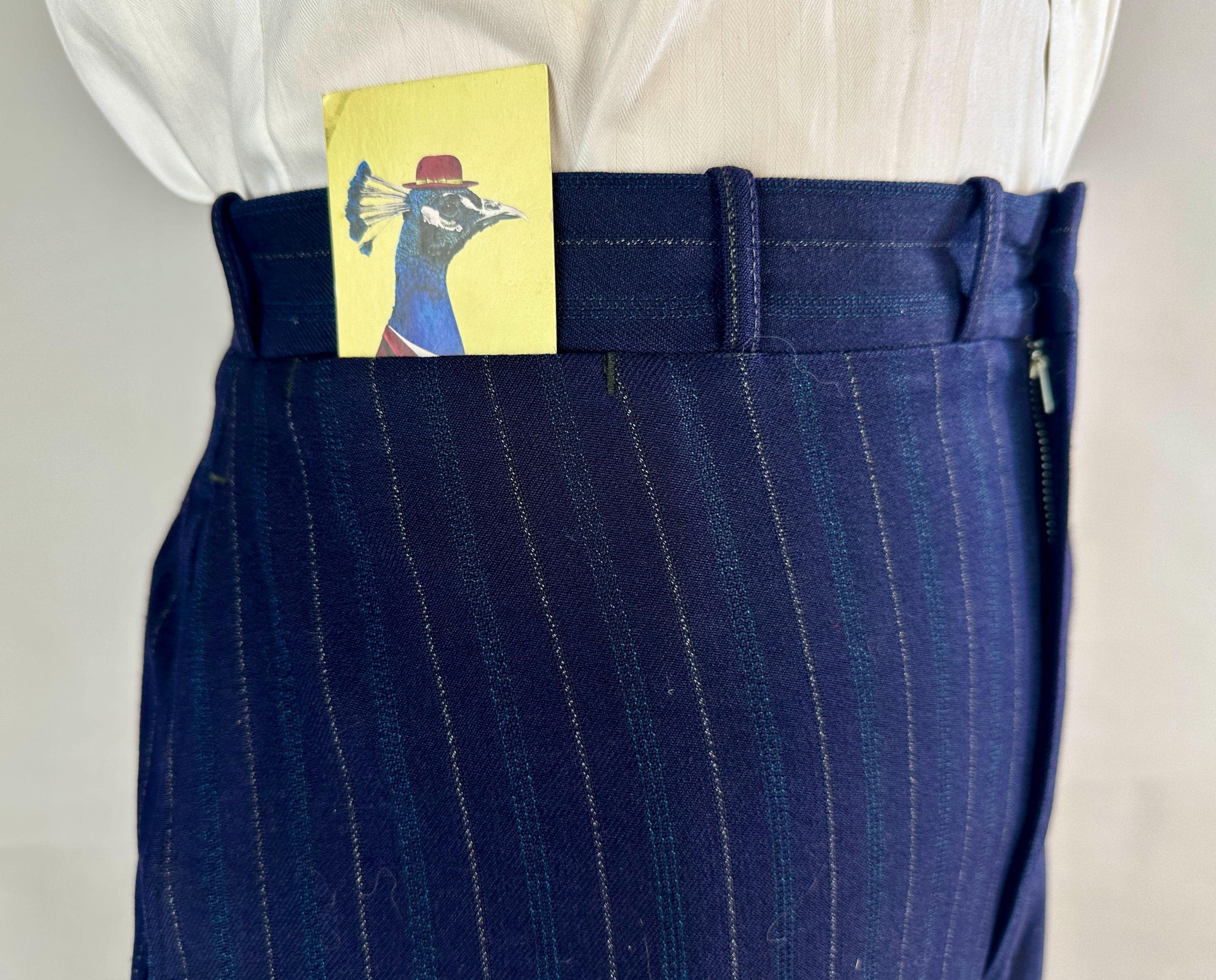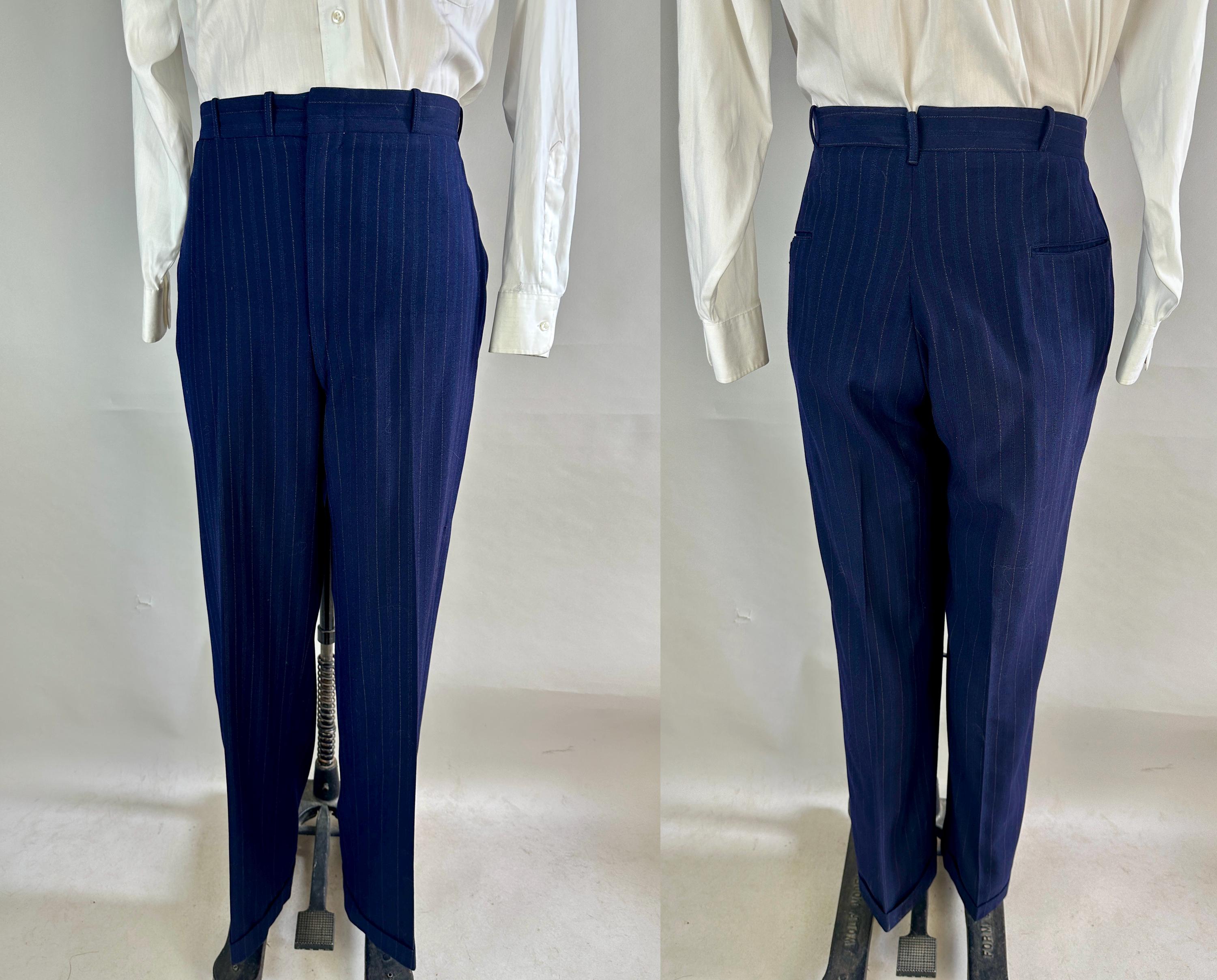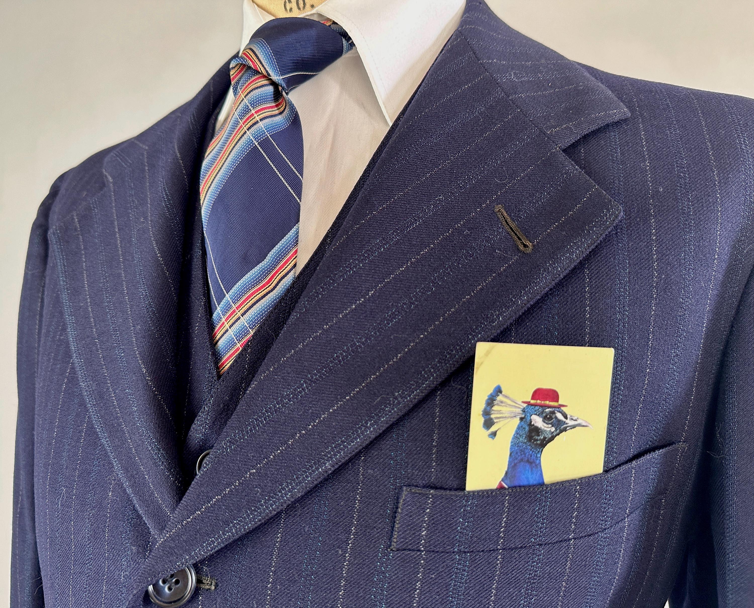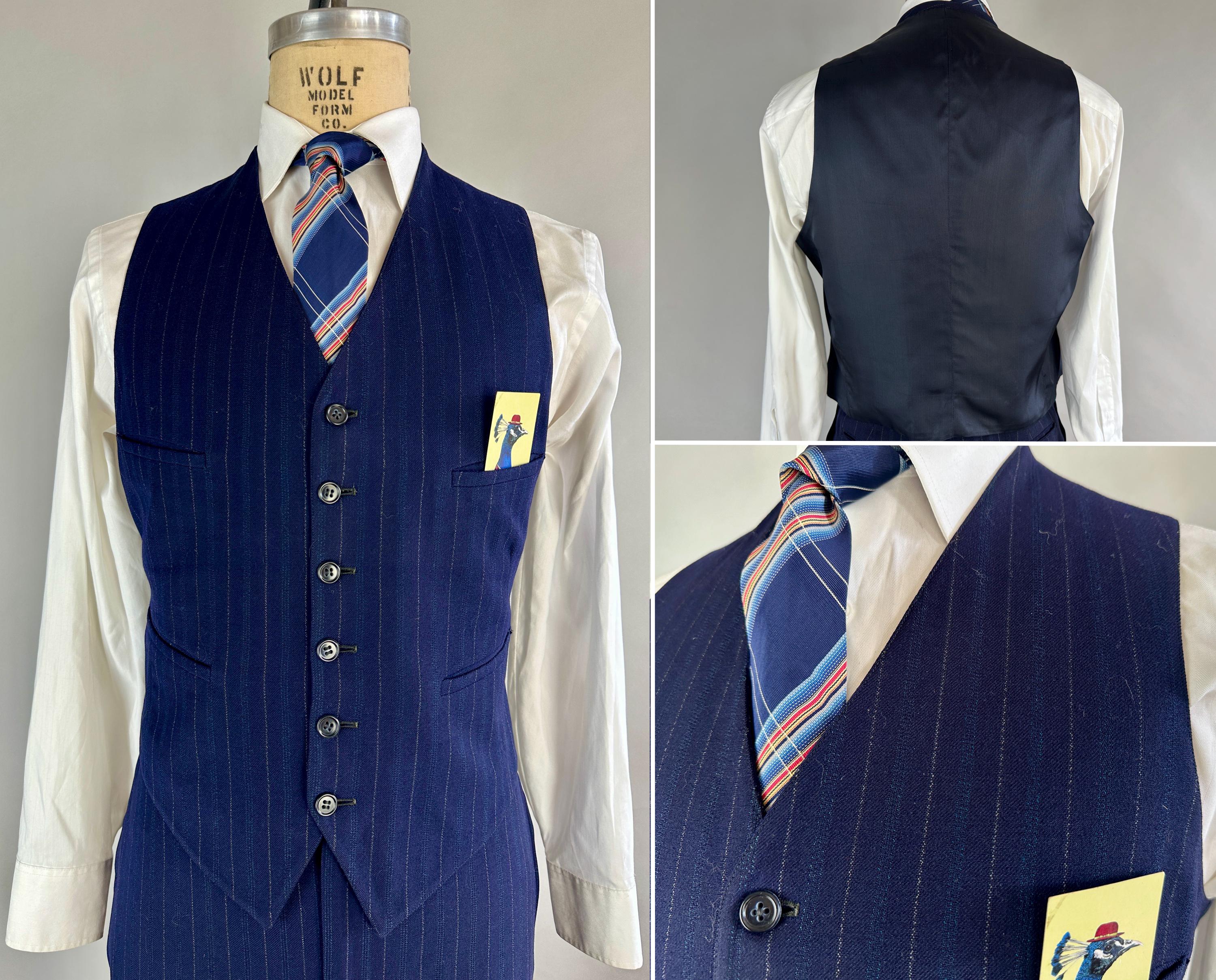 Shock them as you stroll down electric avenue in this 1940s three-piece suit! Navy blue wool with white pinstripes and trios of electric blue pinstripes that really pop! Jacket features a three-button single-breasted closure with notch lapels, trios of matching buttons at each cuff, jetted chest pocket, two flapped hip pockets, and unvented back. Butterfly lined in rayon with shoulder pads and one inner pocket. Vest has a six-button front with four jetted pockets, backed in rayon and fully lined in cotton. Trousers have a flat-front, belt loops, five pockets with one buttoning in back, healthy wide cuffs, a full set of inner suspender buttons, and closes with a Talon steel zip and button. By "Dills" of Washington, with a 1939-48 Union Label dating this suit to the 1940s. This suit is in great vintage condition, with no holes, stains, odors to note.