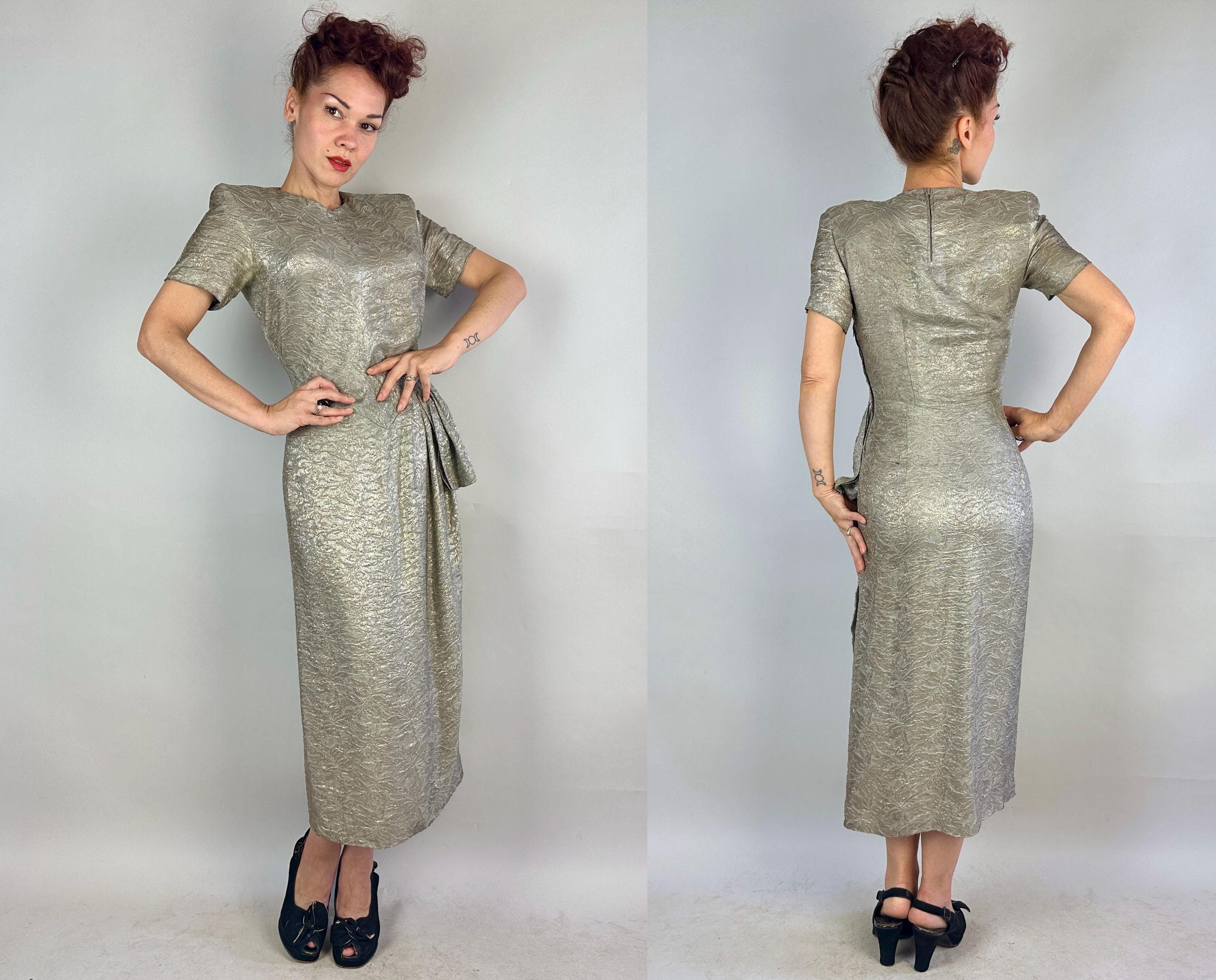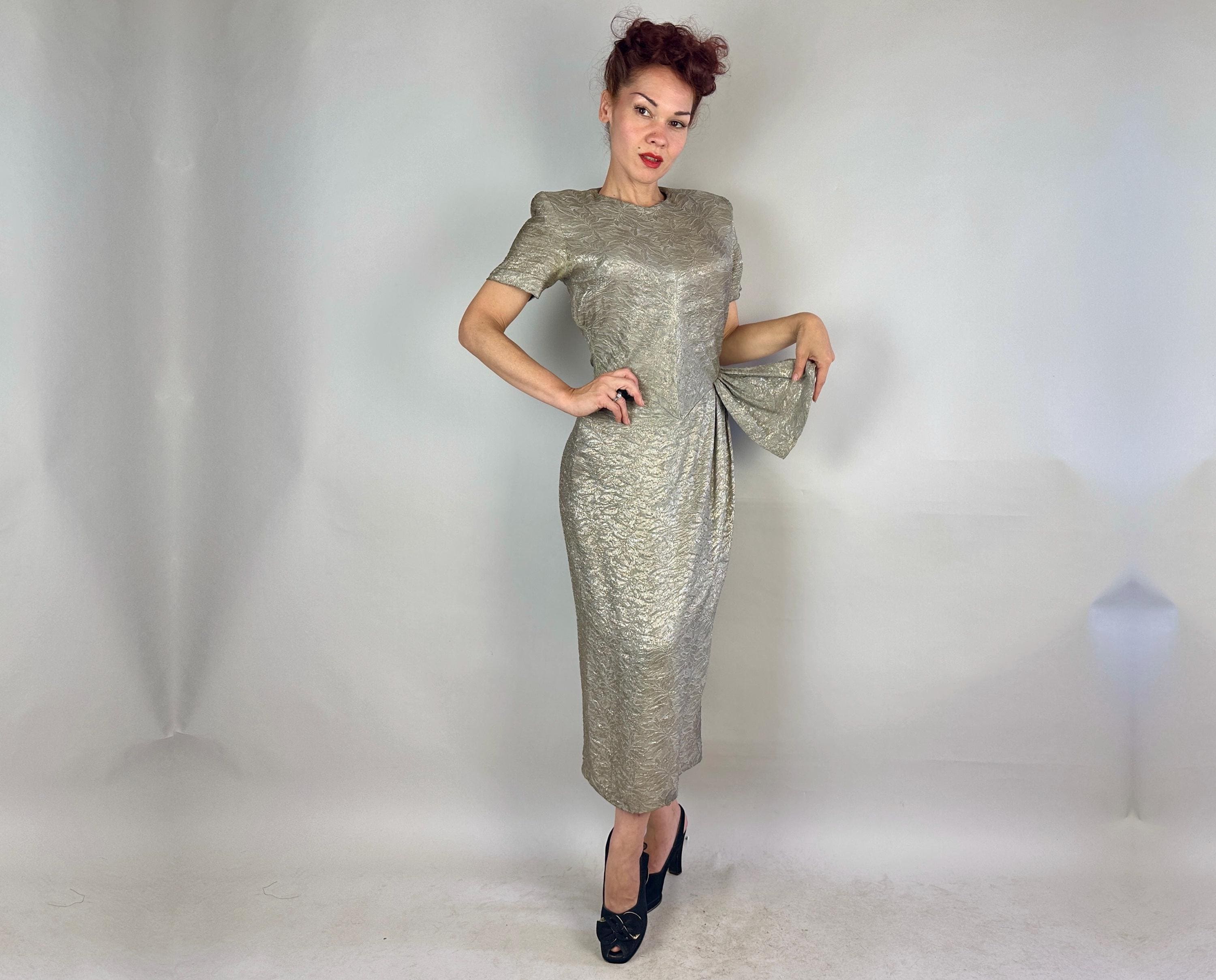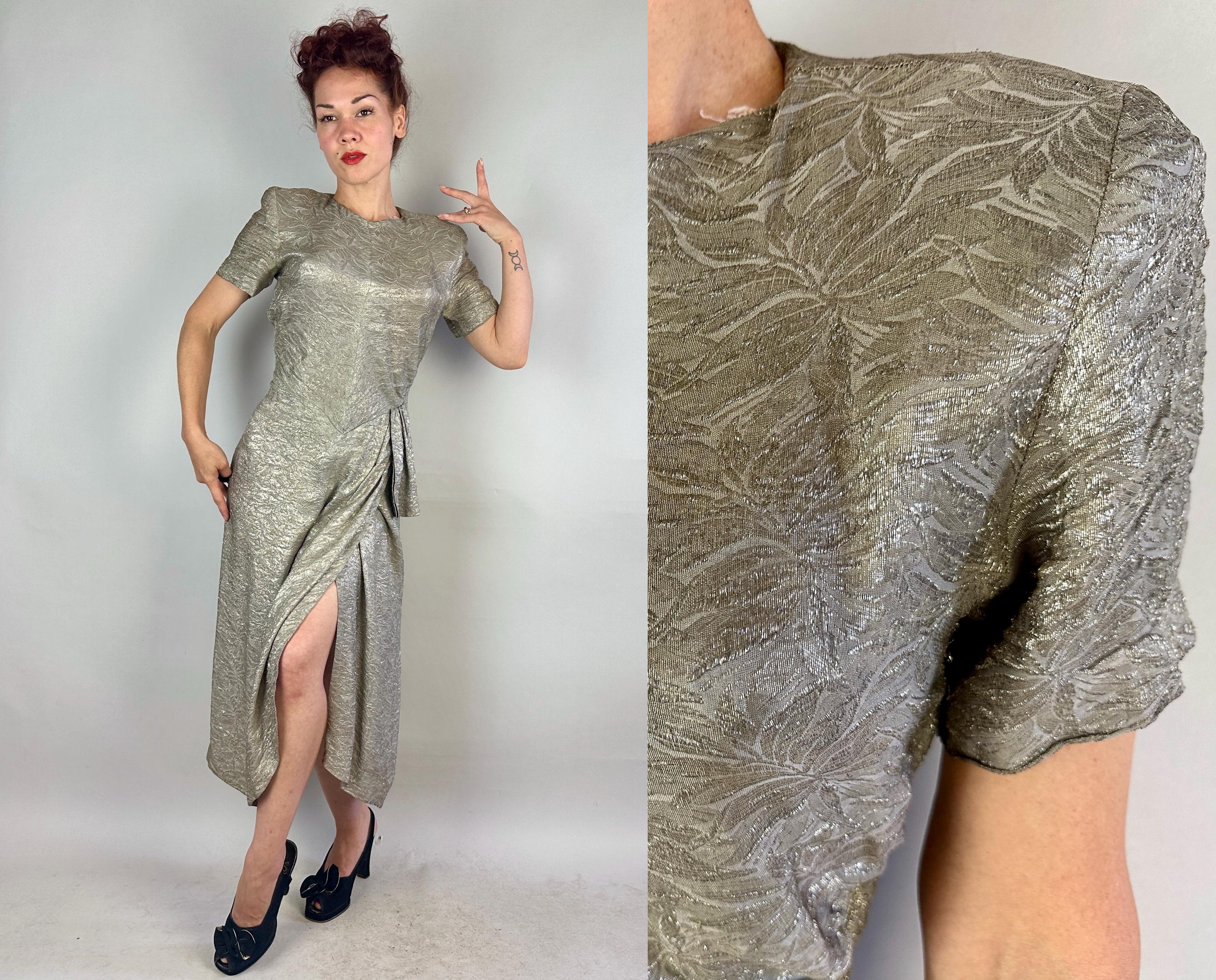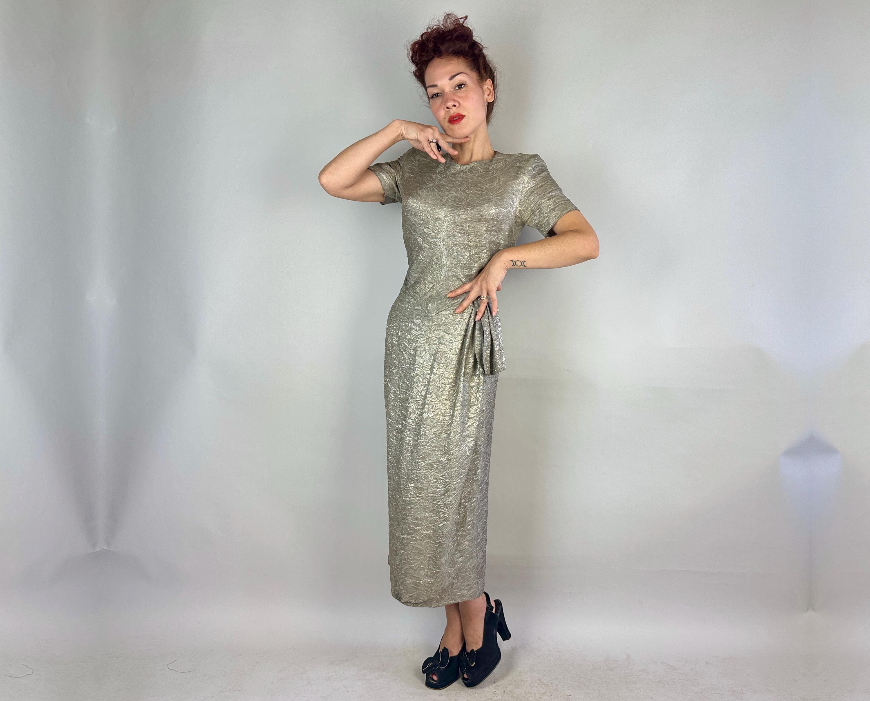 They'll put the blame on you for setting heart's on fire in this 1940s dress! The absolutely stunning silk silver lamé is woven with a leafy design and every movement is exquisite with shine. The sultry cut includes pointed waist detail, ruching on the torso sides, pleated swag on the left hip where the front wrap of the skirt then curves to the hem. Padded shoulders add to the silhouette. Metal zipper on the side and at nape. This dress is in great vintage condition, with no holes, stains, nor odors to note.