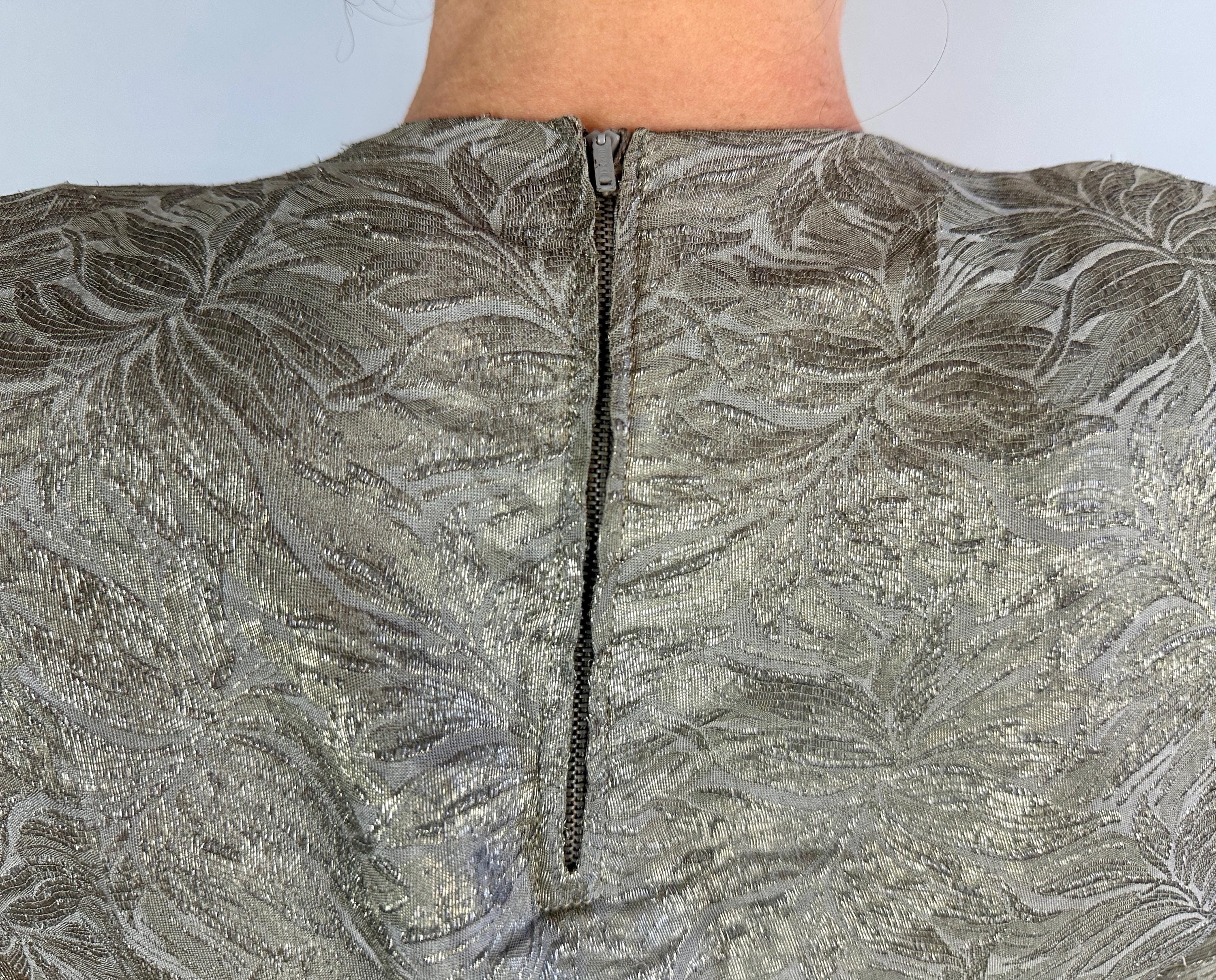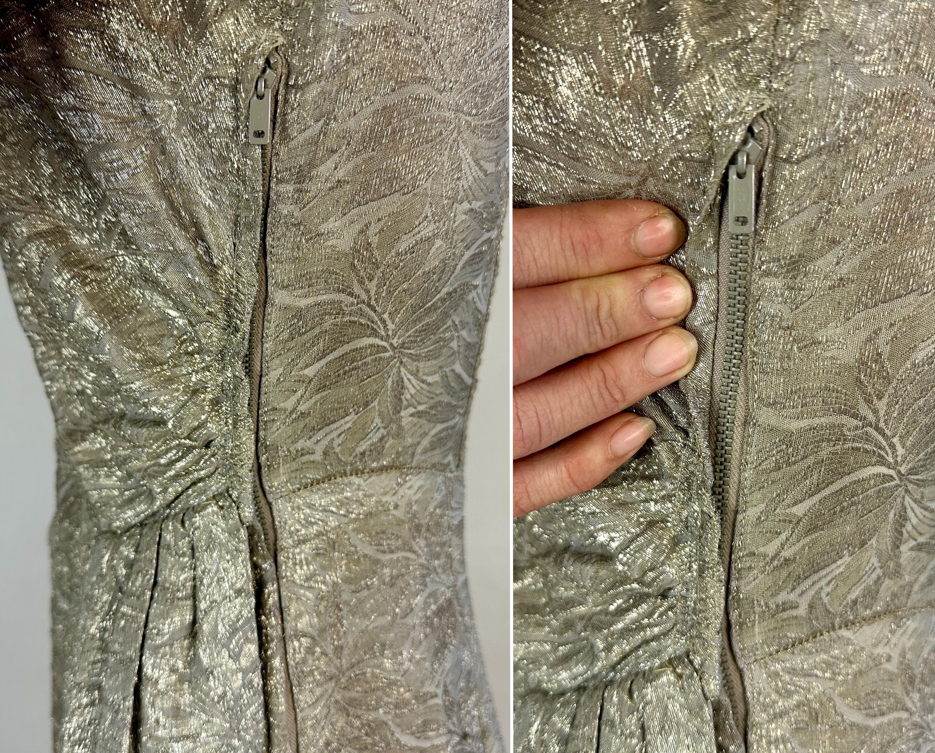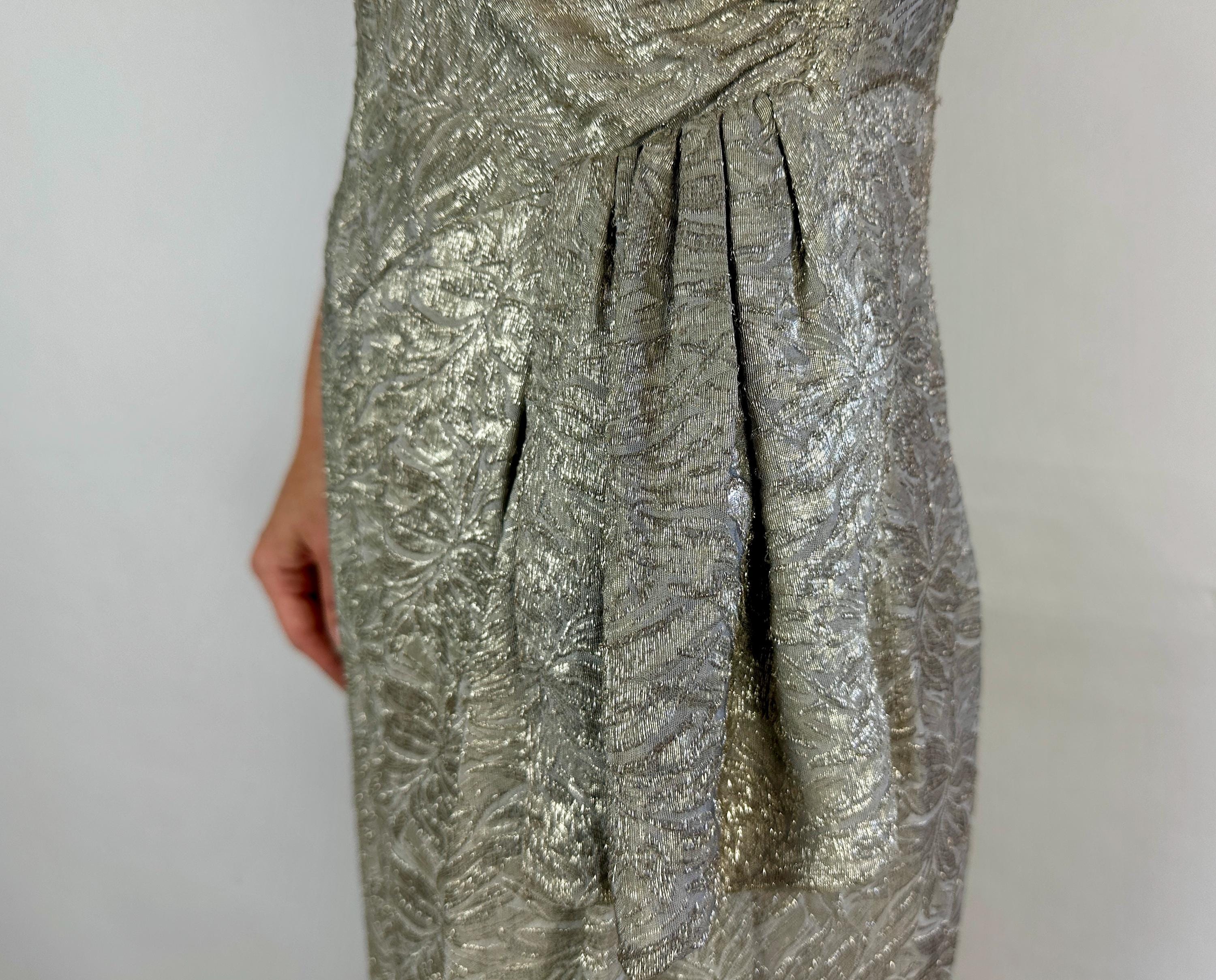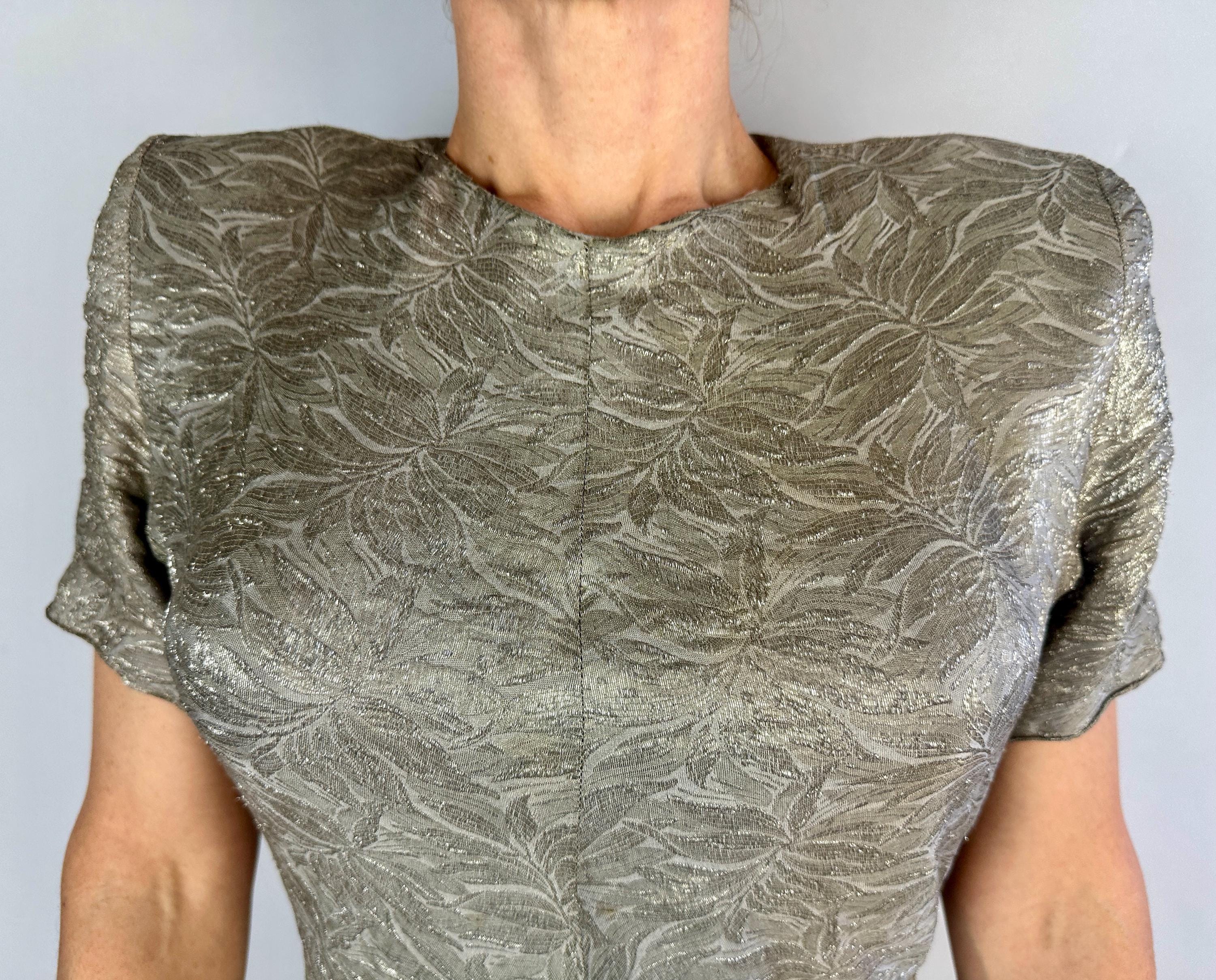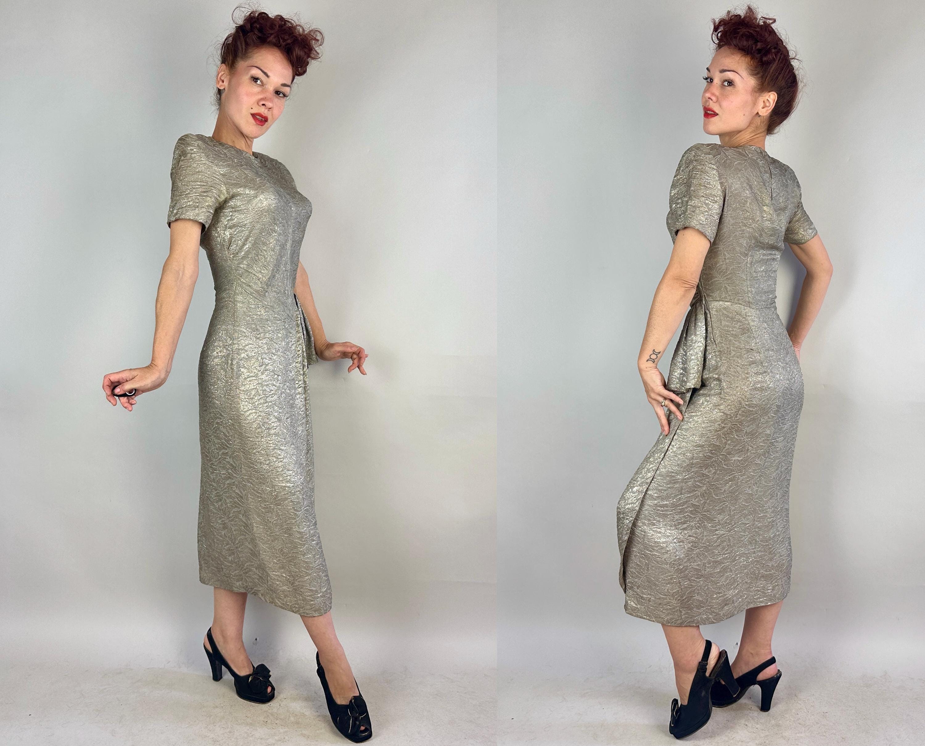 They'll put the blame on you for setting heart's on fire in this 1940s dress! The absolutely stunning silk silver lamé is woven with a leafy design and every movement is exquisite with shine. The sultry cut includes pointed waist detail, ruching on the torso sides, pleated swag on the left hip where the front wrap of the skirt then curves to the hem. Padded shoulders add to the silhouette. Metal zipper on the side and at nape. This dress is in great vintage condition, with no holes, stains, nor odors to note.