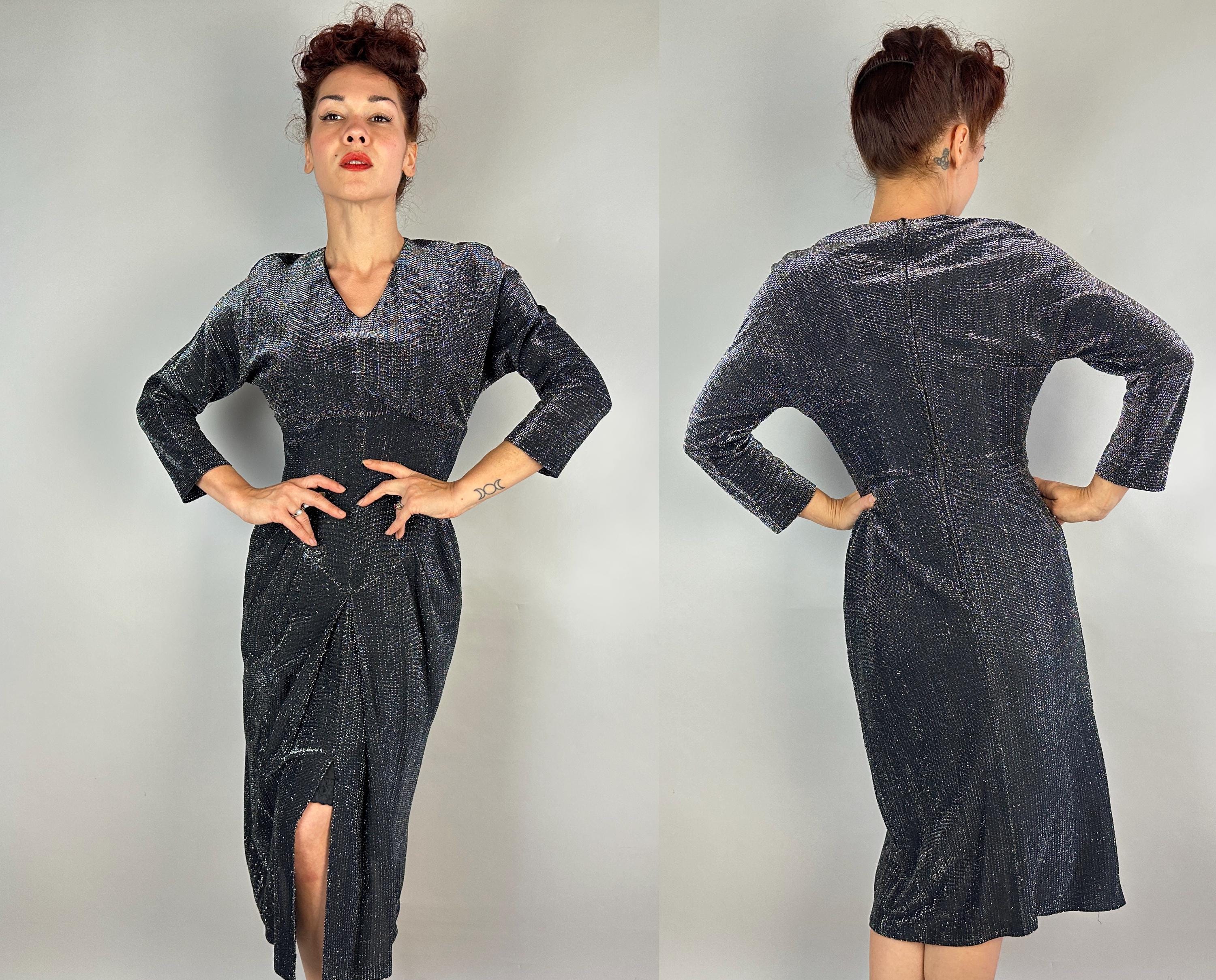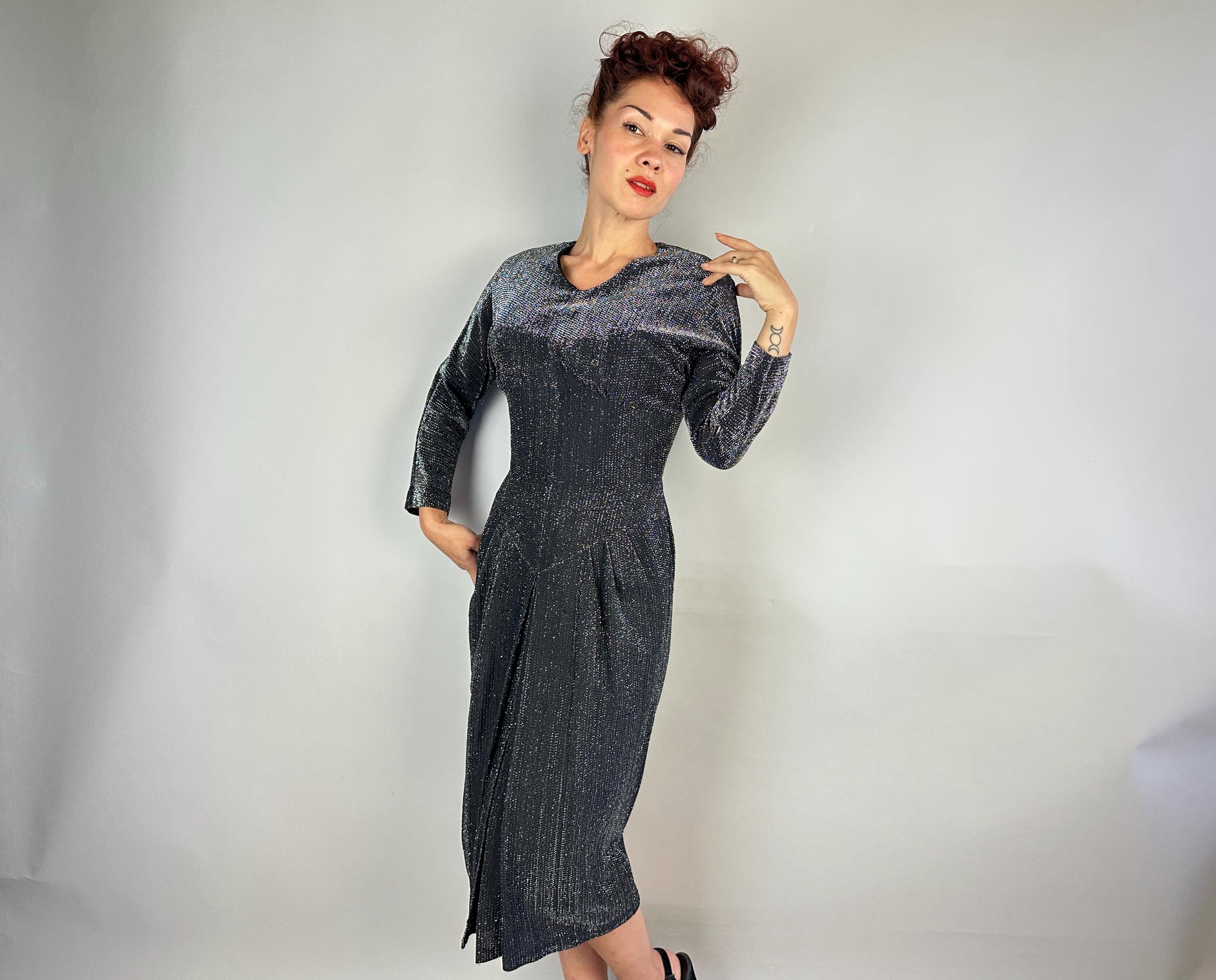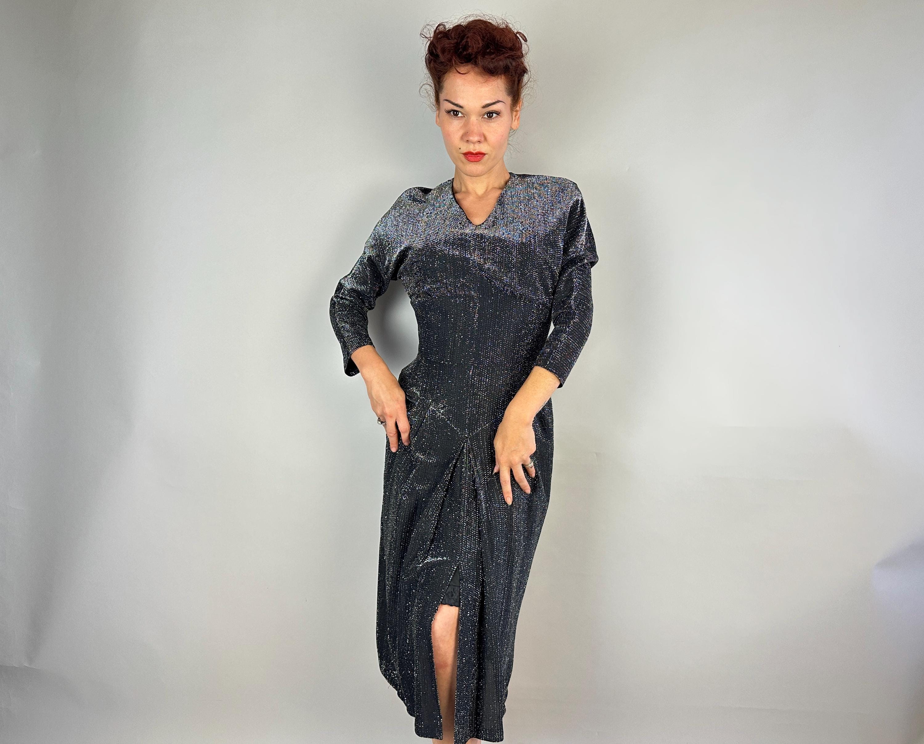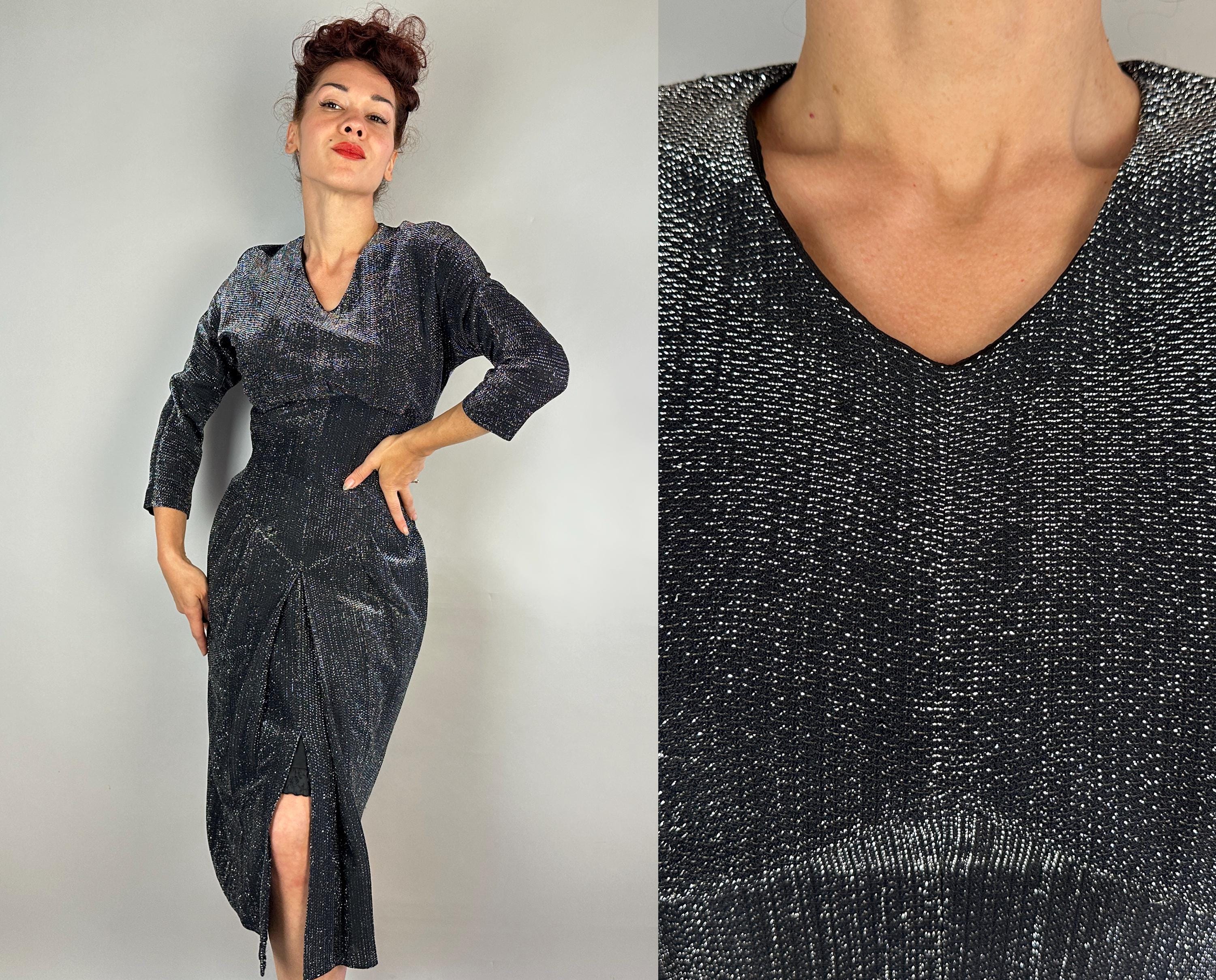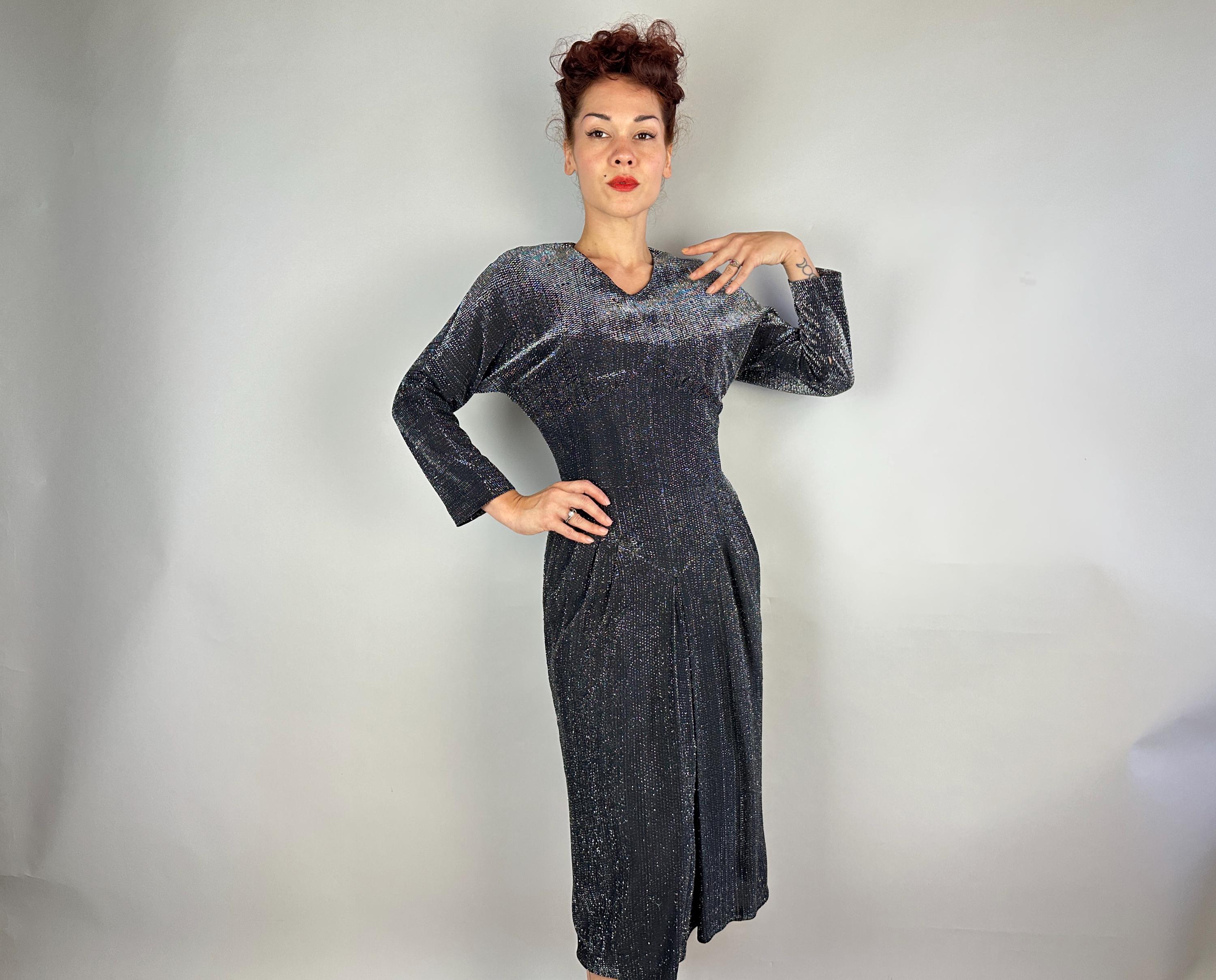 You'll give the night sky some competition when you out dazzle the stars in this 1950s dress! High count silver lurex in a black base has incredible shimmer! This gleaming dress features dolman sleeves, Basque waist, and skirt with center box pleat flanked by knife pleats and a slit below. A liner dress of acetate is sewn in. Labeled "Marion McCoy". metal zipper up the back. This dress is in great vintage condition, with no holes, stains, or odors to note.