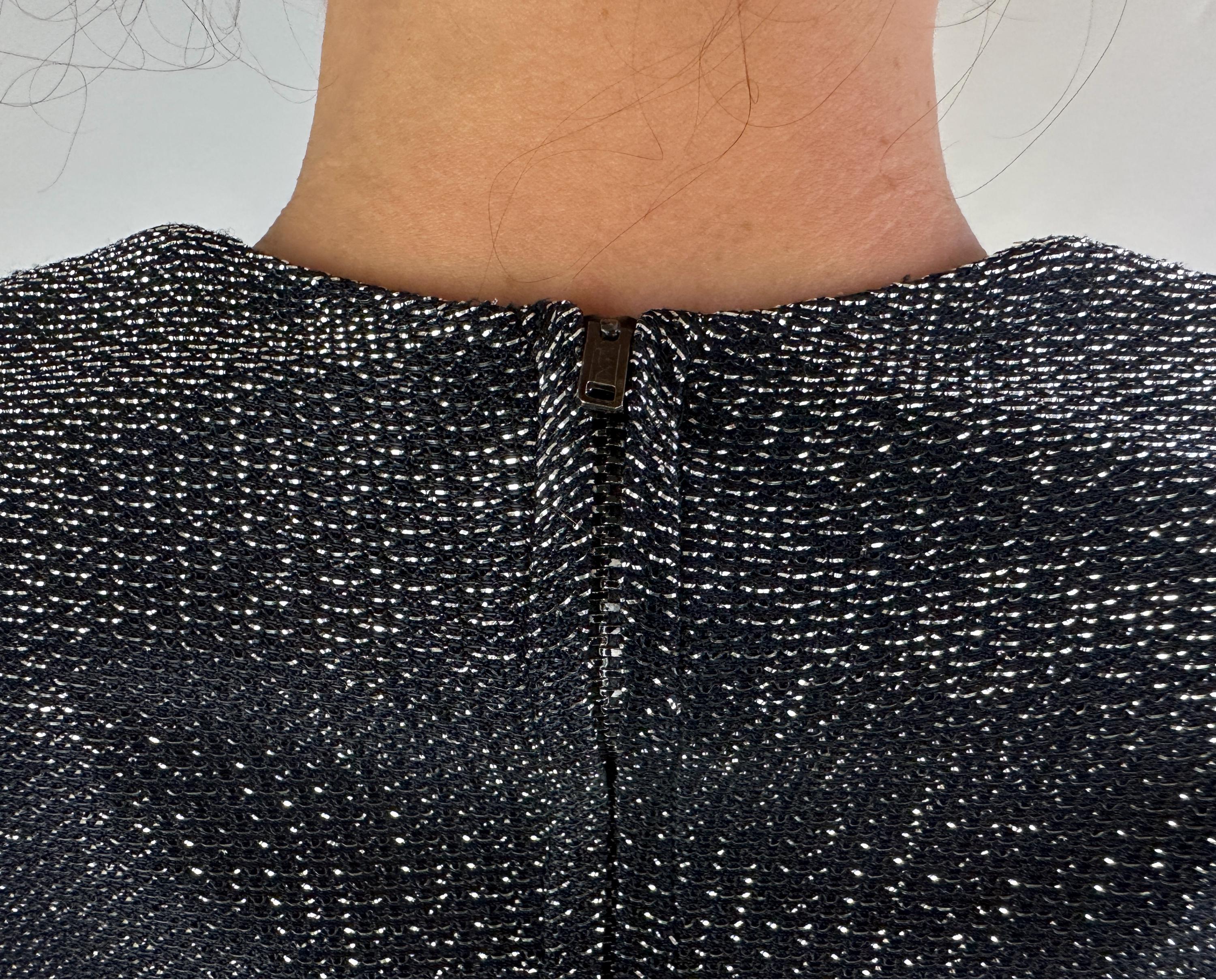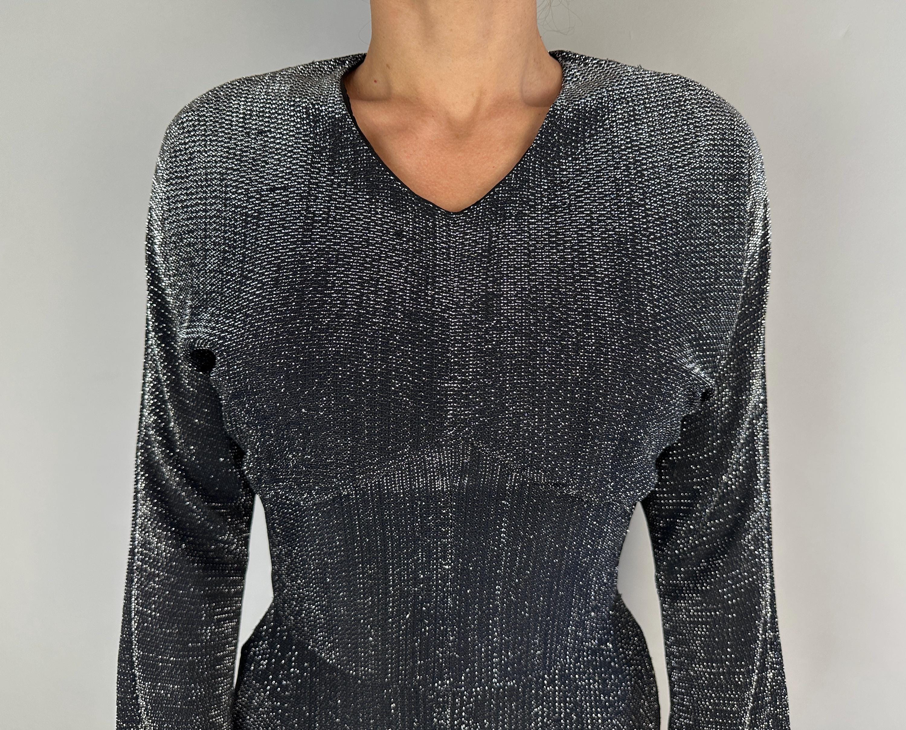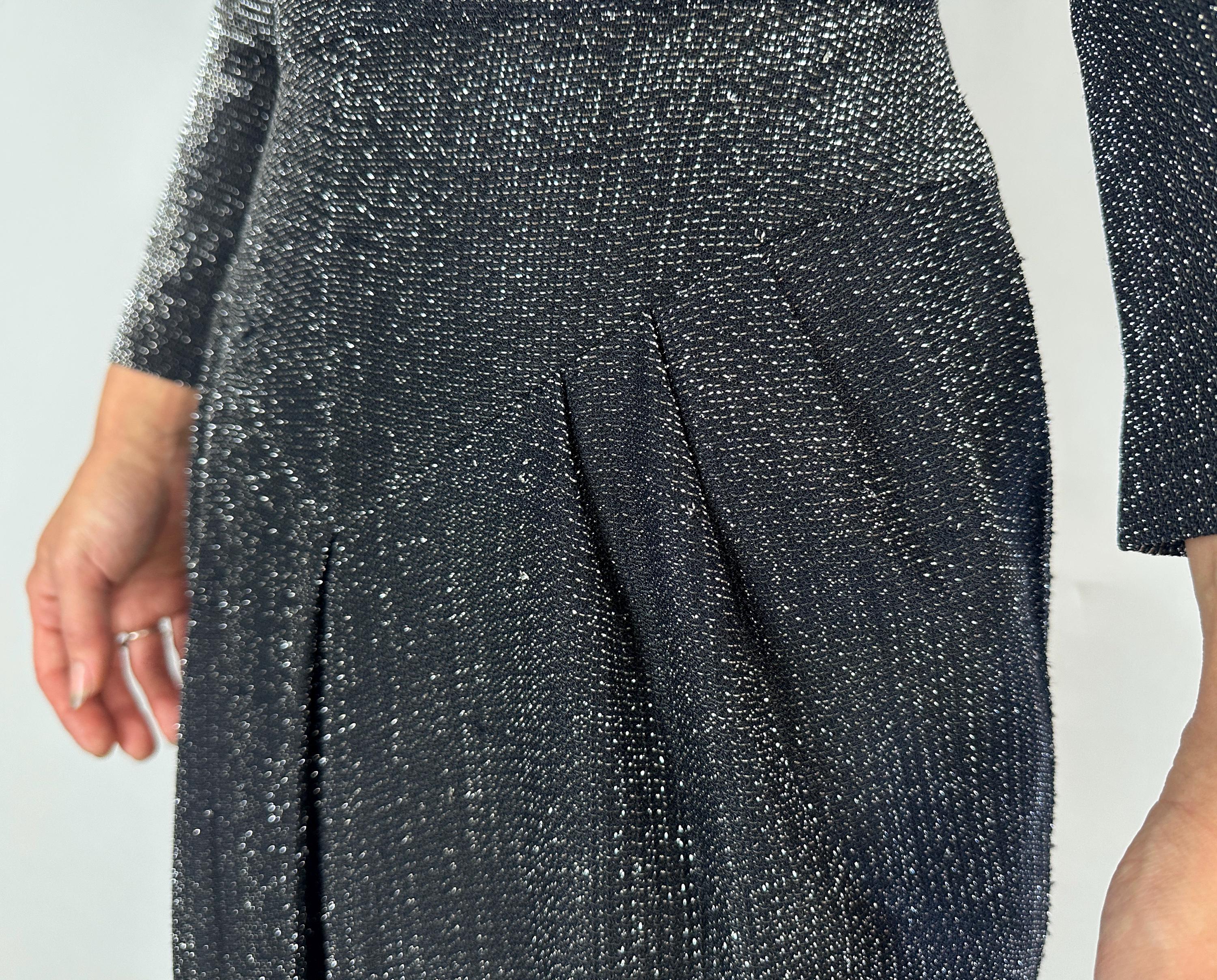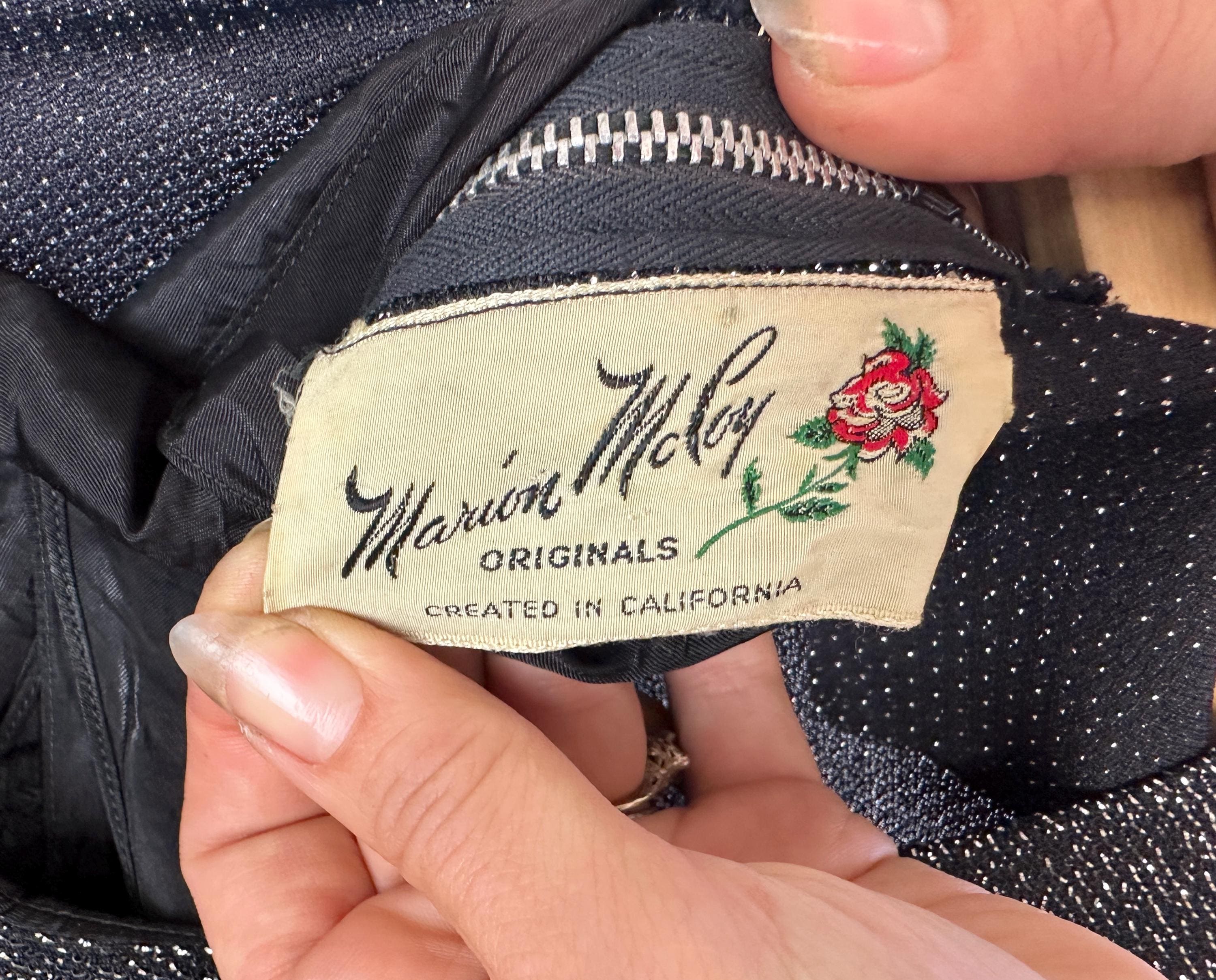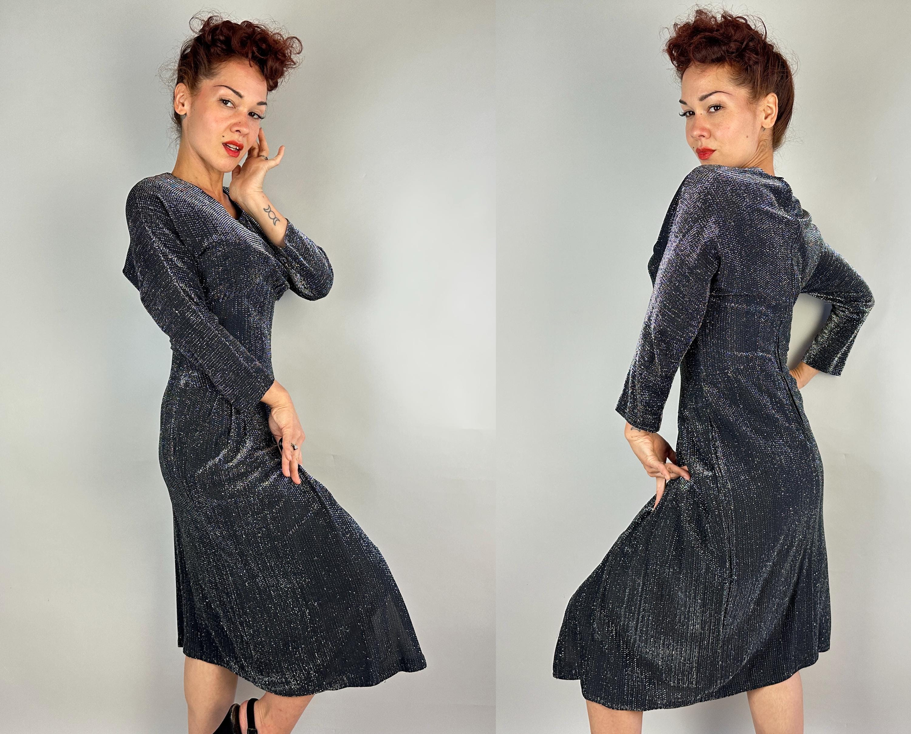 You'll give the night sky some competition when you out dazzle the stars in this 1950s dress! High count silver lurex in a black base has incredible shimmer! This gleaming dress features dolman sleeves, Basque waist, and skirt with center box pleat flanked by knife pleats and a slit below. A liner dress of acetate is sewn in. Labeled "Marion McCoy". metal zipper up the back. This dress is in great vintage condition, with no holes, stains, or odors to note.