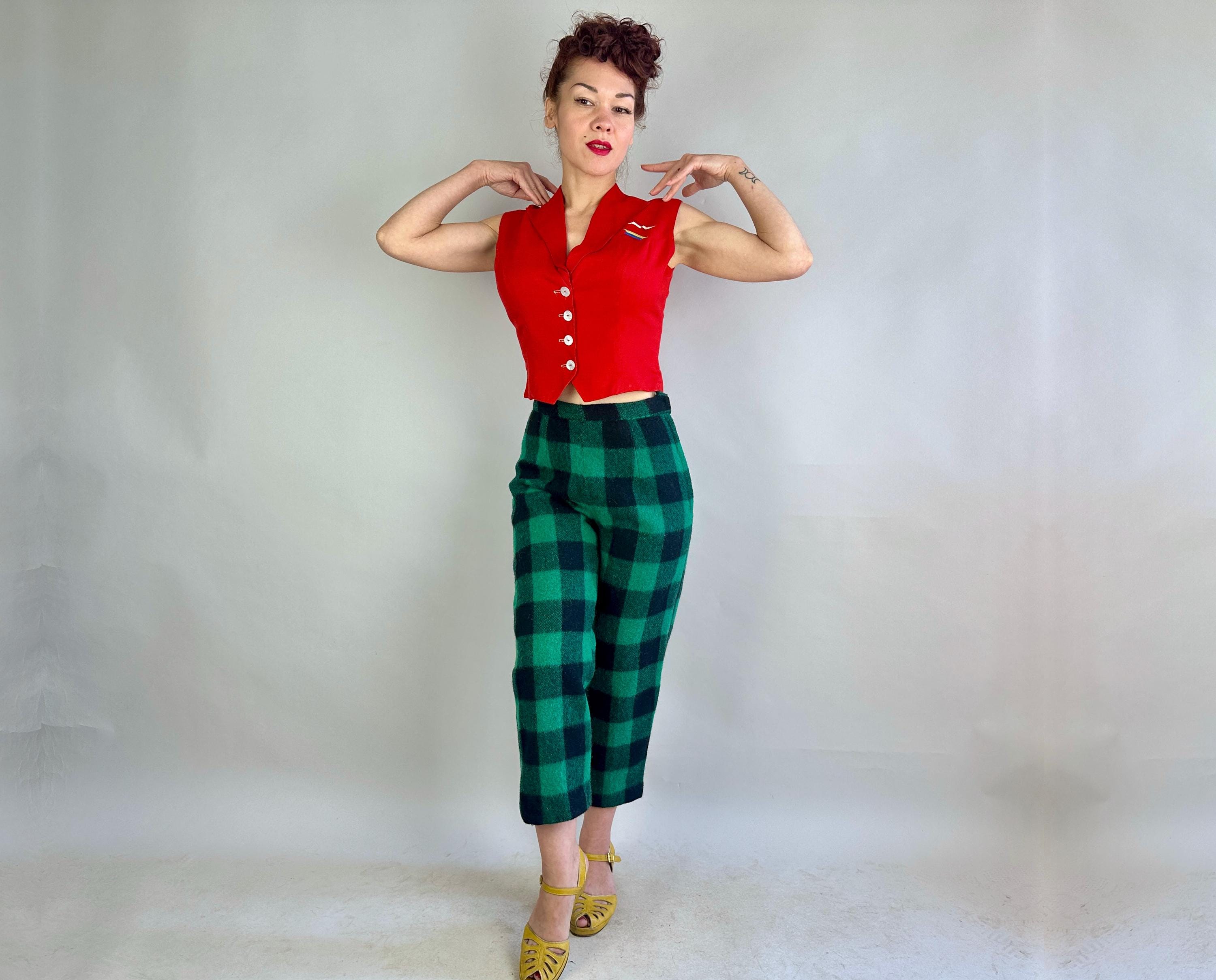 Have some fun amongst the pines in these 1950s pants! They're sure to keep you as toasty as a marshmallow with flannel wool outer and a quilted satin lining. The flannel has a large plaid check pattern of black and kelly and forest greens and the cigarette cut hugs your curves with well placed darts. Brass zipper with hook and eye on the side. These trousers are in great vintage condition, with no stains, holes, or odors to note.
