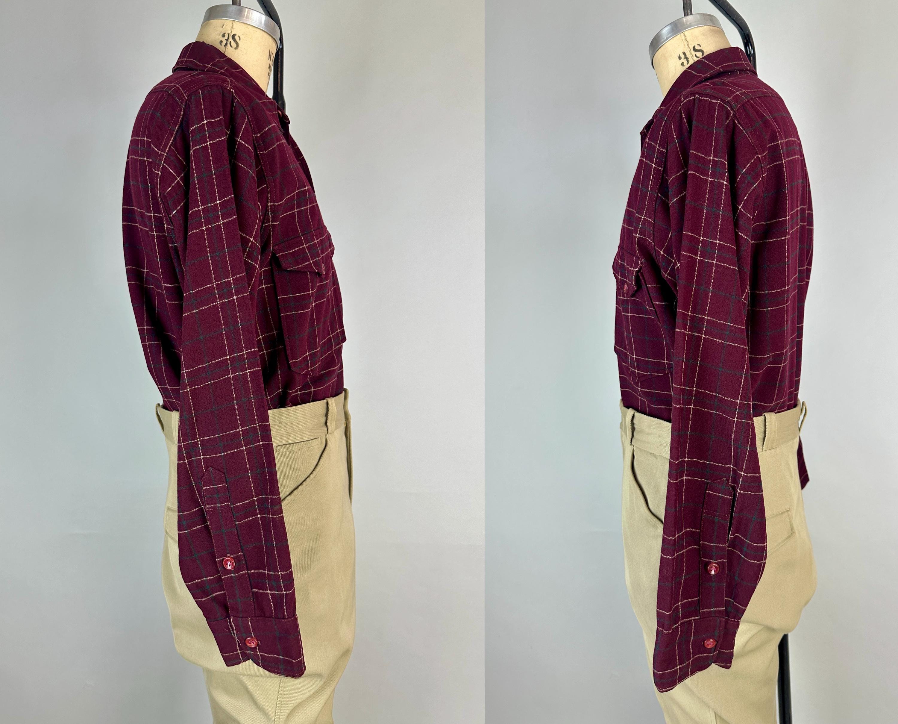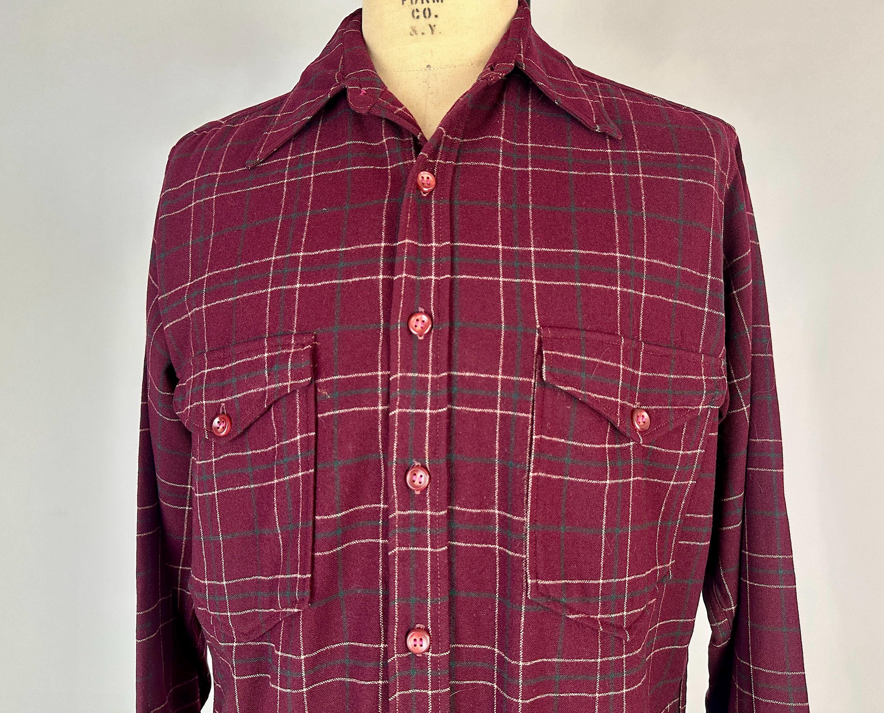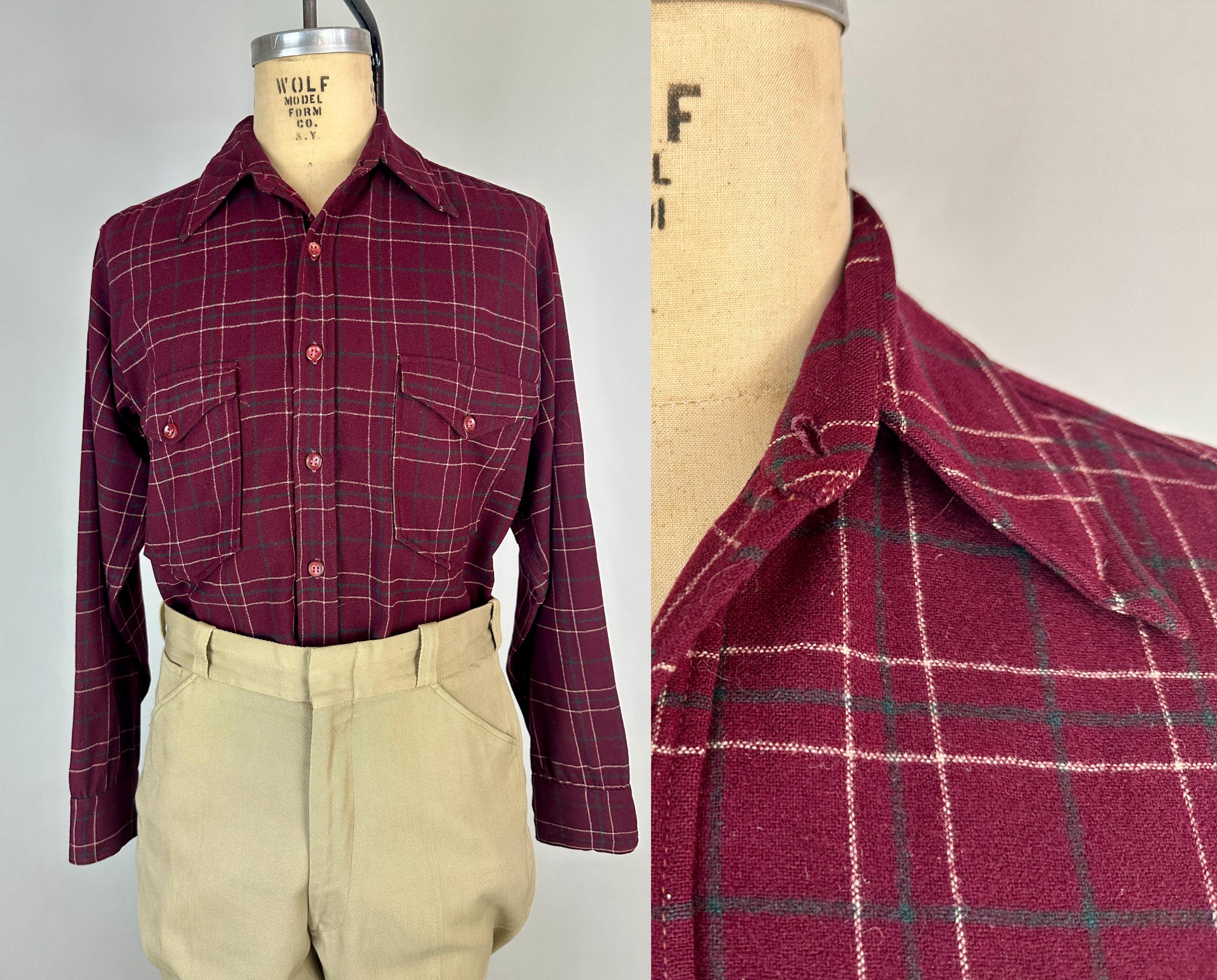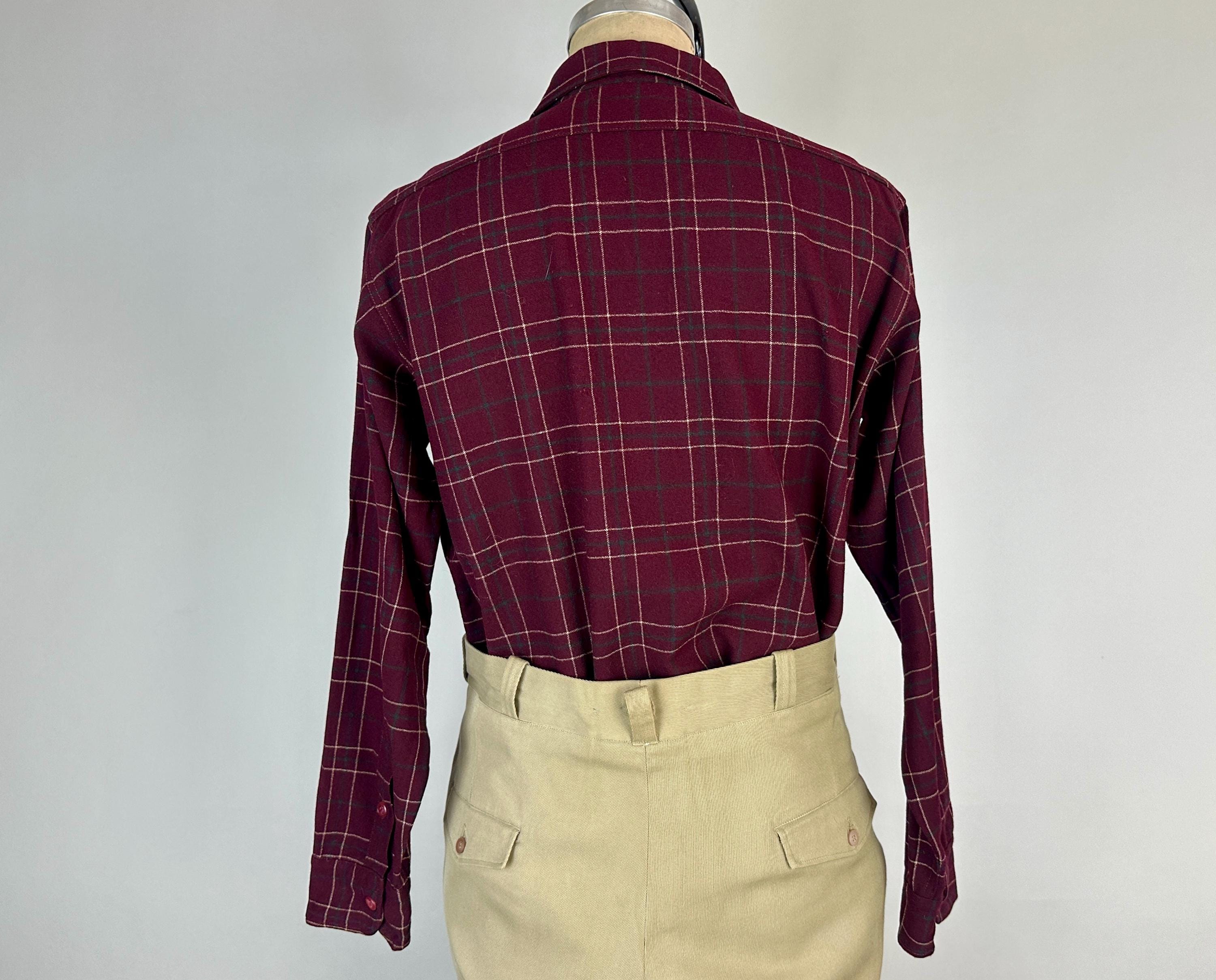 A lumberjack knows their way around in the woods, and you will too when you don this 1940s "Pendleton" button up shirt! Perfect for an outdoorsy adventure, the wool flannel is a plaid of maroon, white, and pine green. Known as the "Field Shirt", there are two chest patch pockets with buttoning flaps, easy to roll up buttoning cuffs, and split curve hem. This shirt is in great vintage condition, with no holes, stains, odors to note.