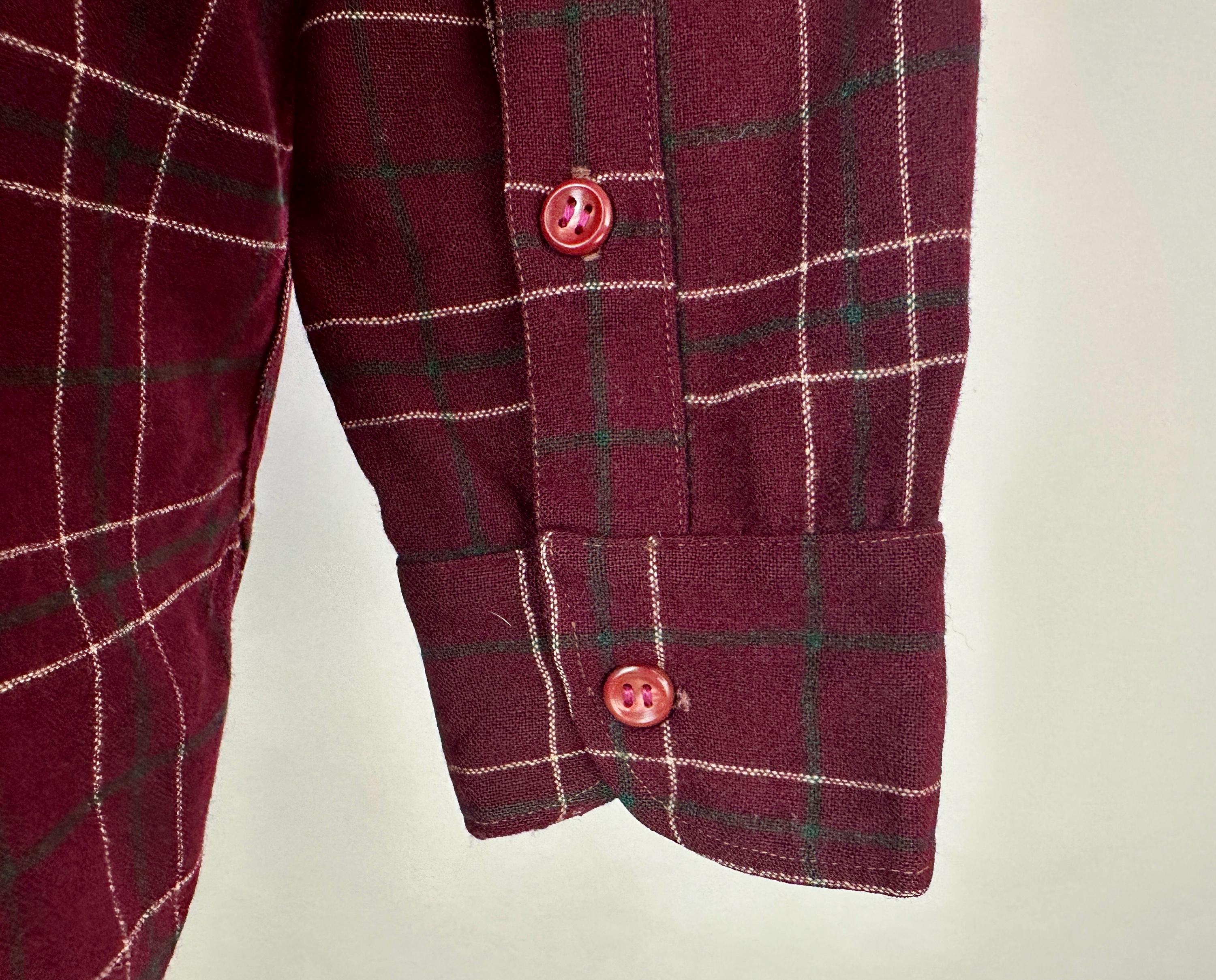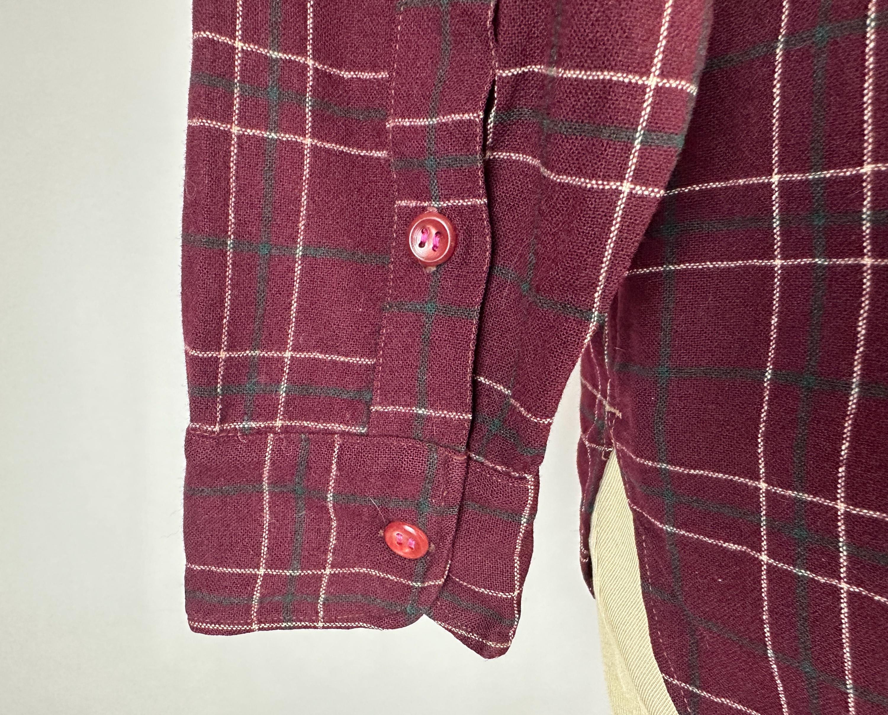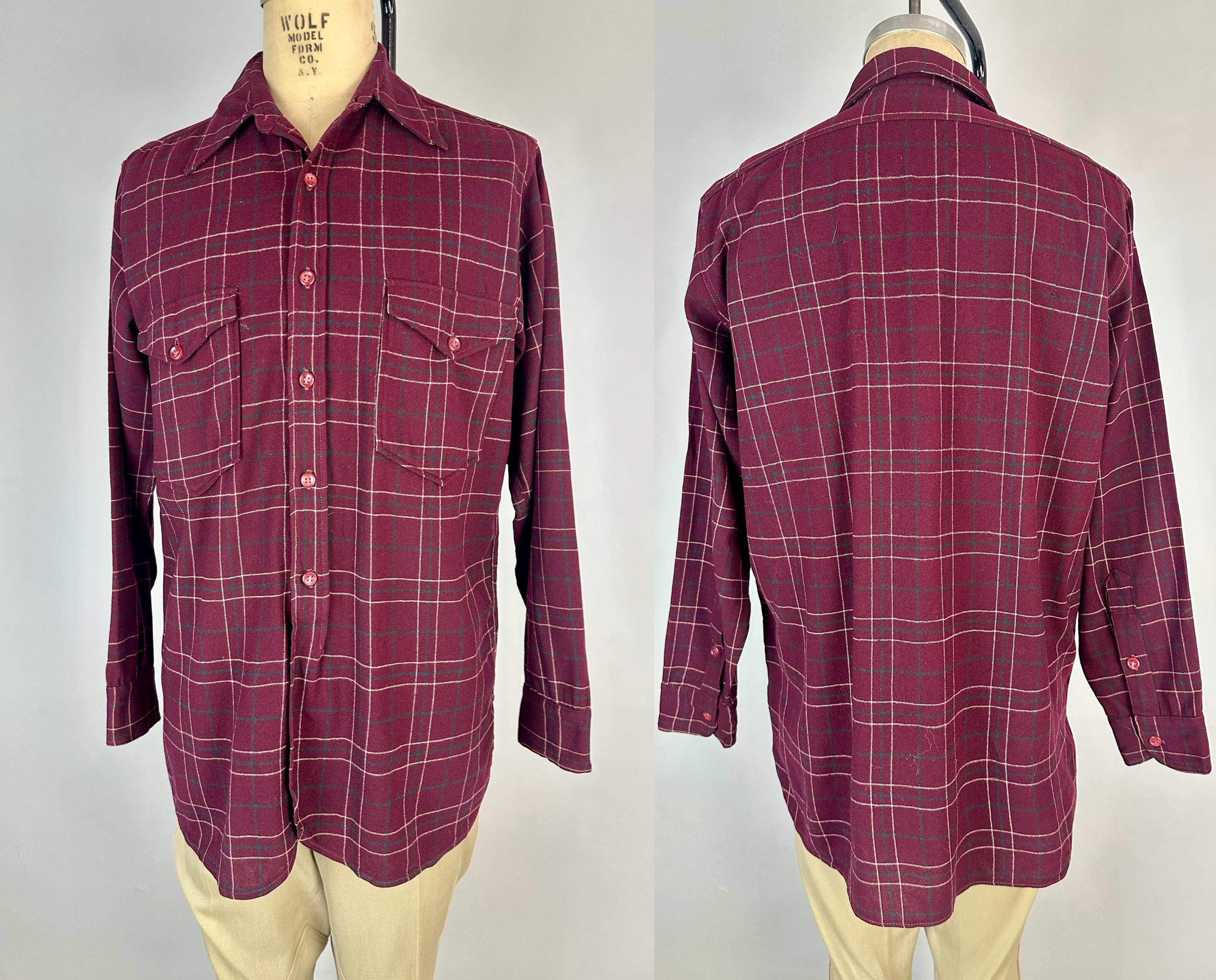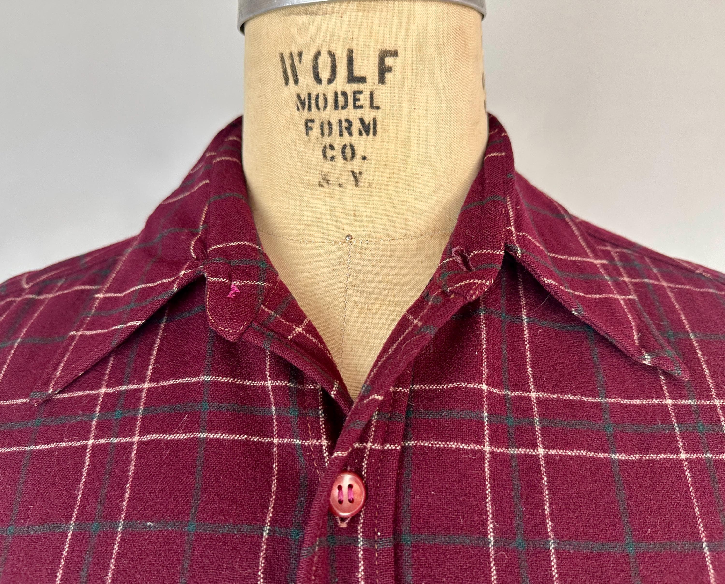 A lumberjack knows their way around in the woods, and you will too when you don this 1940s "Pendleton" button up shirt! Perfect for an outdoorsy adventure, the wool flannel is a plaid of maroon, white, and pine green. Known as the "Field Shirt", there are two chest patch pockets with buttoning flaps, easy to roll up buttoning cuffs, and split curve hem. This shirt is in great vintage condition, with no holes, stains, odors to note.
