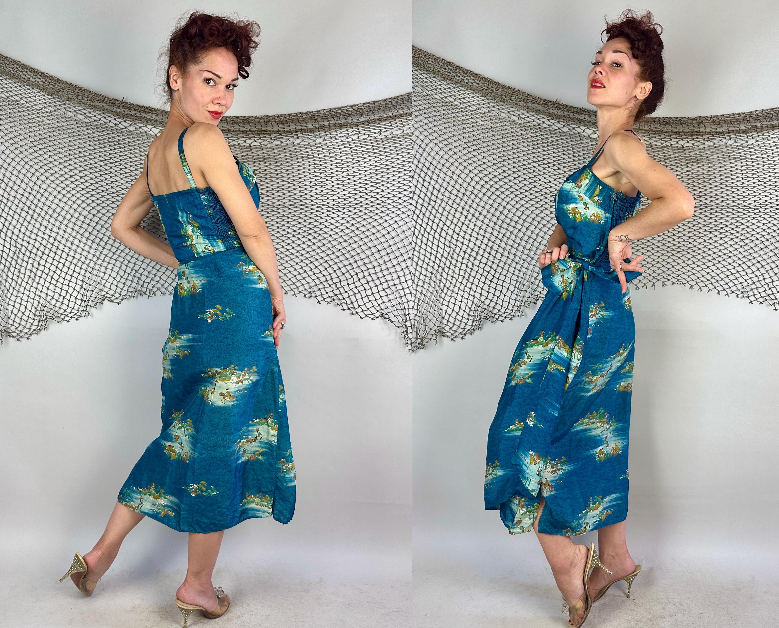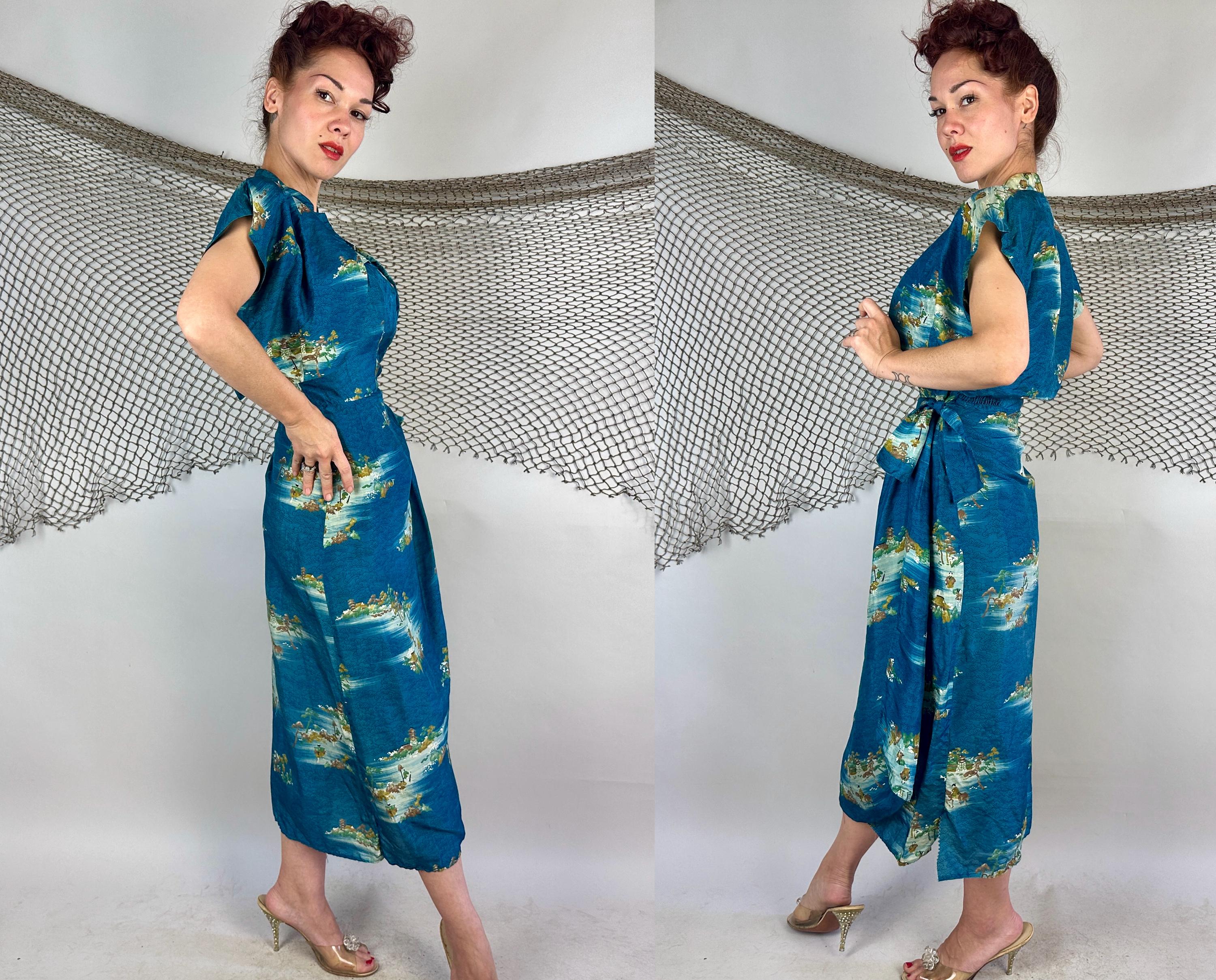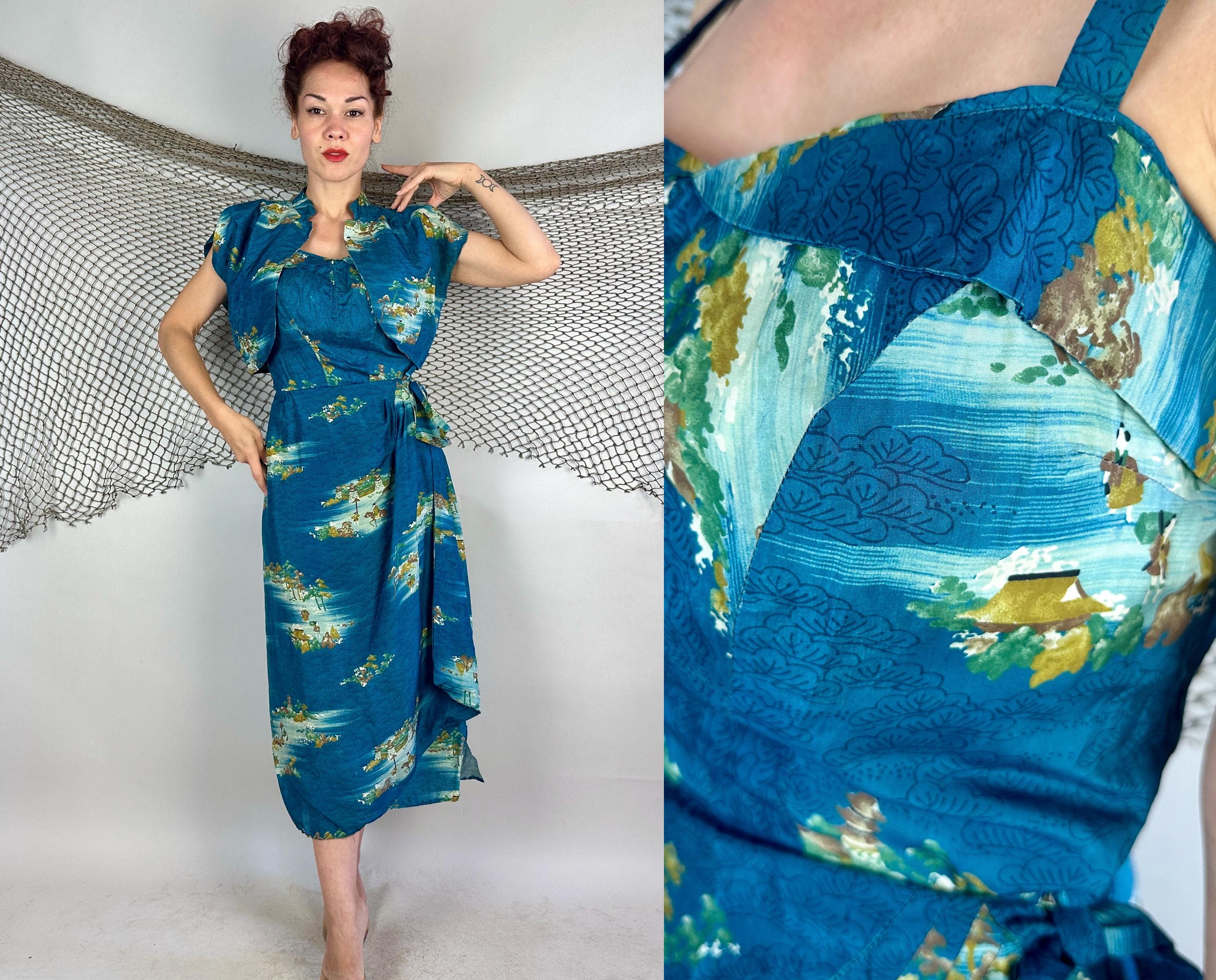 You'll be purely in paradise dressing up in this 1950s Hawaiian ensemble! The sarong style frock and bolero are all silk, mainly a teal blue with watercolour style depictions of village life adding touches of white, ochre, walnut, and moss green. The dress features a fold over sweetheart neckline with center ruching down the bust, built in boned bra, two panels of shirring on the back sides of the torso, and faux wrap skirt with pleating at the hip where functional ties cinch the waist gently. Metal "Talon" zipper on the side. The matching bolero is perfect for coverng up in the breeze and is styled with a notched collar, padded shoulders, and open front with a gracefully curved cut. From “Paradise Hawaii" and made in Honolulu. This set is in great vintage condition, with no holes, stains, or odors to note.