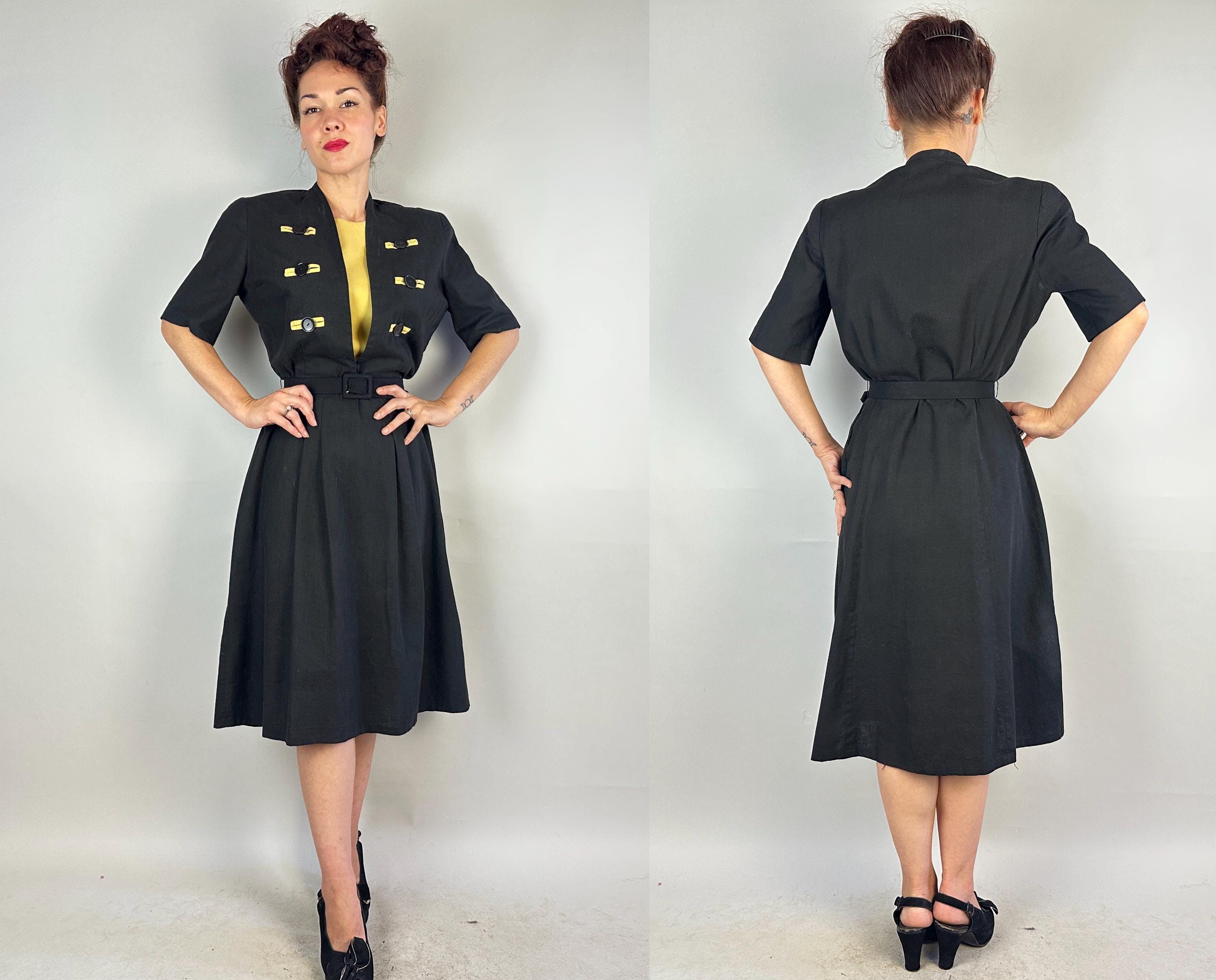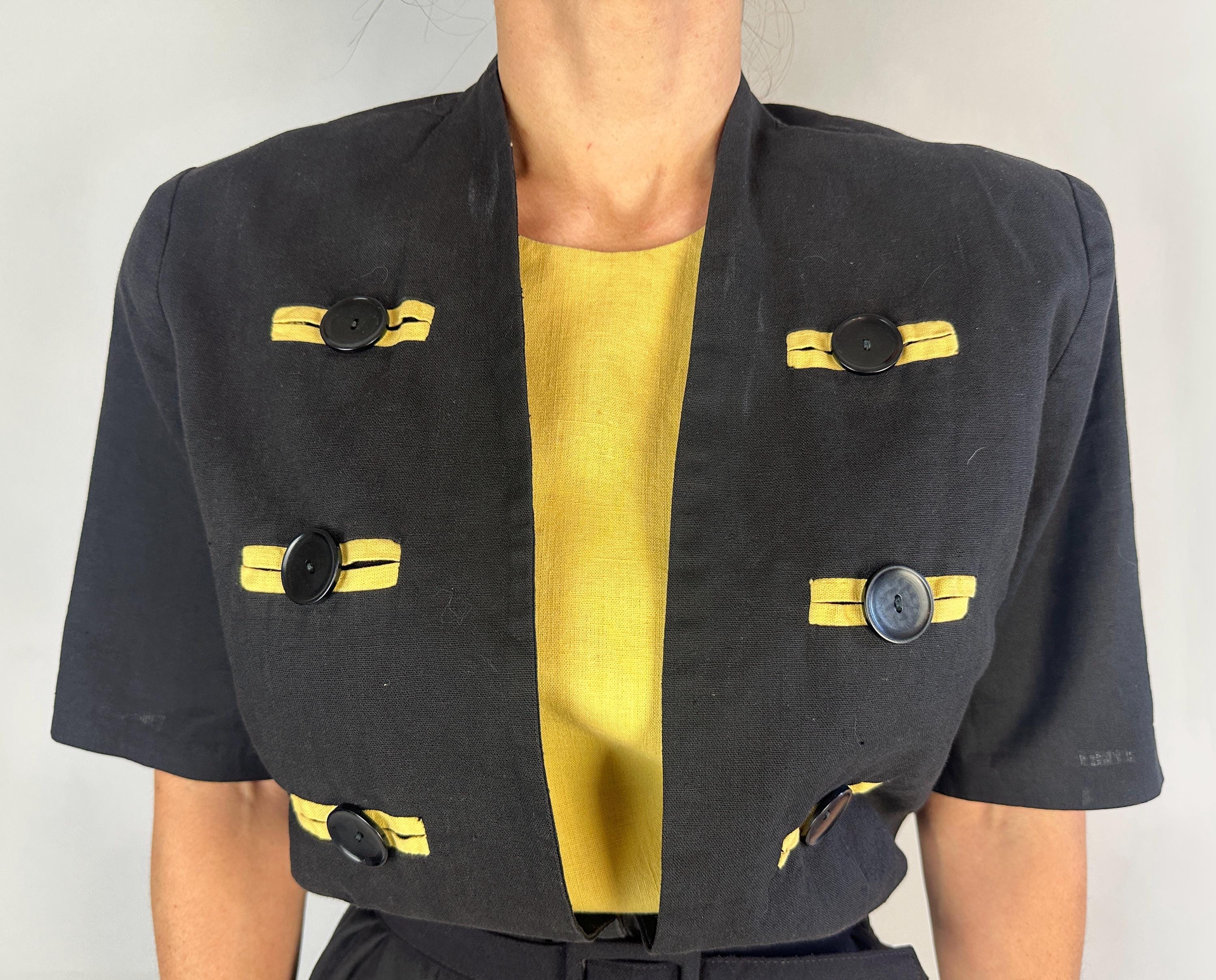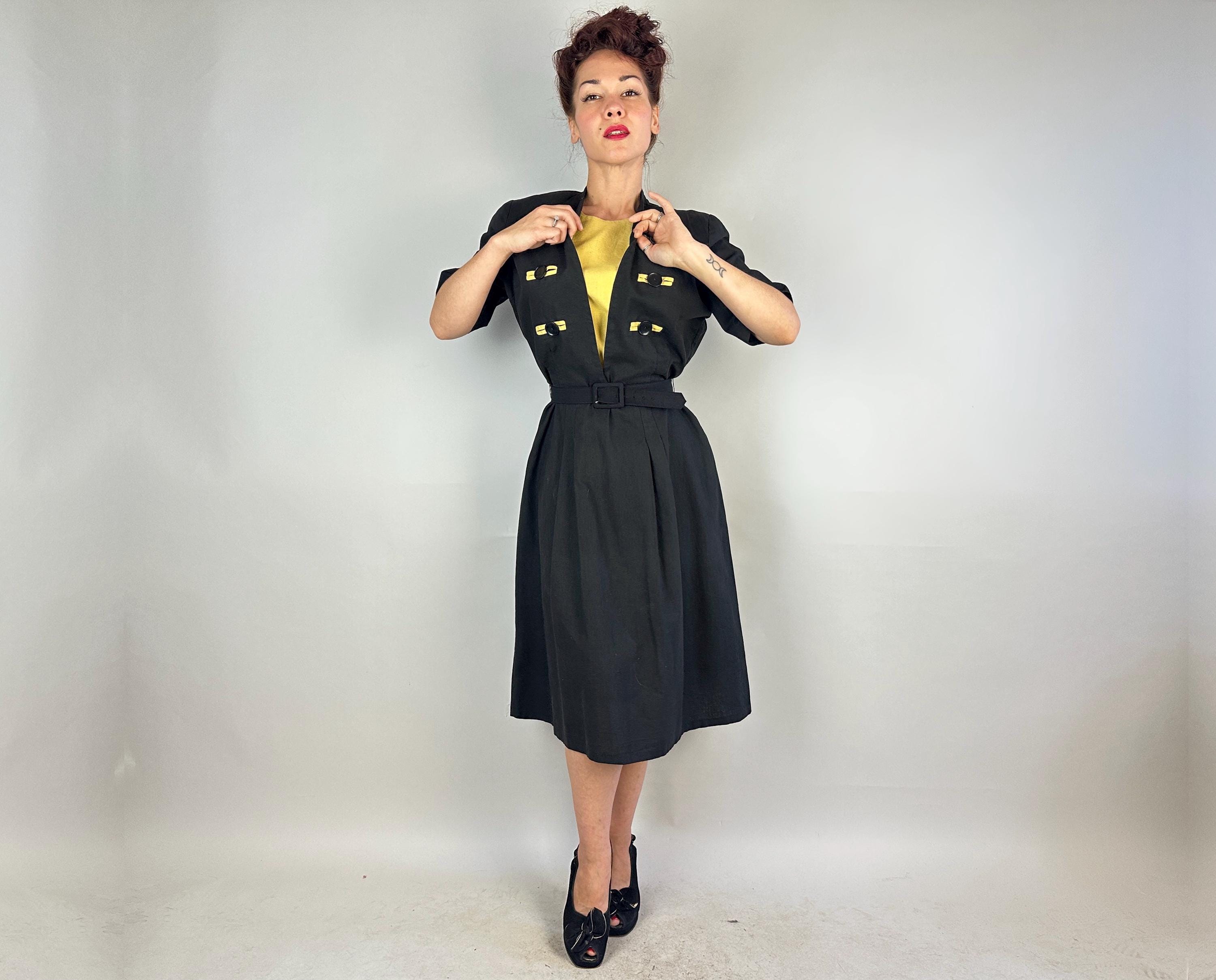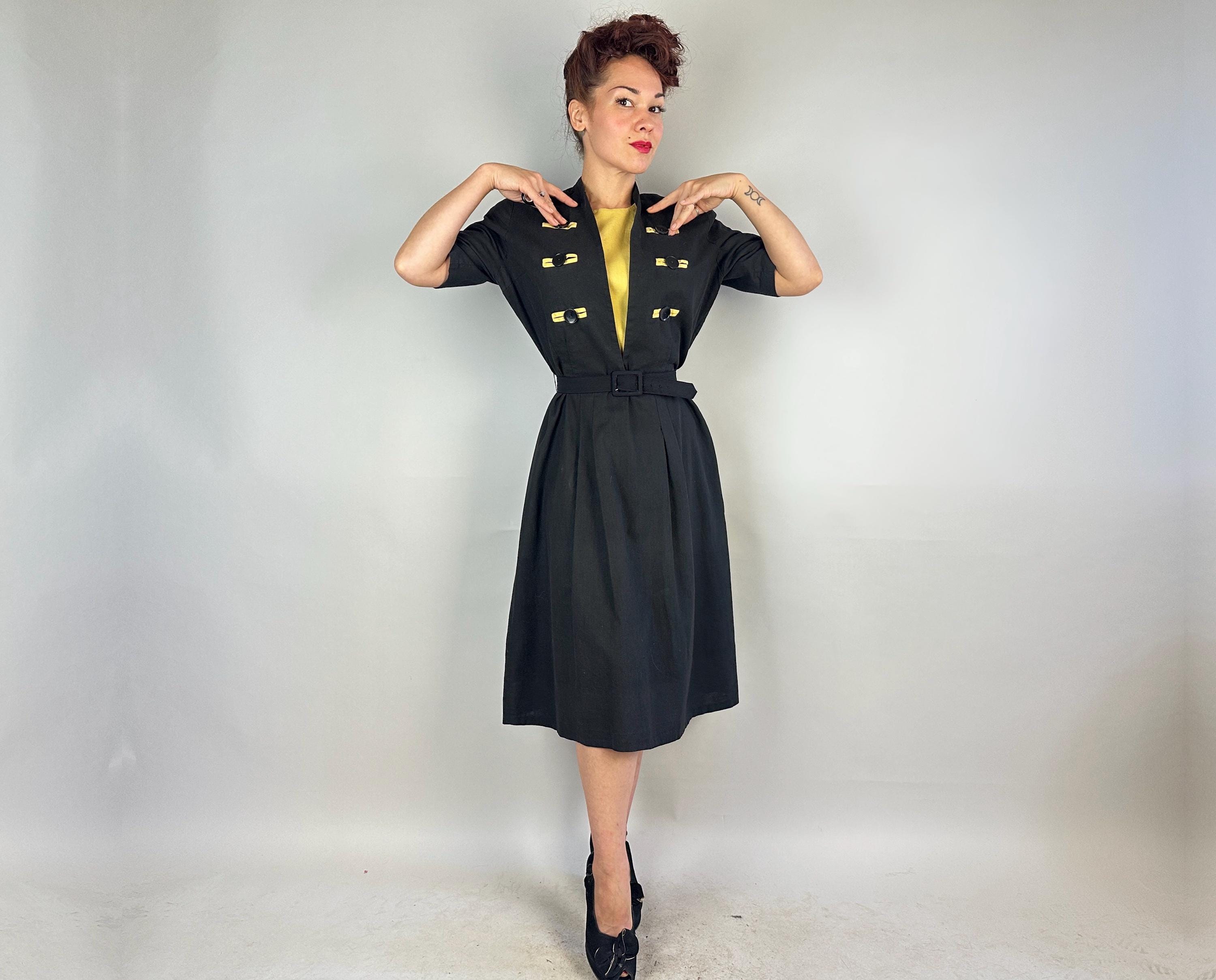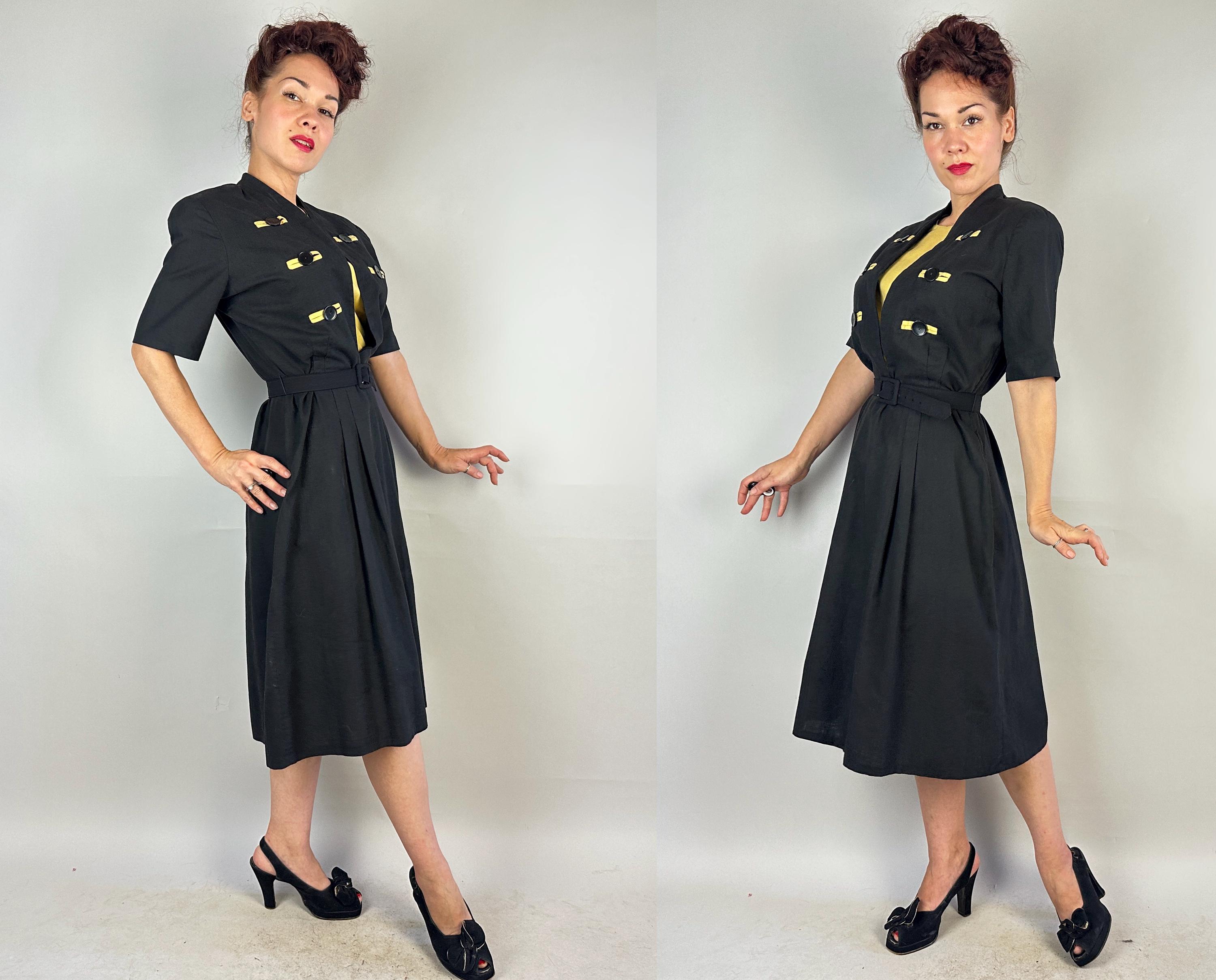 You'll be cute, chic, and just a treat in this 1940's frock! This linen cotton dress is mainly black and baby chick yellow makes a pop as a placket on the bodice and lining the faux button holes centered with large black buttons for decorative purposes. The shoulders are padded and mirrored darts above and below the waist add lovley shaping. Metal zipper on the side and the placket snaps inside one shoulder for invisible fastening. This dress is in great vintage condition, with no holes, stains, or odors to note. Please note, belt is model's own.