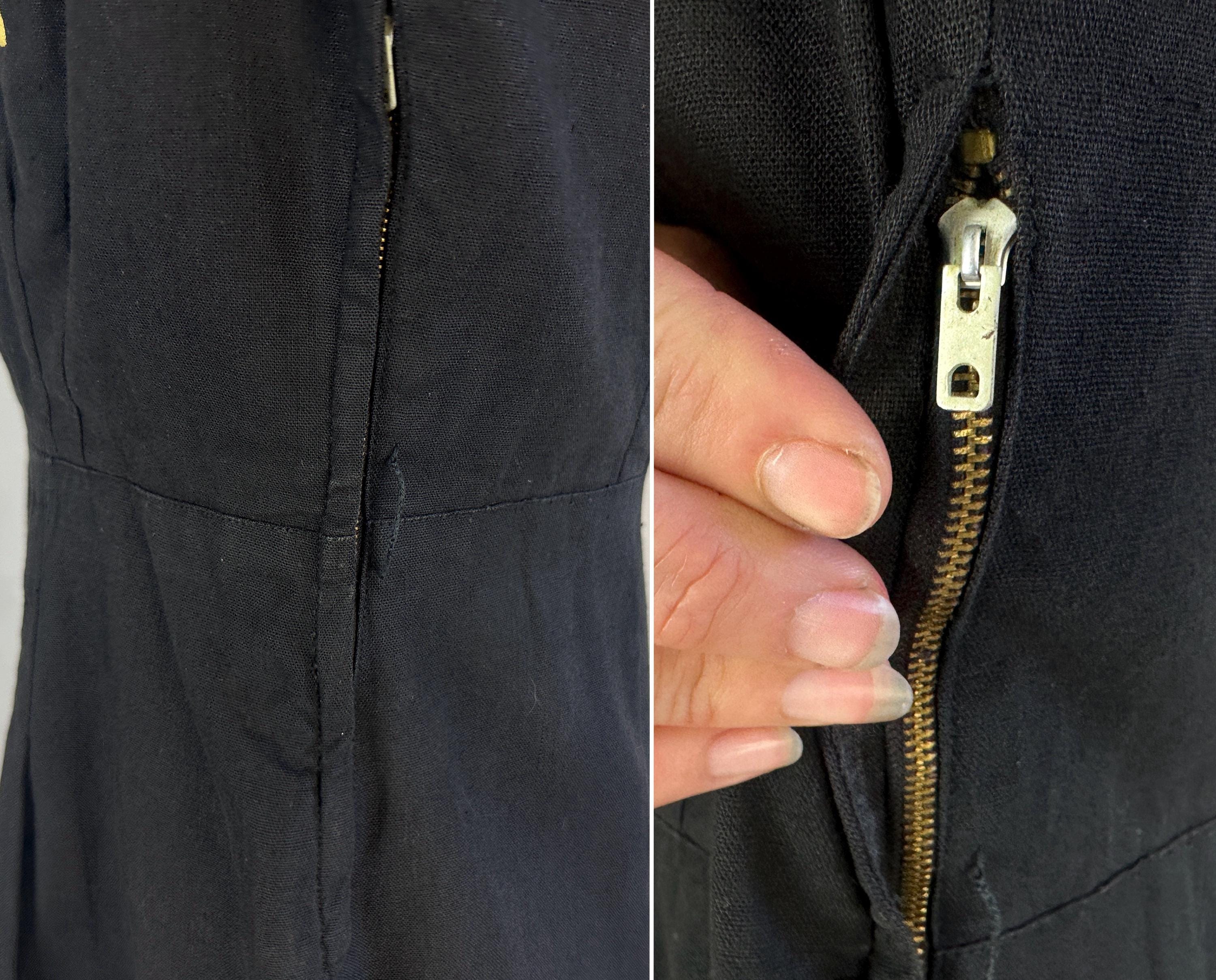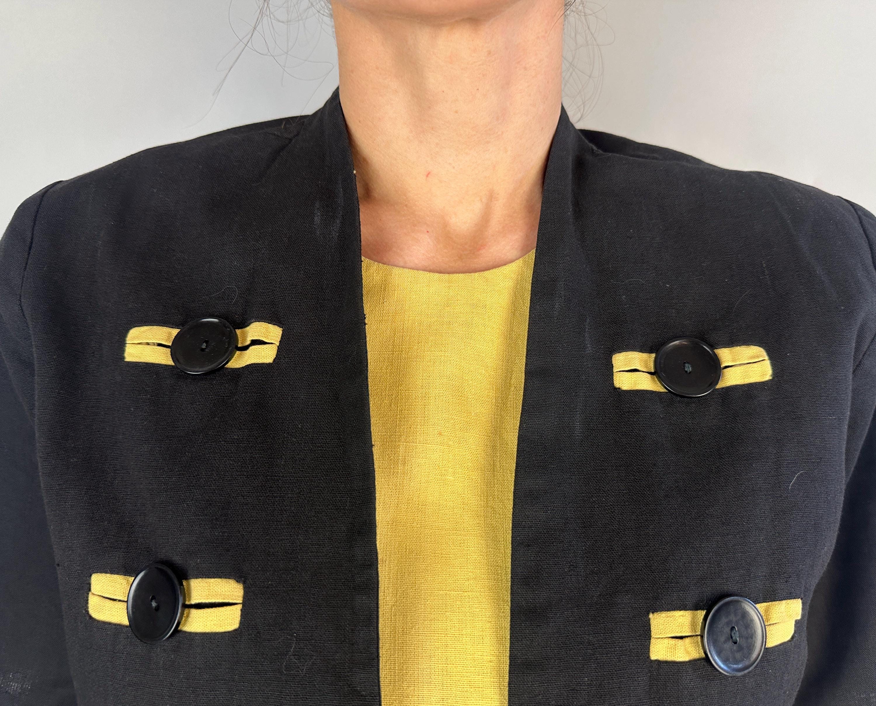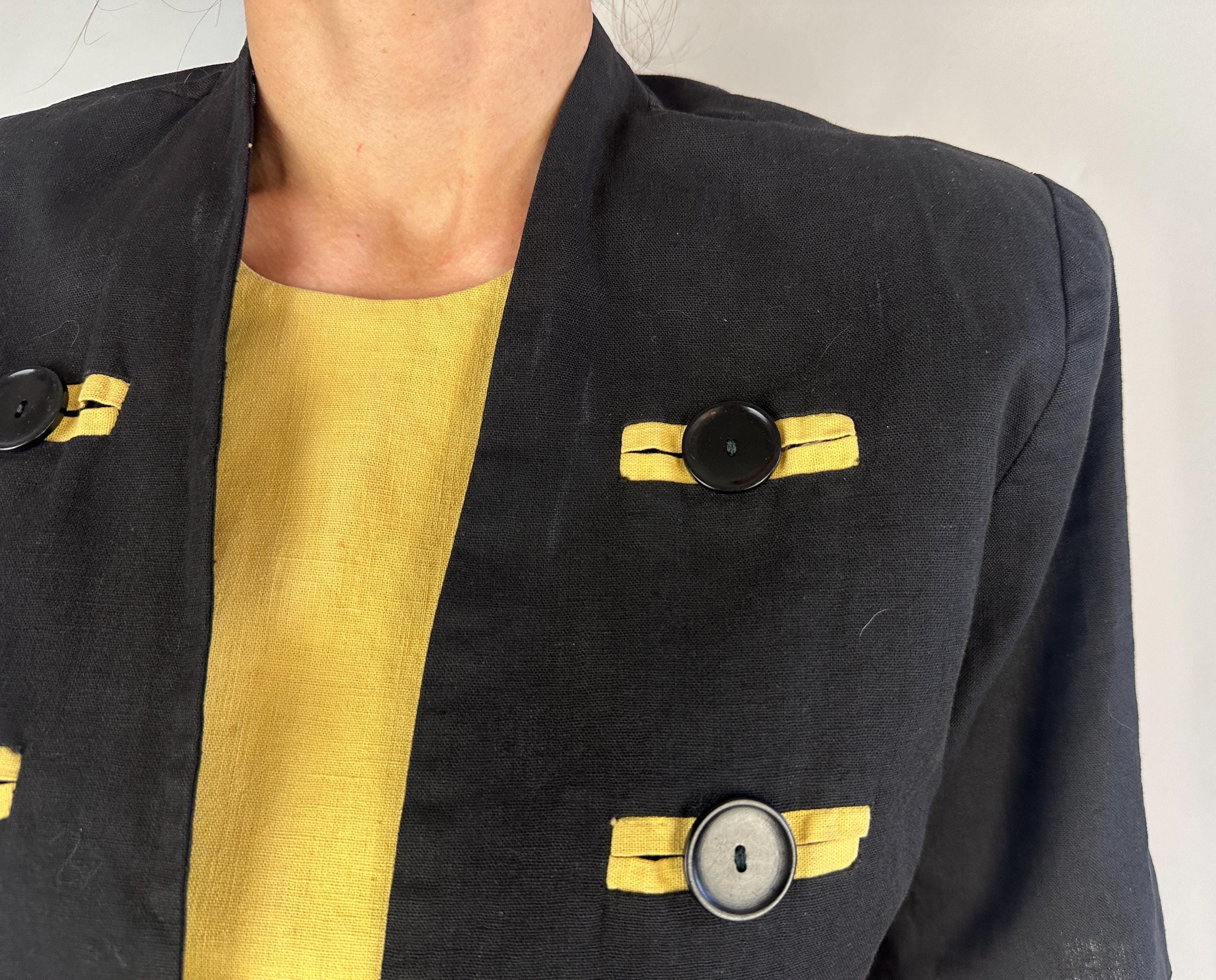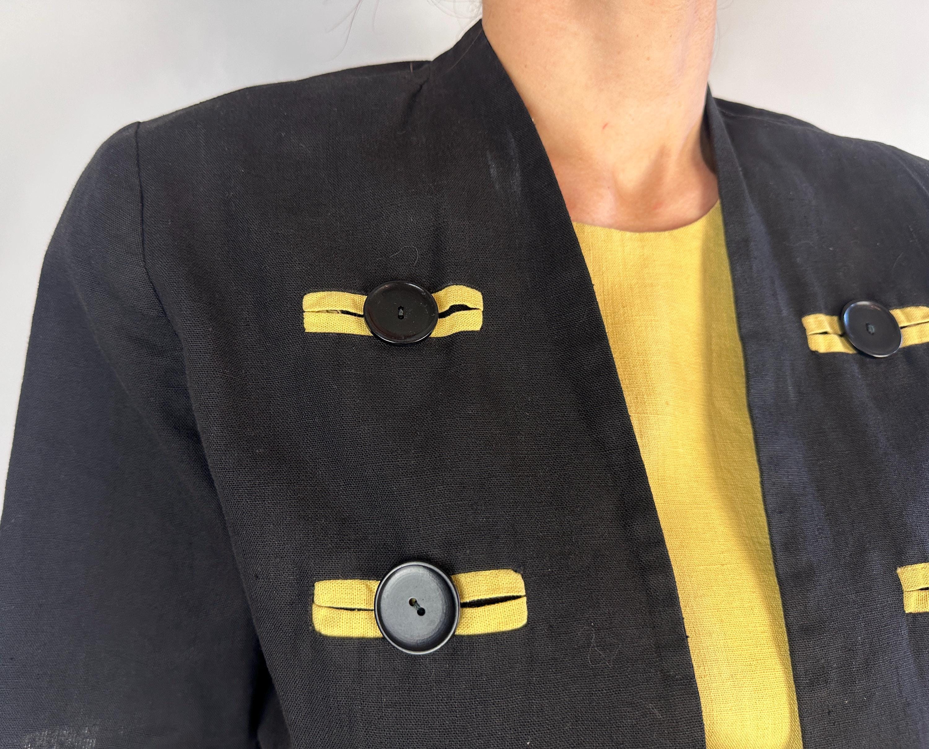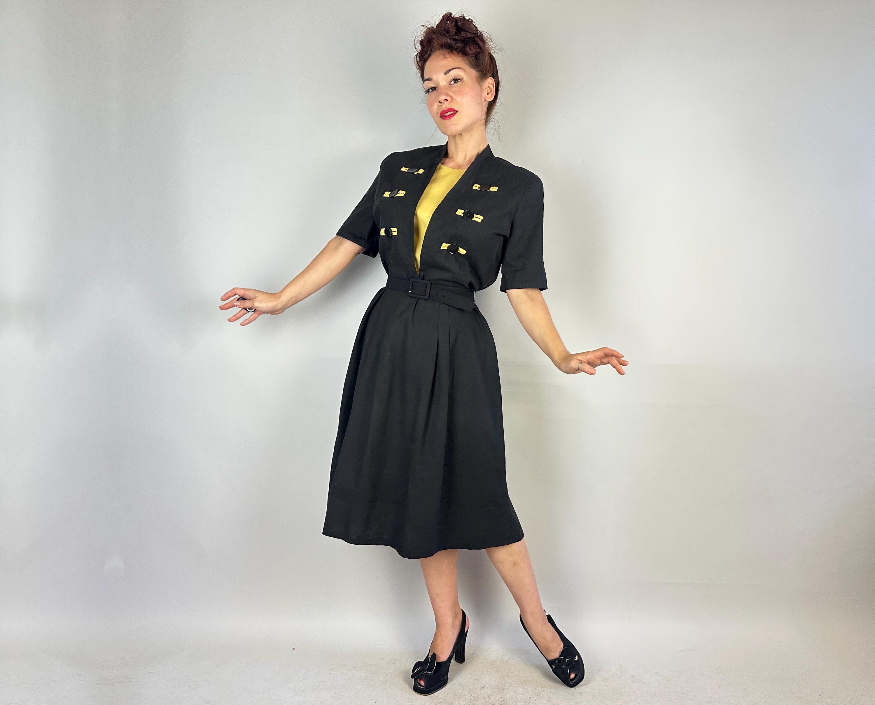 You'll be cute, chic, and just a treat in this 1940's frock! This linen cotton dress is mainly black and baby chick yellow makes a pop as a placket on the bodice and lining the faux button holes centered with large black buttons for decorative purposes. The shoulders are padded and mirrored darts above and below the waist add lovley shaping. Metal zipper on the side and the placket snaps inside one shoulder for invisible fastening. This dress is in great vintage condition, with no holes, stains, or odors to note. Please note, belt is model's own.