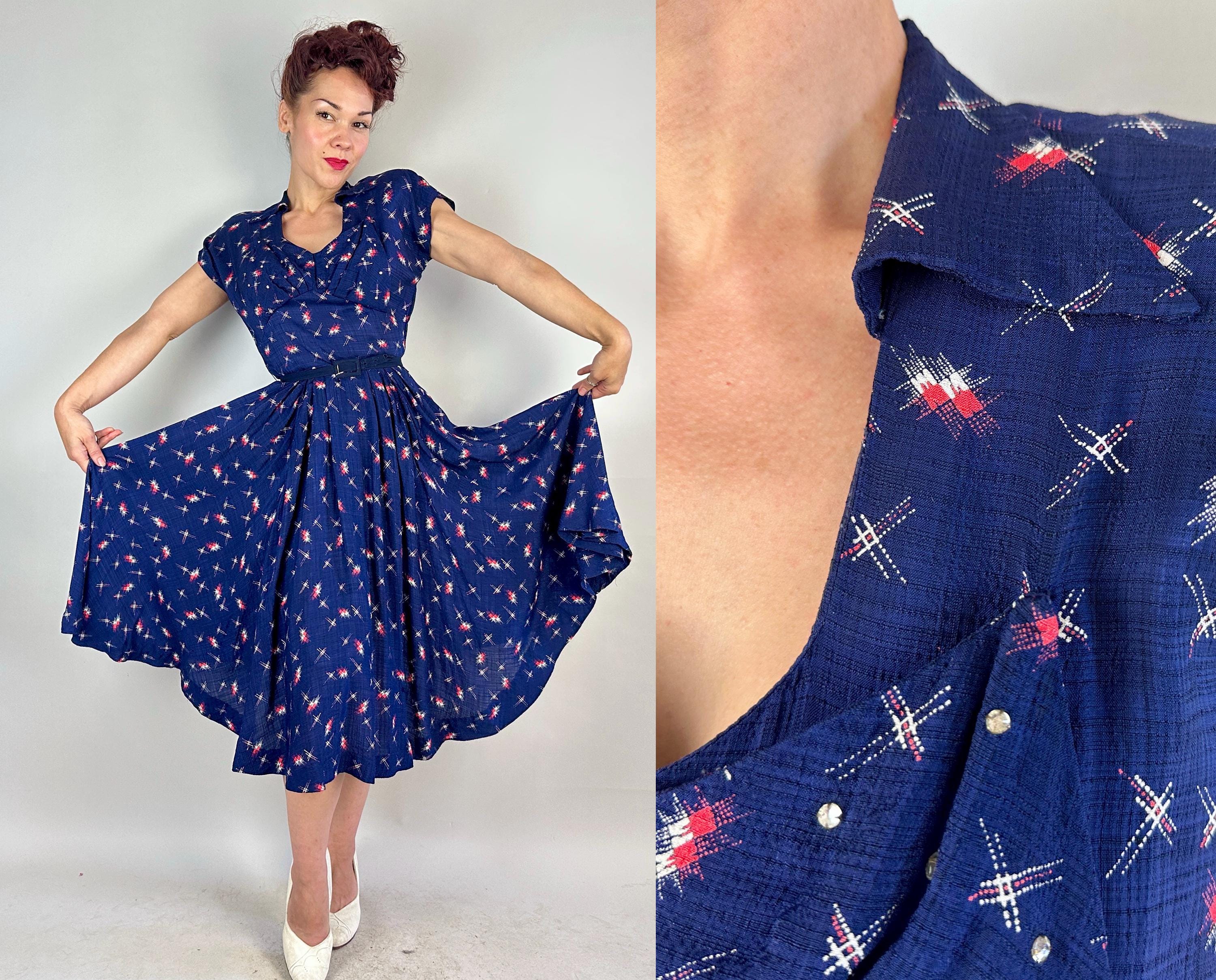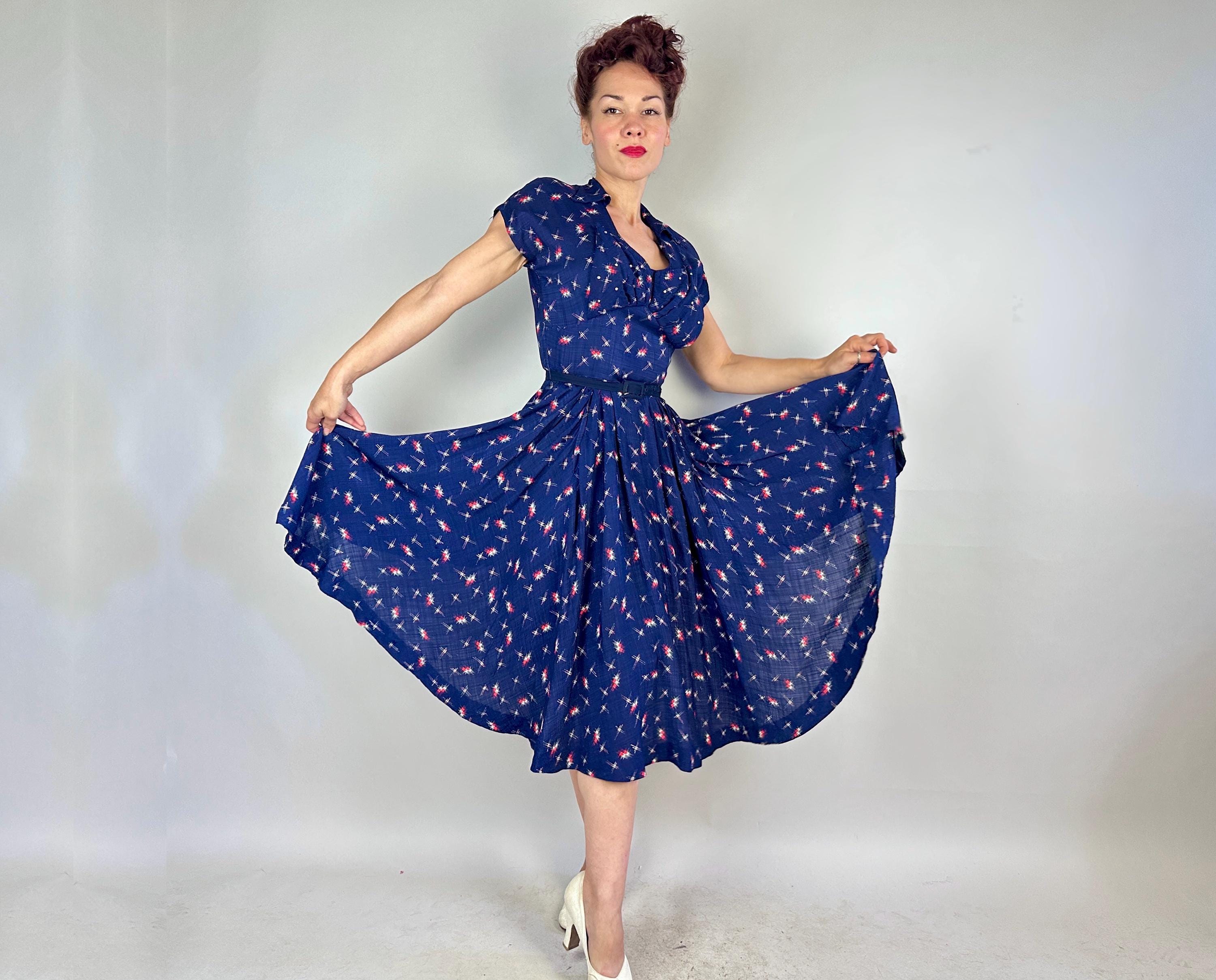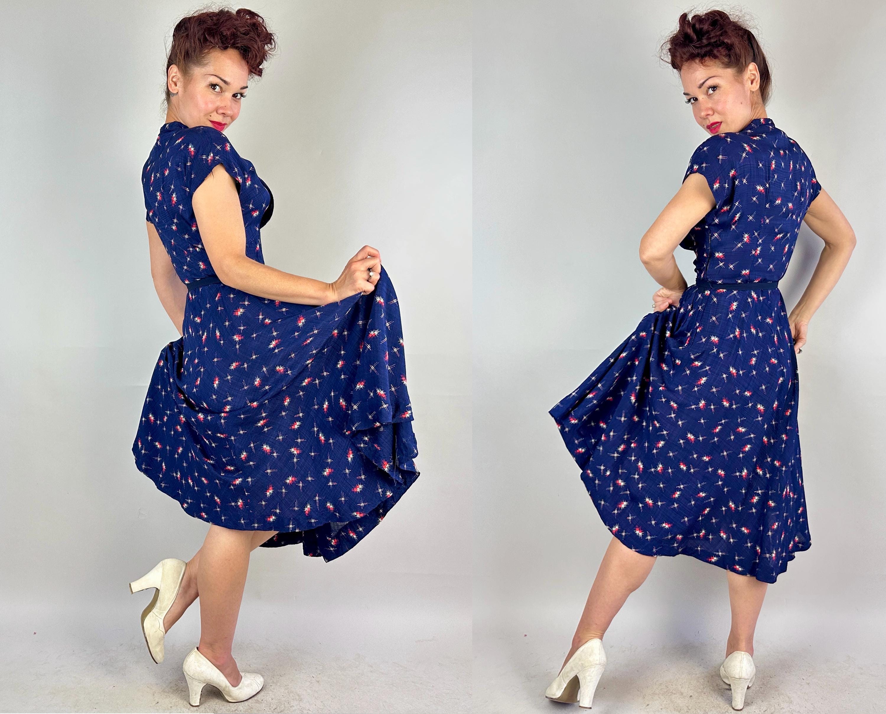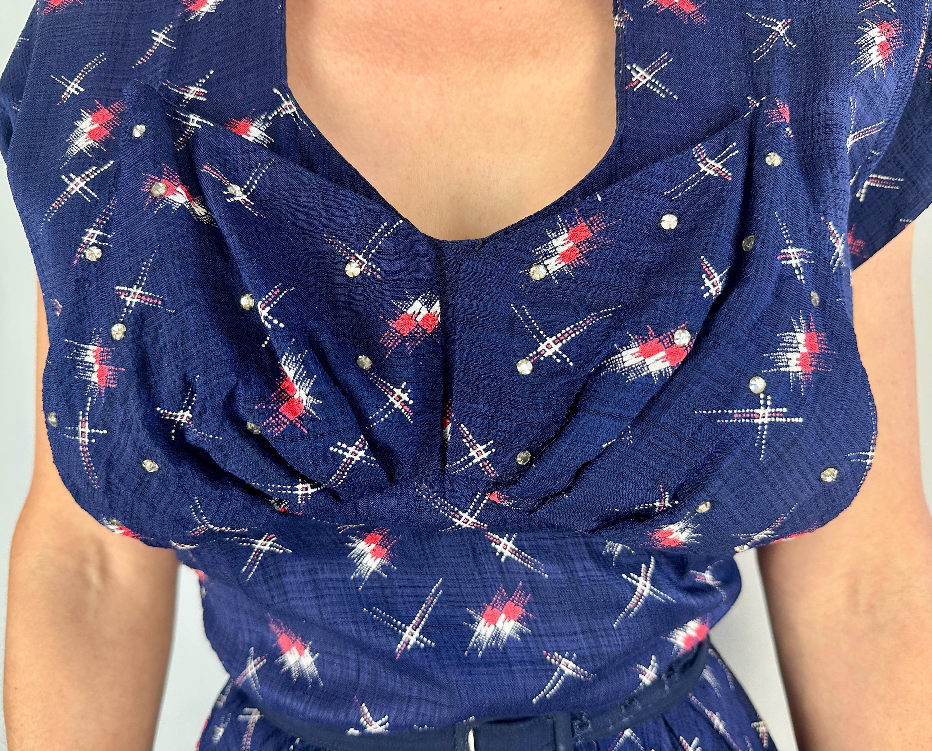 Would you like to swing on a star? This 1940s dress will help you carry moonbeams home in a jar! Made of a midnight blue slub textured rayon with a pattern of starlight twinkles in white and scarlet and a scattering of rhinestones on the bust for that true twinkle effect. The pinup perfect cut features a sweetheart neckline with pleated bust petals, fold over pointed collar, padded shoulders, and fitted waist with pleats flaring out the skirt. A muslin liner in the skirt adds to the fullness and a right hand pocket is always a delight. Metal zipper on the side. This dress is in great vintage condition, with no holes, stains, or odors to note.