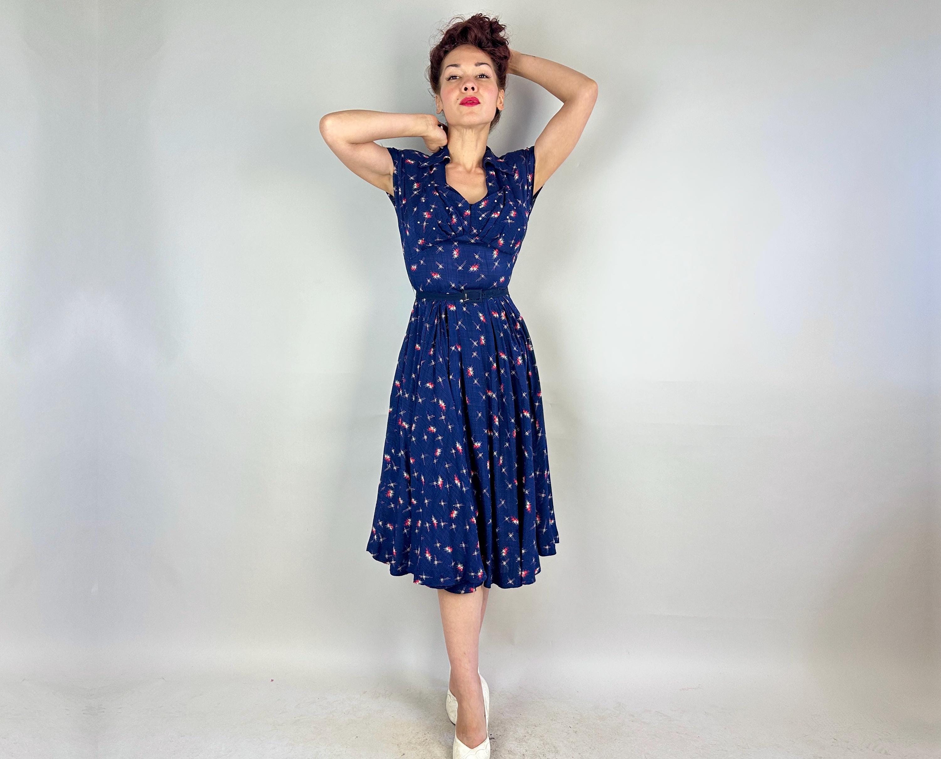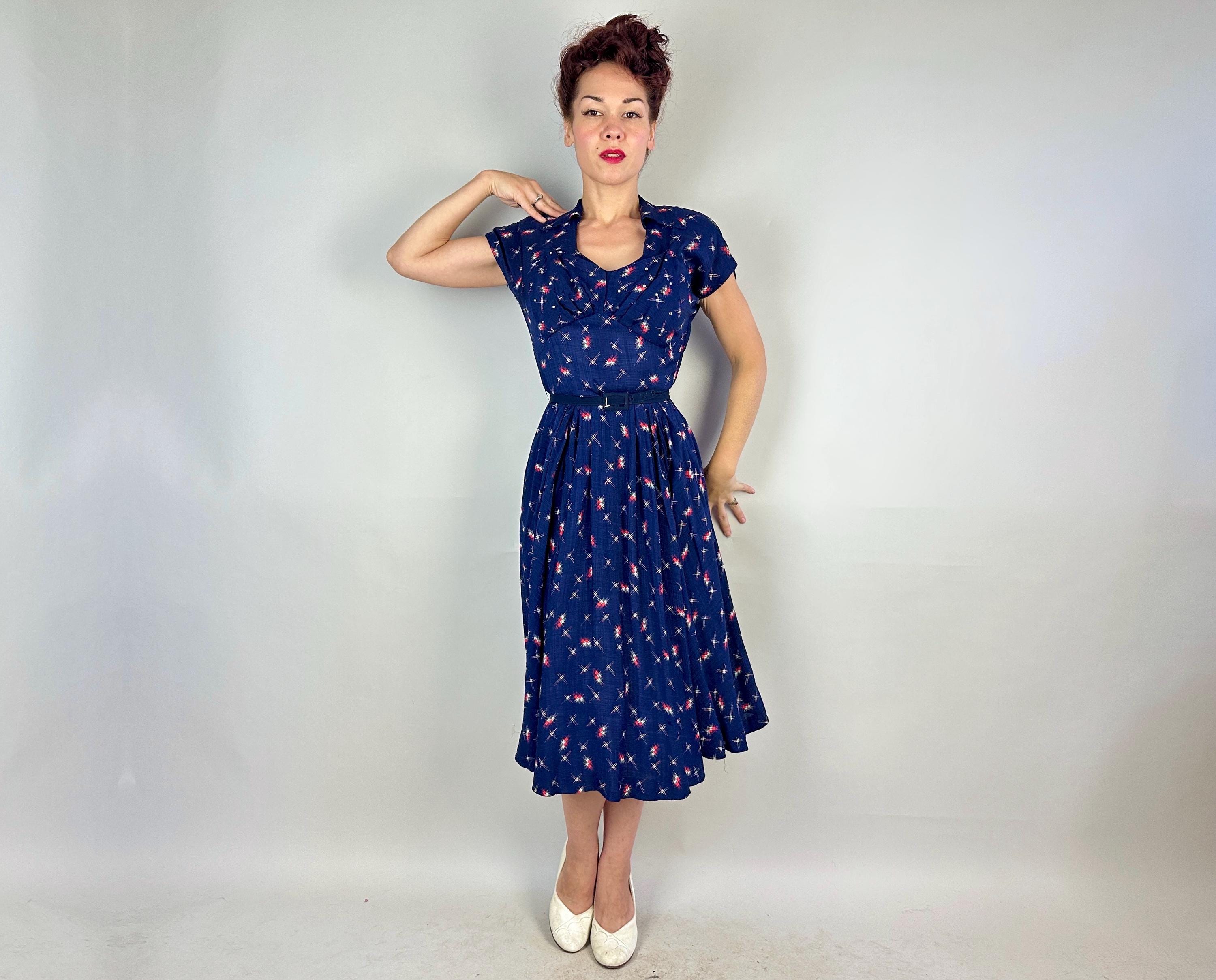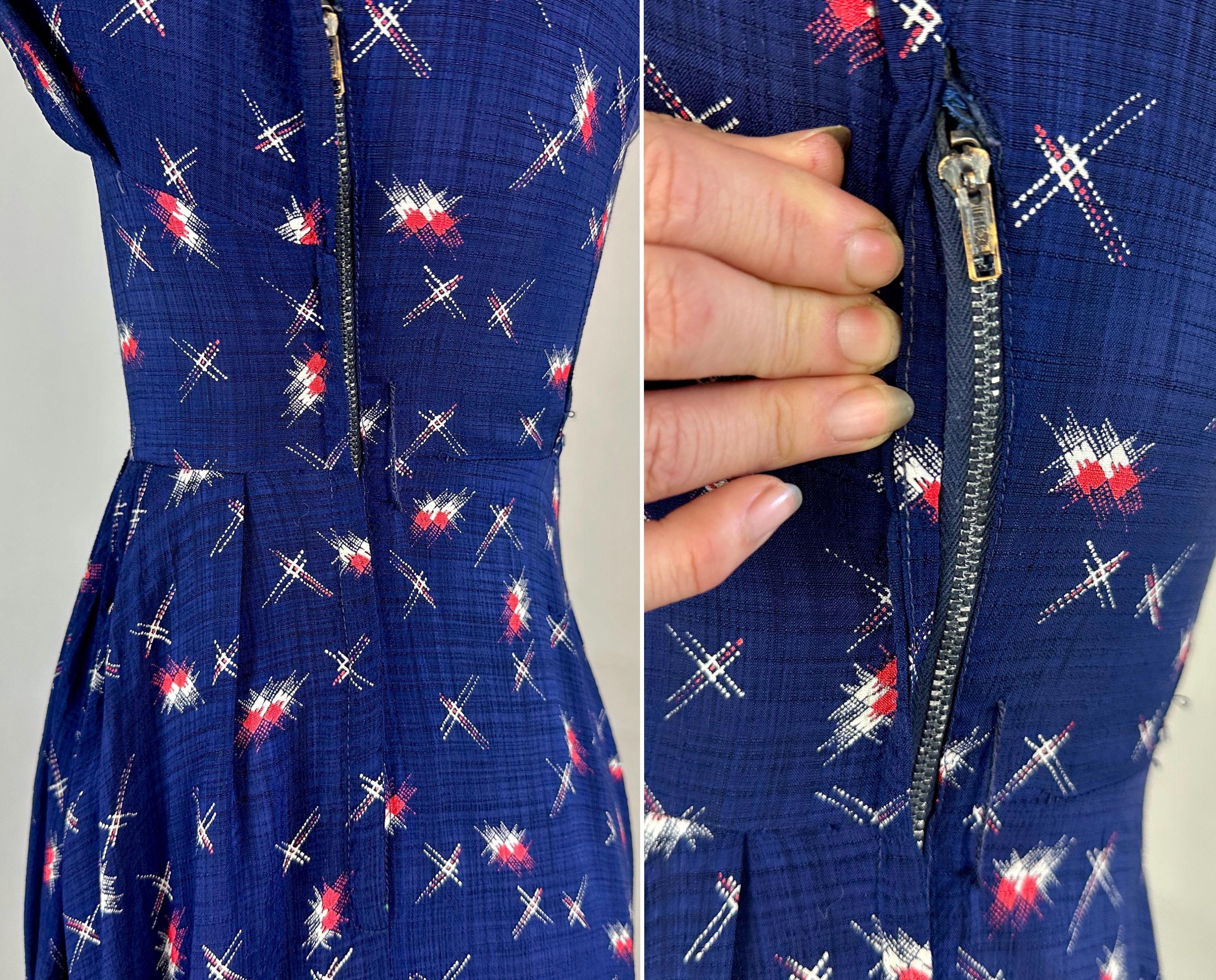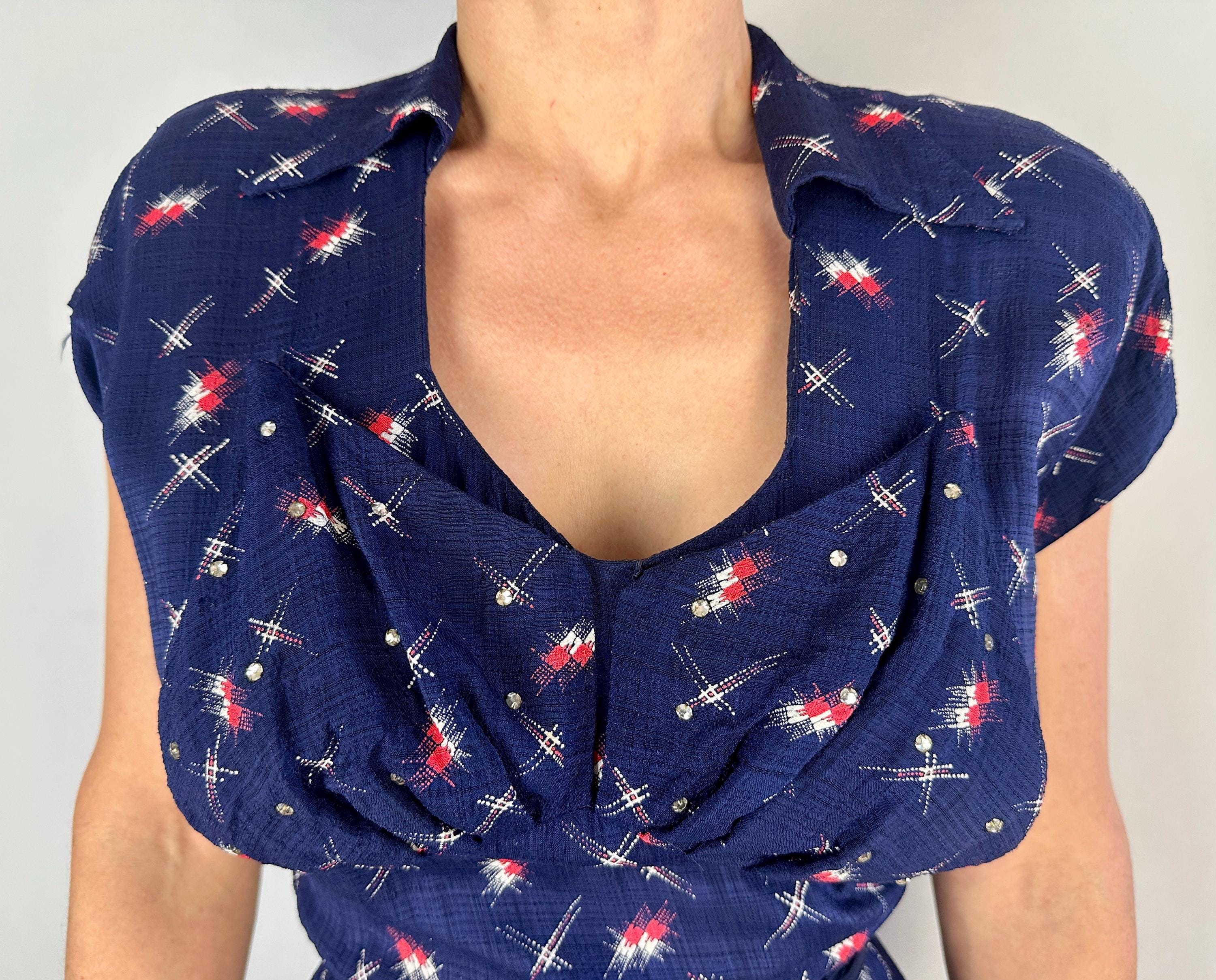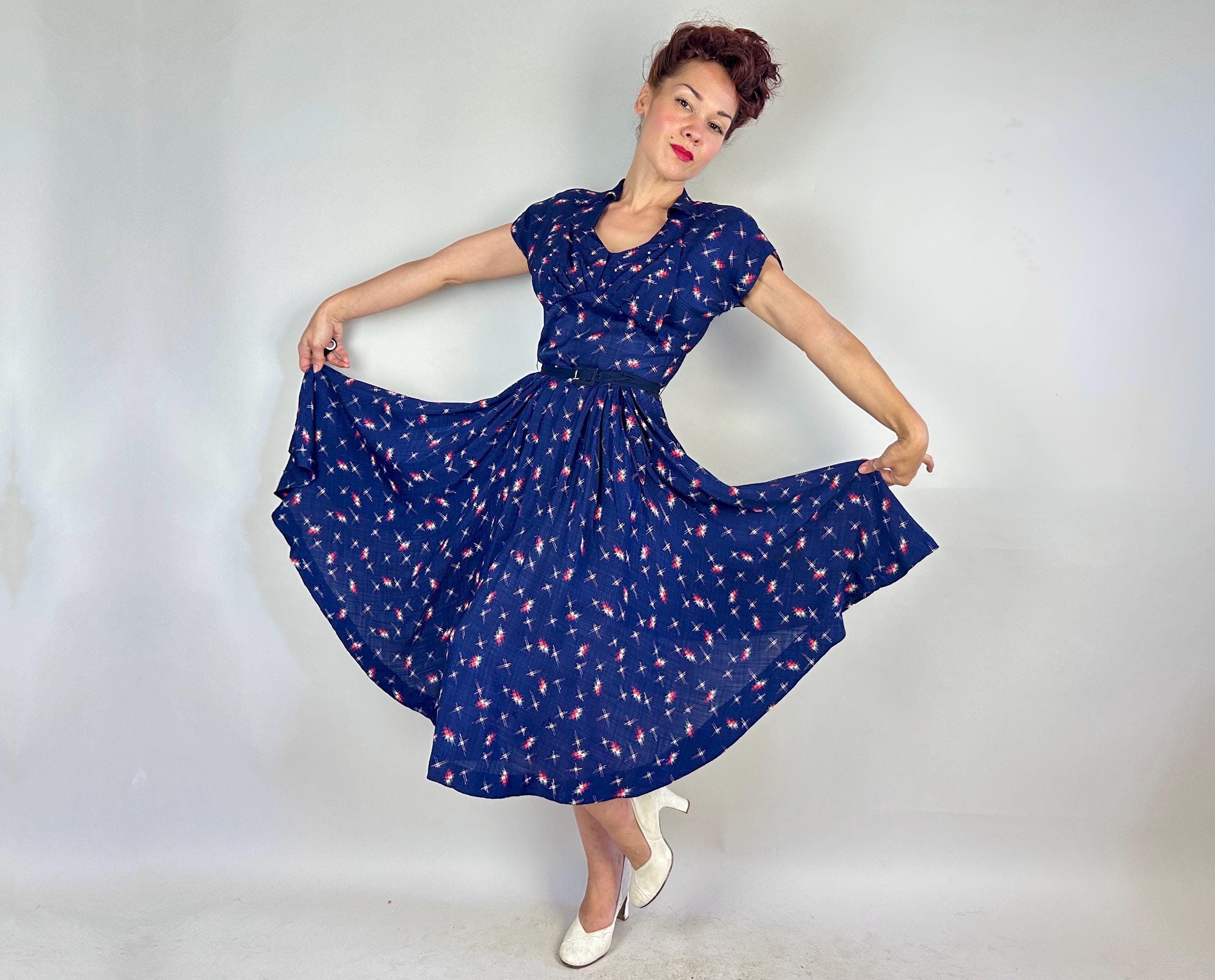 Would you like to swing on a star? This 1940s dress will help you carry moonbeams home in a jar! Made of a midnight blue slub textured rayon with a pattern of starlight twinkles in white and scarlet and a scattering of rhinestones on the bust for that true twinkle effect. The pinup perfect cut features a sweetheart neckline with pleated bust petals, fold over pointed collar, padded shoulders, and fitted waist with pleats flaring out the skirt. A muslin liner in the skirt adds to the fullness and a right hand pocket is always a delight. Metal zipper on the side. This dress is in great vintage condition, with no holes, stains, or odors to note.