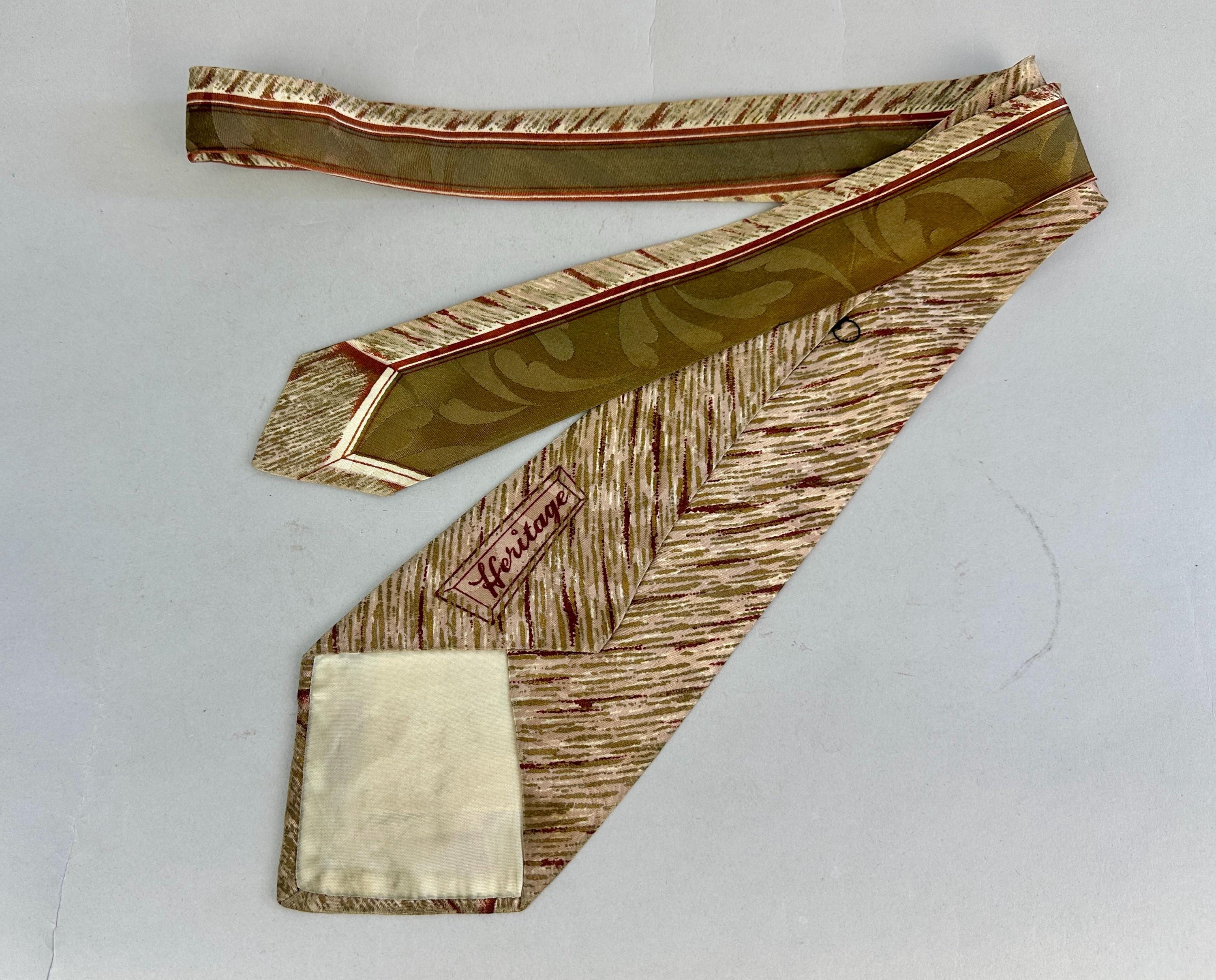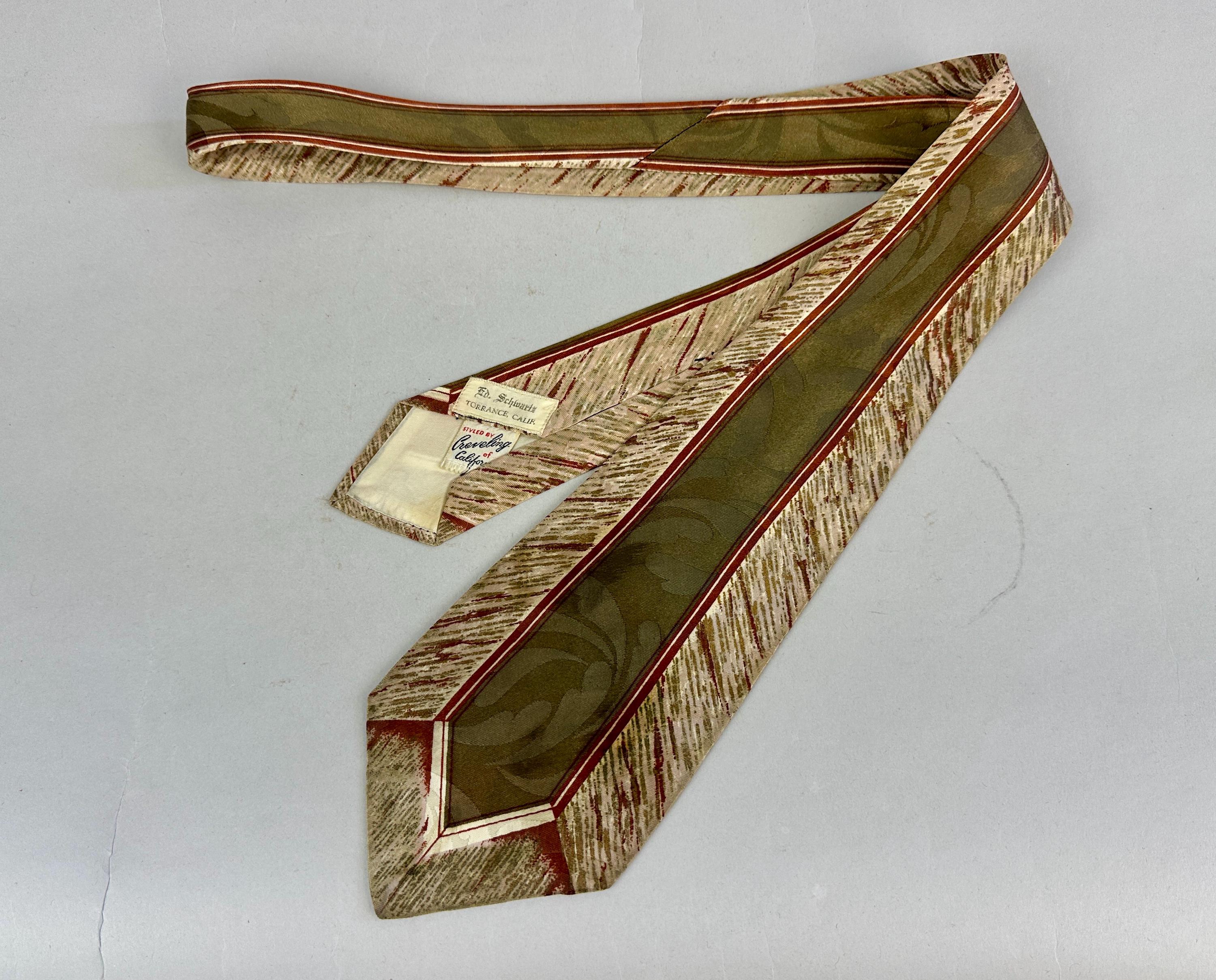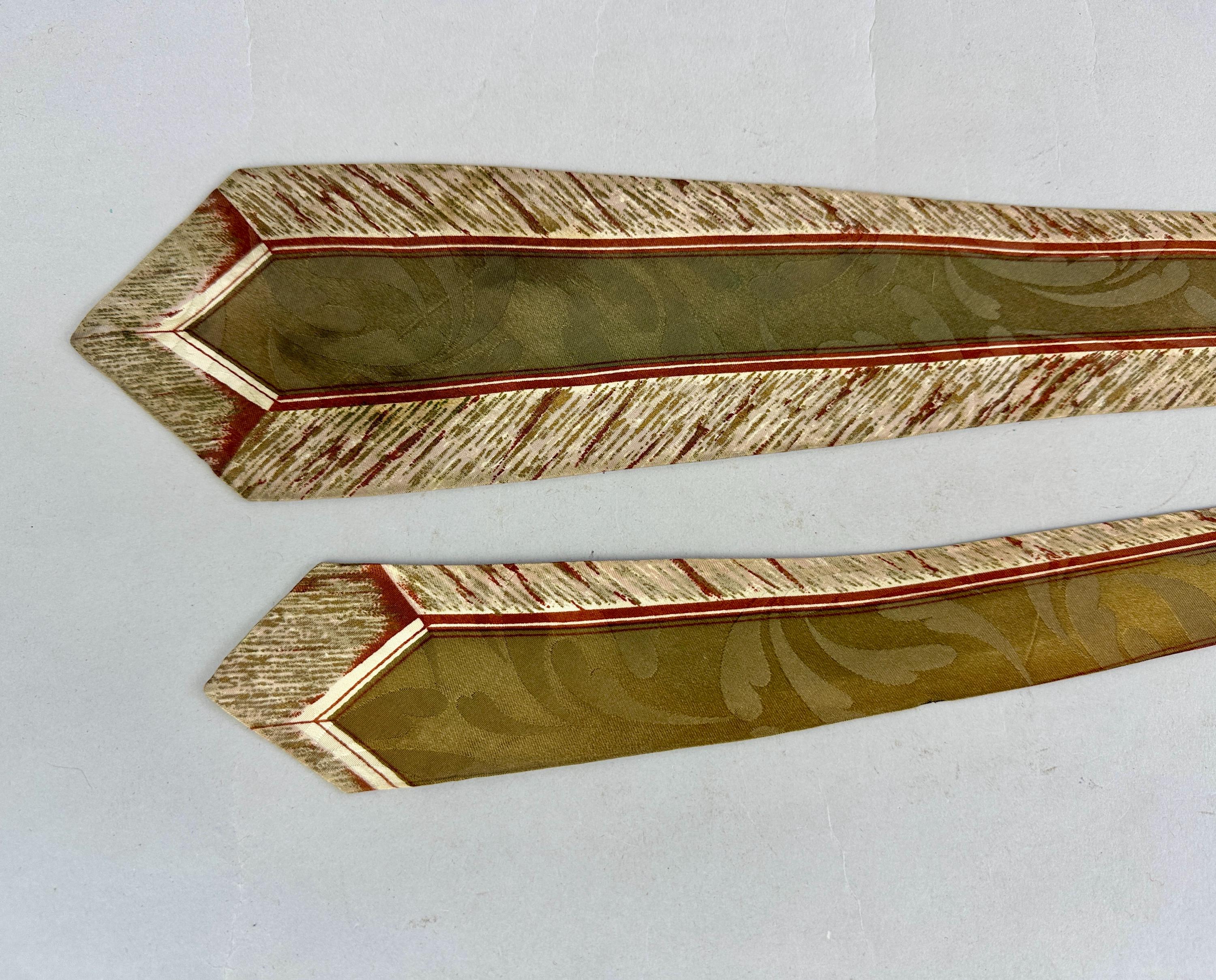Suit up for an al fresco date and look perfectly matched with this 1940s tie! This wide tie of rayon has a Romanesque feel with center column and fresco painting hues of olive green, burnt umber, ivory, taupe, and gentle touches of gold. A tone on tone scrolling plume design sits quietly in the background. Pairs well with a wide variety of Art Deco and Mid-Century suit colors and fabric types. Fully lined and marked "Heritage" and "Styled by Creveling of California". This tie is in great vintage condition with no flaws found!