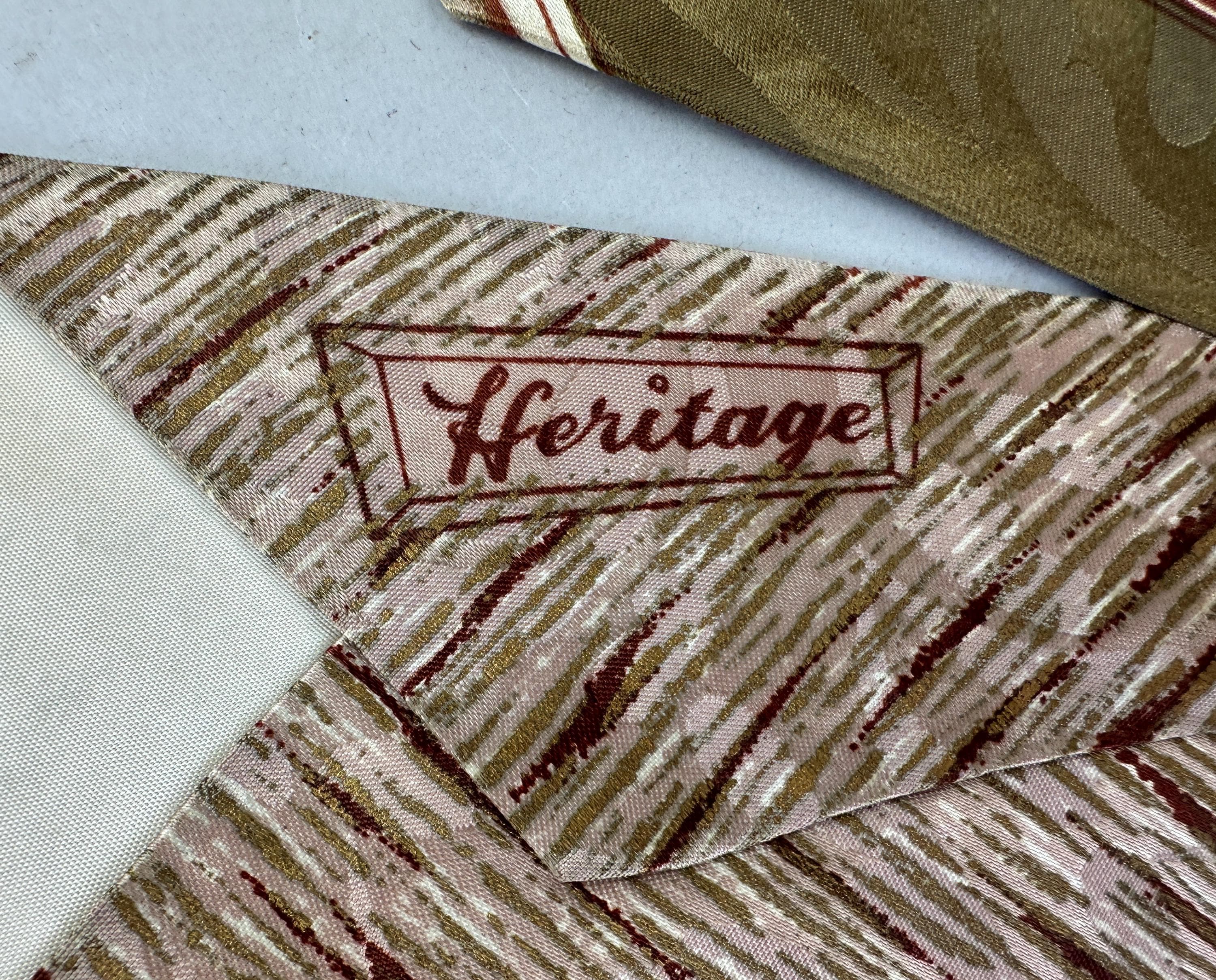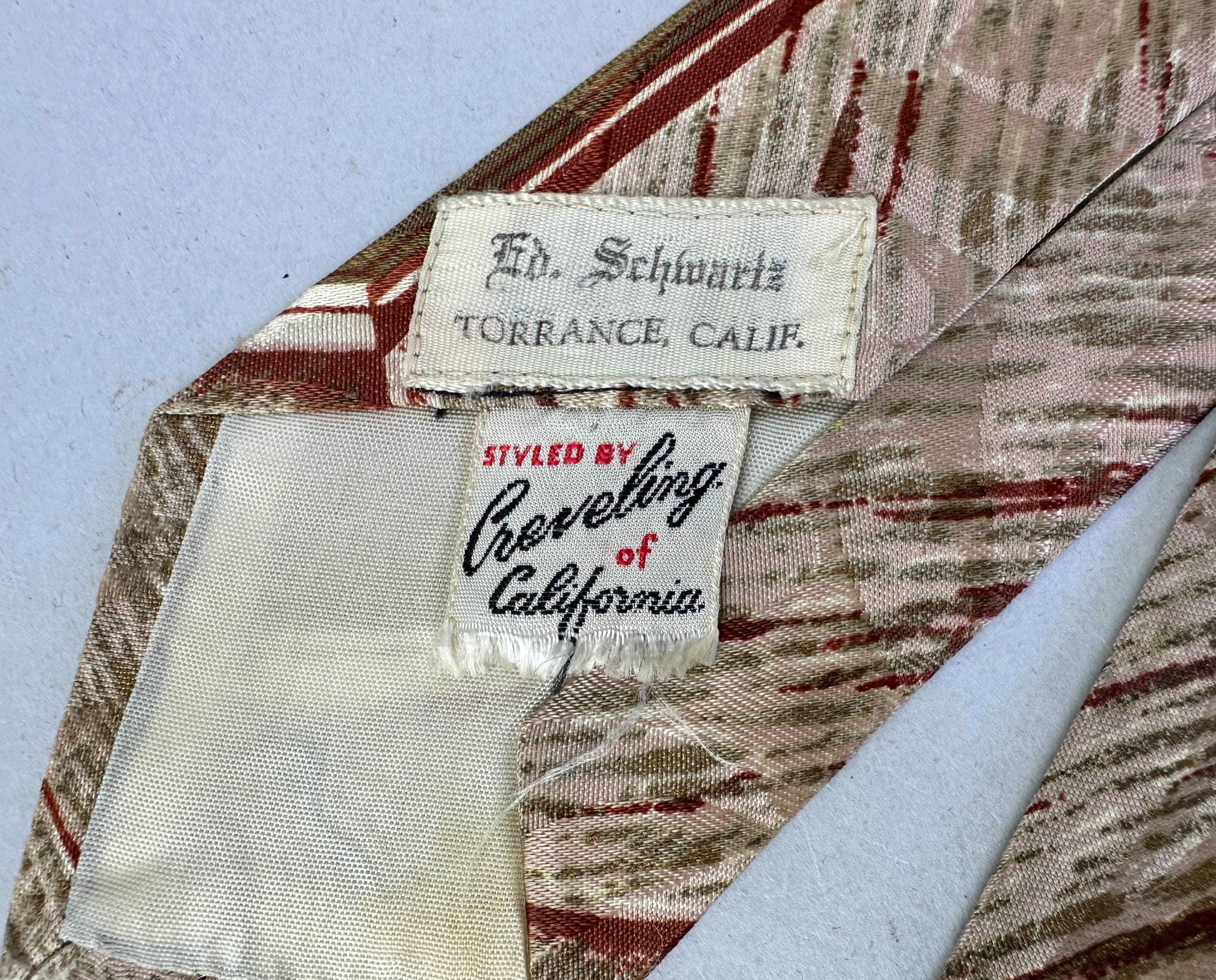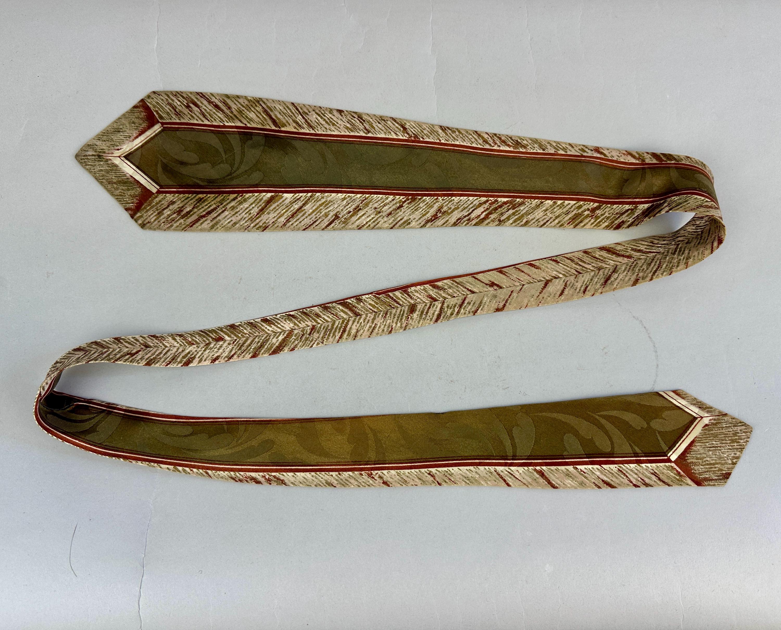 Suit up for an al fresco date and look perfectly matched with this 1940s tie! This wide tie of rayon has a Romanesque feel with center column and fresco painting hues of olive green, burnt umber, ivory, taupe, and gentle touches of gold. A tone on tone scrolling plume design sits quietly in the background. Pairs well with a wide variety of Art Deco and Mid-Century suit colors and fabric types. Fully lined and marked "Heritage" and "Styled by Creveling of California". This tie is in great vintage condition with no flaws found!